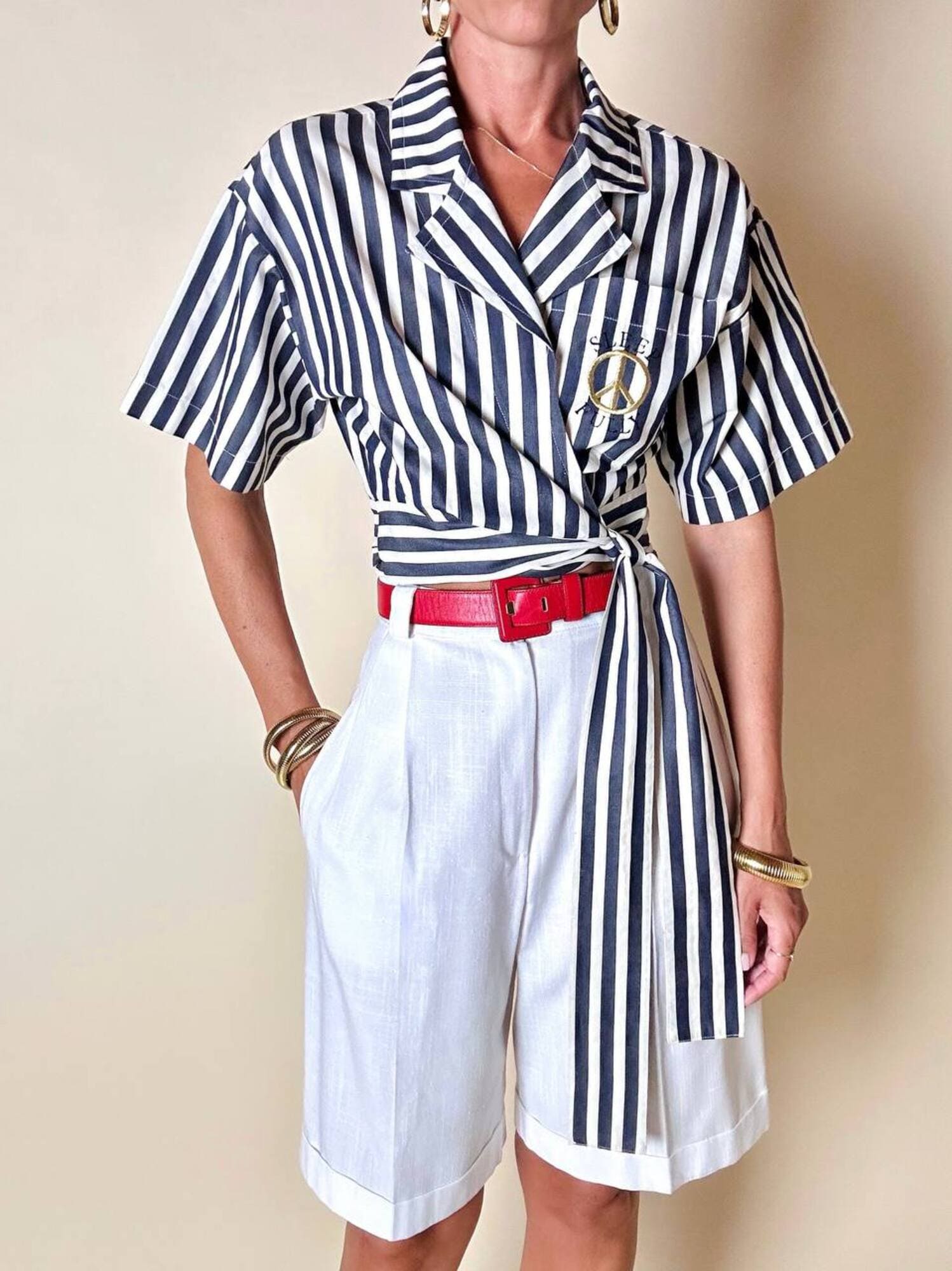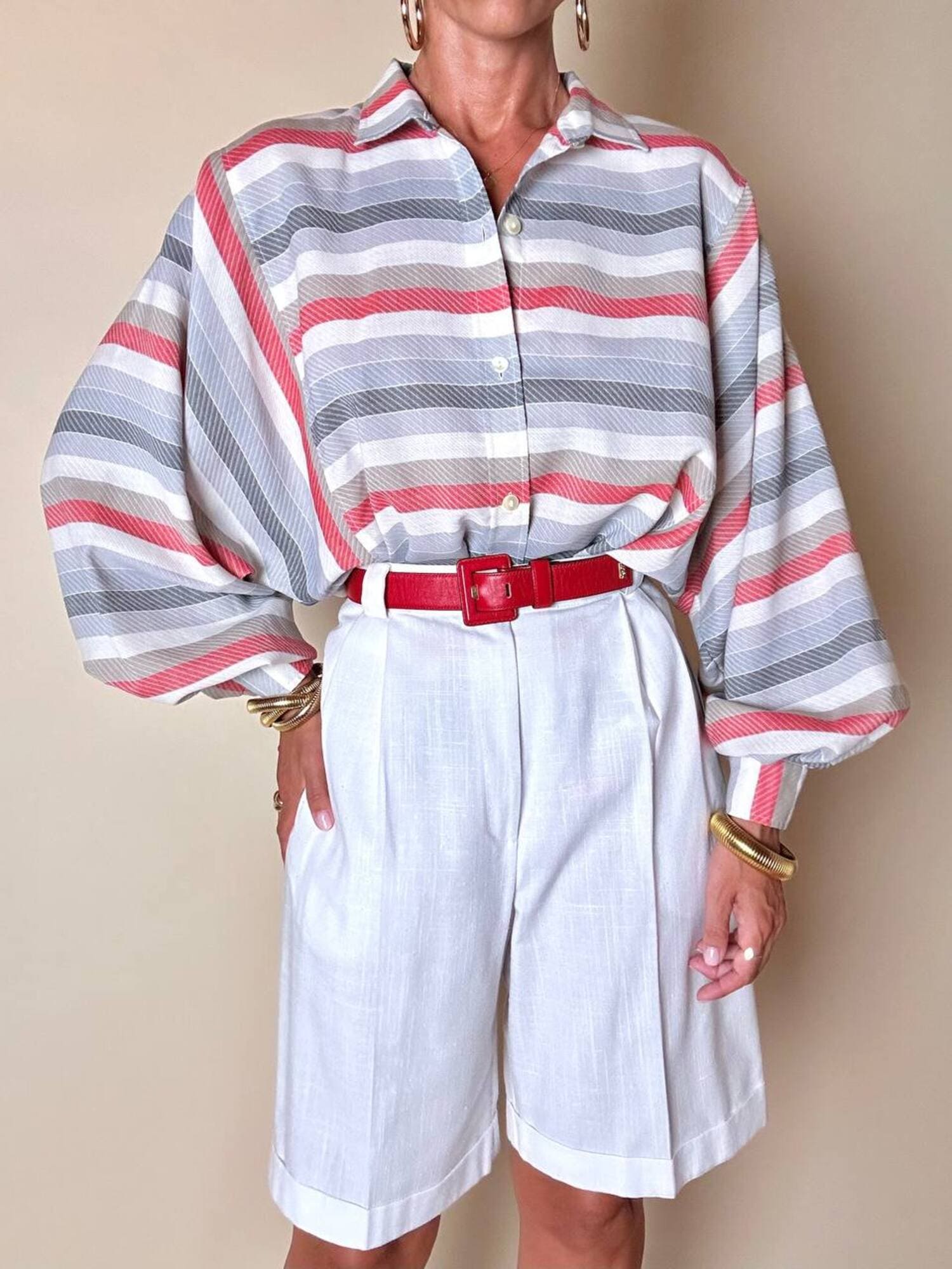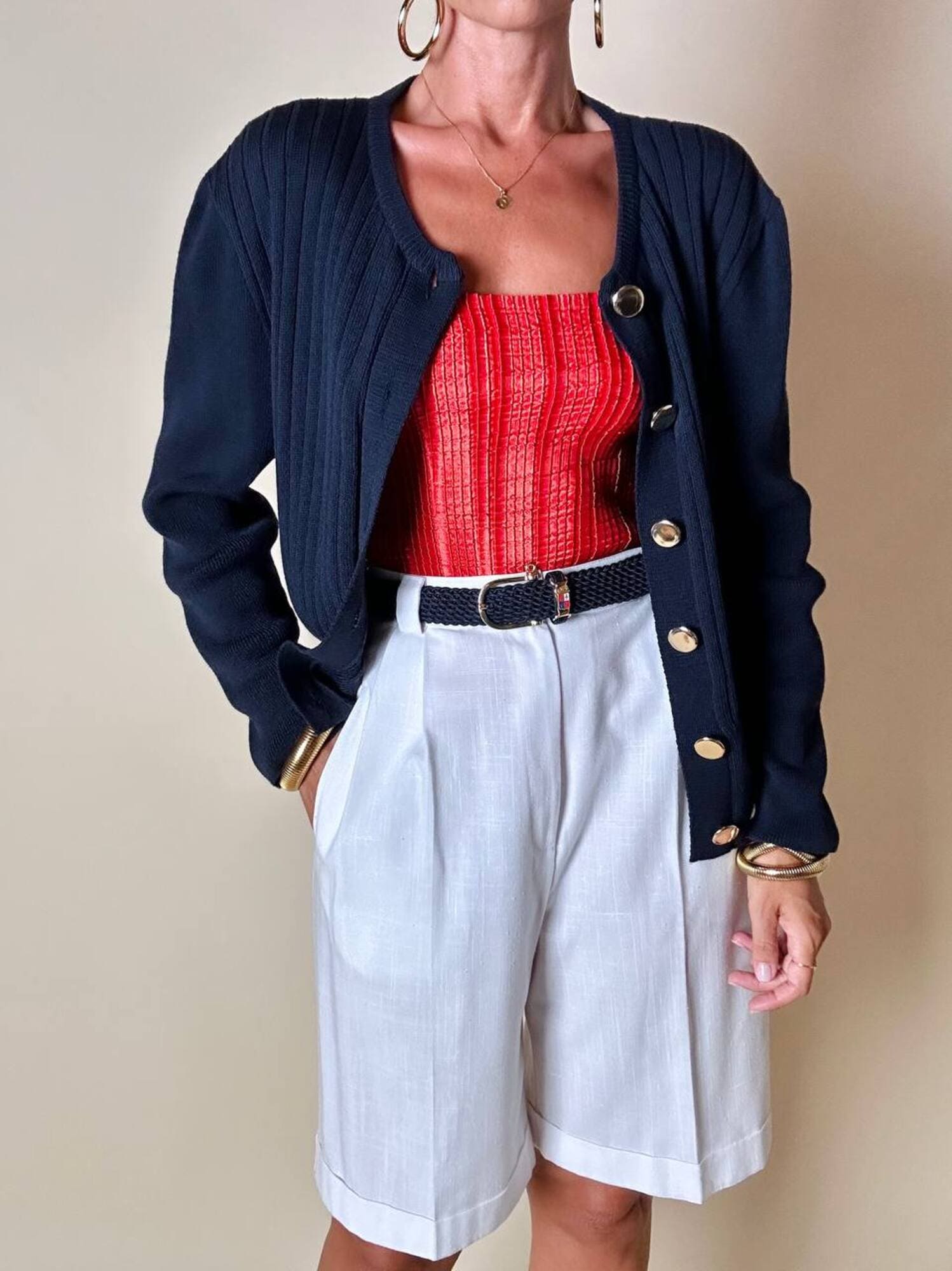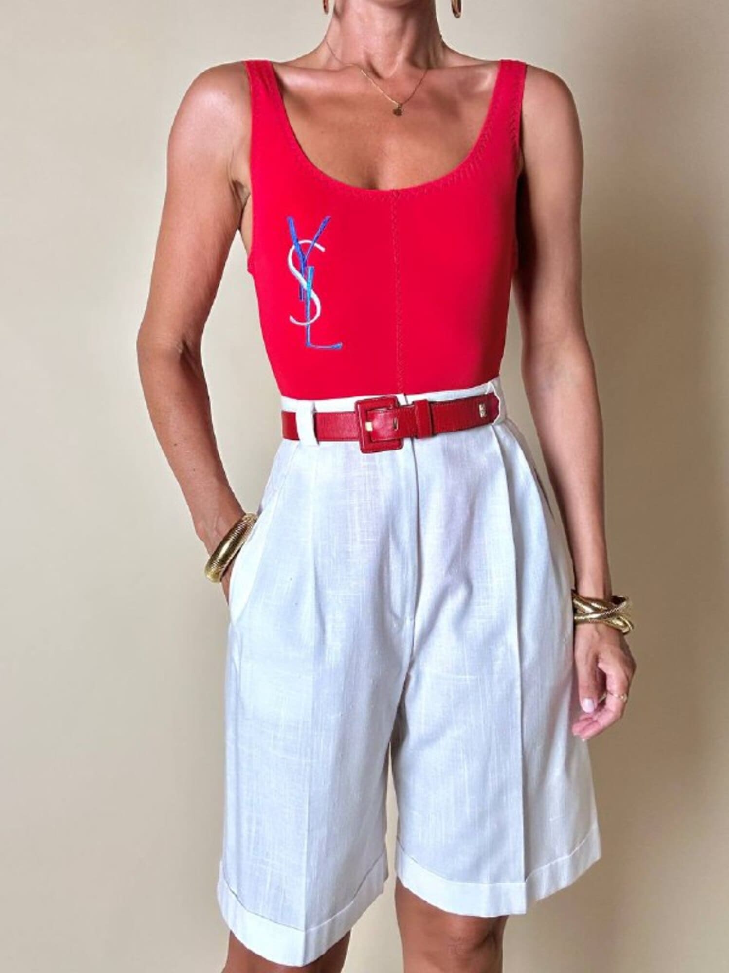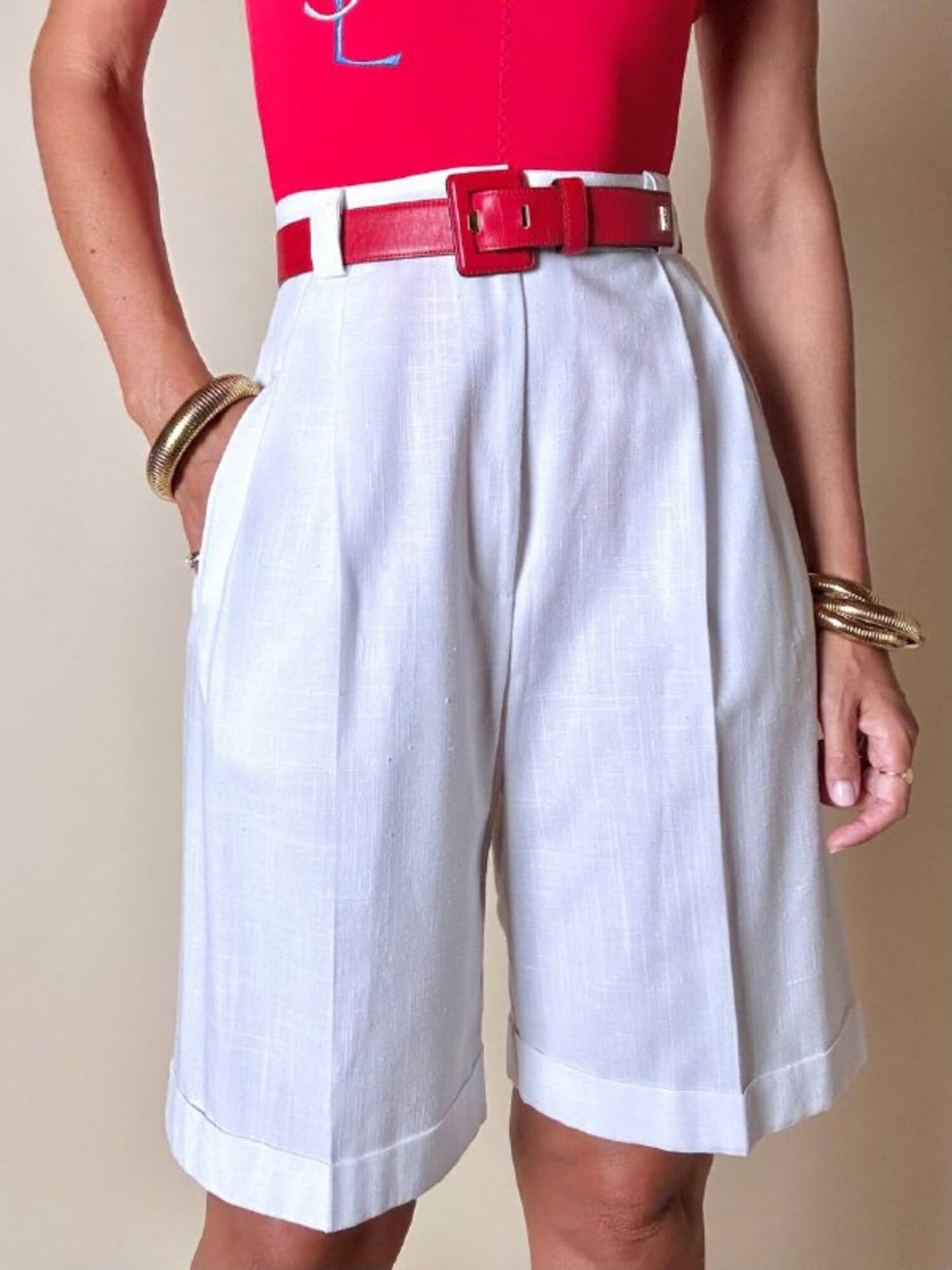 Bermuda bianco con pince all’inglese, firmato “Katies”. Vita alta, tasche a filo, passanti sul cinturino, fondo gamba rifinito con risvolto.
