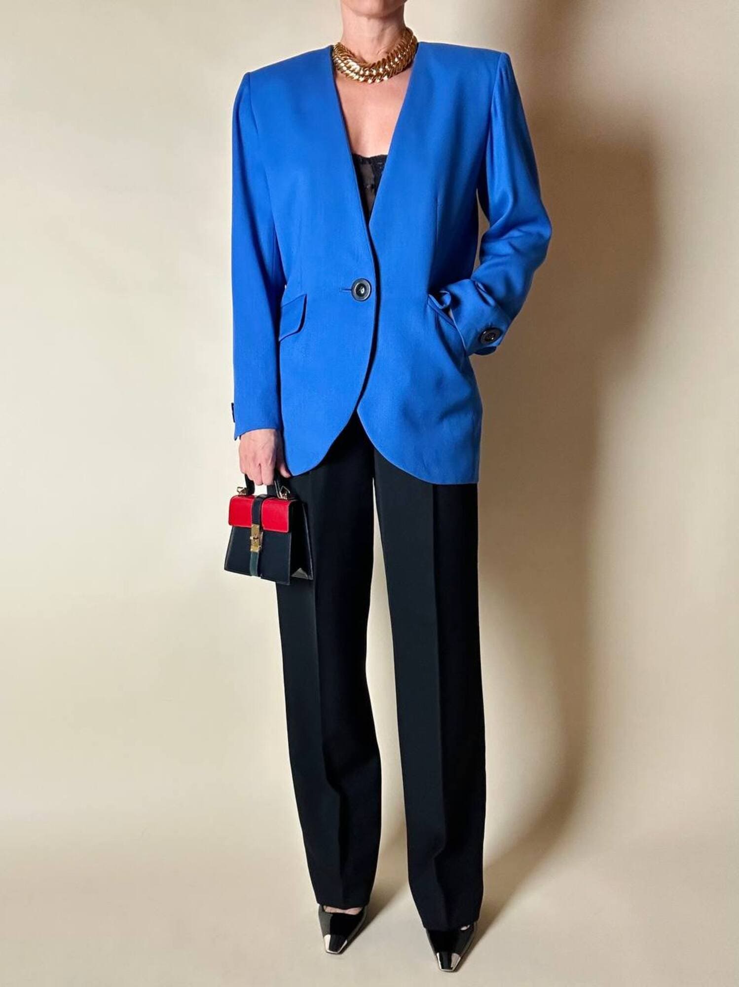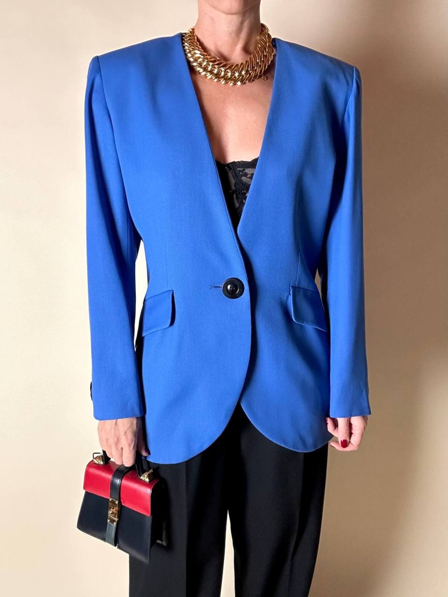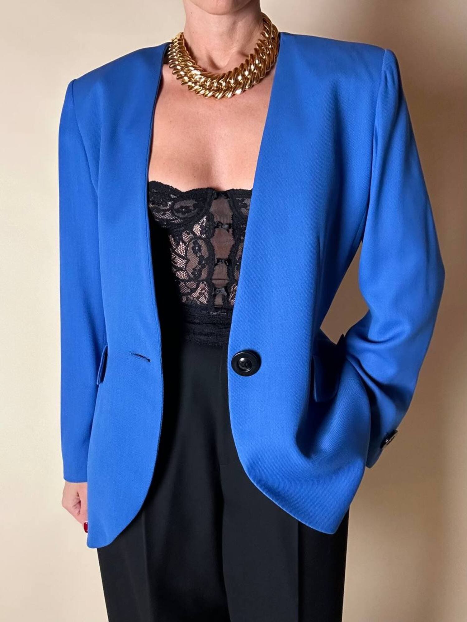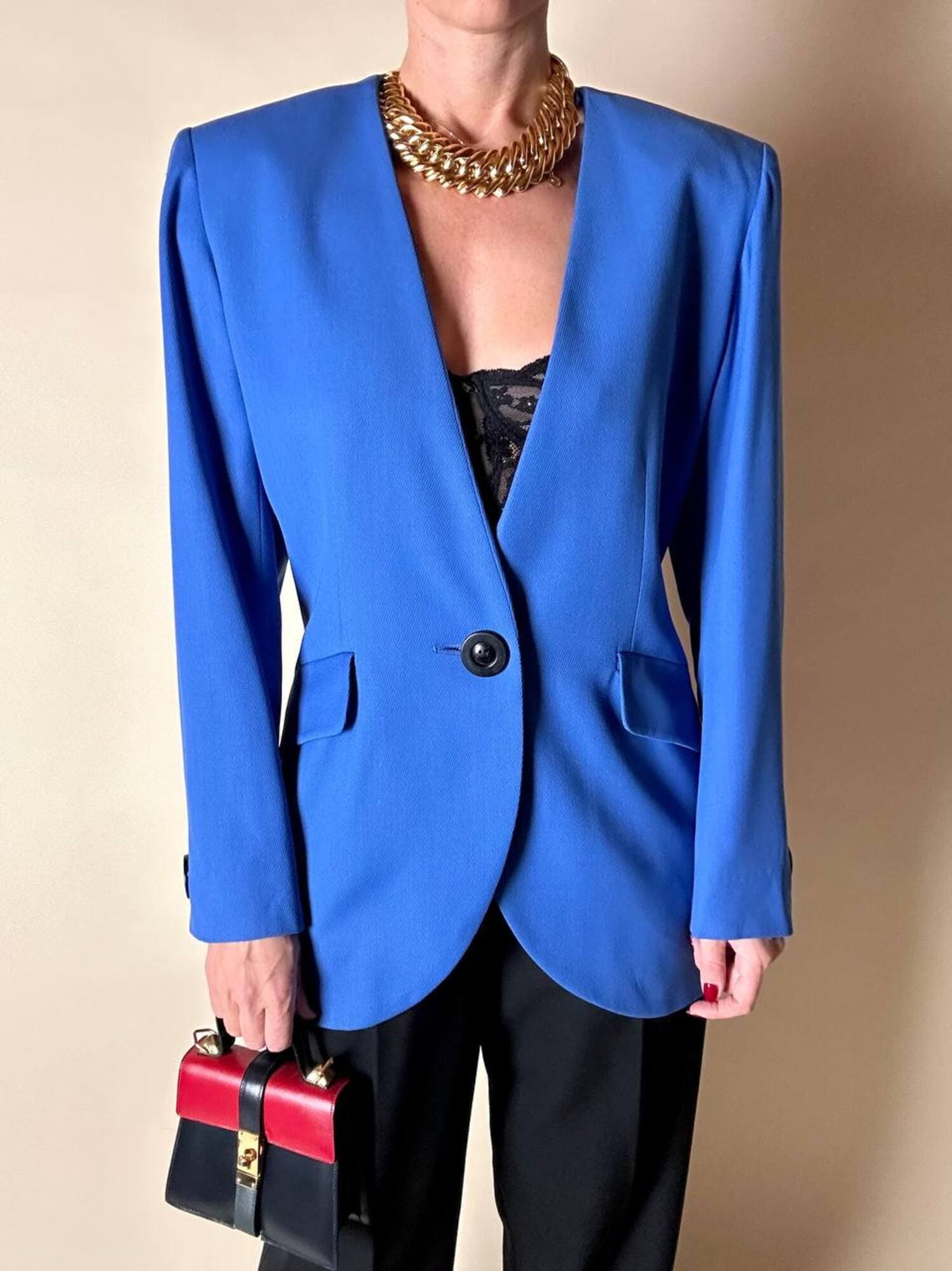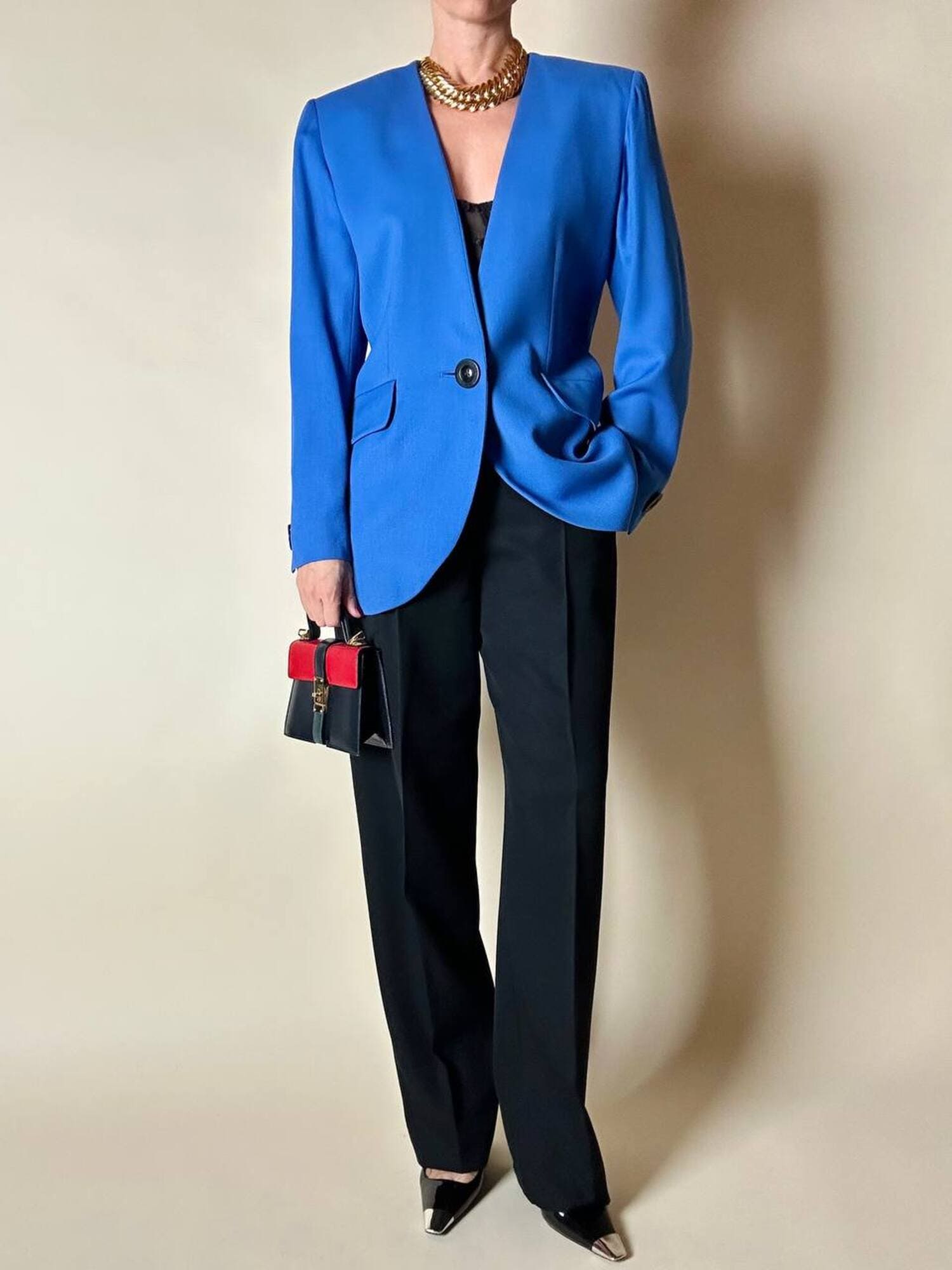 Questo blazer vintage in lana blu cobalto è un esempio impeccabile del design strutturato e sofisticato che ha definito la moda tra gli anni ’80 e ’90, oggi più attuale che mai. Il modello è monopetto con un unico bottone centrale, caratterizzato da uno scollo a V profondo senza revers, dettaglio distintivo che dona al blazer un’eleganza essenziale e decisa. Le spalline strutturate enfatizzano la silhouette, mentre il taglio sciancrato valorizza il punto vita, creando una linea femminile. Completano il design le tasche a filetto con patta sui fianchi e i grandi bottoni rotondi in resina nera, presenti sia sul davanti che sui polsi, elemento decorativo tipico del linguaggio stilistico di Yves Saint Laurent. La fodera interna in tinta assicura comfort e una finitura impeccabile. Un capo iconico che racchiude tutta la forza estetica della sartorialità Yves Saint Laurent d’epoca. Un blazer vintage di lusso, perfetto da indossare come pezzo statement su denim, pantaloni sartoriali o abiti minimal, ideale per chi cerca moda d’autore, capi iconici e intramontabili.