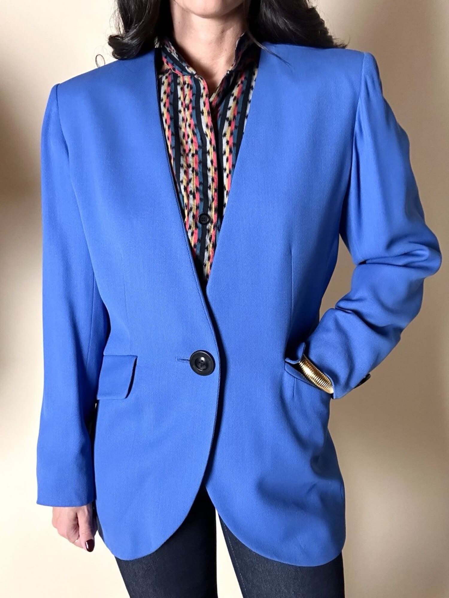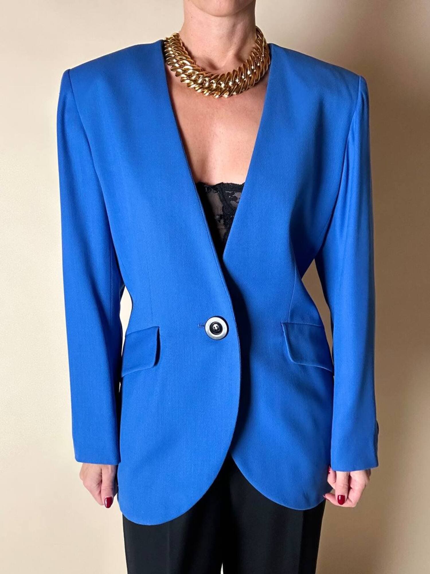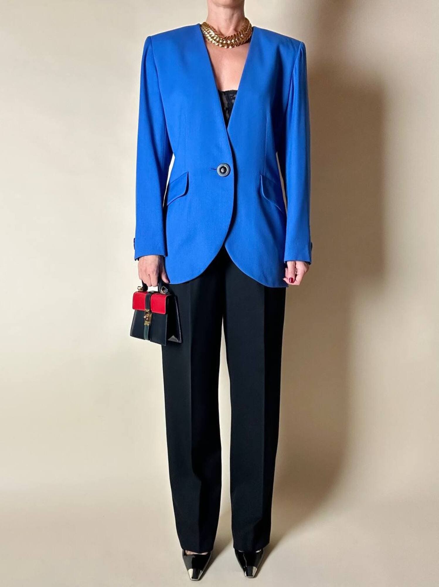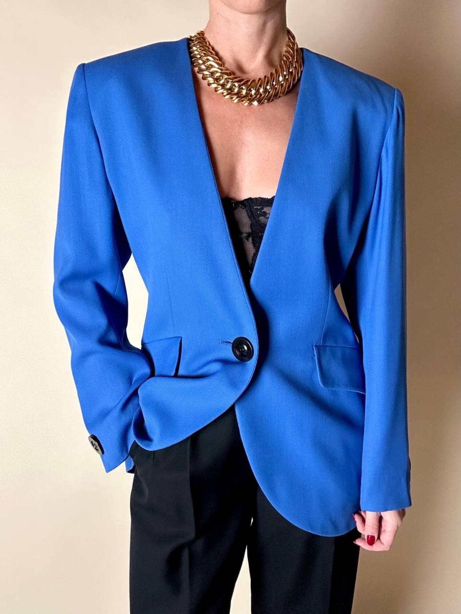 Questo blazer vintage in lana blu cobalto è un esempio impeccabile del design strutturato e sofisticato che ha definito la moda tra gli anni ’80 e ’90, oggi più attuale che mai. Il modello è monopetto con un unico bottone centrale, caratterizzato da uno scollo a V profondo senza revers, dettaglio distintivo che dona al blazer un’eleganza essenziale e decisa. Le spalline strutturate enfatizzano la silhouette, mentre il taglio sciancrato valorizza il punto vita, creando una linea femminile. Completano il design le tasche a filetto con patta sui fianchi e i grandi bottoni rotondi in resina nera, presenti sia sul davanti che sui polsi, elemento decorativo tipico del linguaggio stilistico di Yves Saint Laurent. La fodera interna in tinta assicura comfort e una finitura impeccabile. Un capo iconico che racchiude tutta la forza estetica della sartorialità Yves Saint Laurent d’epoca. Un blazer vintage di lusso, perfetto da indossare come pezzo statement su denim, pantaloni sartoriali o abiti minimal, ideale per chi cerca moda d’autore, capi iconici e intramontabili.