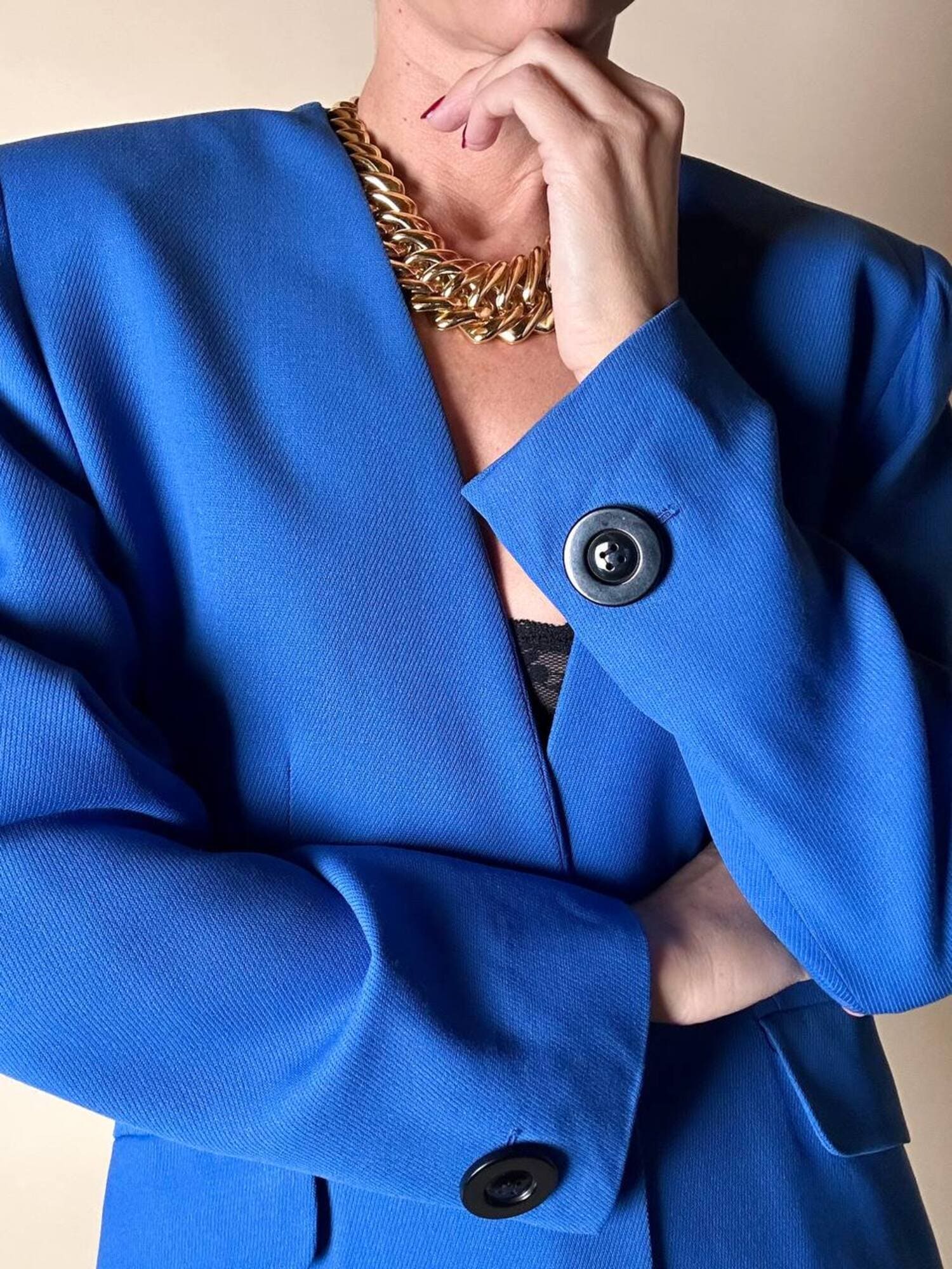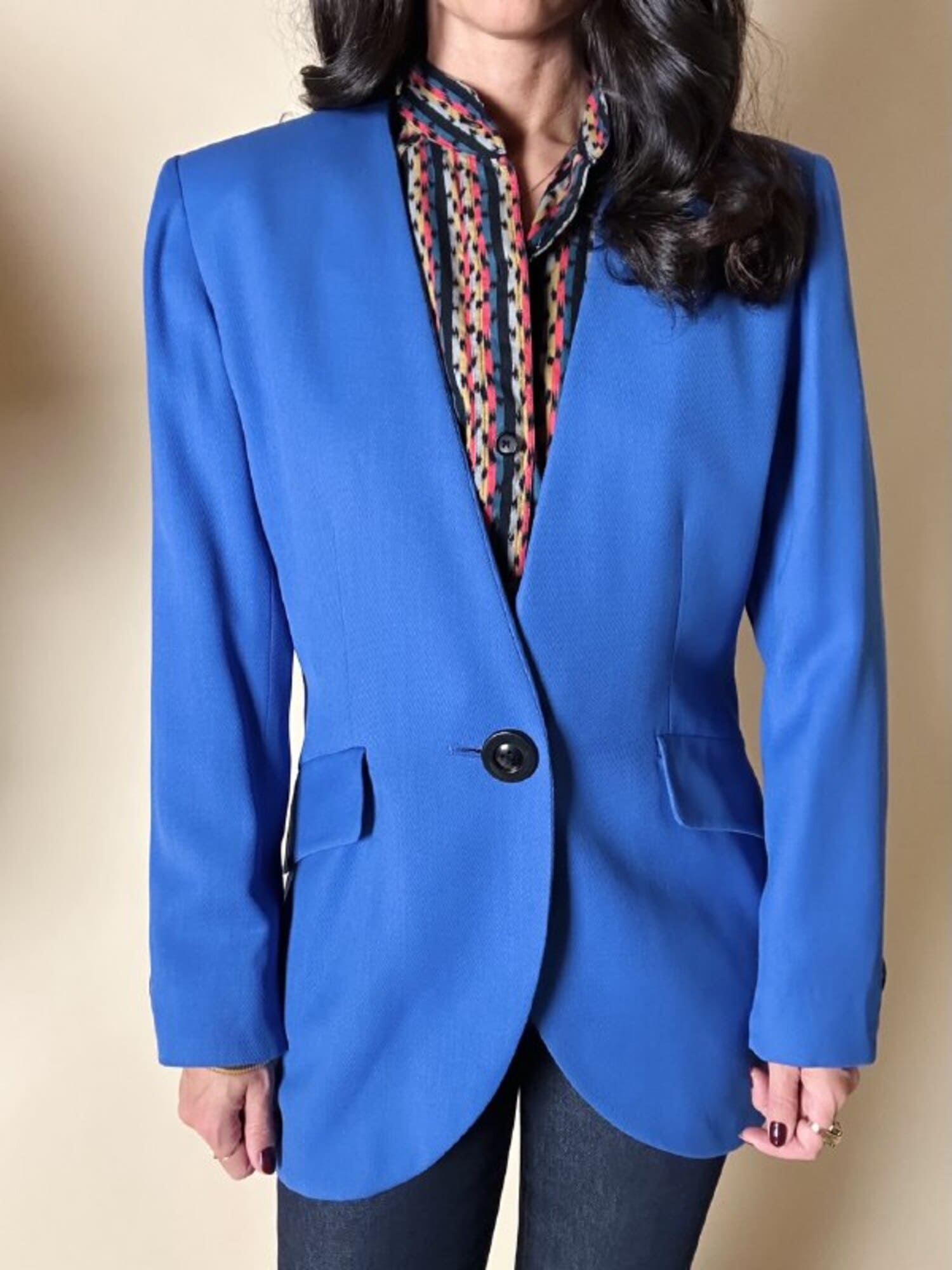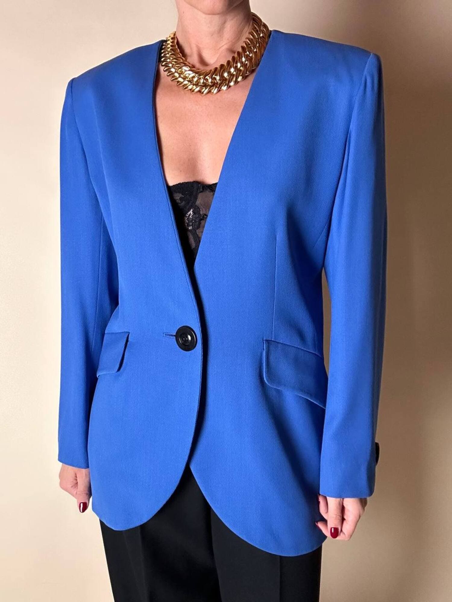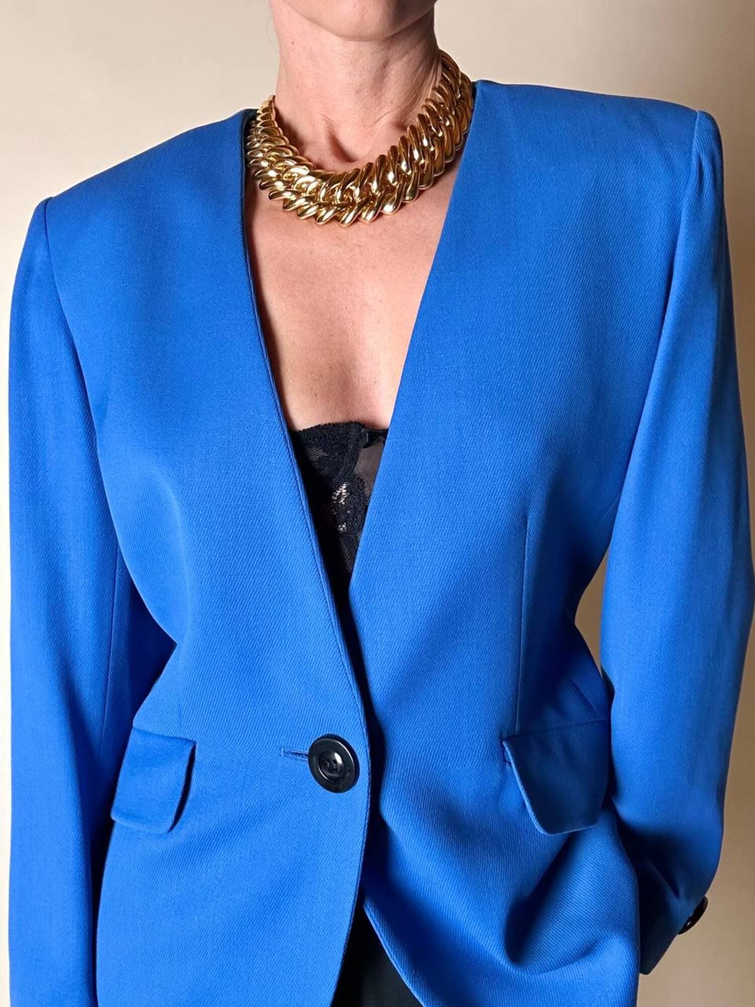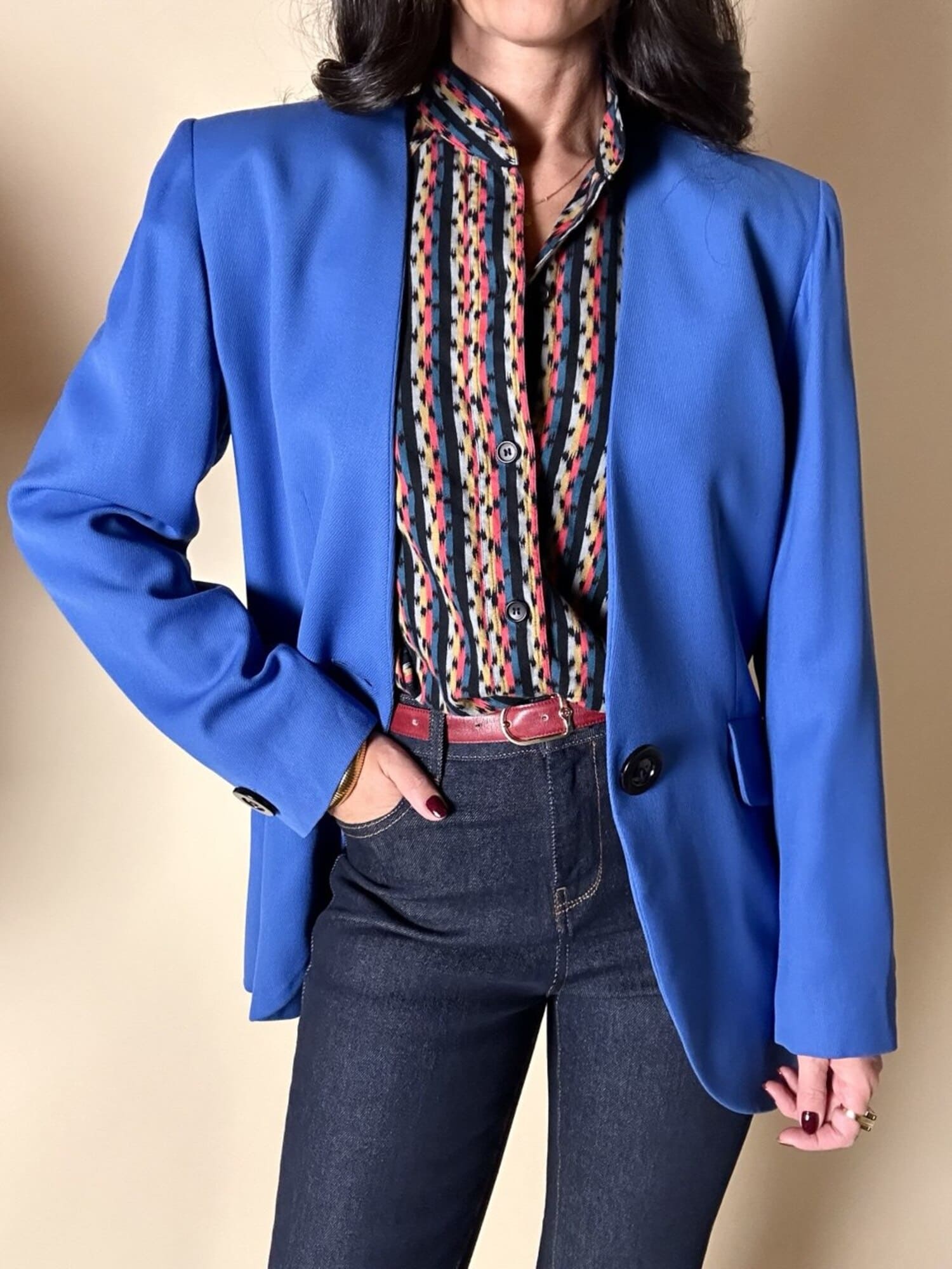 Questo blazer vintage in lana blu cobalto è un esempio impeccabile del design strutturato e sofisticato che ha definito la moda tra gli anni ’80 e ’90, oggi più attuale che mai. Il modello è monopetto con un unico bottone centrale, caratterizzato da uno scollo a V profondo senza revers, dettaglio distintivo che dona al blazer un’eleganza essenziale e decisa. Le spalline strutturate enfatizzano la silhouette, mentre il taglio sciancrato valorizza il punto vita, creando una linea femminile. Completano il design le tasche a filetto con patta sui fianchi e i grandi bottoni rotondi in resina nera, presenti sia sul davanti che sui polsi, elemento decorativo tipico del linguaggio stilistico di Yves Saint Laurent. La fodera interna in tinta assicura comfort e una finitura impeccabile. Un capo iconico che racchiude tutta la forza estetica della sartorialità Yves Saint Laurent d’epoca. Un blazer vintage di lusso, perfetto da indossare come pezzo statement su denim, pantaloni sartoriali o abiti minimal, ideale per chi cerca moda d’autore, capi iconici e intramontabili.