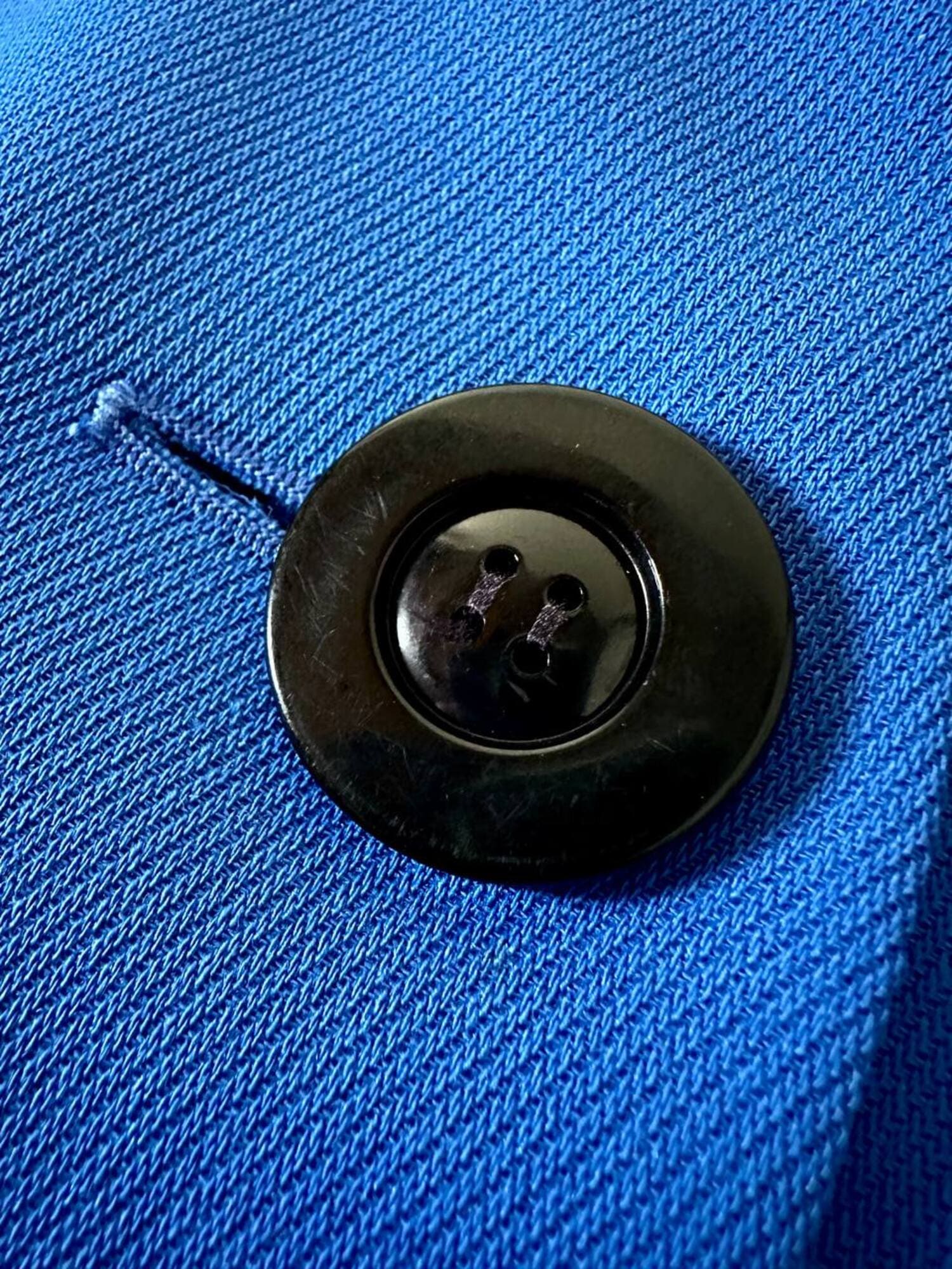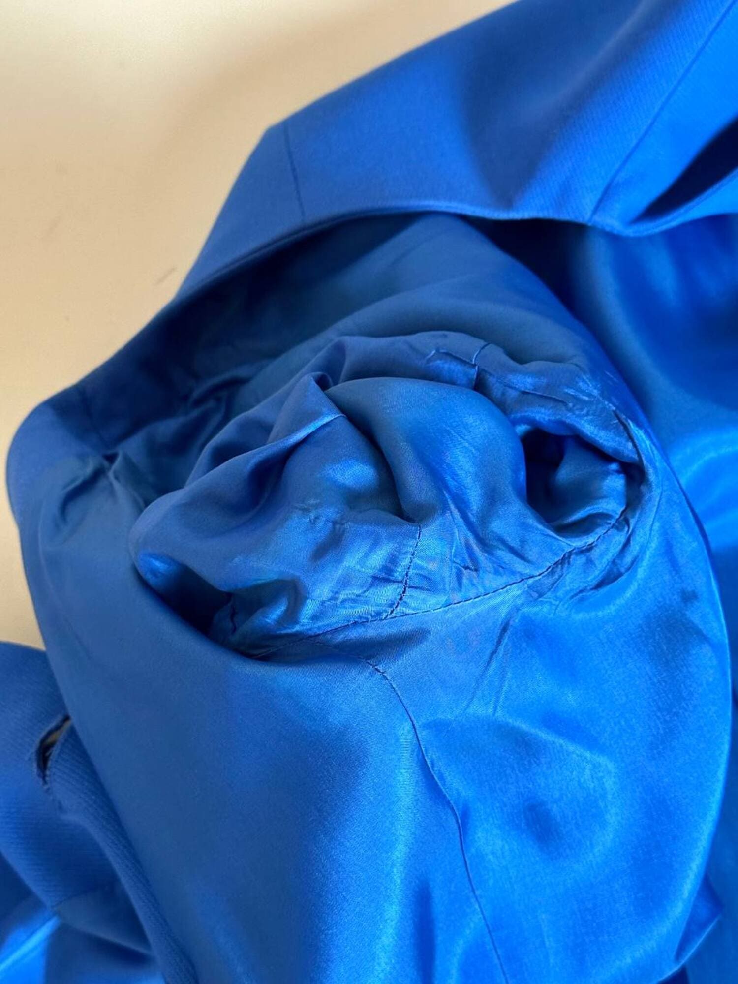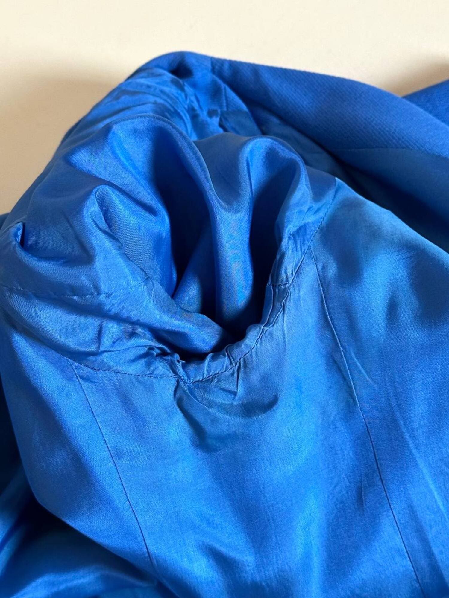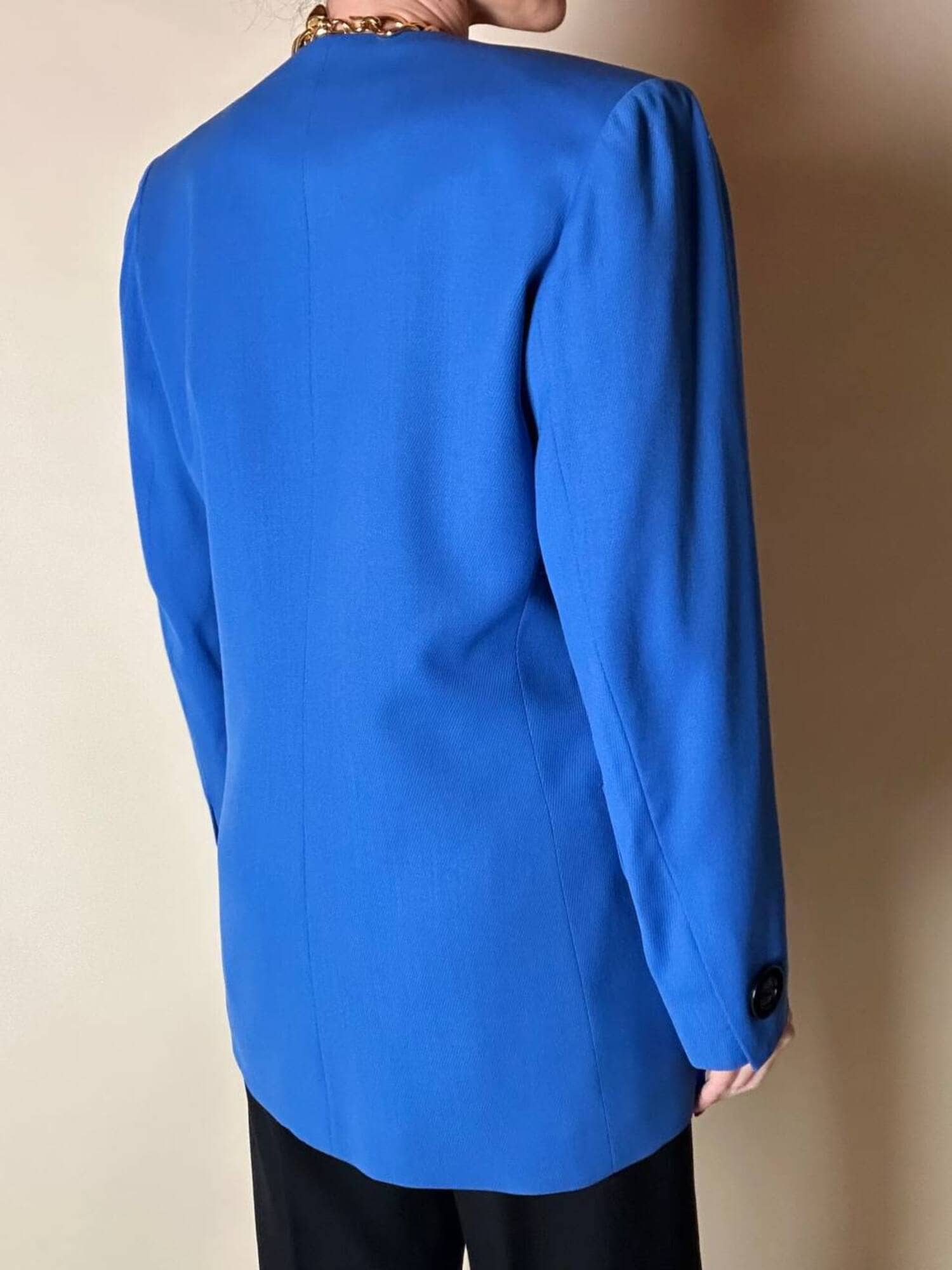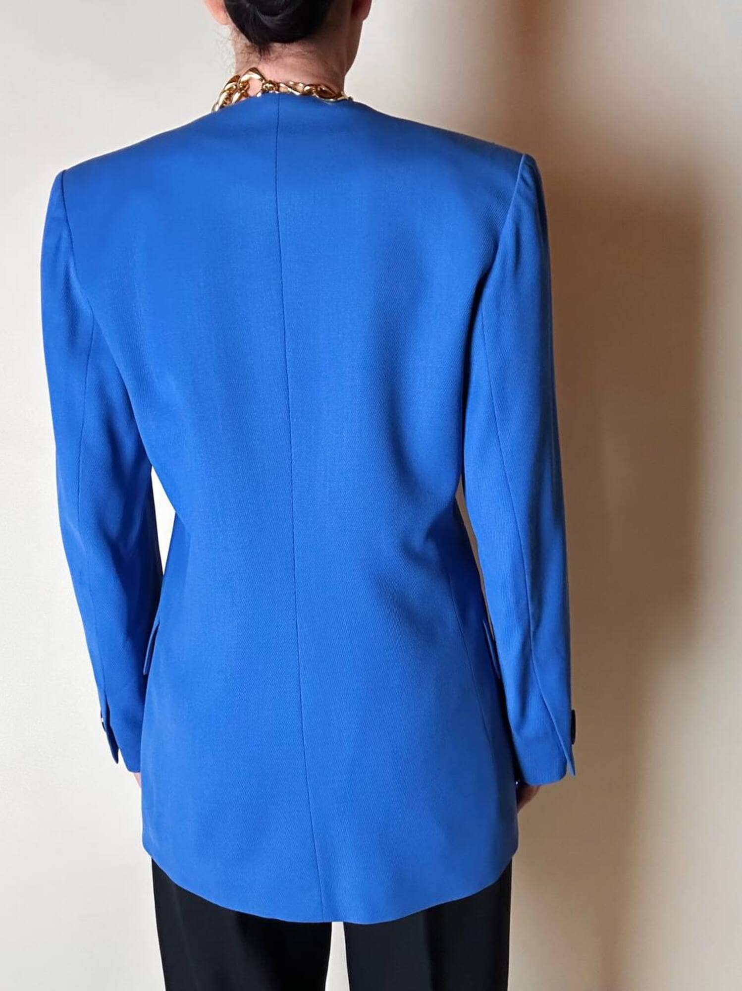 Questo blazer vintage in lana blu cobalto è un esempio impeccabile del design strutturato e sofisticato che ha definito la moda tra gli anni ’80 e ’90, oggi più attuale che mai. Il modello è monopetto con un unico bottone centrale, caratterizzato da uno scollo a V profondo senza revers, dettaglio distintivo che dona al blazer un’eleganza essenziale e decisa. Le spalline strutturate enfatizzano la silhouette, mentre il taglio sciancrato valorizza il punto vita, creando una linea femminile. Completano il design le tasche a filetto con patta sui fianchi e i grandi bottoni rotondi in resina nera, presenti sia sul davanti che sui polsi, elemento decorativo tipico del linguaggio stilistico di Yves Saint Laurent. La fodera interna in tinta assicura comfort e una finitura impeccabile. Un capo iconico che racchiude tutta la forza estetica della sartorialità Yves Saint Laurent d’epoca. Un blazer vintage di lusso, perfetto da indossare come pezzo statement su denim, pantaloni sartoriali o abiti minimal, ideale per chi cerca moda d’autore, capi iconici e intramontabili.