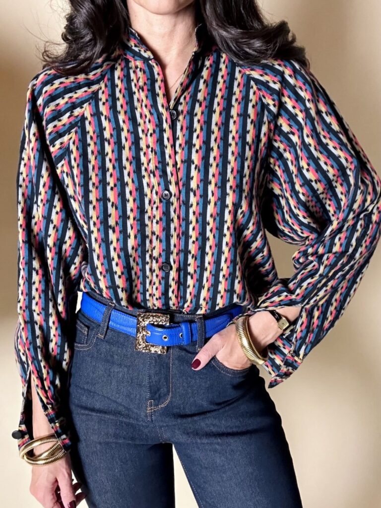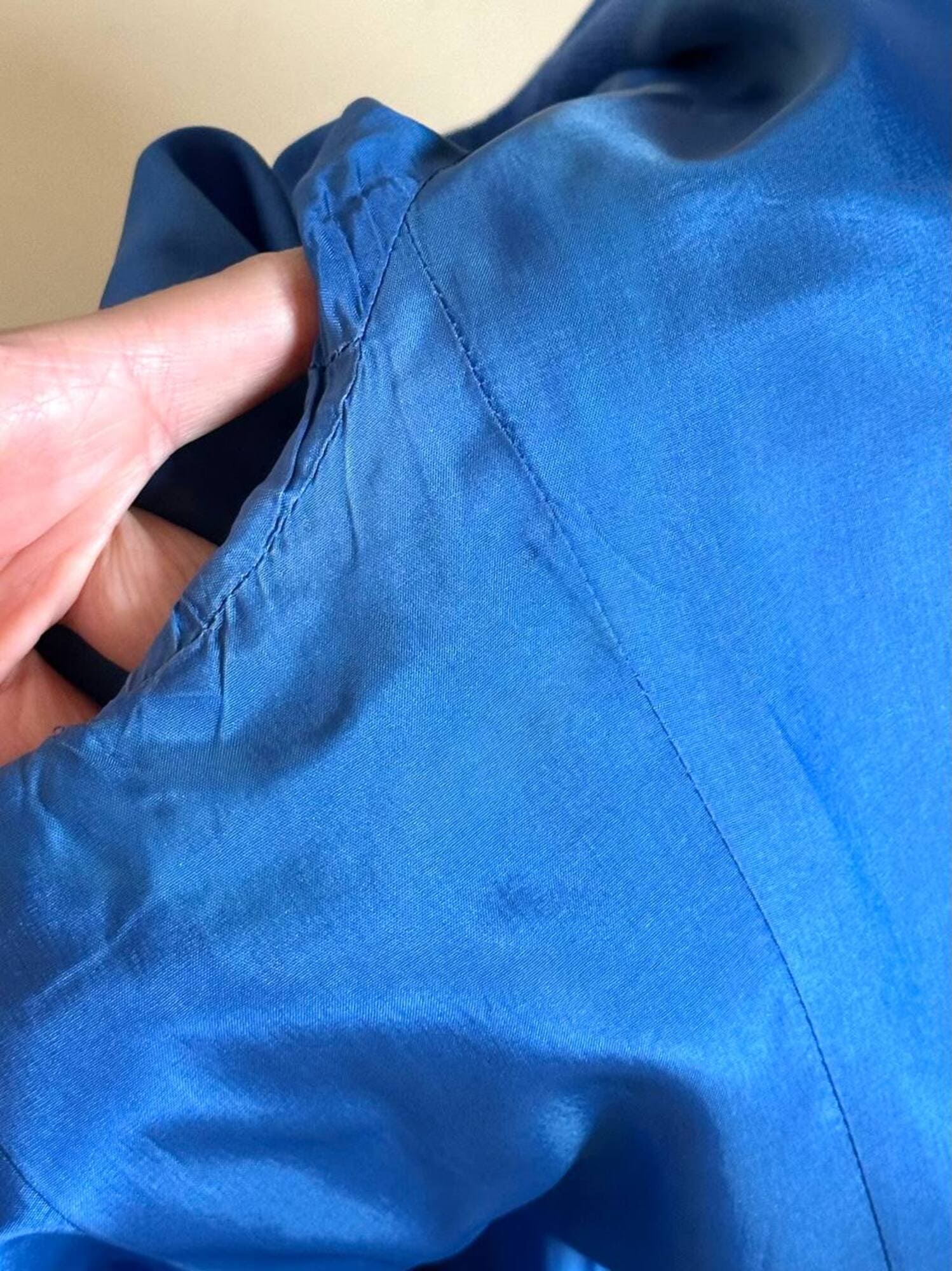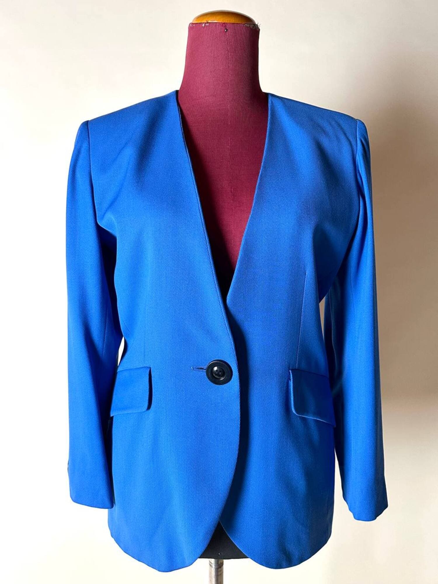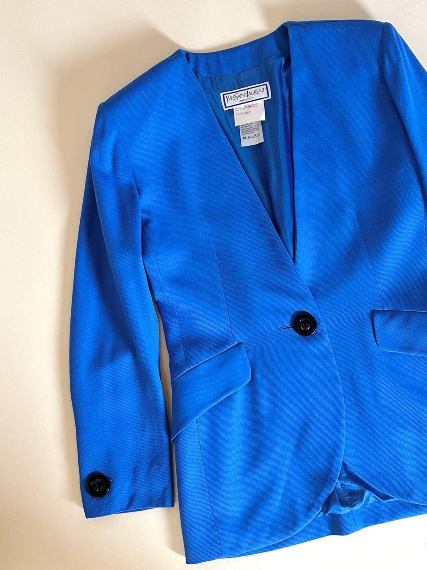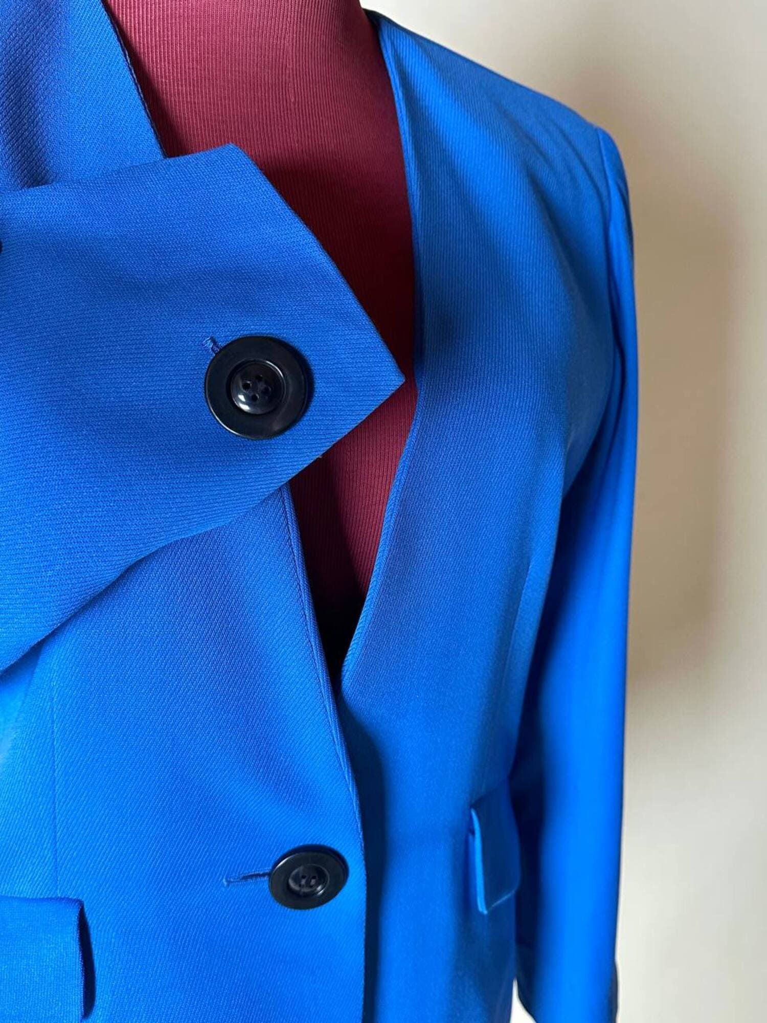 Questo blazer vintage in lana blu cobalto è un esempio impeccabile del design strutturato e sofisticato che ha definito la moda tra gli anni ’80 e ’90, oggi più attuale che mai. Il modello è monopetto con un unico bottone centrale, caratterizzato da uno scollo a V profondo senza revers, dettaglio distintivo che dona al blazer un’eleganza essenziale e decisa. Le spalline strutturate enfatizzano la silhouette, mentre il taglio sciancrato valorizza il punto vita, creando una linea femminile. Completano il design le tasche a filetto con patta sui fianchi e i grandi bottoni rotondi in resina nera, presenti sia sul davanti che sui polsi, elemento decorativo tipico del linguaggio stilistico di Yves Saint Laurent. La fodera interna in tinta assicura comfort e una finitura impeccabile. Un capo iconico che racchiude tutta la forza estetica della sartorialità Yves Saint Laurent d’epoca. Un blazer vintage di lusso, perfetto da indossare come pezzo statement su denim, pantaloni sartoriali o abiti minimal, ideale per chi cerca moda d’autore, capi iconici e intramontabili.