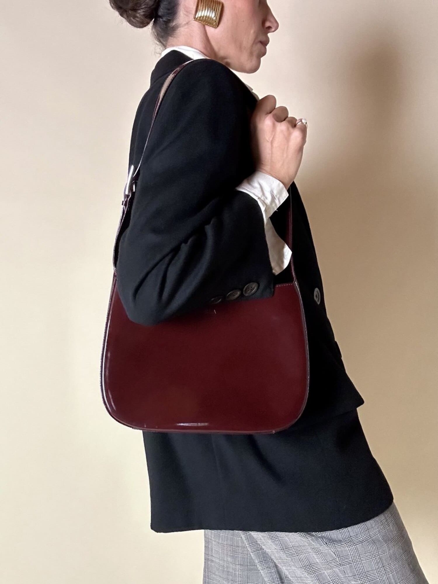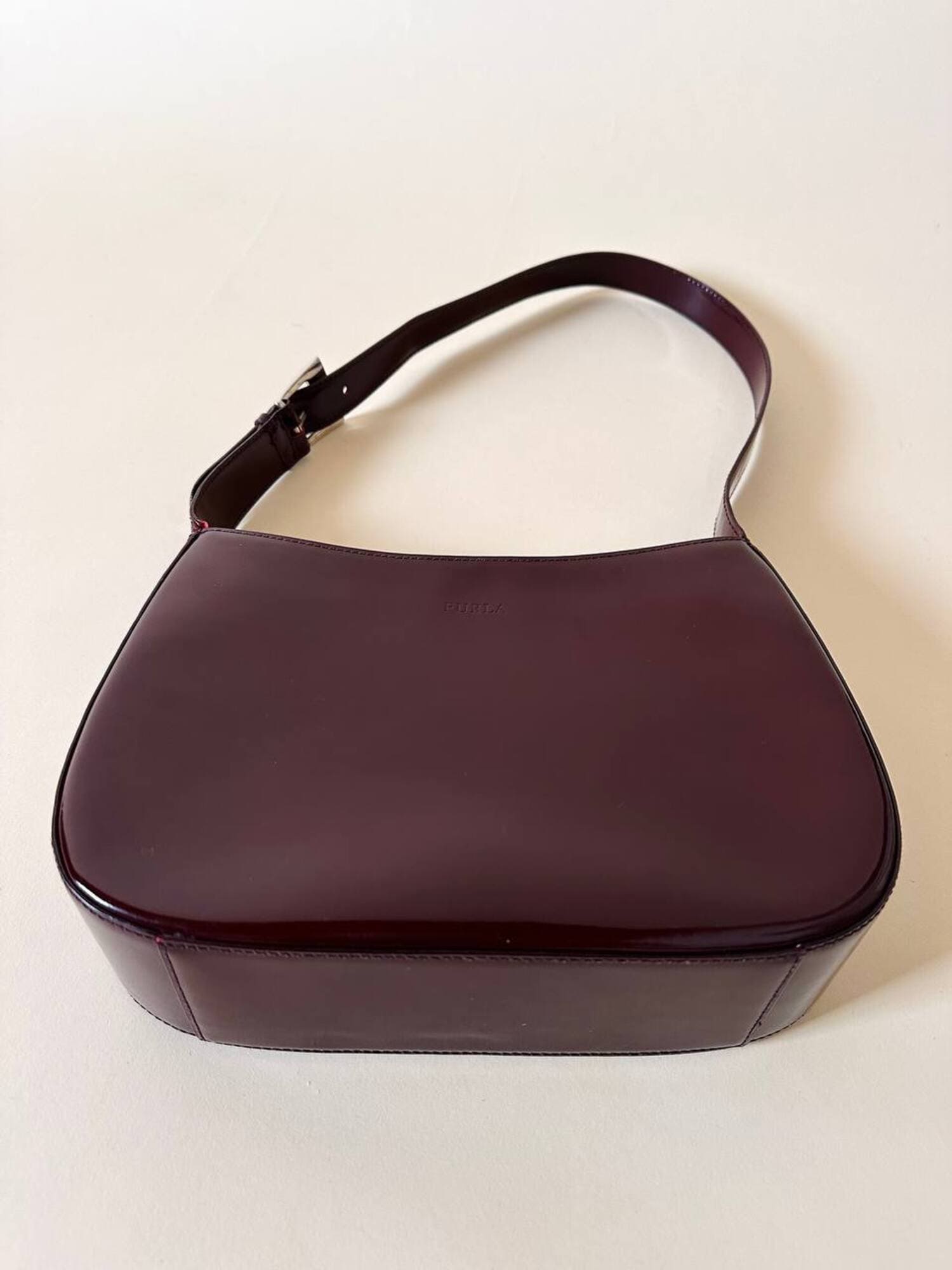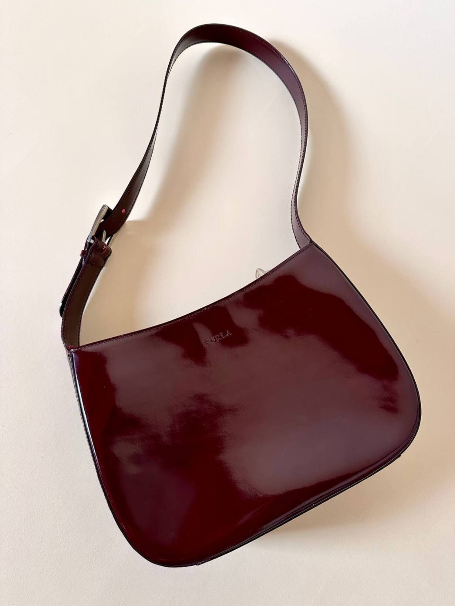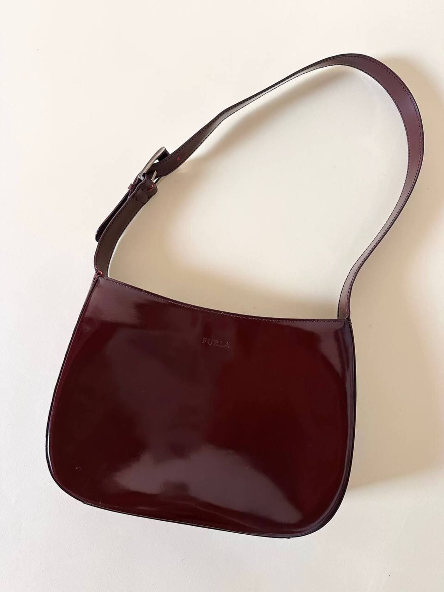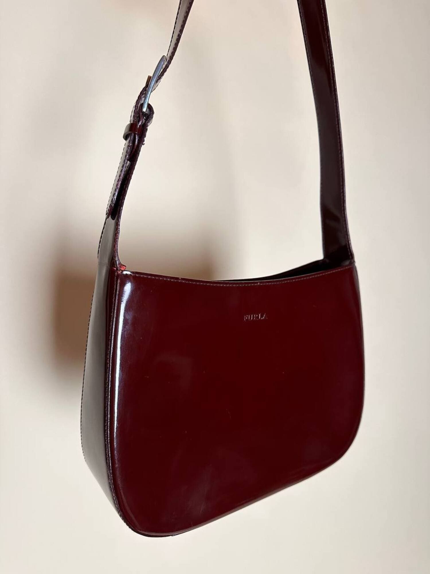 Questa borsa a spalla Furla è realizzata in pelle verniciata color bordeaux, una tonalità che il brand descrive spesso come “ciliegia” o “vinaccia”. La finitura lucida esalta la ricchezza del colore e dona al modello un carattere sofisticato, perfetto per accompagnare sia outfit quotidiani sia look serali. La silhouette è quella della classica hobo a mezzaluna, un modello estremamente versatile che richiama il fascino dello stile Y2K, tornato oggi protagonista nelle tendenze moda. Il design rimane pulito e minimal, valorizzato dal logo Furla impresso discretamente sulla parte frontale. Il manico è regolabile tramite una fibbia in metallo color argento, che aggiunge un dettaglio luminoso e rende la borsa pratica da indossare. L’interno è studiato per essere funzionale pur mantenendo la compattezza del modello: la borsa presenta una fodera in tessuto logato allover e tre scomparti, di cui quello centrale con chiusura a zip. Il tiralampo firmato e il logo a caldo sul lato esterno completano una costruzione curata nei dettagli, segno distintivo della qualità Furla. Perfetta per chi cerca una borsa chic, minimalista e contemporanea, questa hobo bag è un accessorio che aggiunge un tocco raffinato a qualsiasi guardaroba.