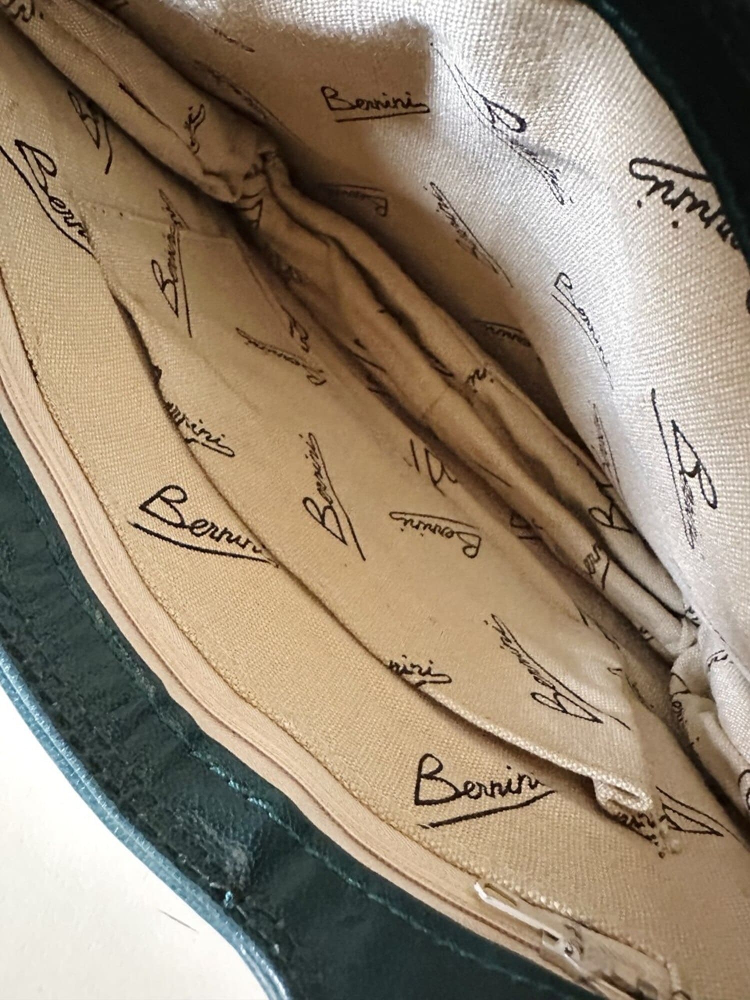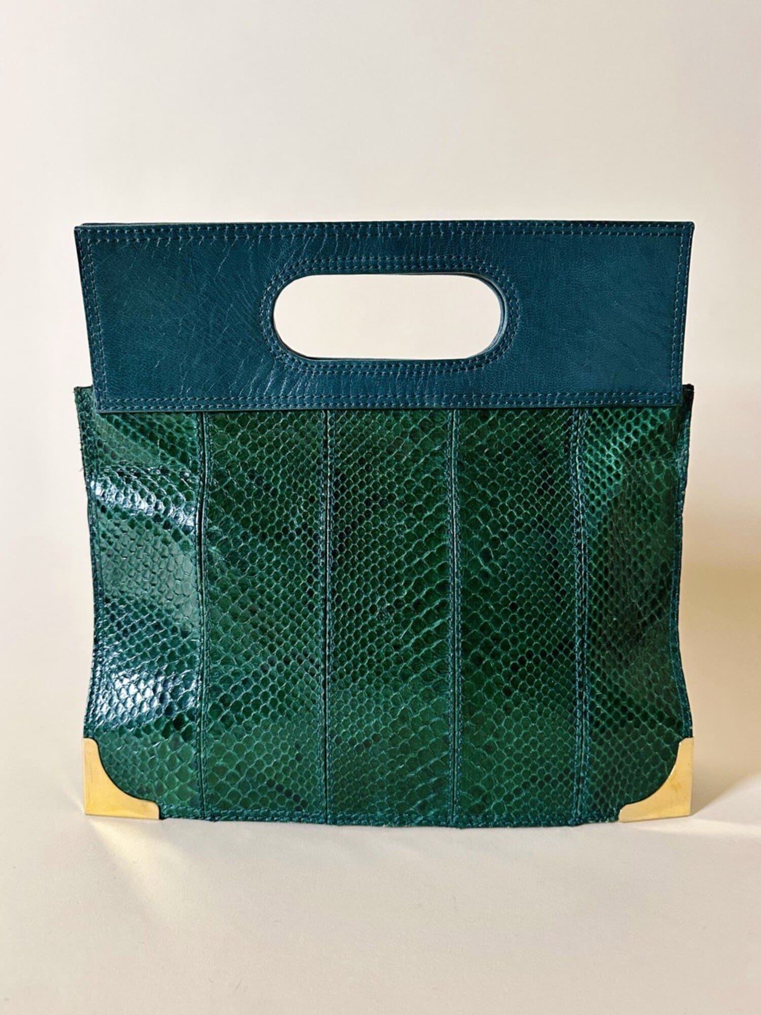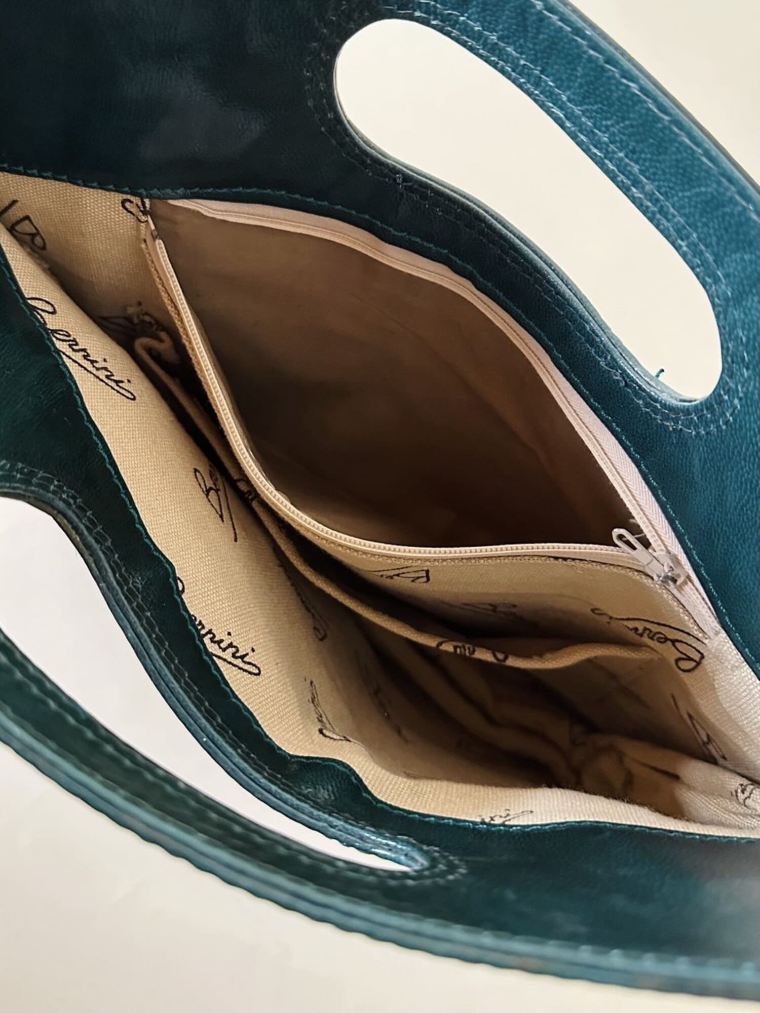 Un accessorio di forte personalità che incarna il fascino dell’eleganza vintage più ricercata. Questa borsa vintage Bernini è realizzata in vera pelle di pitone con una raffinata finitura lucida verde smeraldo, una tonalità intensa e luminosa che cattura lo sguardo e valorizza qualsiasi look. La silhouette strutturata, pulita e decisa, è bilanciata da manici con intaglio ovale realizzati in pelle in tinta al pitone, dettaglio distintivo che unisce estetica e funzionalità, garantendo un porto a mano elegante e confortevole. Gli angolari inferiori in metallo dorato aggiungono un accento prezioso e proteggono la borsa, esaltandone il carattere luxury. L’interno è rifinito con fodera in tessuto beige decorata dalla firma Bernini all over, e organizzato con due tasche laterali per una praticità discreta ed essenziale. Un pezzo unico, espressione di artigianalità e stile senza tempo, pensato per chi ama accessori iconici capaci di raccontare una storia di moda, qualità e unicità.