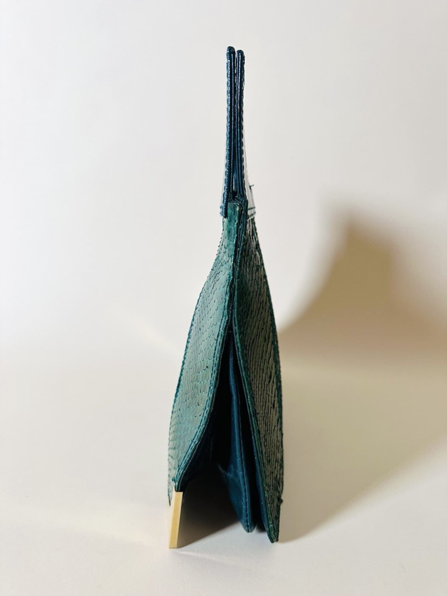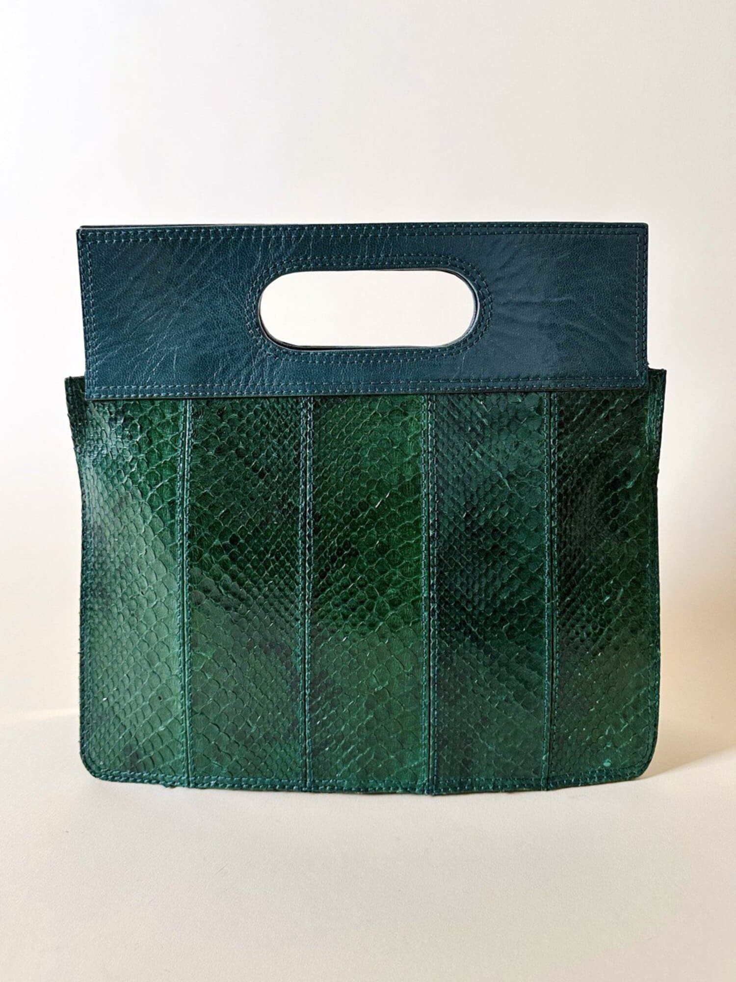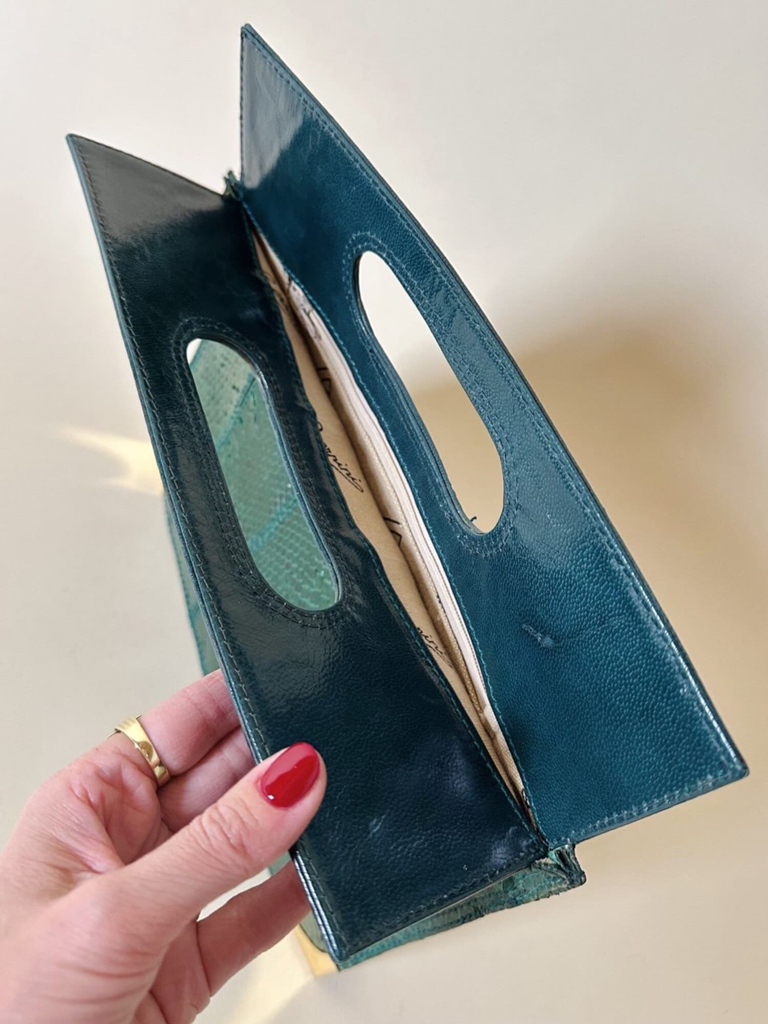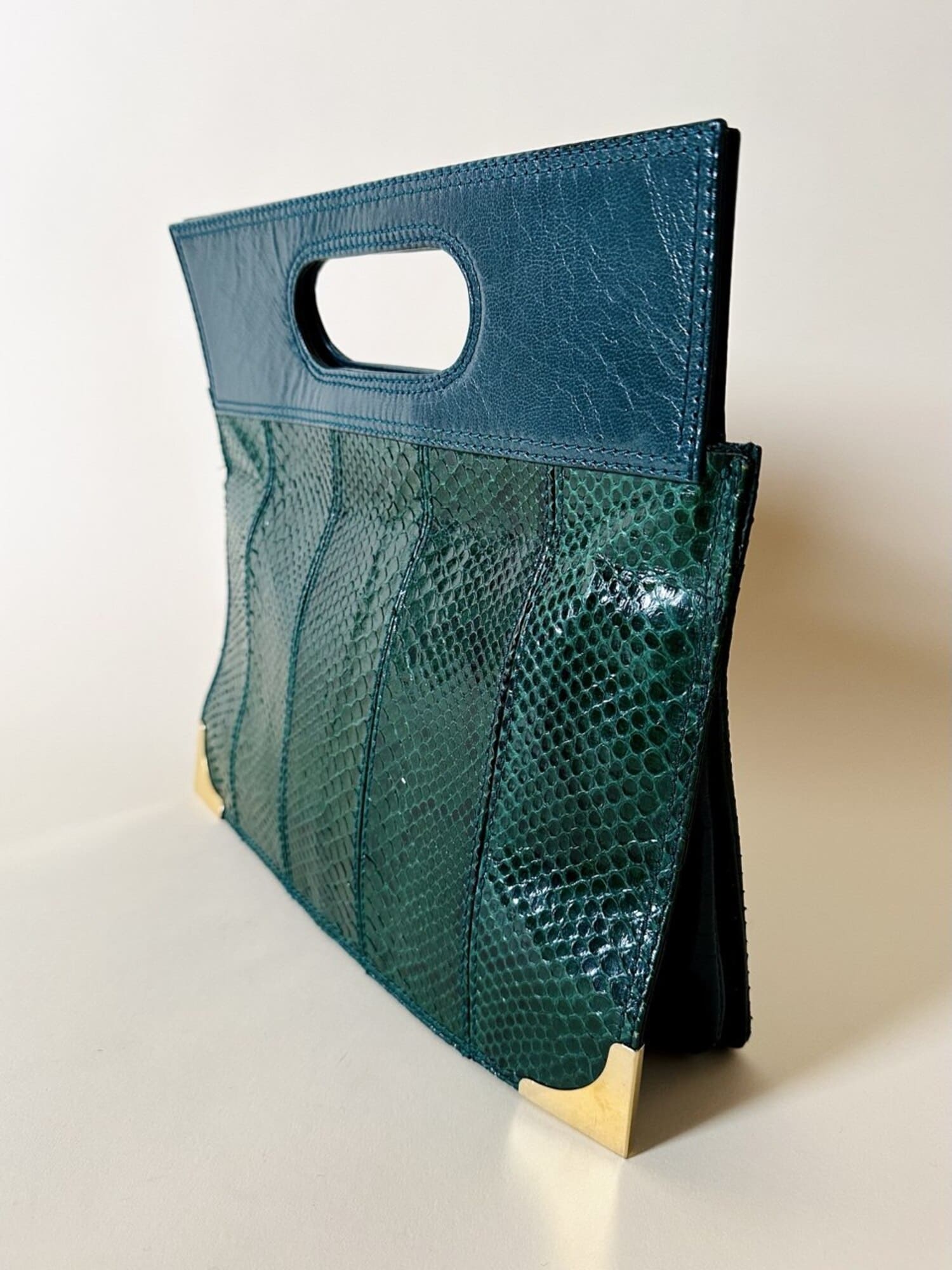 Un accessorio di forte personalità che incarna il fascino dell’eleganza vintage più ricercata. Questa borsa vintage Bernini è realizzata in vera pelle di pitone con una raffinata finitura lucida verde smeraldo, una tonalità intensa e luminosa che cattura lo sguardo e valorizza qualsiasi look. La silhouette strutturata, pulita e decisa, è bilanciata da manici con intaglio ovale realizzati in pelle in tinta al pitone, dettaglio distintivo che unisce estetica e funzionalità, garantendo un porto a mano elegante e confortevole. Gli angolari inferiori in metallo dorato aggiungono un accento prezioso e proteggono la borsa, esaltandone il carattere luxury. L’interno è rifinito con fodera in tessuto beige decorata dalla firma Bernini all over, e organizzato con due tasche laterali per una praticità discreta ed essenziale. Un pezzo unico, espressione di artigianalità e stile senza tempo, pensato per chi ama accessori iconici capaci di raccontare una storia di moda, qualità e unicità.