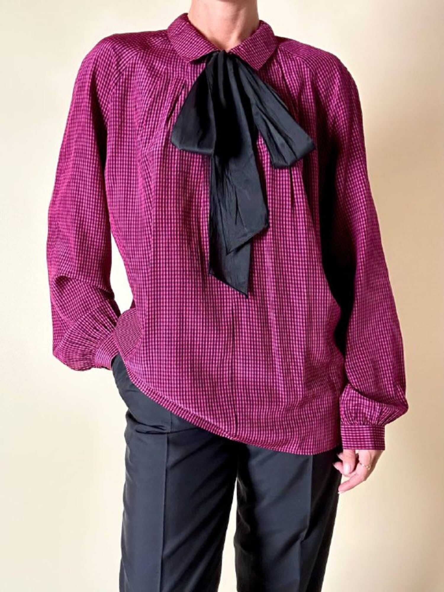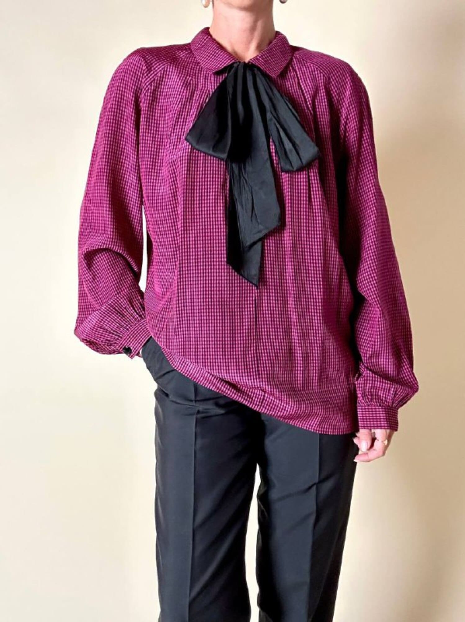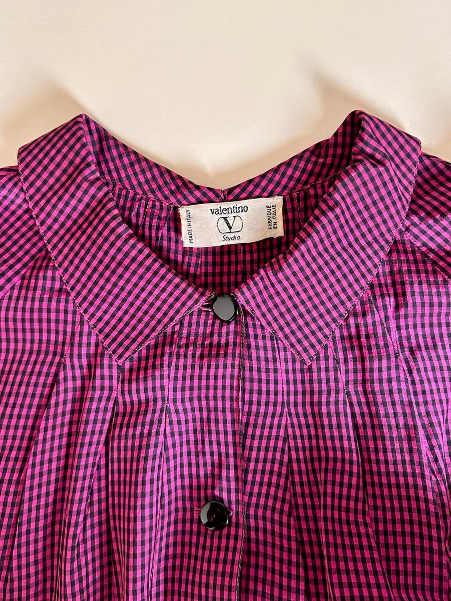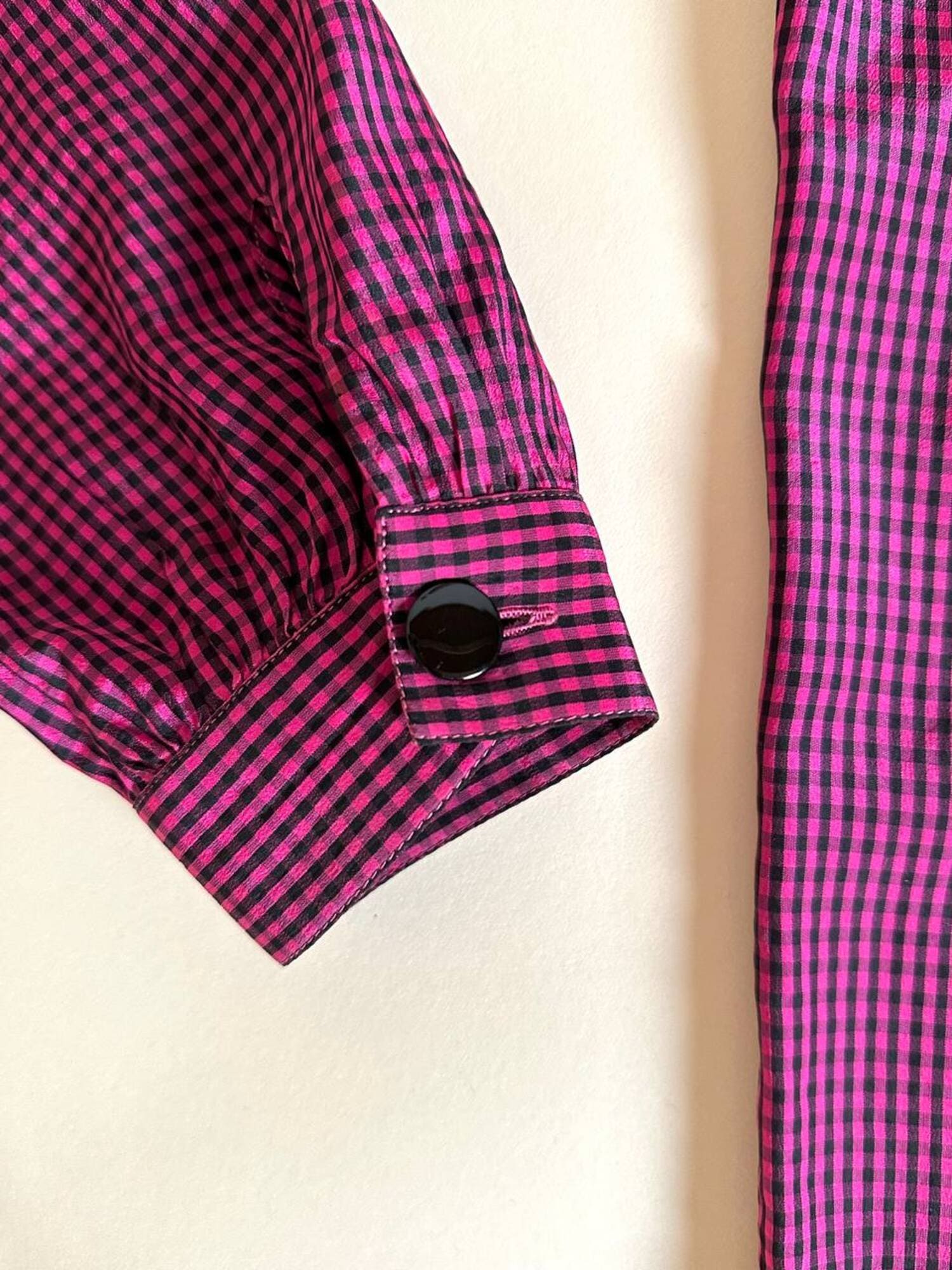 Raffinata camicia firmata “Valentino Studio”. Realizzata in seta opaca, leggera e fluida, presenta un’elegante fantasia a quadretti fucsia e neri che dona vivacità e stile. Il colletto femminile, dalla linea arrotondata, è impreziosito da un fiocco nero annodabile al collo, che aggiunge un tocco bon ton e sofisticato. L’apertura frontale è composta da tre bottoni a pastiglia neri lucidi, discreti ma eleganti. Il taglio ampio e dritto, unito alla manica raglan, offre una vestibilità comoda e versatile, perfetta per valorizzare diverse silhouette. Un capo iconico, ideale in tutte le stagioni, da abbinare a pantaloni sartoriali o gonne a vita alta, per un look da giorno raffinato o una mise da ufficio chic.