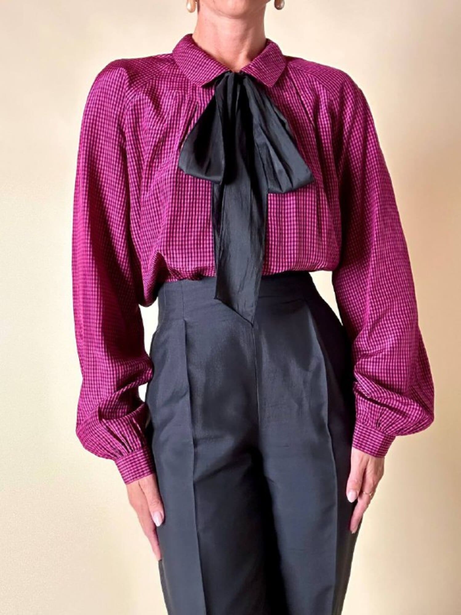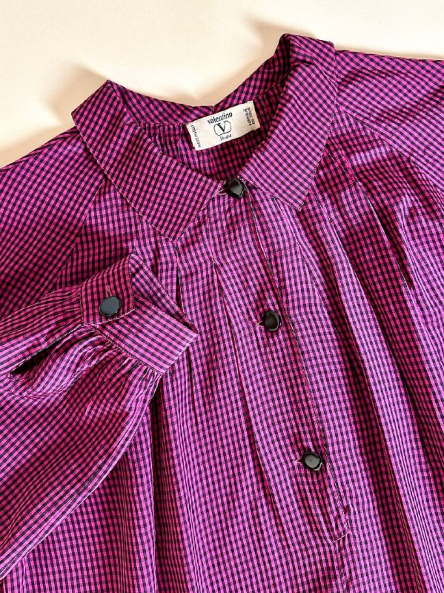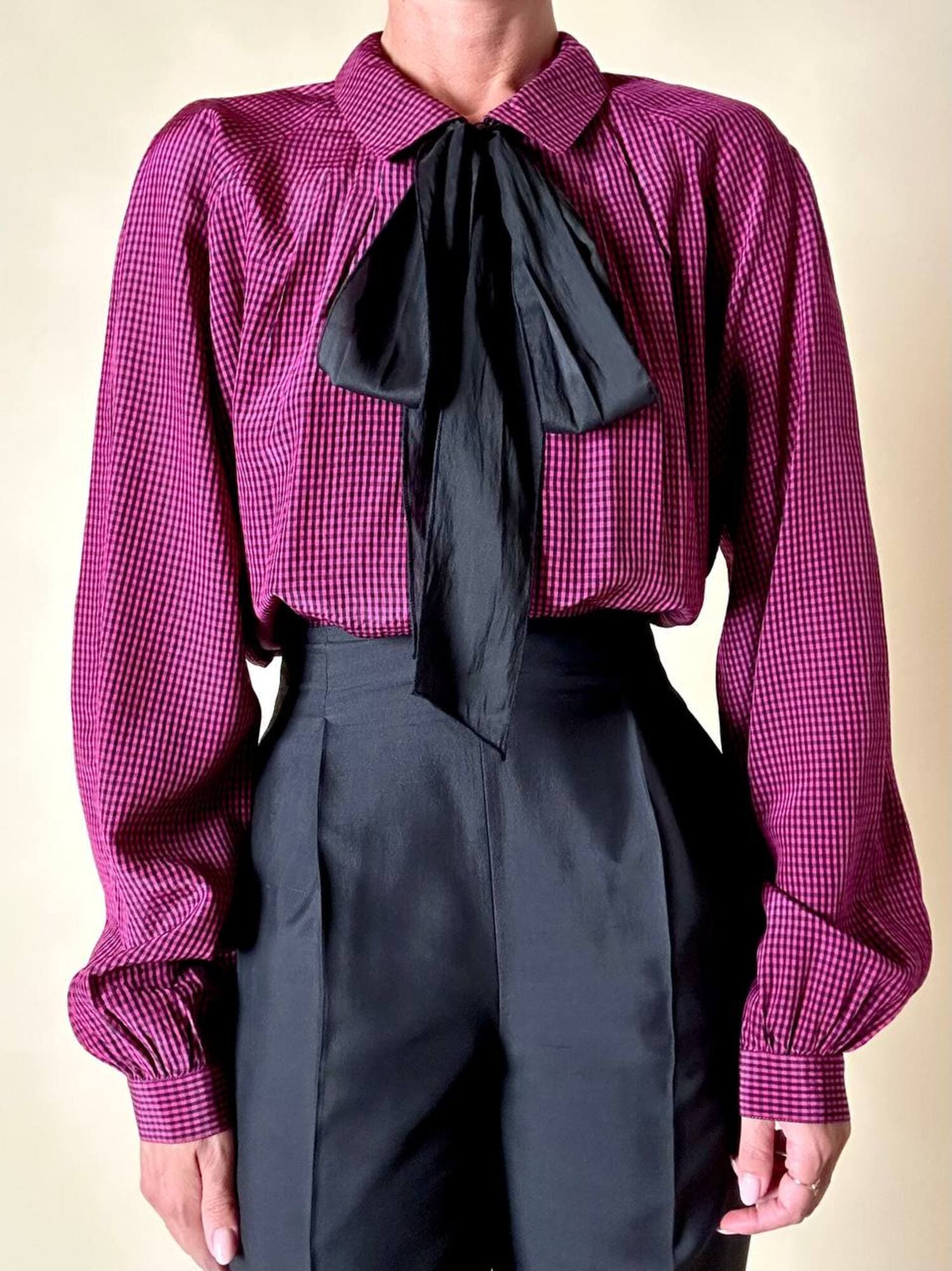 Raffinata camicia firmata “Valentino Studio”. Realizzata in seta opaca, leggera e fluida, presenta un’elegante fantasia a quadretti fucsia e neri che dona vivacità e stile. Il colletto femminile, dalla linea arrotondata, è impreziosito da un fiocco nero annodabile al collo, che aggiunge un tocco bon ton e sofisticato. L’apertura frontale è composta da tre bottoni a pastiglia neri lucidi, discreti ma eleganti. Il taglio ampio e dritto, unito alla manica raglan, offre una vestibilità comoda e versatile, perfetta per valorizzare diverse silhouette. Un capo iconico, ideale in tutte le stagioni, da abbinare a pantaloni sartoriali o gonne a vita alta, per un look da giorno raffinato o una mise da ufficio chic.