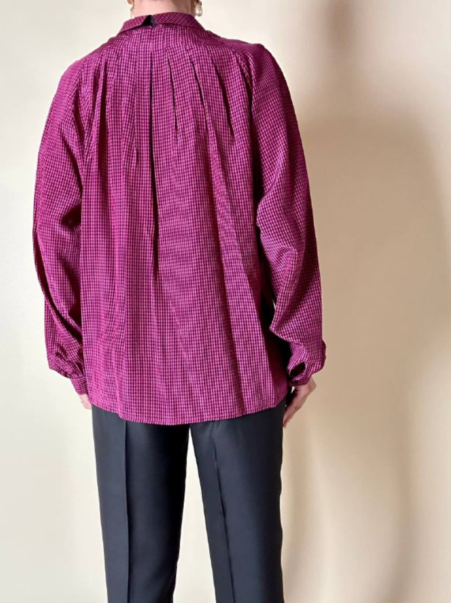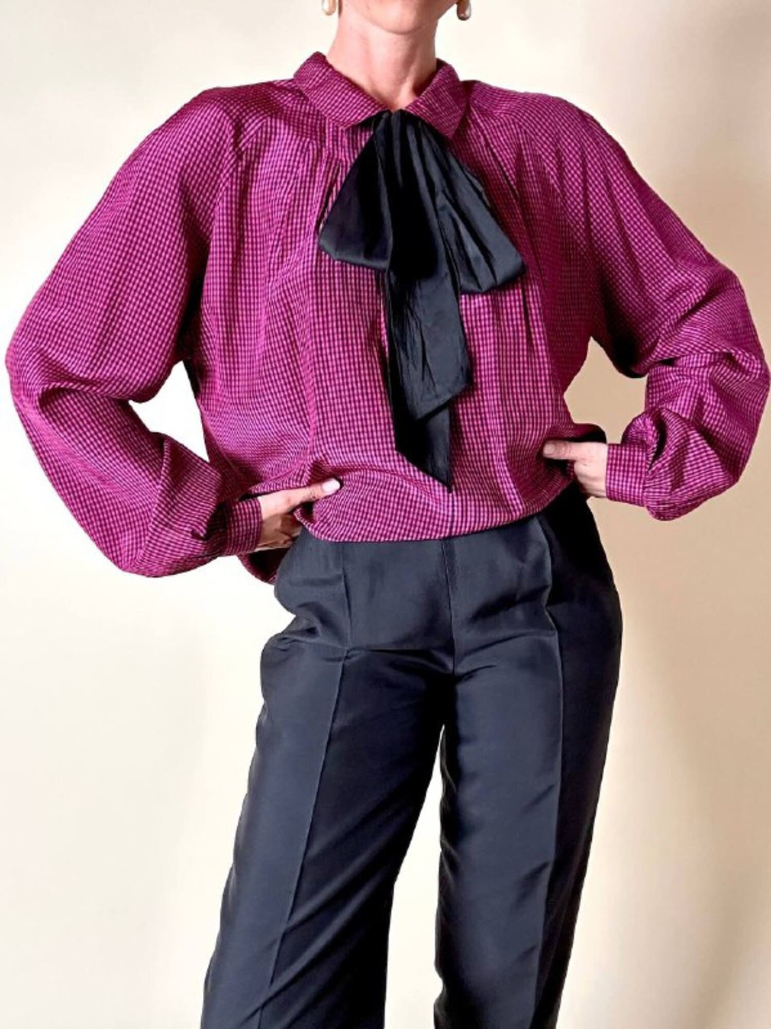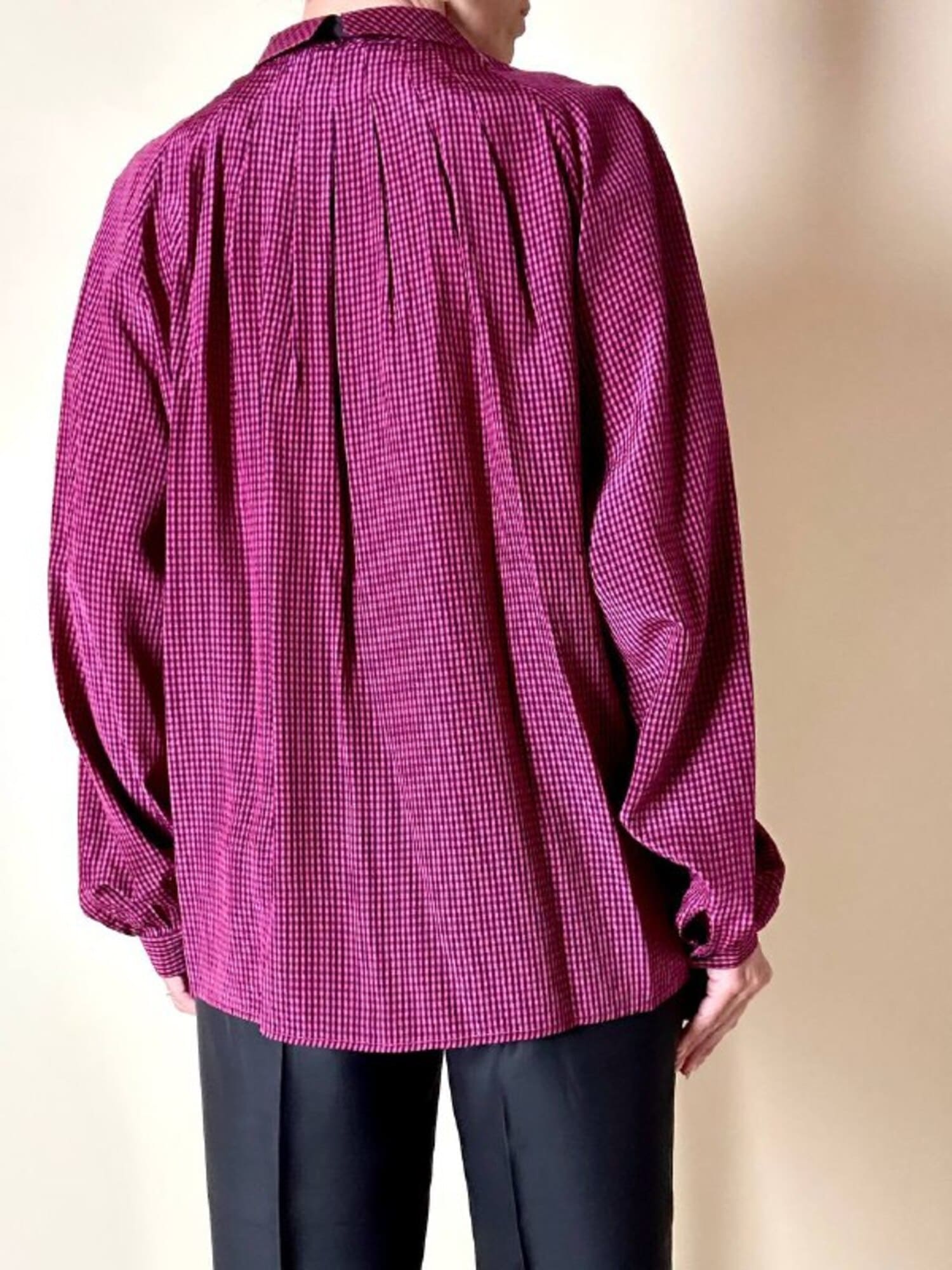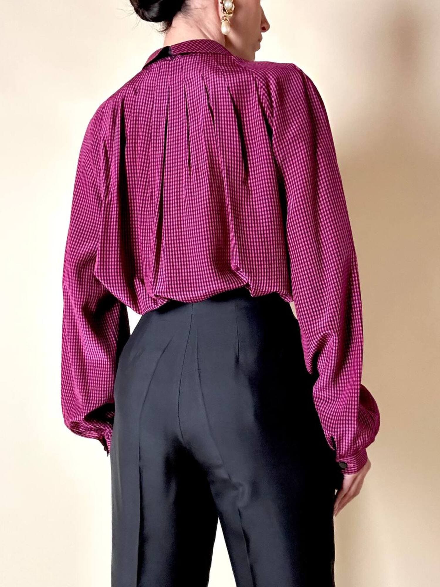 Raffinata camicia firmata “Valentino Studio”. Realizzata in seta opaca, leggera e fluida, presenta un’elegante fantasia a quadretti fucsia e neri che dona vivacità e stile. Il colletto femminile, dalla linea arrotondata, è impreziosito da un fiocco nero annodabile al collo, che aggiunge un tocco bon ton e sofisticato. L’apertura frontale è composta da tre bottoni a pastiglia neri lucidi, discreti ma eleganti. Il taglio ampio e dritto, unito alla manica raglan, offre una vestibilità comoda e versatile, perfetta per valorizzare diverse silhouette. Un capo iconico, ideale in tutte le stagioni, da abbinare a pantaloni sartoriali o gonne a vita alta, per un look da giorno raffinato o una mise da ufficio chic.