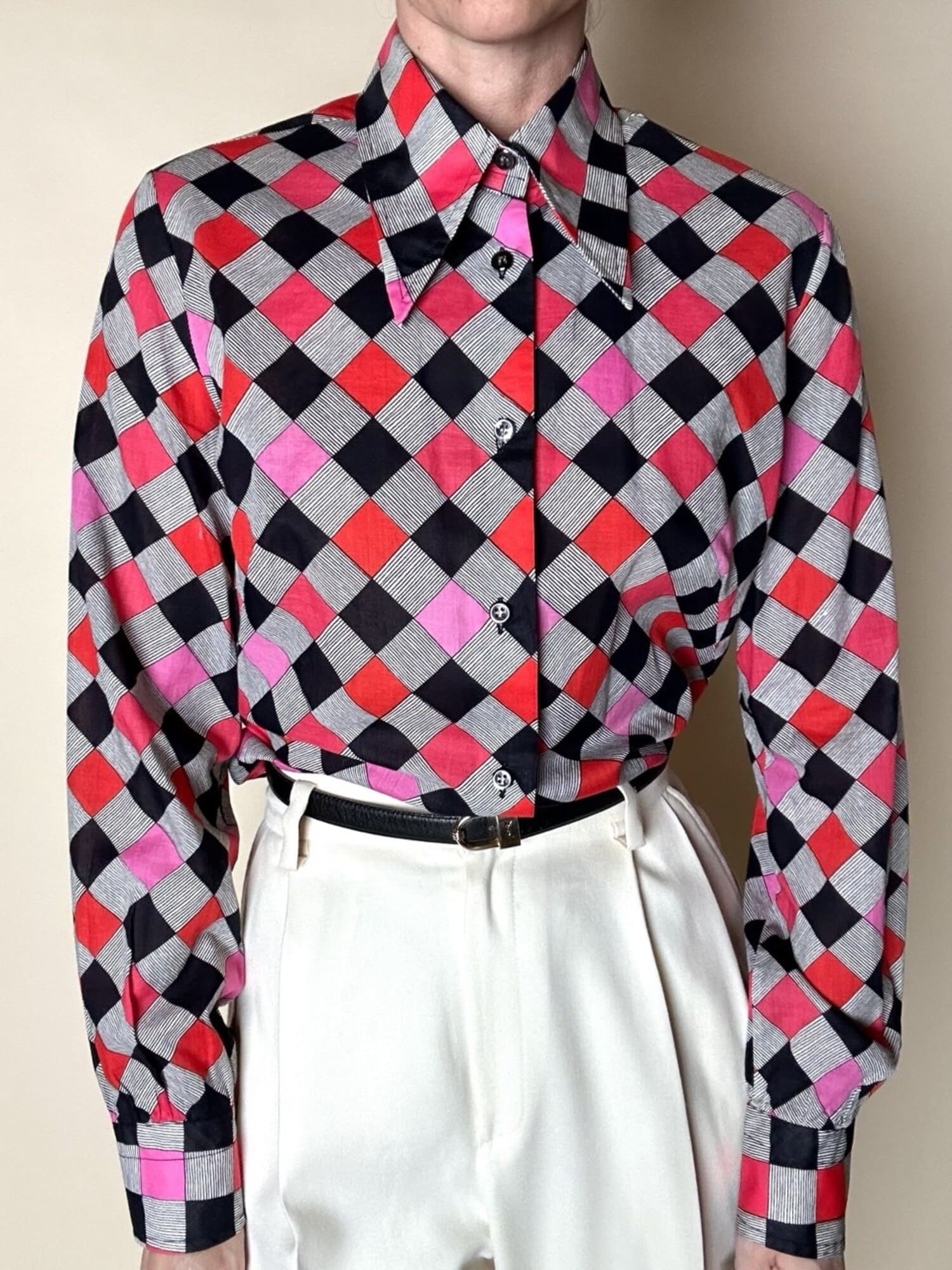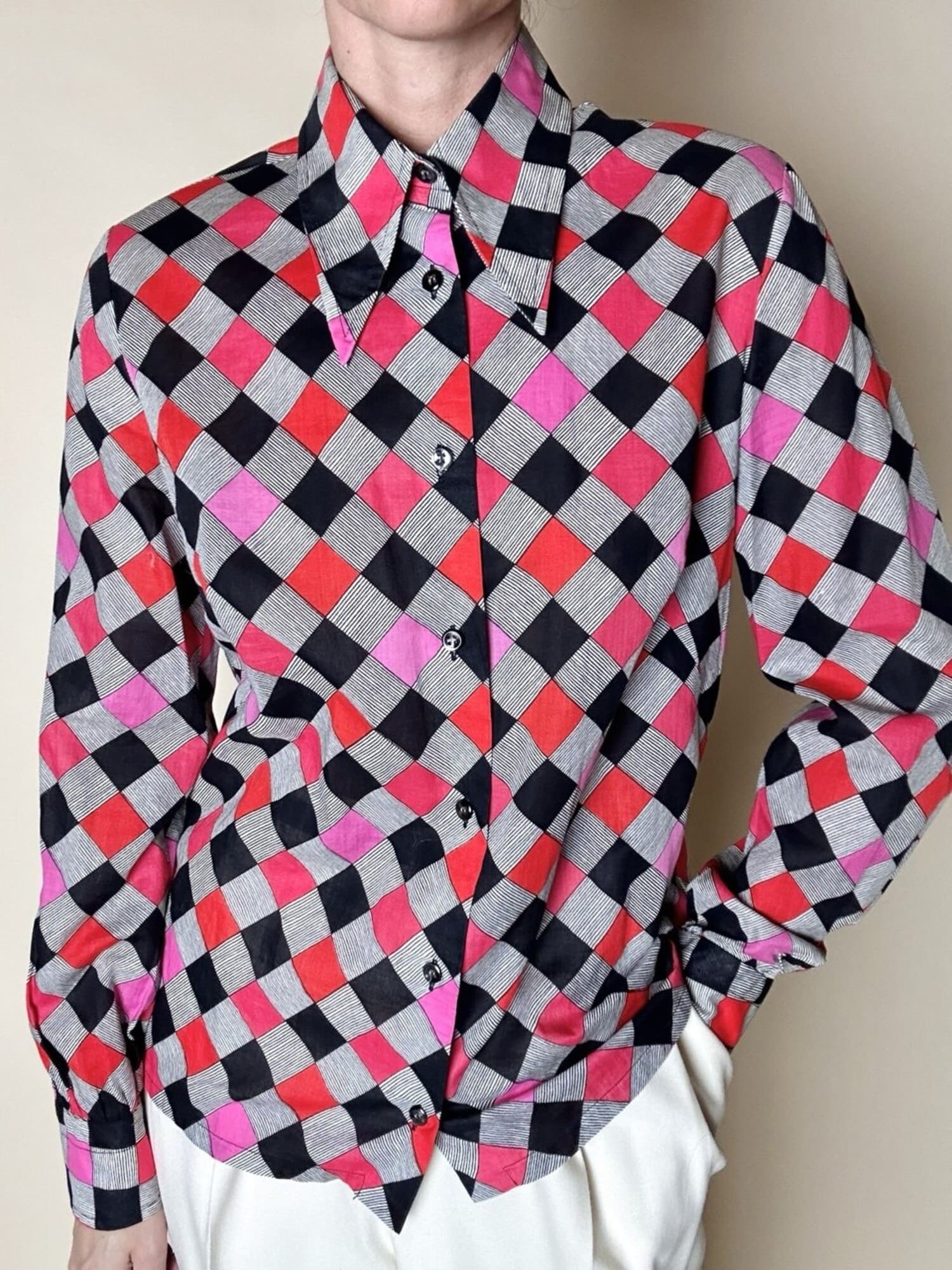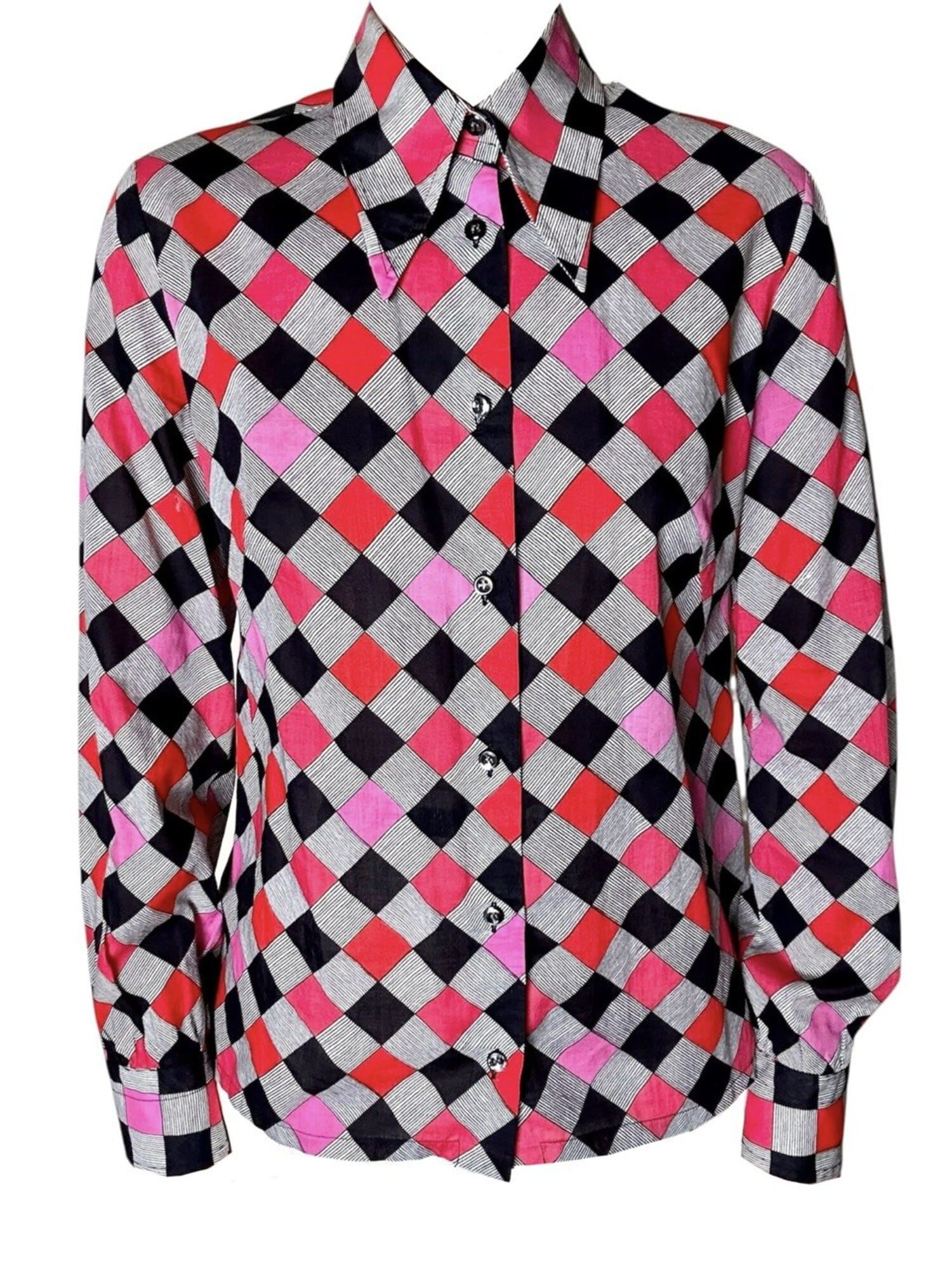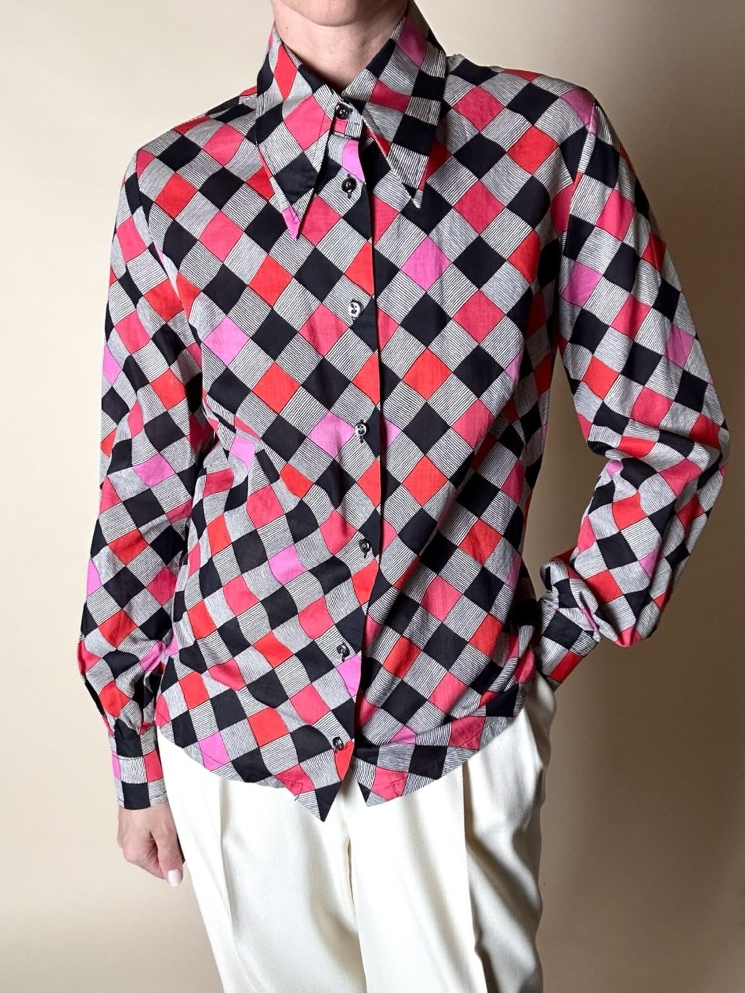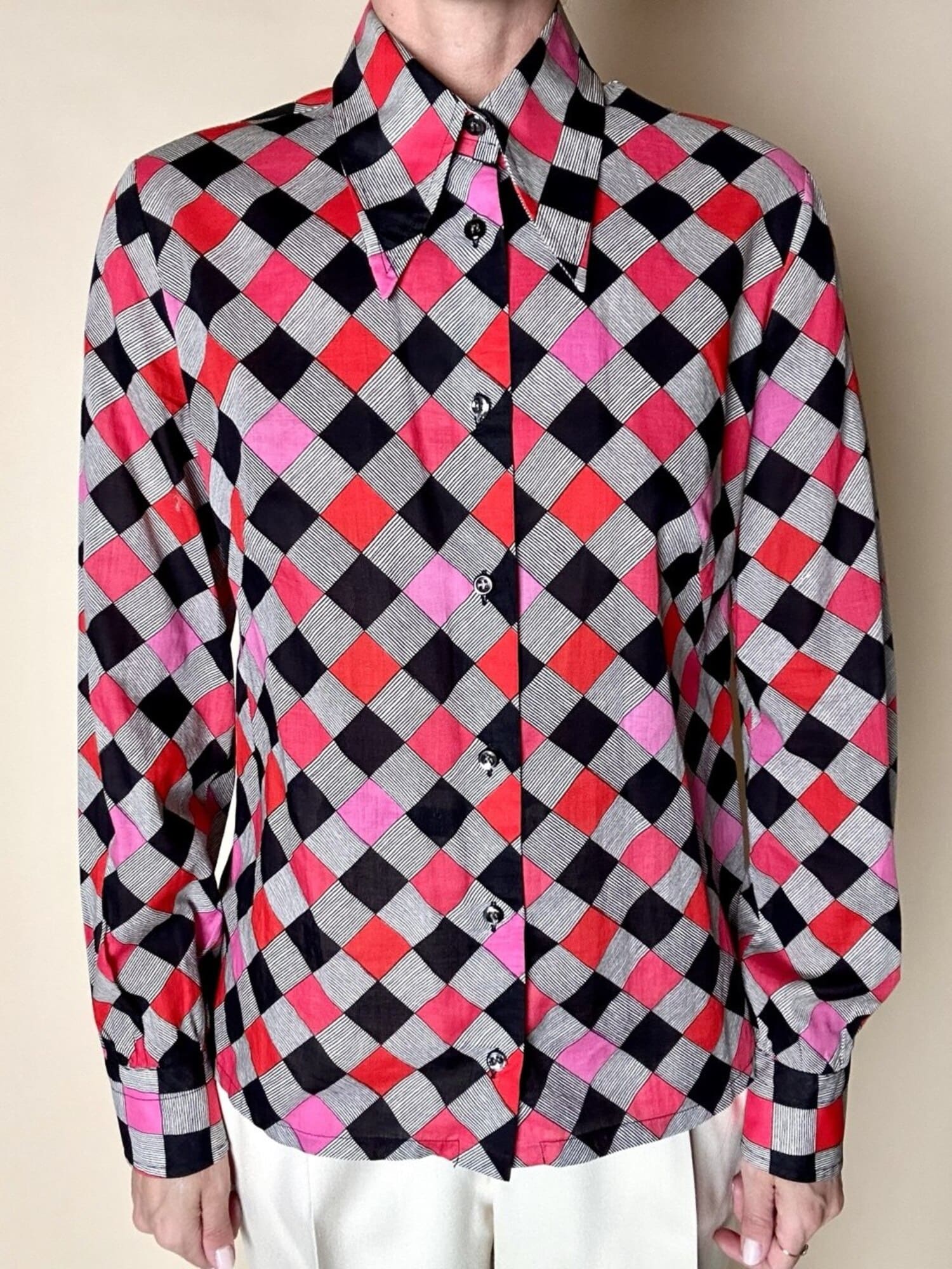 Splendida camicia vintage originale anni ‘70, dal fascino intramontabile e super attuale. Presenta un elegante colletto a punta e una particolare fantasia a scacchi diagonali nei toni del rosa, rosso, nero e bianco con dettagli a mille righe, perfetta per dare carattere a qualsiasi outfit. Il modello è sciancrato, valorizza la silhouette e dona una vestibilità femminile e raffinata. Dotata di classica abbottonatura frontale e polsini alti, dettagli tipici dell’epoca. Realizzata in pregiato cotone leggero e fresco, è ideale per tutte le stagioni: perfetta sia indossata da sola che sopra top o sotto blazer.