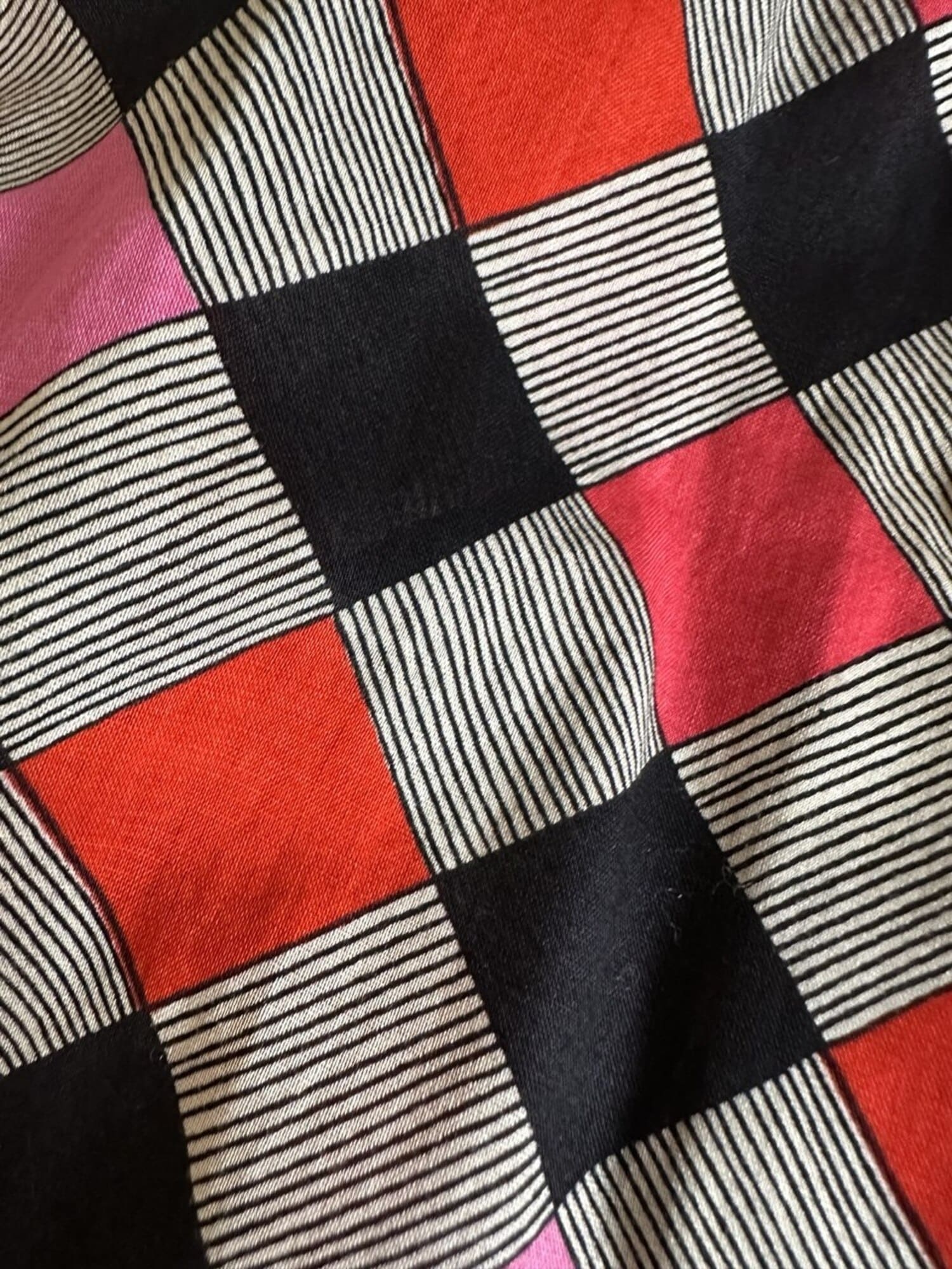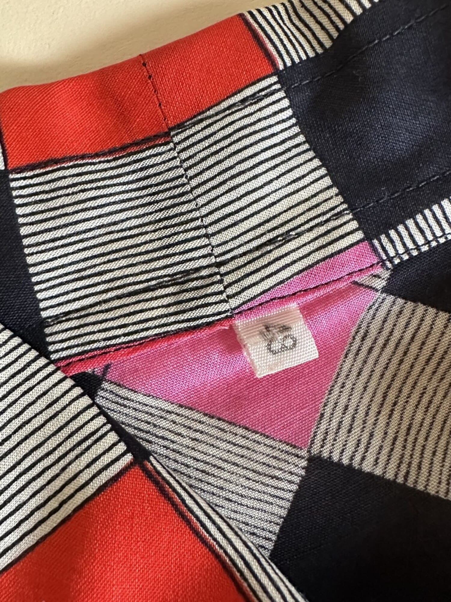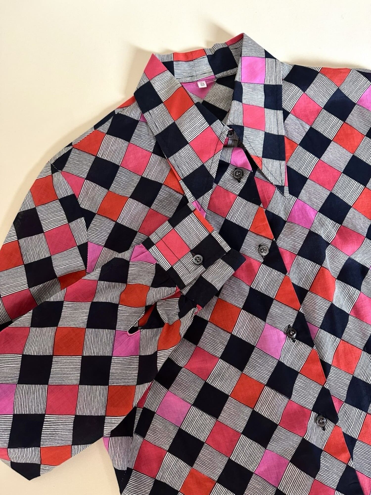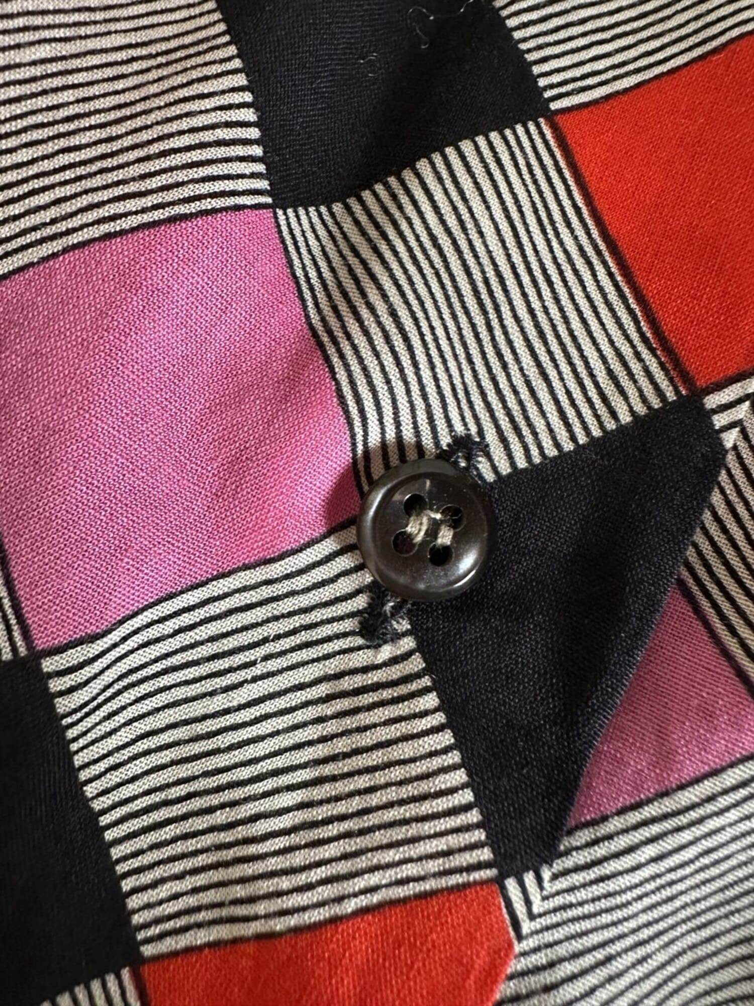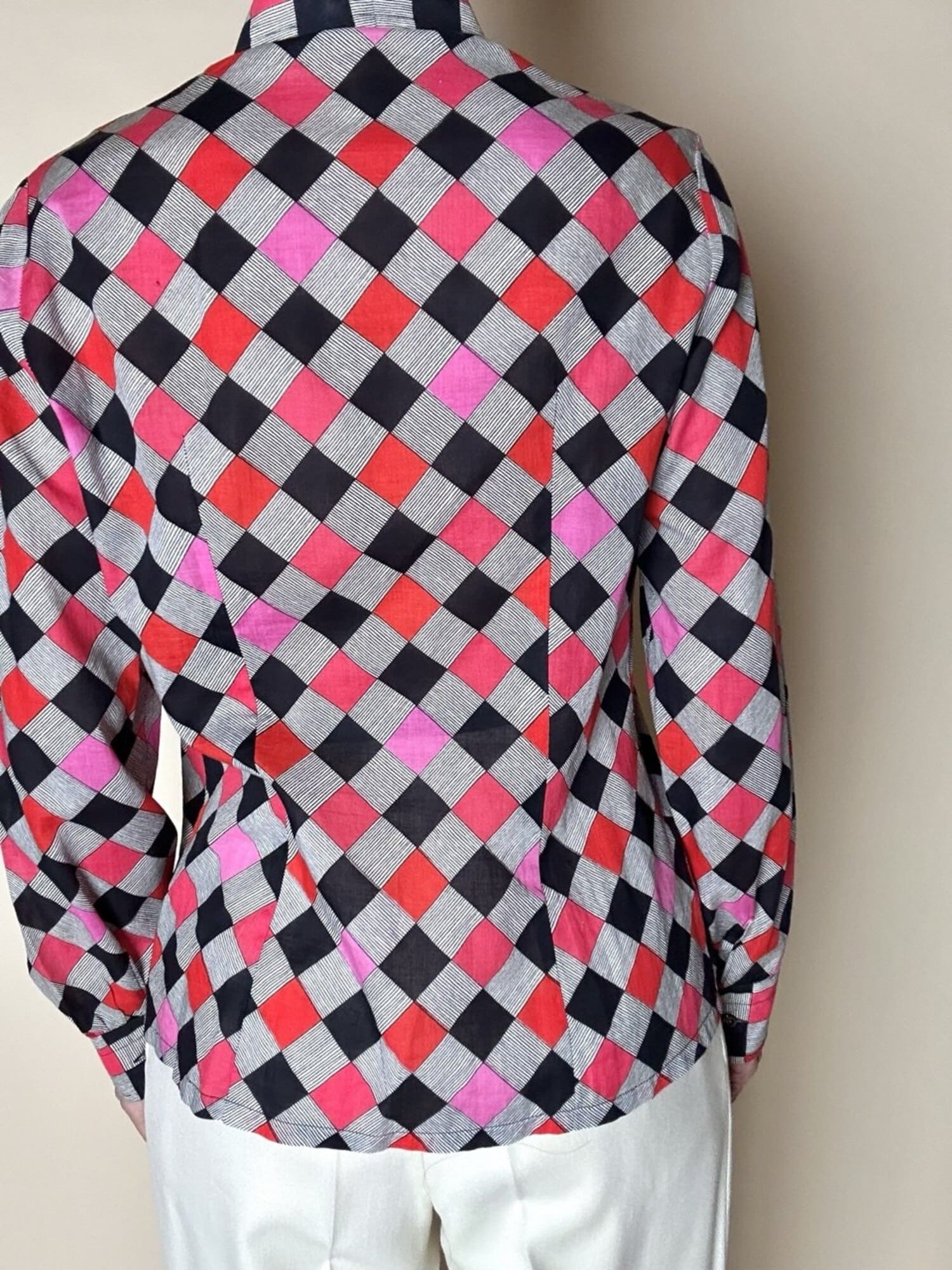 Splendida camicia vintage originale anni ‘70, dal fascino intramontabile e super attuale. Presenta un elegante colletto a punta e una particolare fantasia a scacchi diagonali nei toni del rosa, rosso, nero e bianco con dettagli a mille righe, perfetta per dare carattere a qualsiasi outfit. Il modello è sciancrato, valorizza la silhouette e dona una vestibilità femminile e raffinata. Dotata di classica abbottonatura frontale e polsini alti, dettagli tipici dell’epoca. Realizzata in pregiato cotone leggero e fresco, è ideale per tutte le stagioni: perfetta sia indossata da sola che sopra top o sotto blazer.
