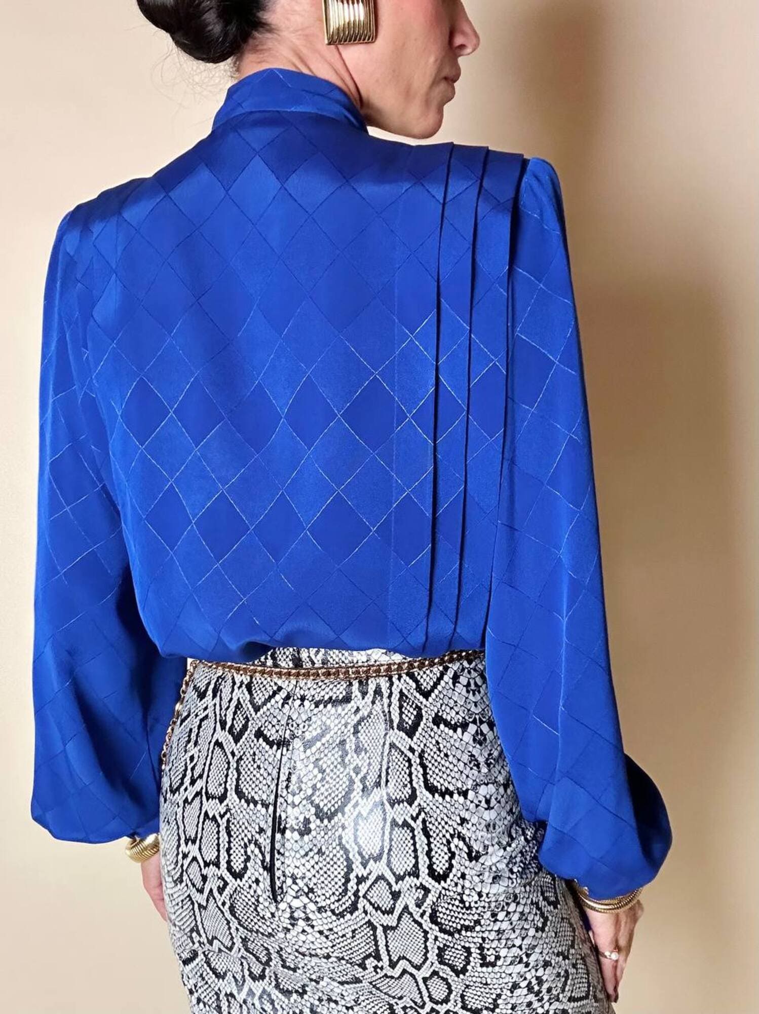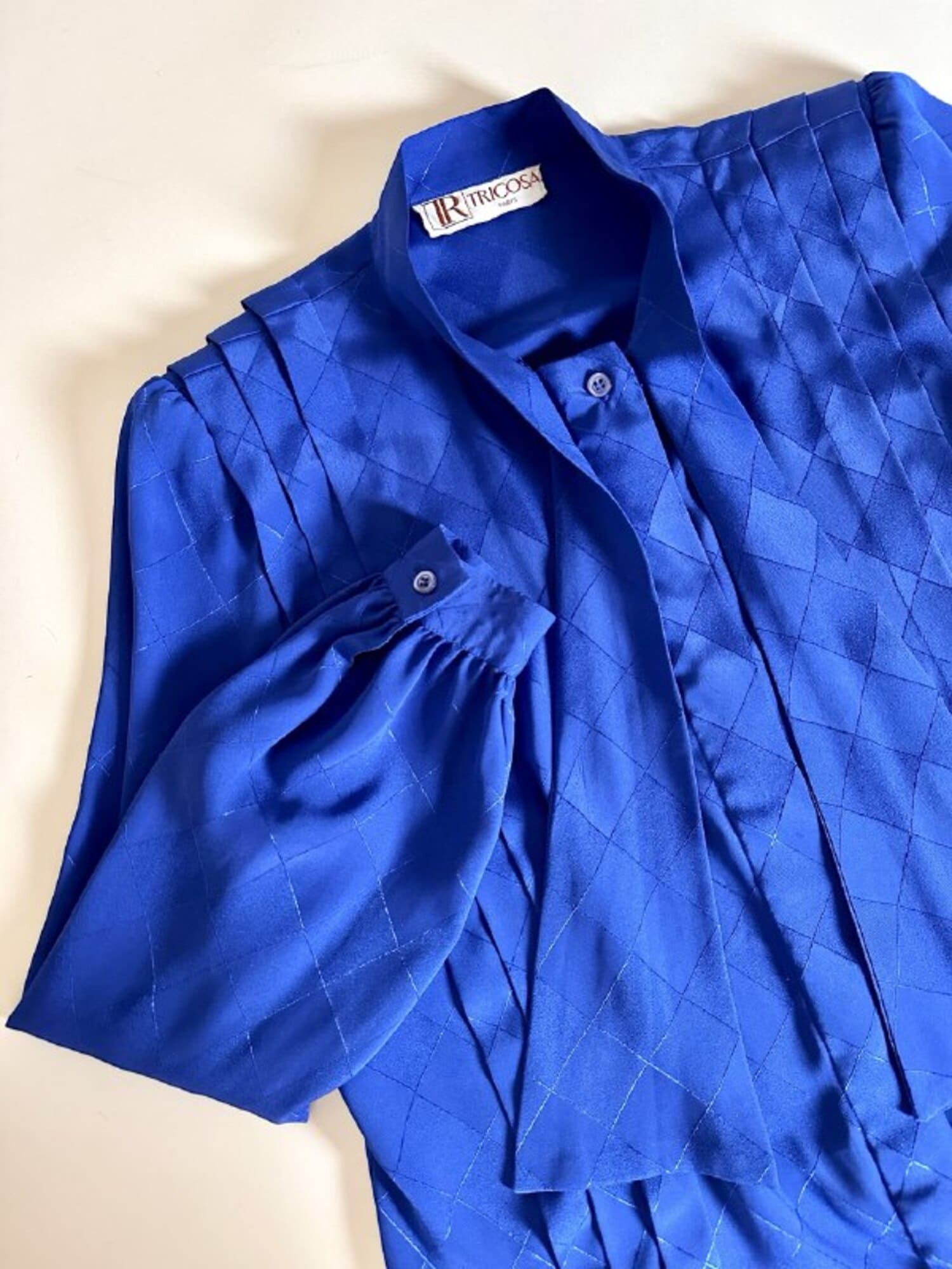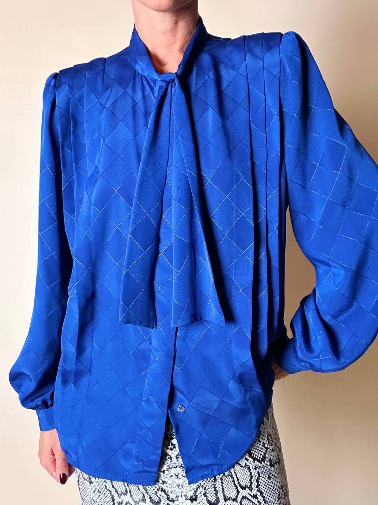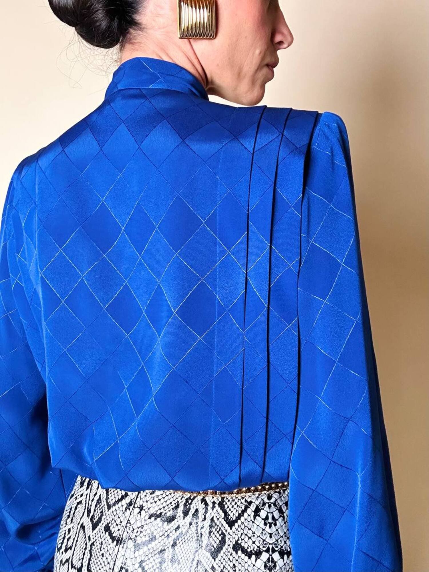 Questa camicia vintage bluette in tessuto jacquard operato a losanghe unisce la luminosità della lavorazione materica a un design ricercato, espressione di un eleganza senza tempo. Il nastro al collo, da annodare a sciarpina, evoca un fascino rétro reinterpretato con equilibrio moderno. Le maniche morbide e i dettagli laterali con tre pieghe larghe sovrapposte scolpiscono delicatamente la linea delle spalle, creando un movimento armonico. L’abbottonatura frontale a scomparsa e i bottoni in tinta siglano una pulizia formale sofisticata, pensata per donne che amano uno stile classico ma ricco di personalità.