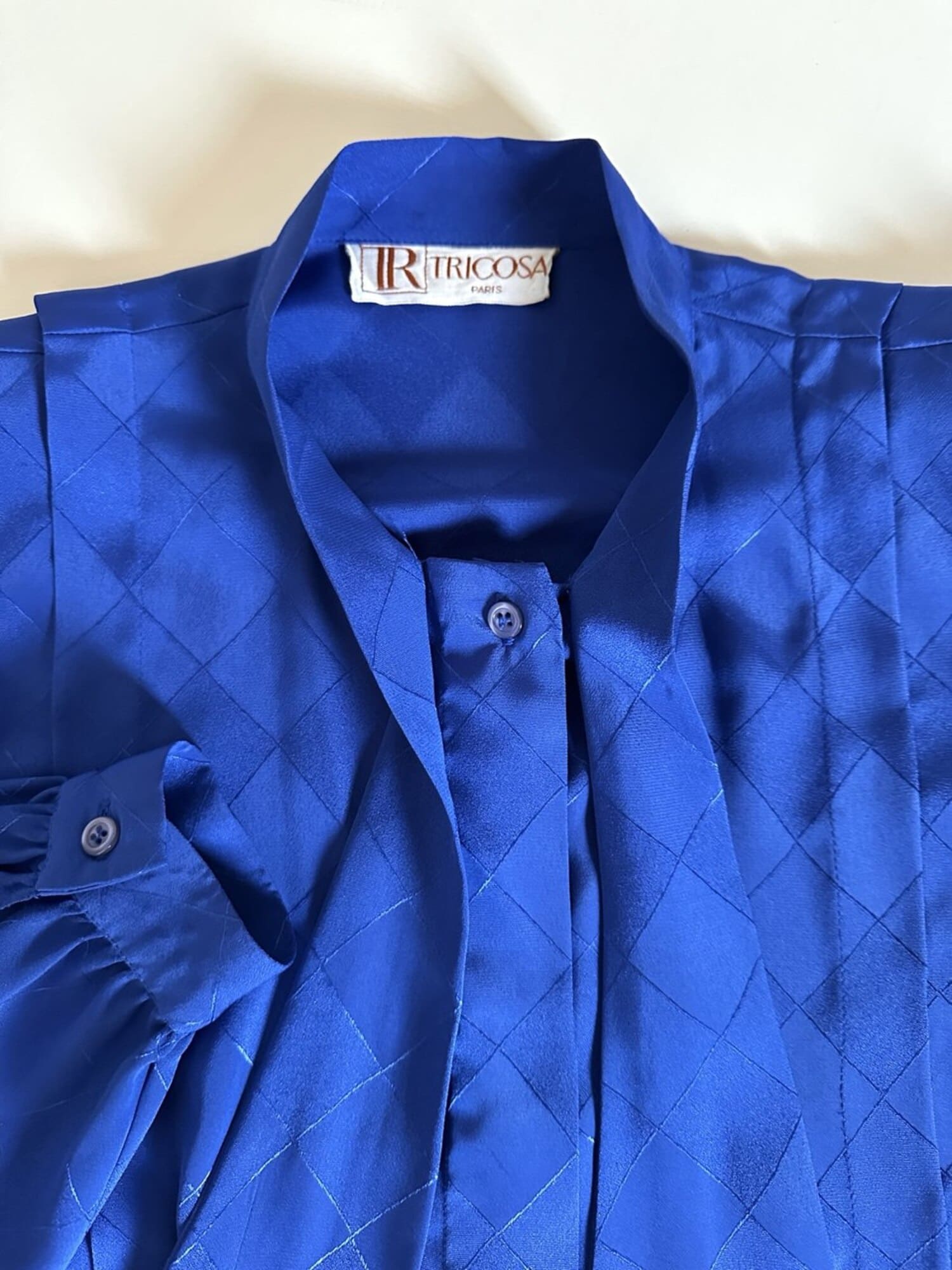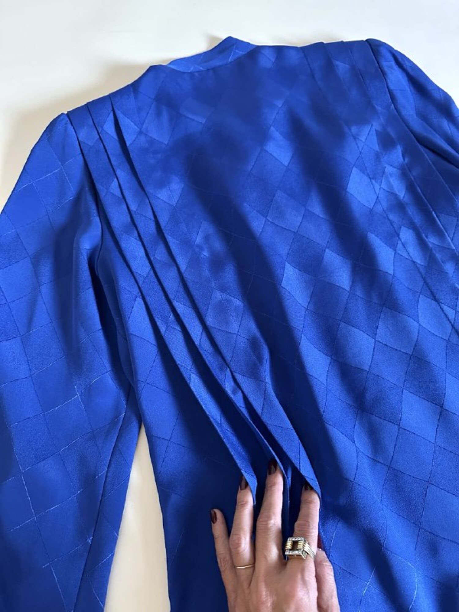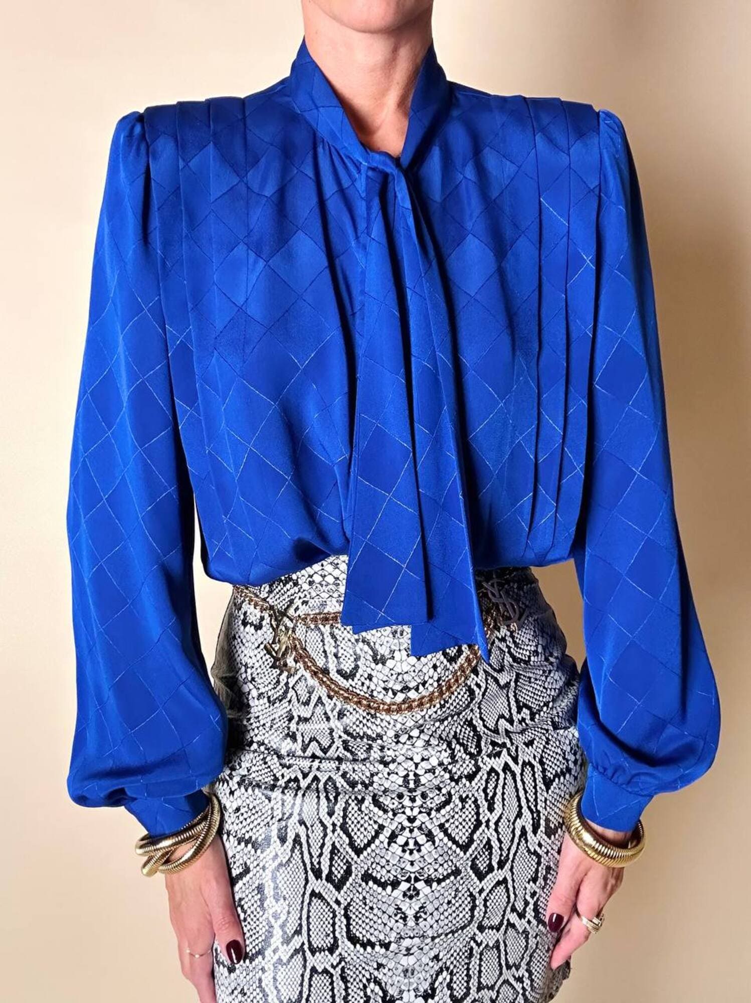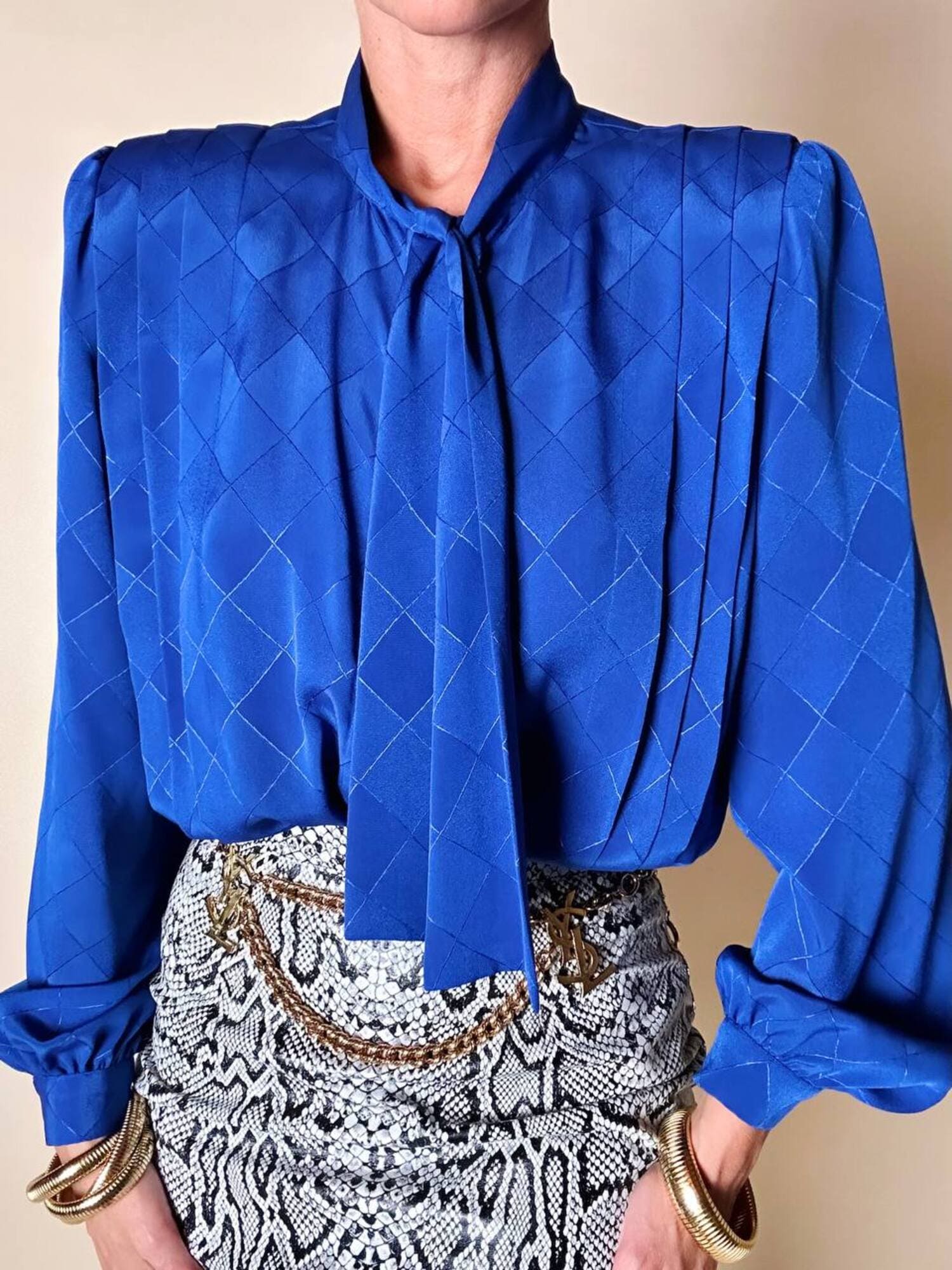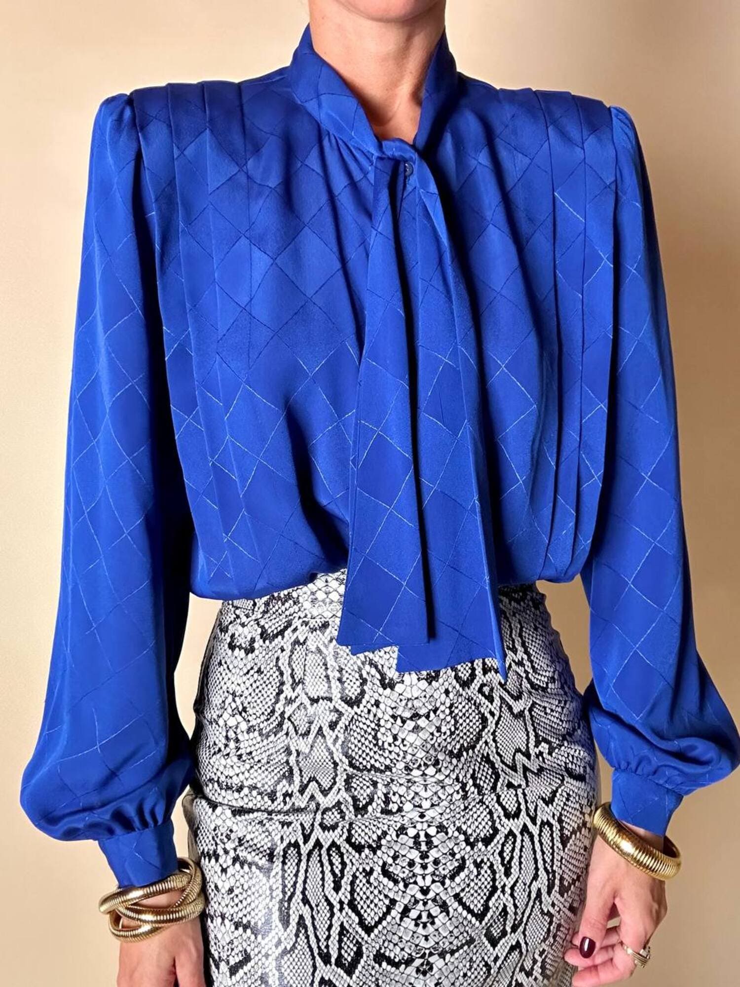 Questa camicia vintage bluette in tessuto jacquard operato a losanghe unisce la luminosità della lavorazione materica a un design ricercato, espressione di un eleganza senza tempo. Il nastro al collo, da annodare a sciarpina, evoca un fascino rétro reinterpretato con equilibrio moderno. Le maniche morbide e i dettagli laterali con tre pieghe larghe sovrapposte scolpiscono delicatamente la linea delle spalle, creando un movimento armonico. L’abbottonatura frontale a scomparsa e i bottoni in tinta siglano una pulizia formale sofisticata, pensata per donne che amano uno stile classico ma ricco di personalità.