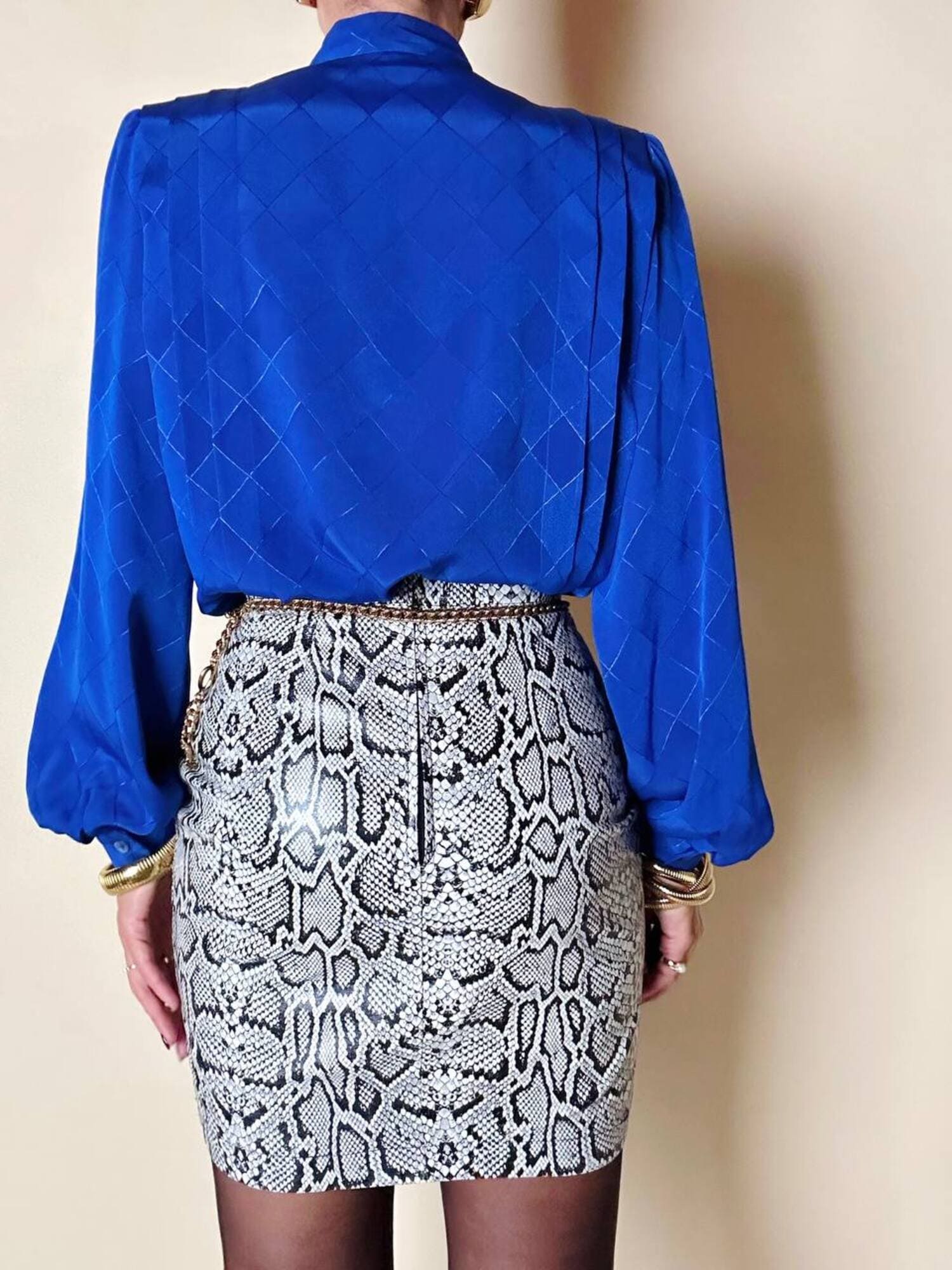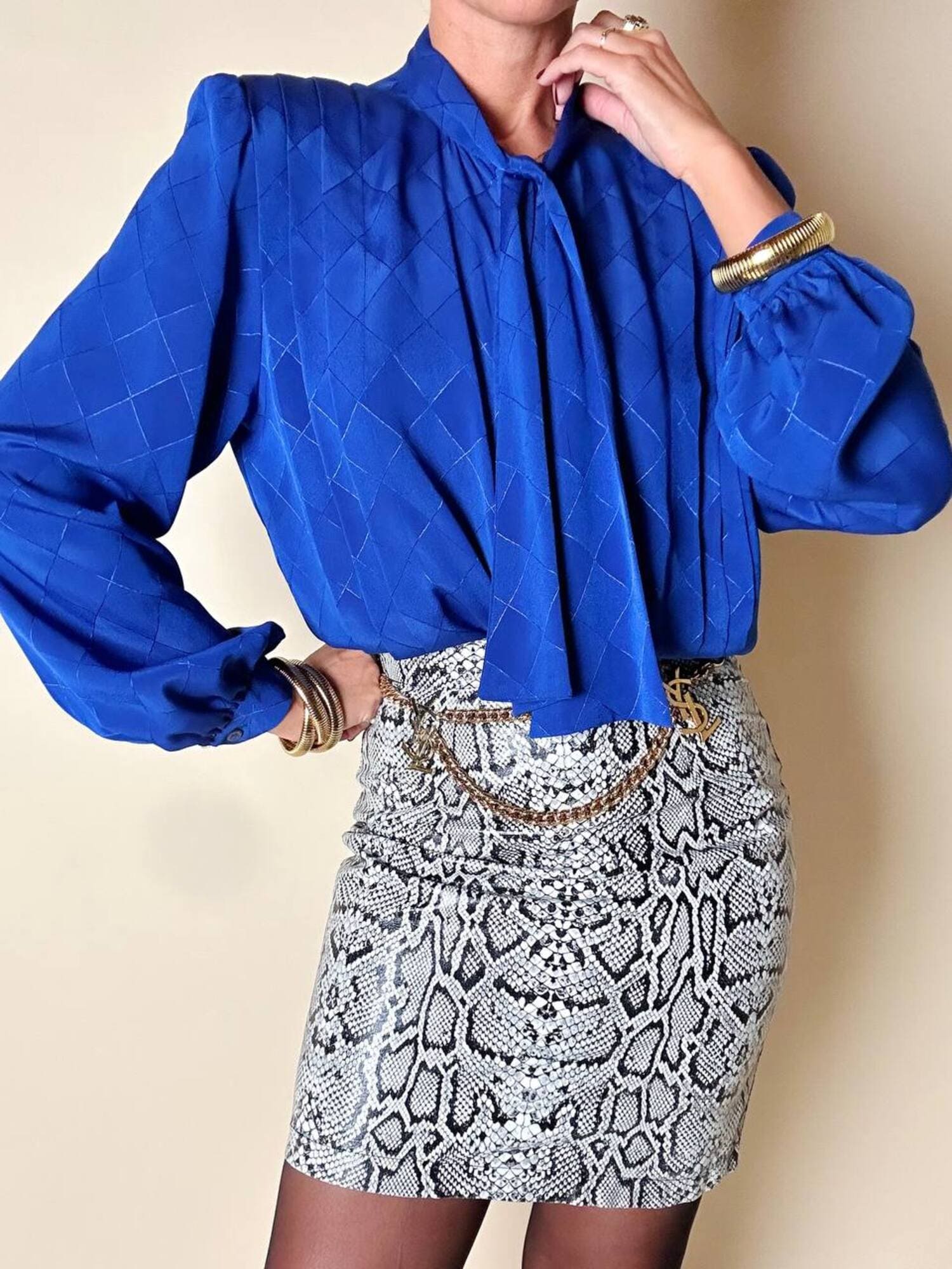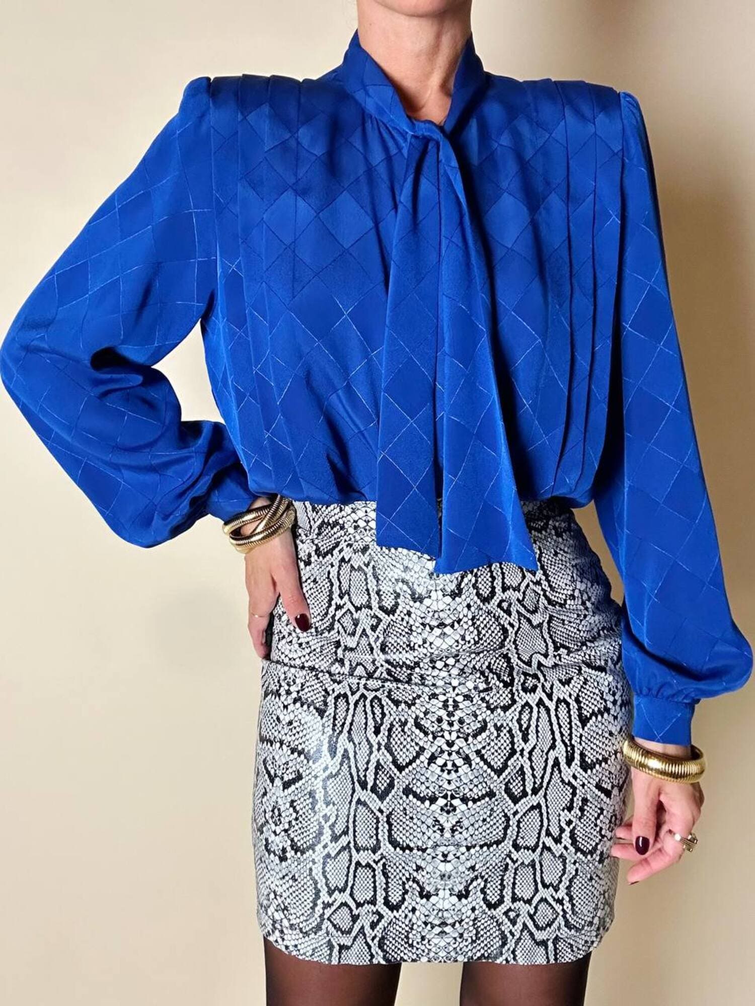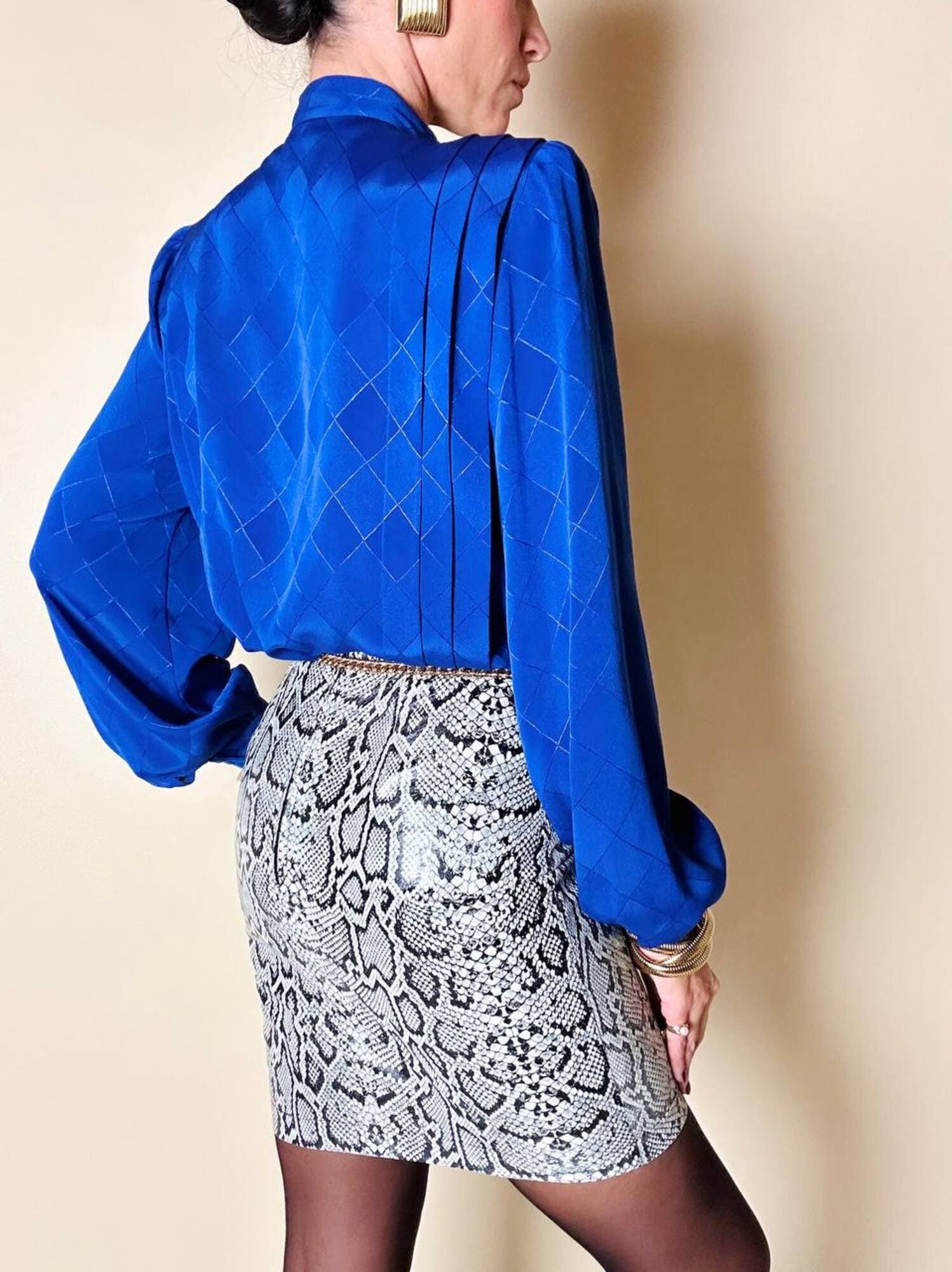 Questa camicia vintage bluette in tessuto jacquard operato a losanghe unisce la luminosità della lavorazione materica a un design ricercato, espressione di un eleganza senza tempo. Il nastro al collo, da annodare a sciarpina, evoca un fascino rétro reinterpretato con equilibrio moderno. Le maniche morbide e i dettagli laterali con tre pieghe larghe sovrapposte scolpiscono delicatamente la linea delle spalle, creando un movimento armonico. L’abbottonatura frontale a scomparsa e i bottoni in tinta siglano una pulizia formale sofisticata, pensata per donne che amano uno stile classico ma ricco di personalità.