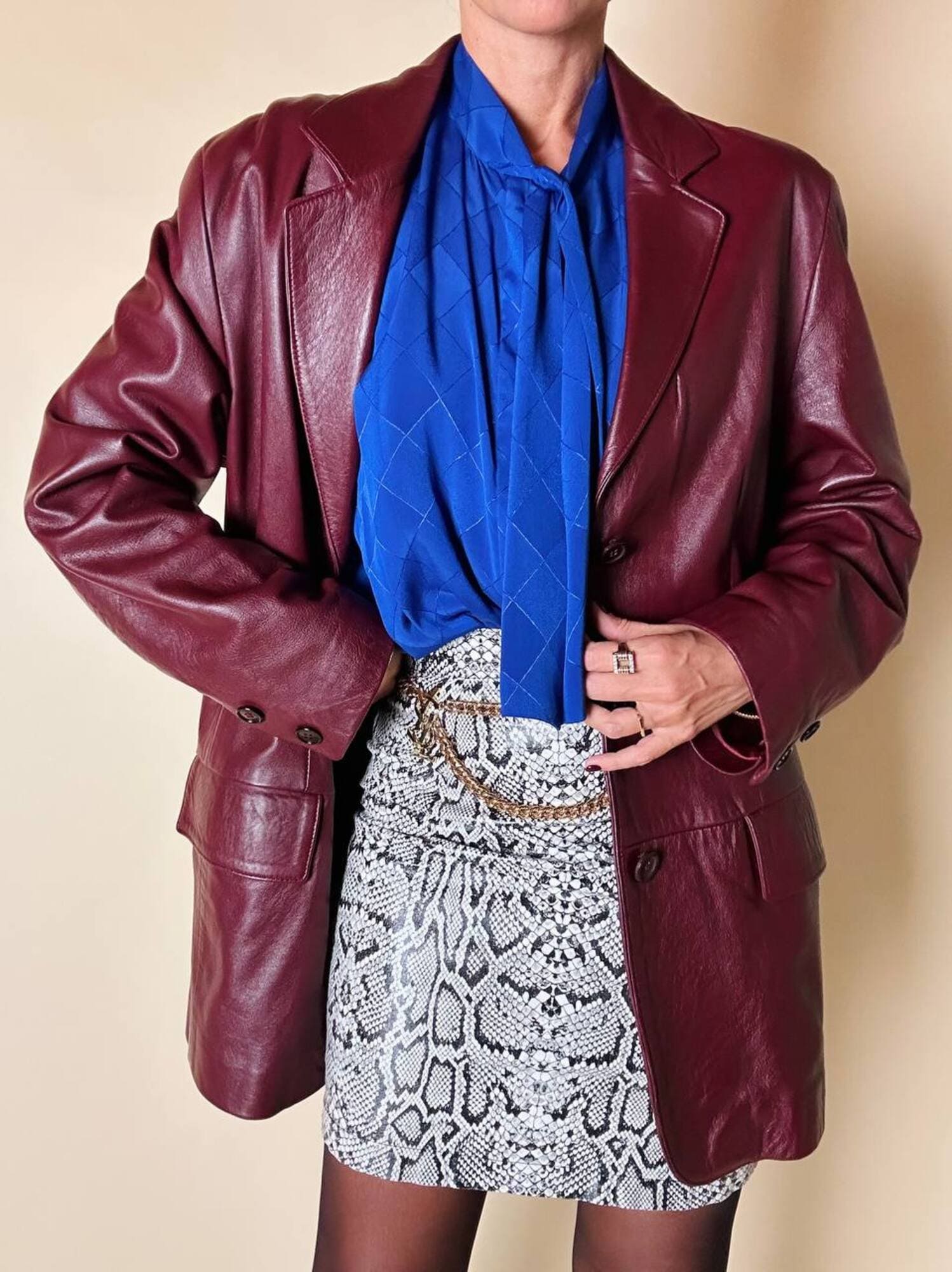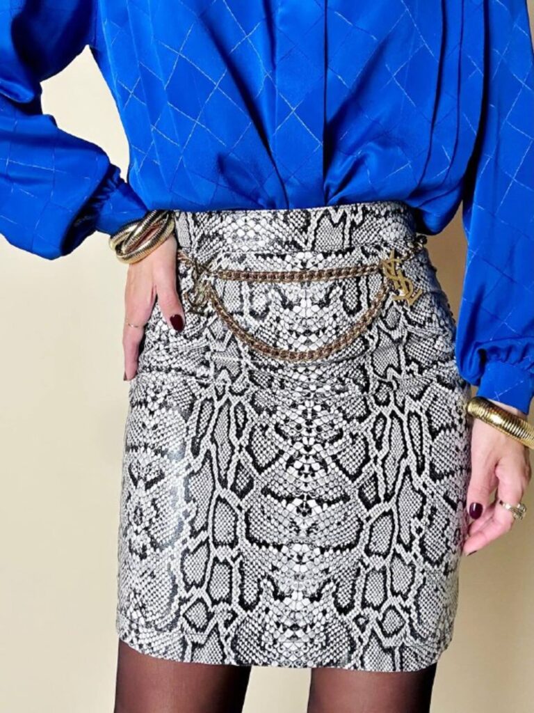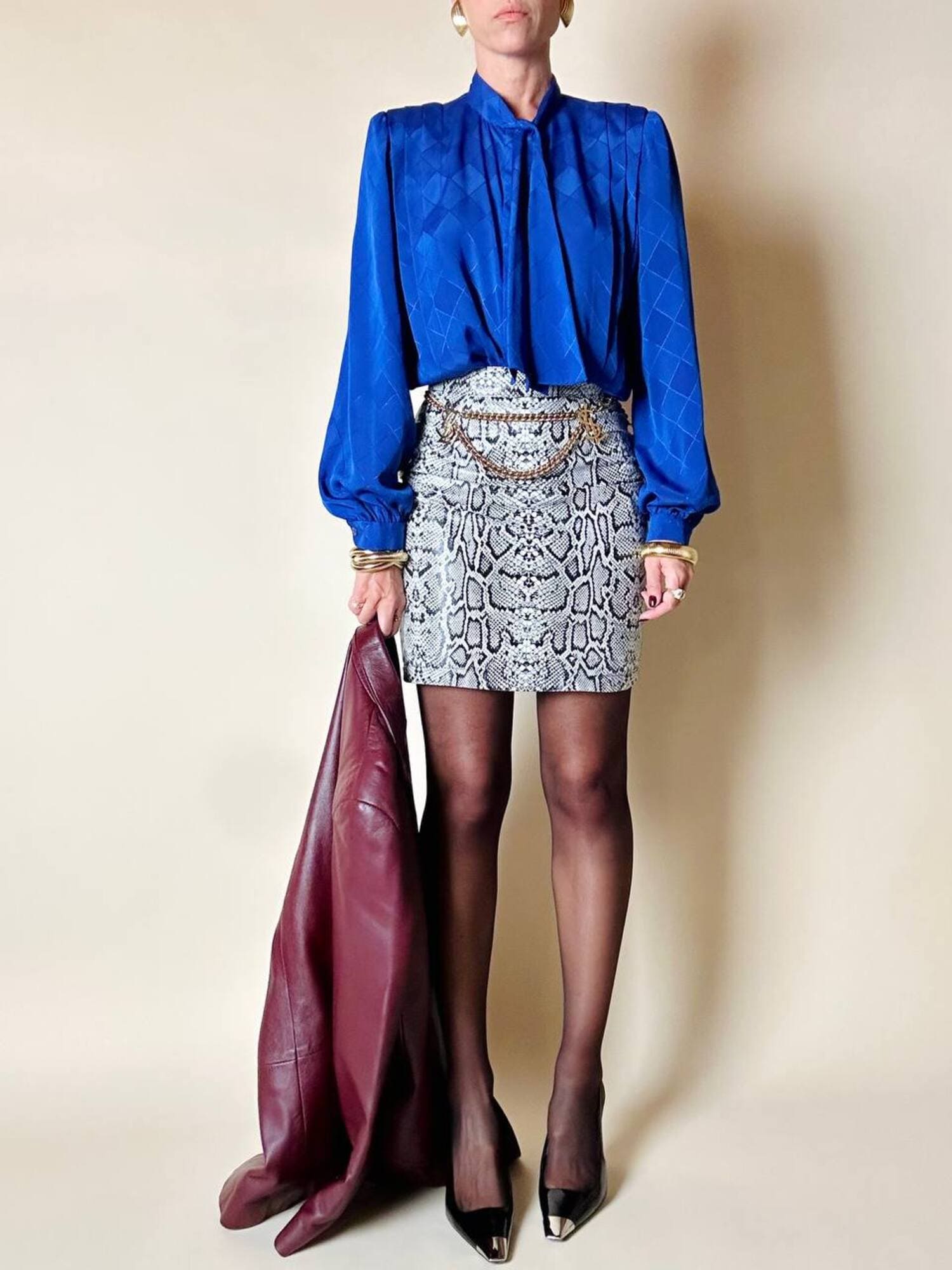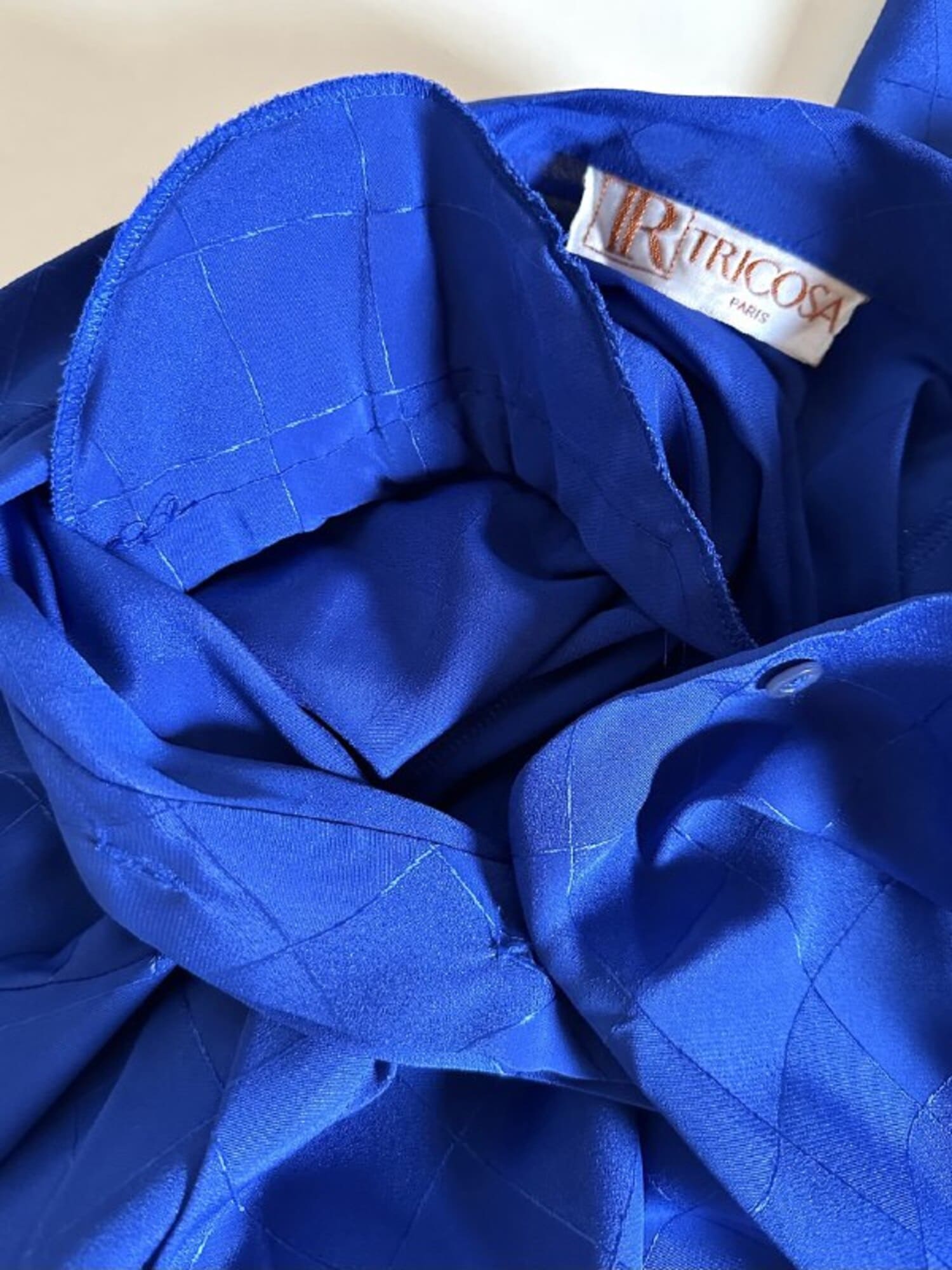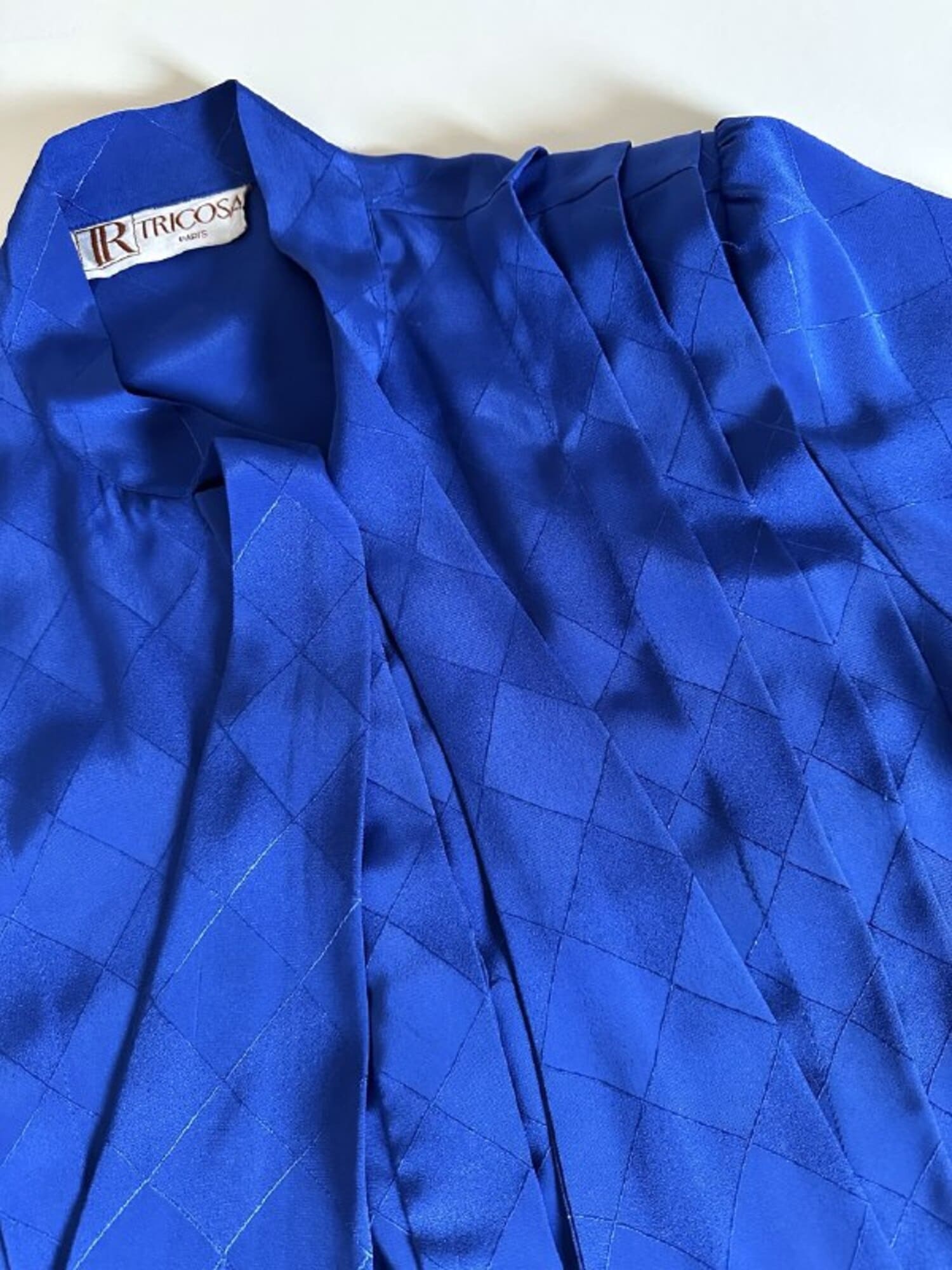 Questa camicia vintage bluette in tessuto jacquard operato a losanghe unisce la luminosità della lavorazione materica a un design ricercato, espressione di un eleganza senza tempo. Il nastro al collo, da annodare a sciarpina, evoca un fascino rétro reinterpretato con equilibrio moderno. Le maniche morbide e i dettagli laterali con tre pieghe larghe sovrapposte scolpiscono delicatamente la linea delle spalle, creando un movimento armonico. L’abbottonatura frontale a scomparsa e i bottoni in tinta siglano una pulizia formale sofisticata, pensata per donne che amano uno stile classico ma ricco di personalità.