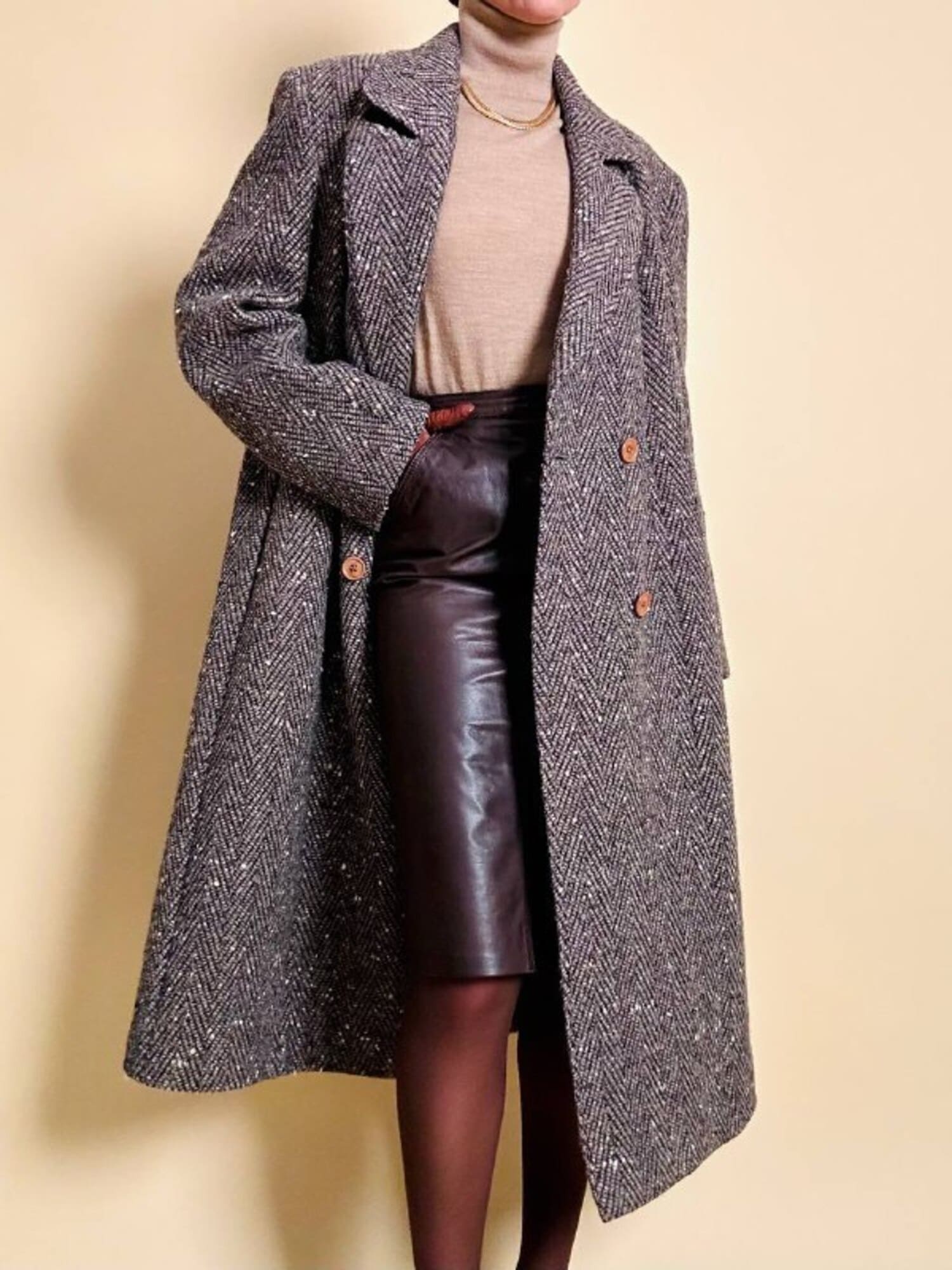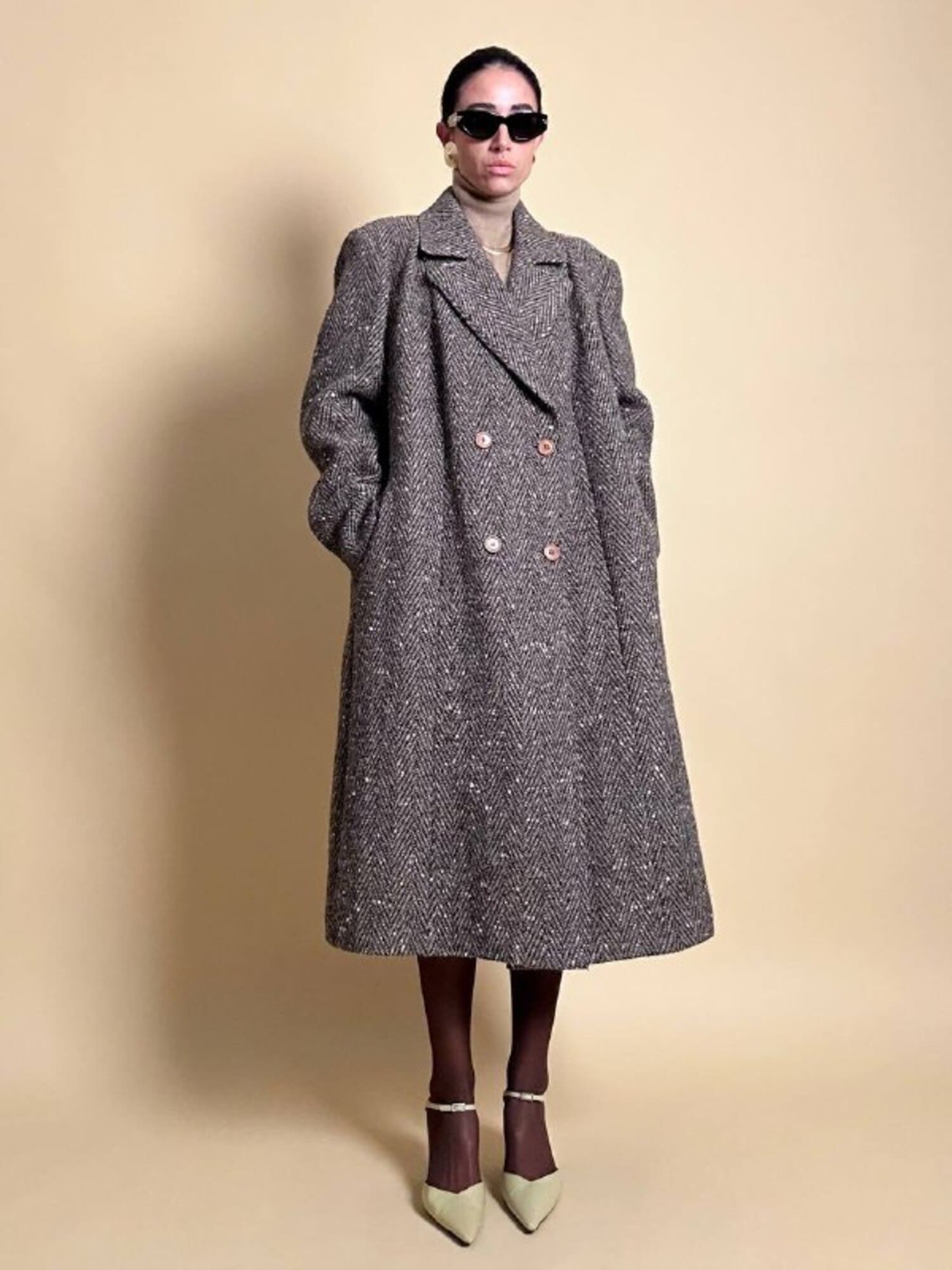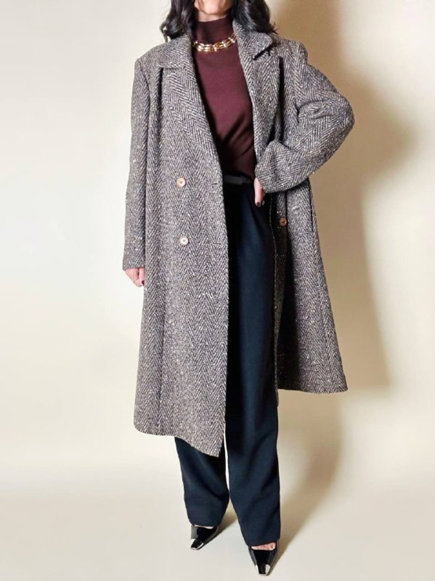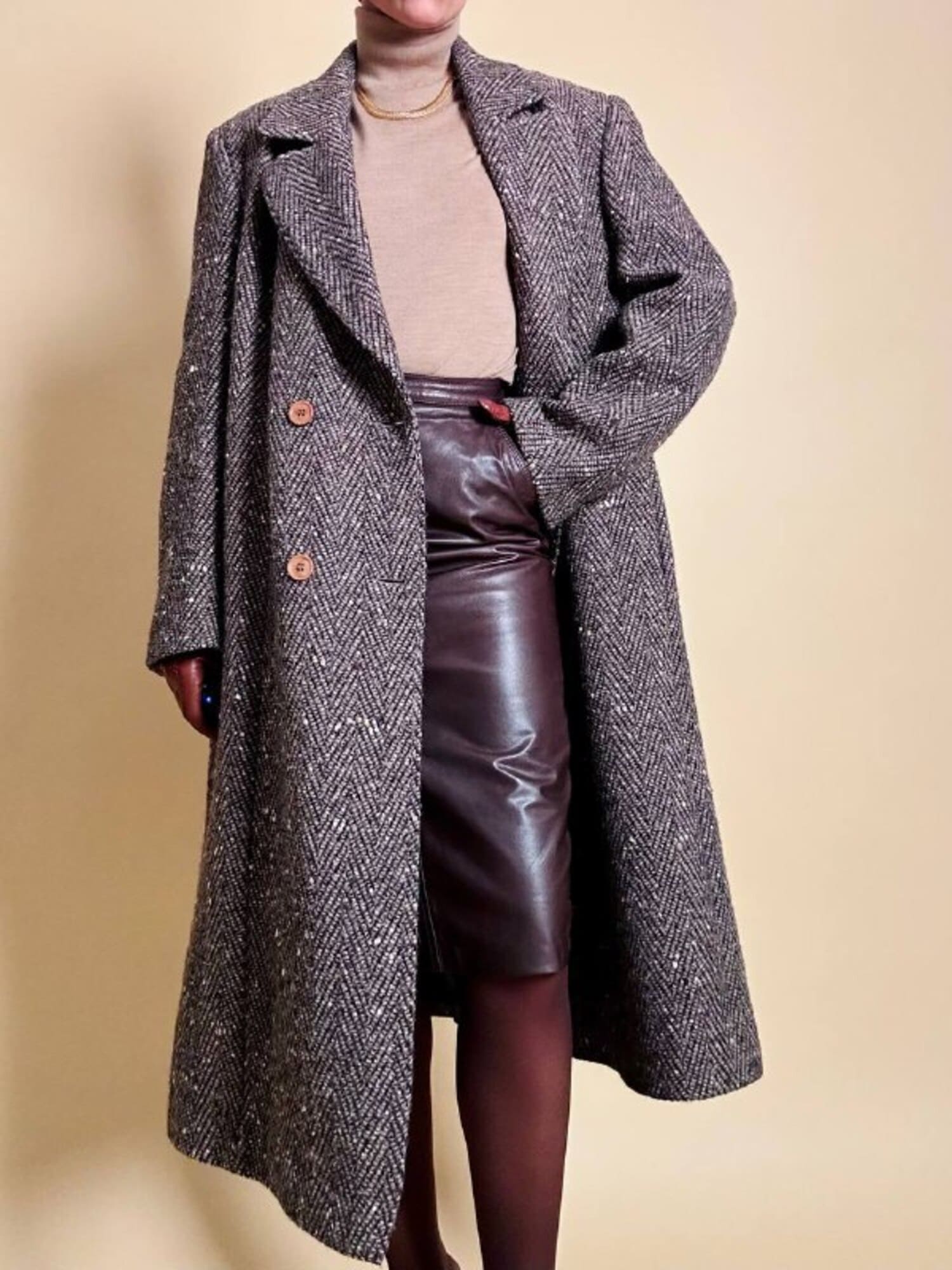 Questo cappotto in lana boutonné si contraddistingue per suo motivo spinato multitonale che intreccia nuance di grigio, beige, cammello, corda e bianco. La costruzione doppiopetto con ampi revers richiama la tradizione sartoriale, mentre le tasche verticali a filo e i bottoni color tabacco impreziosiscono il design. La silhouette ampia e leggermente svasata dona movimento e una vestibilità comoda ma elegante, perfetta per look quotidiani o outfit più ricercati. All’interno, la fodera nera offre contrasto e definizione, garantendo comfort e struttura. Un cappotto ideale per chi desidera un capospalla di qualità, capace di unire texture pregiate, palette neutre e un’estetica classica dal carattere deciso.