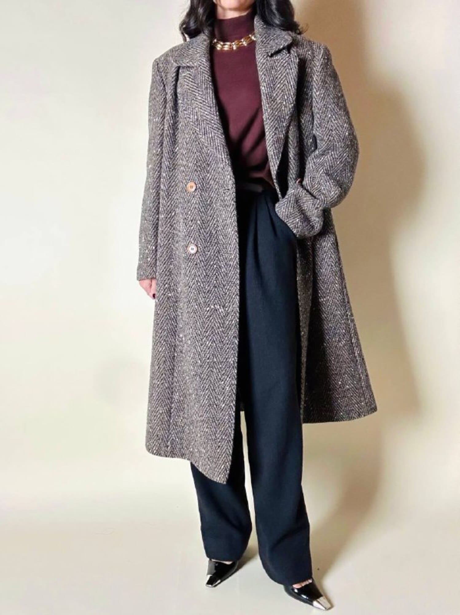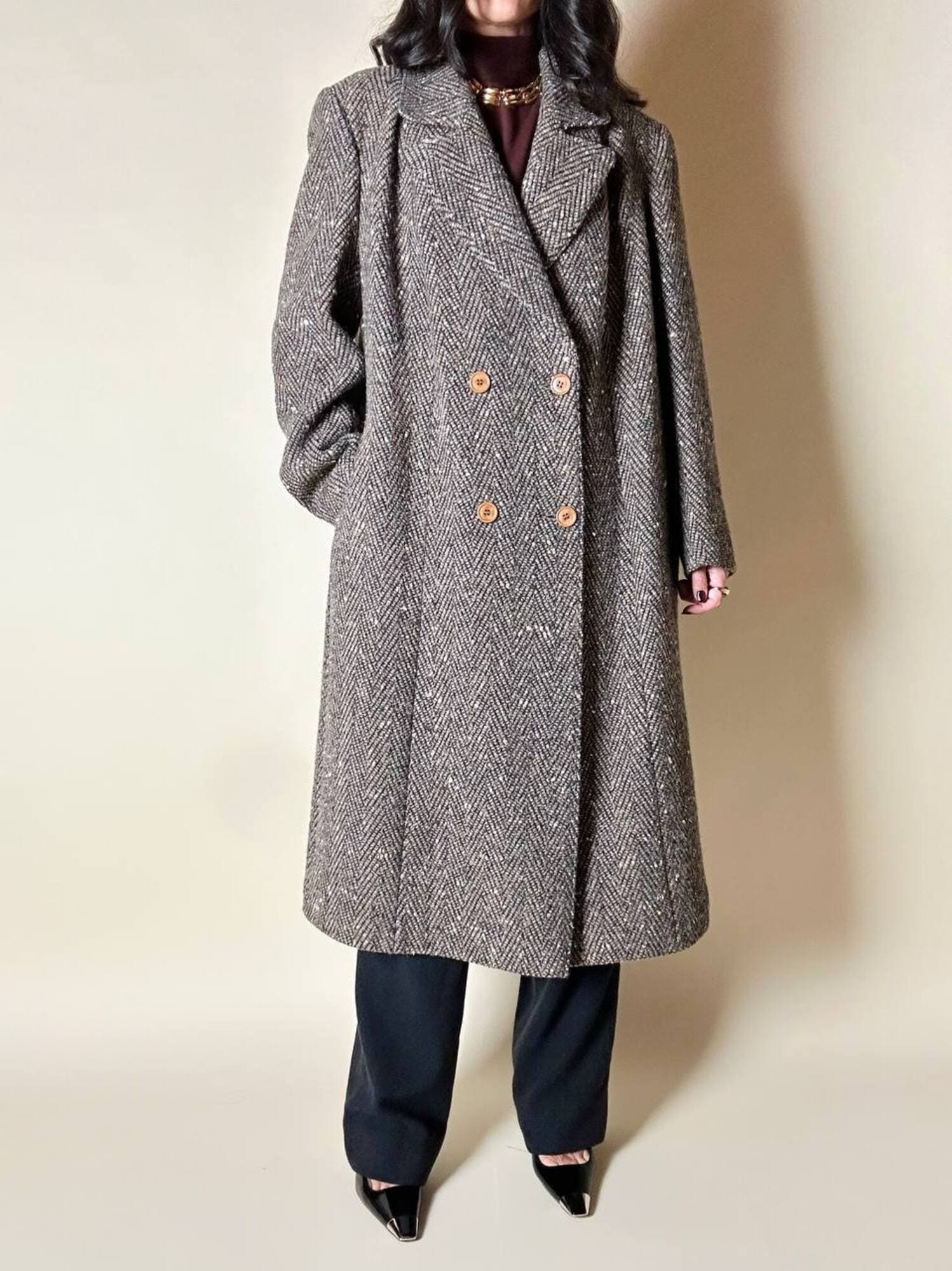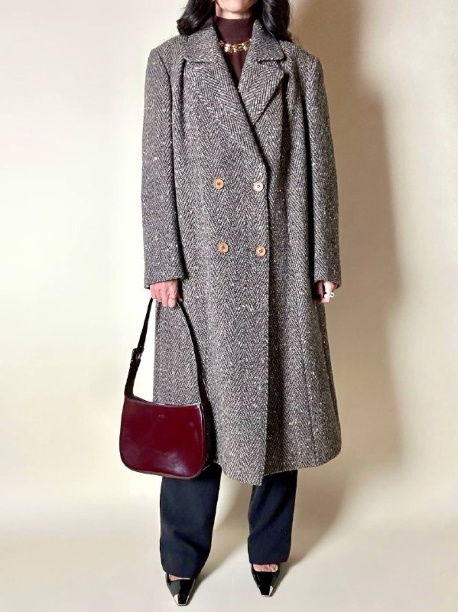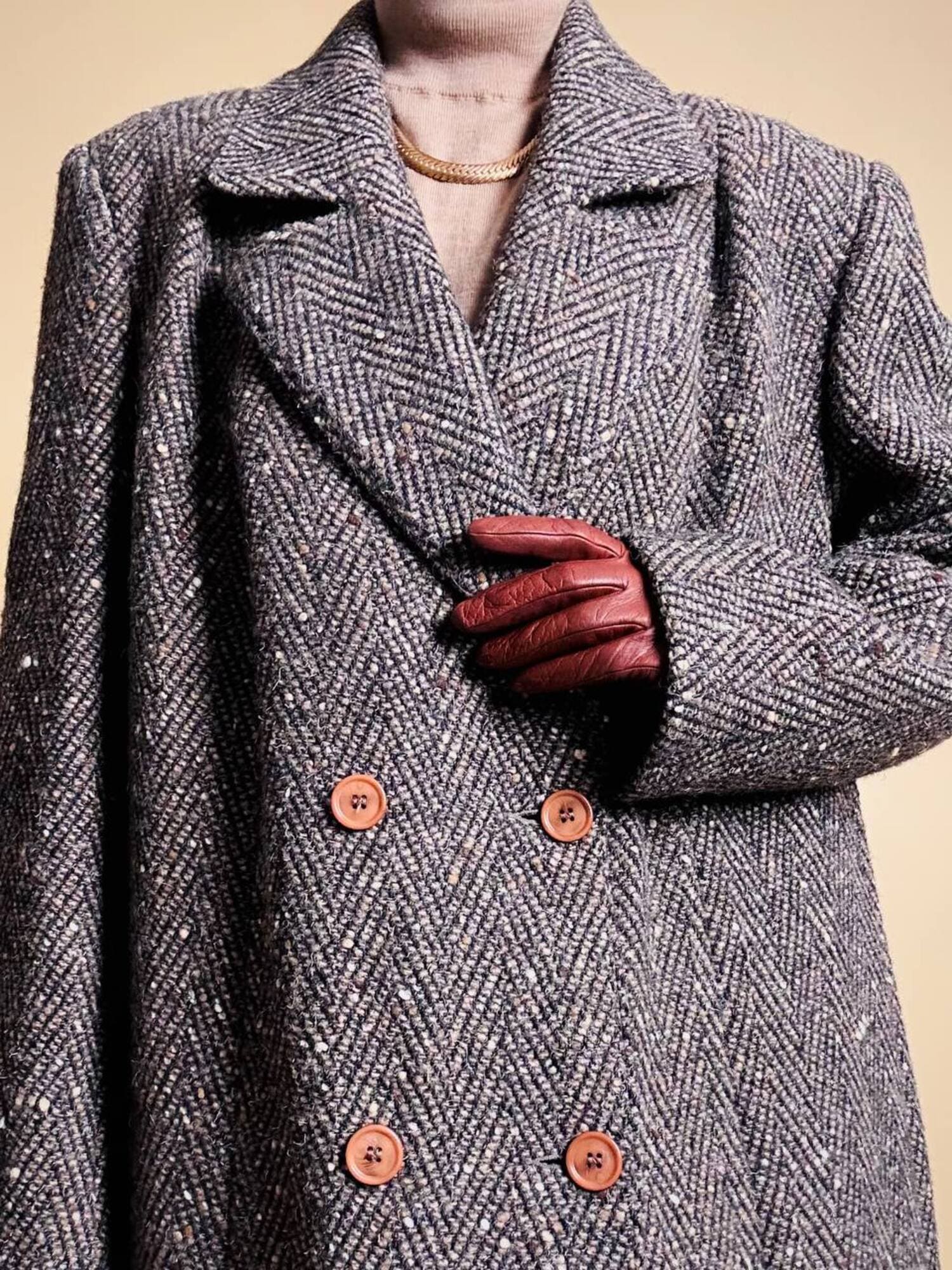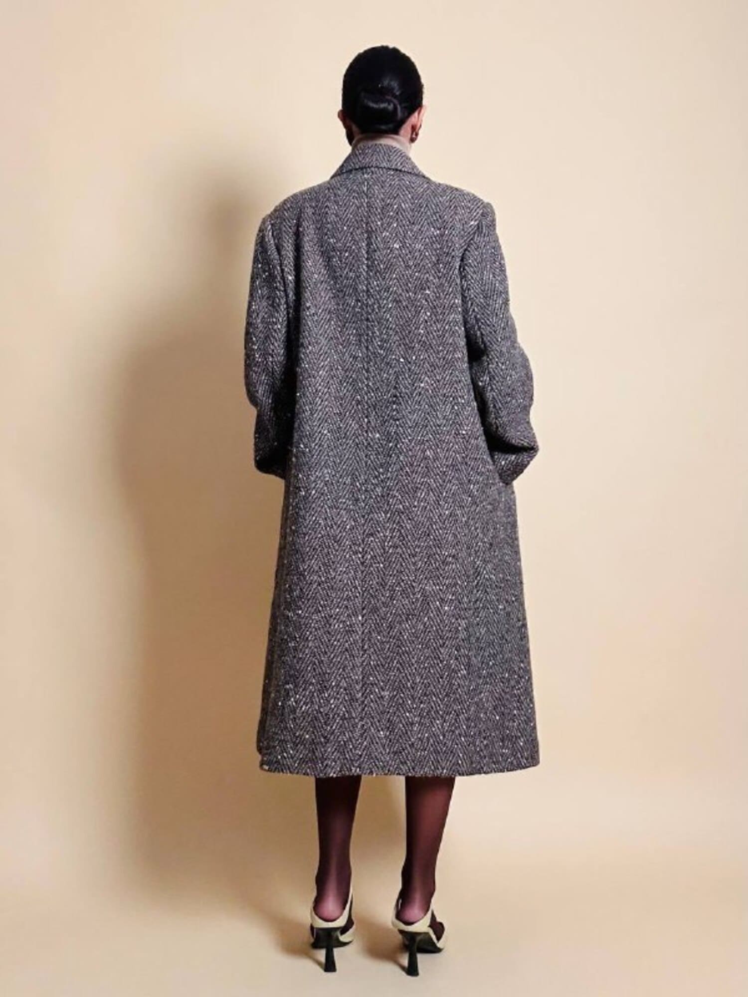 Questo cappotto in lana boutonné si contraddistingue per suo motivo spinato multitonale che intreccia nuance di grigio, beige, cammello, corda e bianco. La costruzione doppiopetto con ampi revers richiama la tradizione sartoriale, mentre le tasche verticali a filo e i bottoni color tabacco impreziosiscono il design. La silhouette ampia e leggermente svasata dona movimento e una vestibilità comoda ma elegante, perfetta per look quotidiani o outfit più ricercati. All’interno, la fodera nera offre contrasto e definizione, garantendo comfort e struttura. Un cappotto ideale per chi desidera un capospalla di qualità, capace di unire texture pregiate, palette neutre e un’estetica classica dal carattere deciso.