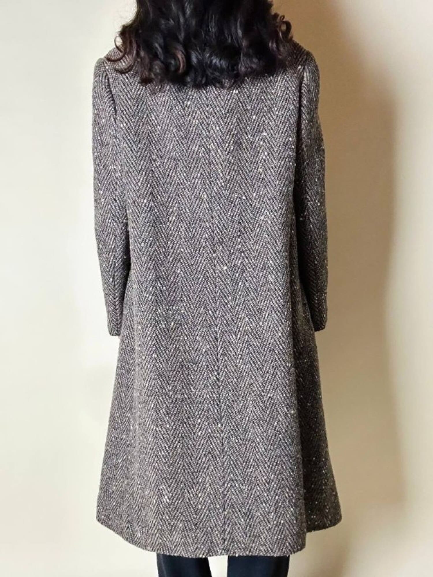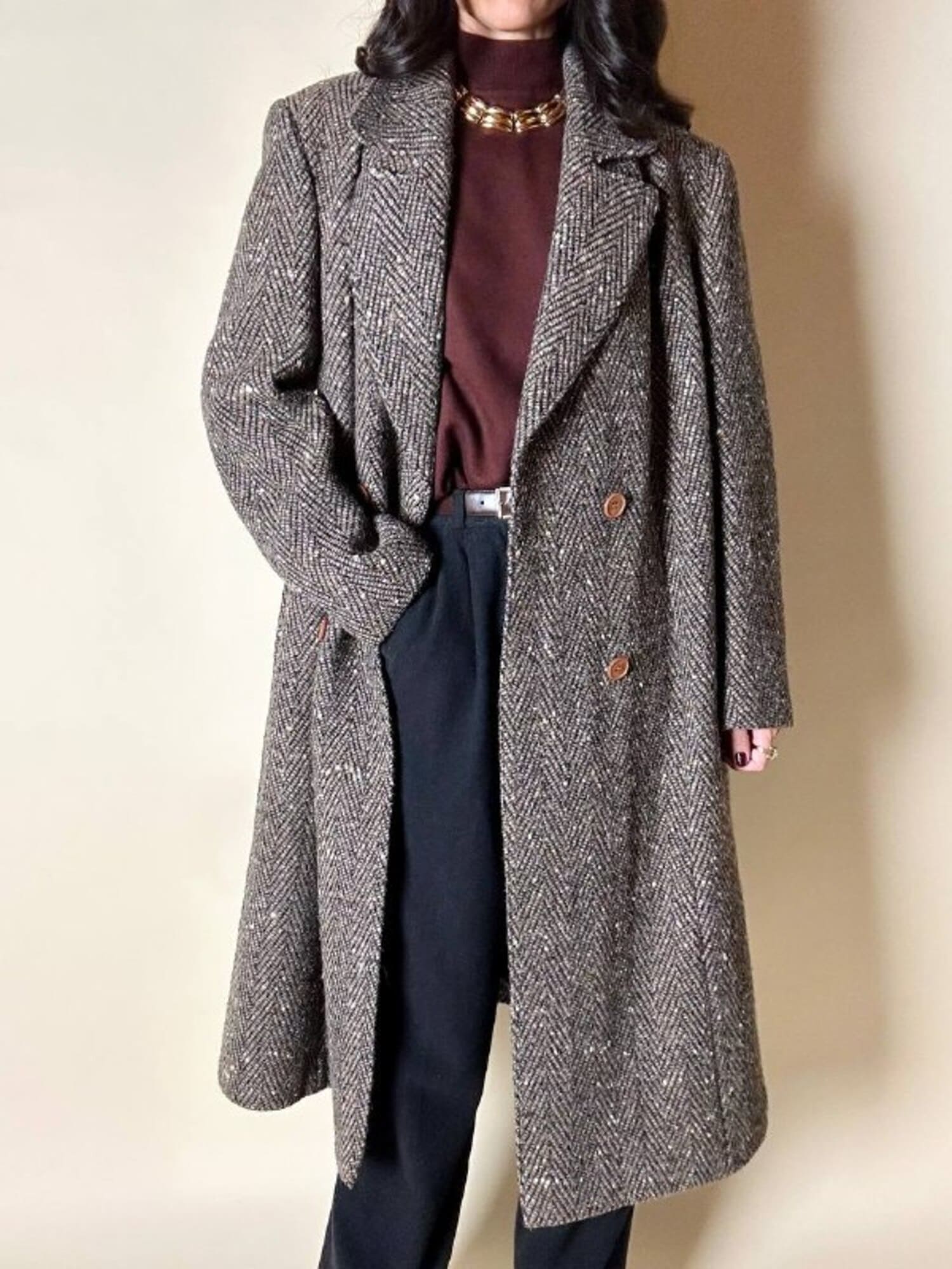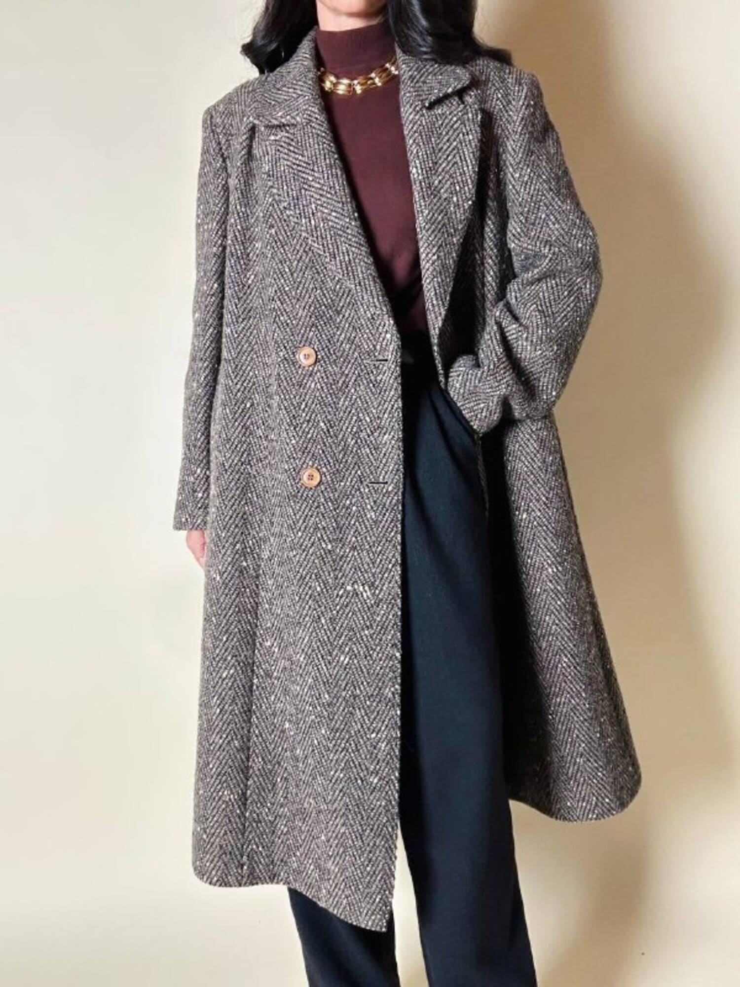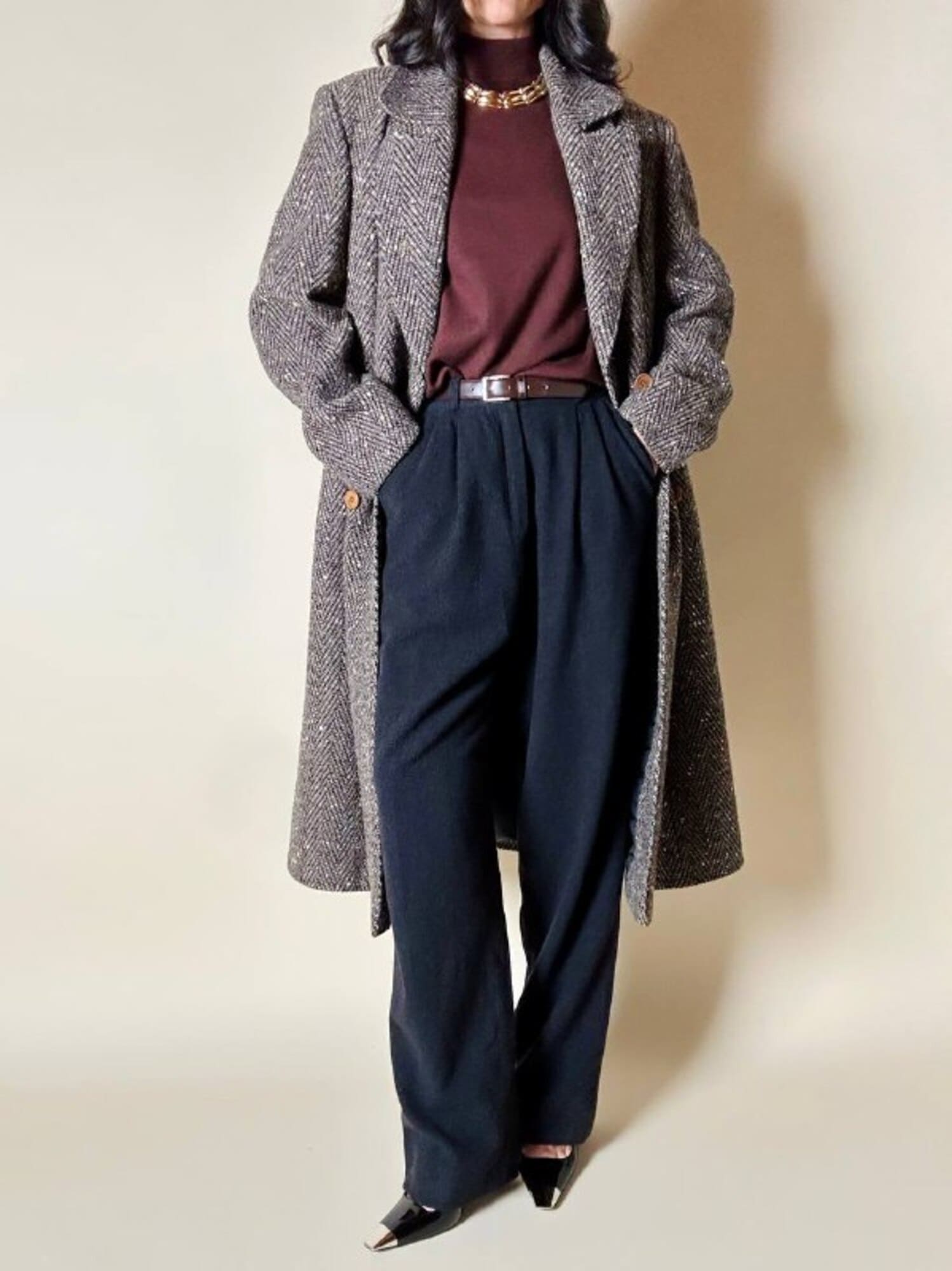Questo cappotto in lana boutonné si contraddistingue per suo motivo spinato multitonale che intreccia nuance di grigio, beige, cammello, corda e bianco. La costruzione doppiopetto con ampi revers richiama la tradizione sartoriale, mentre le tasche verticali a filo e i bottoni color tabacco impreziosiscono il design. La silhouette ampia e leggermente svasata dona movimento e una vestibilità comoda ma elegante, perfetta per look quotidiani o outfit più ricercati. All’interno, la fodera nera offre contrasto e definizione, garantendo comfort e struttura. Un cappotto ideale per chi desidera un capospalla di qualità, capace di unire texture pregiate, palette neutre e un’estetica classica dal carattere deciso.