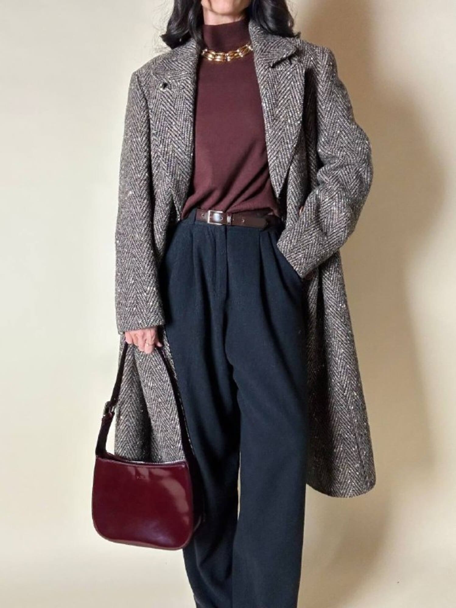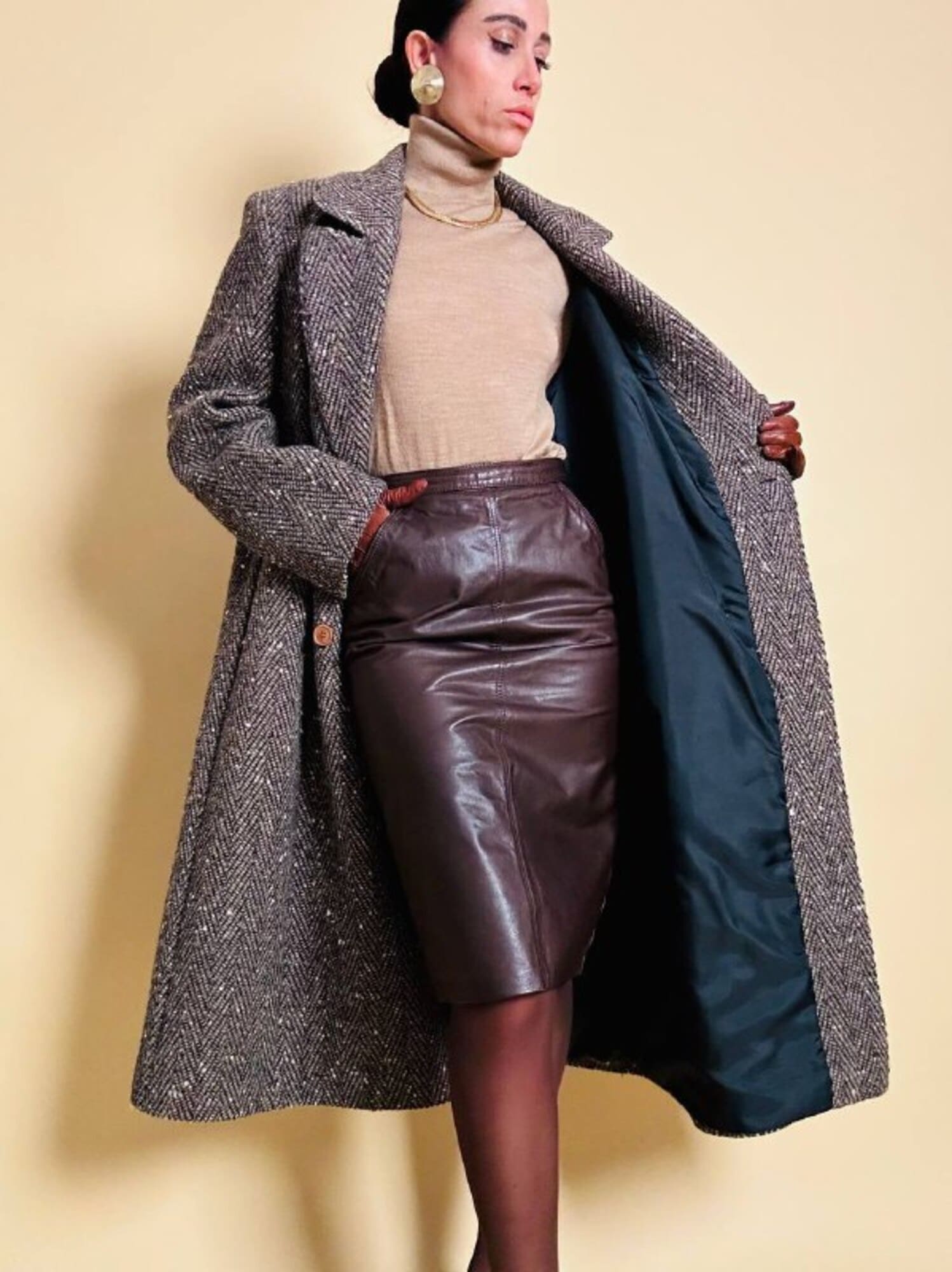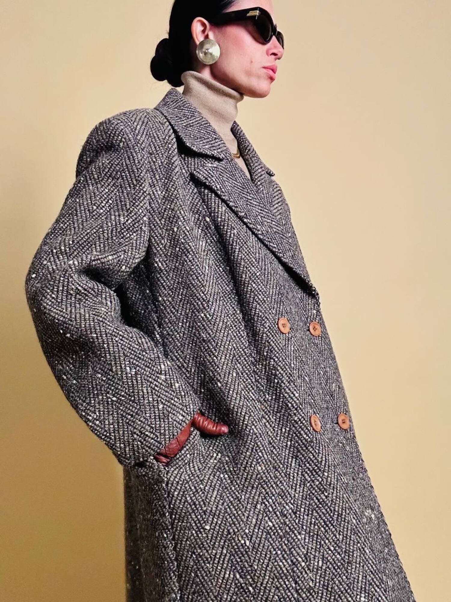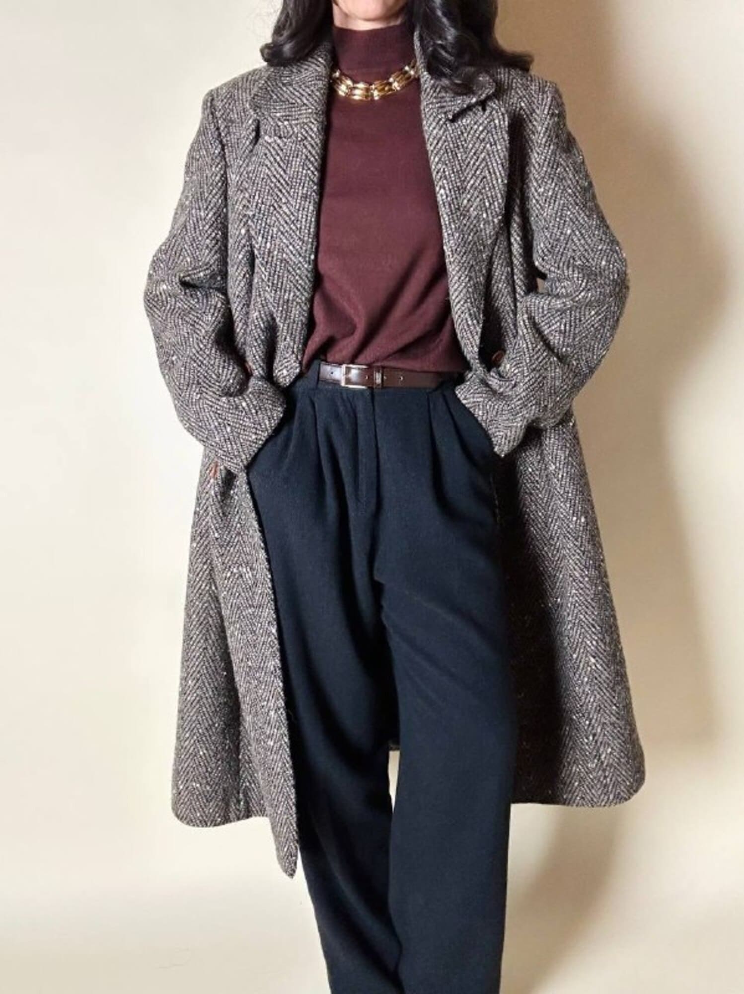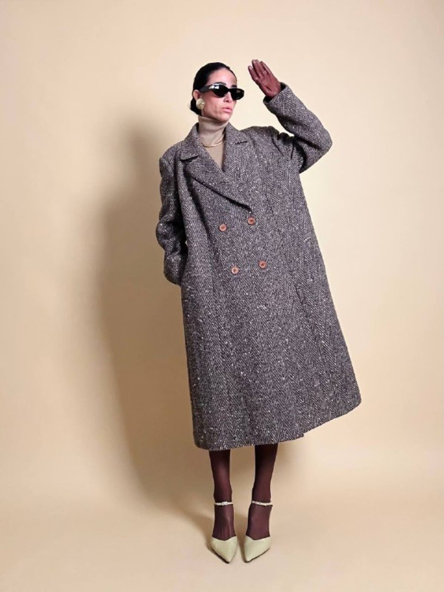 Questo cappotto in lana boutonné si contraddistingue per suo motivo spinato multitonale che intreccia nuance di grigio, beige, cammello, corda e bianco. La costruzione doppiopetto con ampi revers richiama la tradizione sartoriale, mentre le tasche verticali a filo e i bottoni color tabacco impreziosiscono il design. La silhouette ampia e leggermente svasata dona movimento e una vestibilità comoda ma elegante, perfetta per look quotidiani o outfit più ricercati. All’interno, la fodera nera offre contrasto e definizione, garantendo comfort e struttura. Un cappotto ideale per chi desidera un capospalla di qualità, capace di unire texture pregiate, palette neutre e un’estetica classica dal carattere deciso.