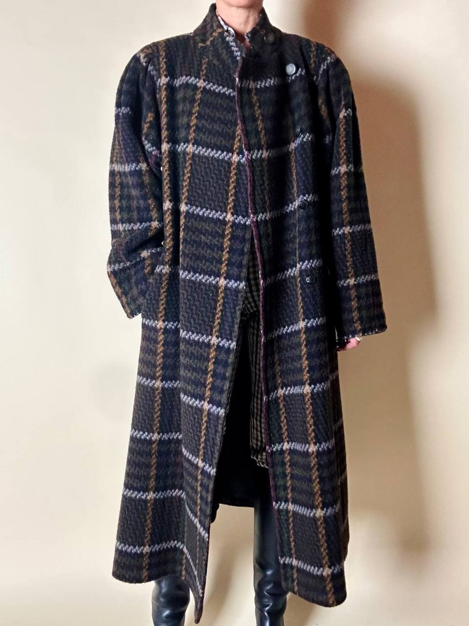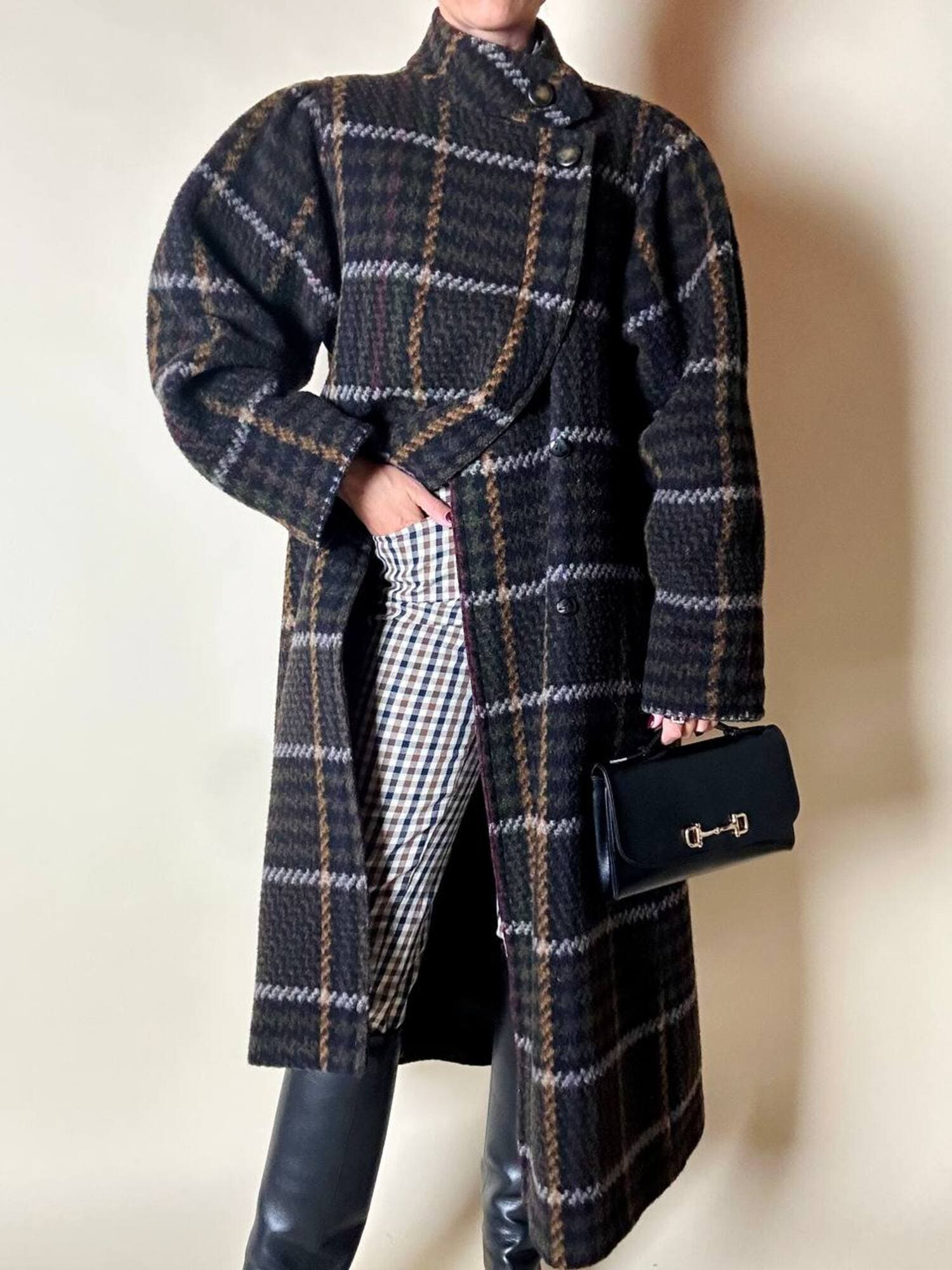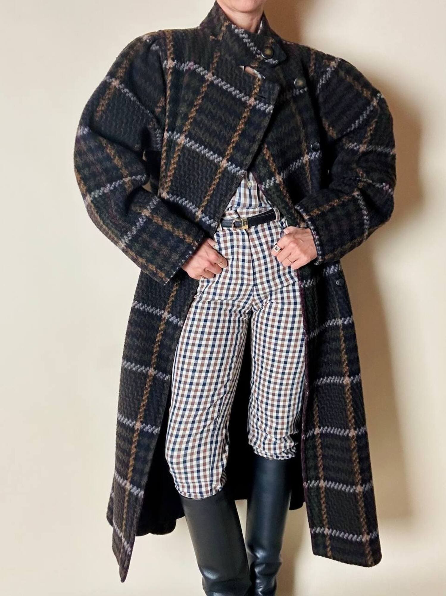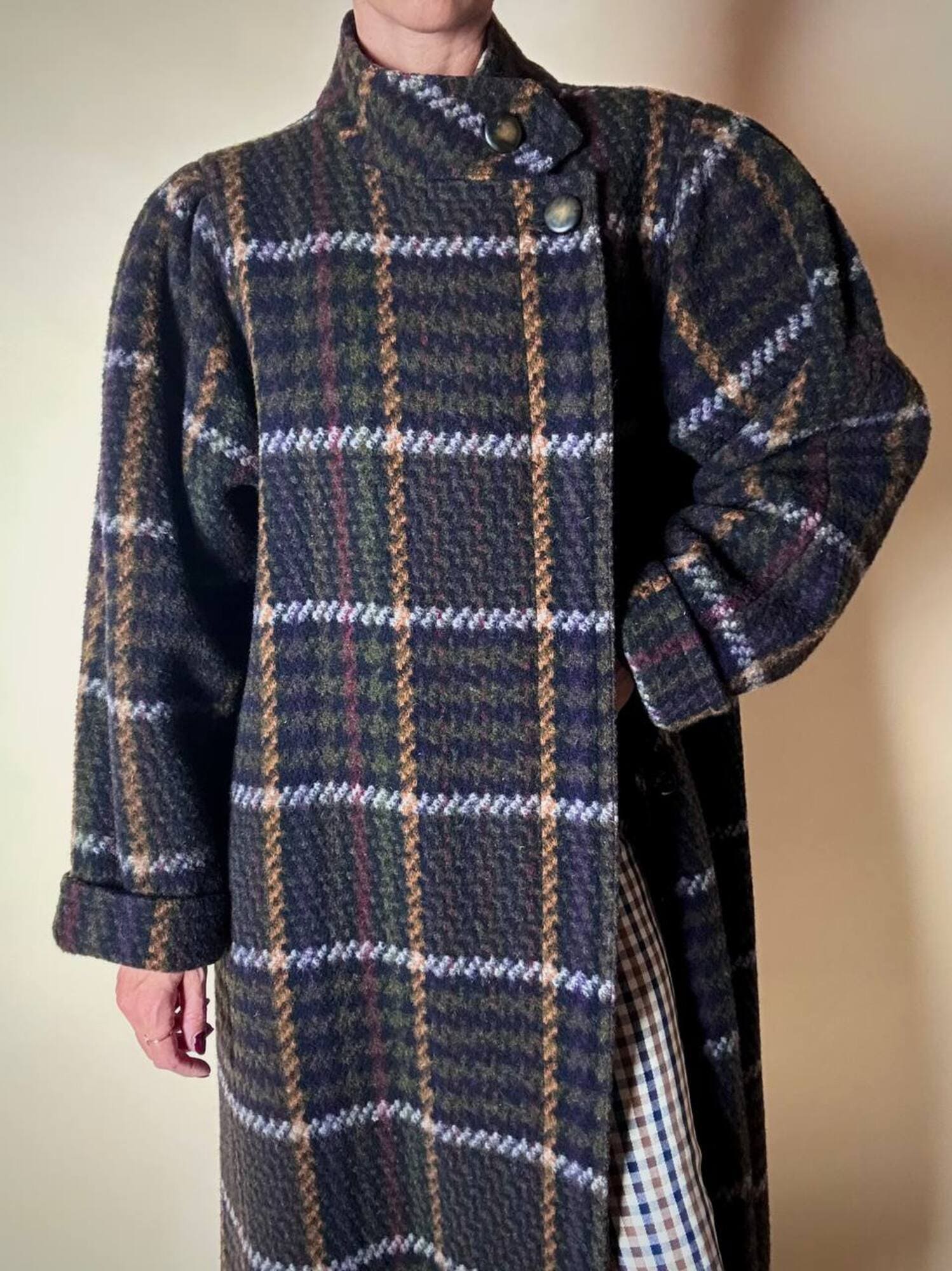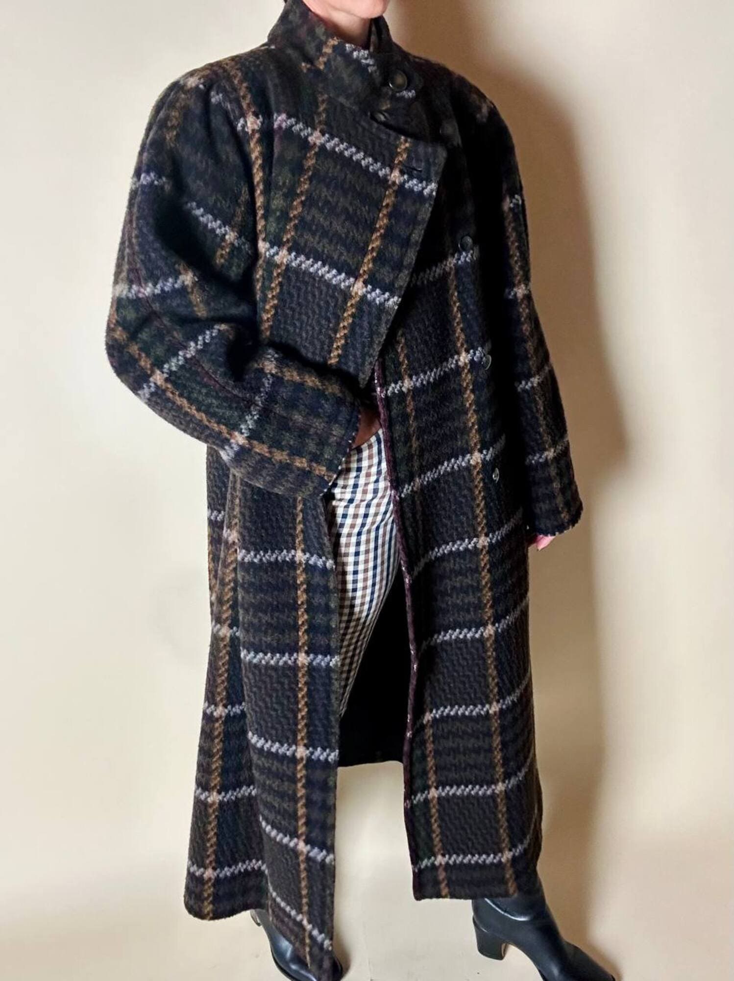 Questo cappotto lungo in pura lana vergine firmato Fashion By Classic celebra la tradizione del tartan con un’estetica contemporanea e ricercata. Il modello lungo e svasato valorizza la silhouette con fluidità, mentre la costruzione doppiopetto si distingue grazie all’abbottonatura asimmetrica, dettaglio sofisticato che aggiunge dinamismo e personalità al design. I primi due bottoni, grandi e a vista, sono realizzati in resina effetto corno, scelti per dare carattere e un accento materico. Il resto dell’abbottonatura rimane a scomparsa, garantendo una linea pulita ed essenziale. Le tasche laterali a filo aggiungono funzionalità mantenendo la linea rigorosa. Completamente foderato in nero, assicura massimo comfort, struttura impeccabile e una vestibilità perfetta. Un cappotto caldo, sofisticato e dall’anima iconica, ideale per chi ama un’estetica classica e intramontabile.