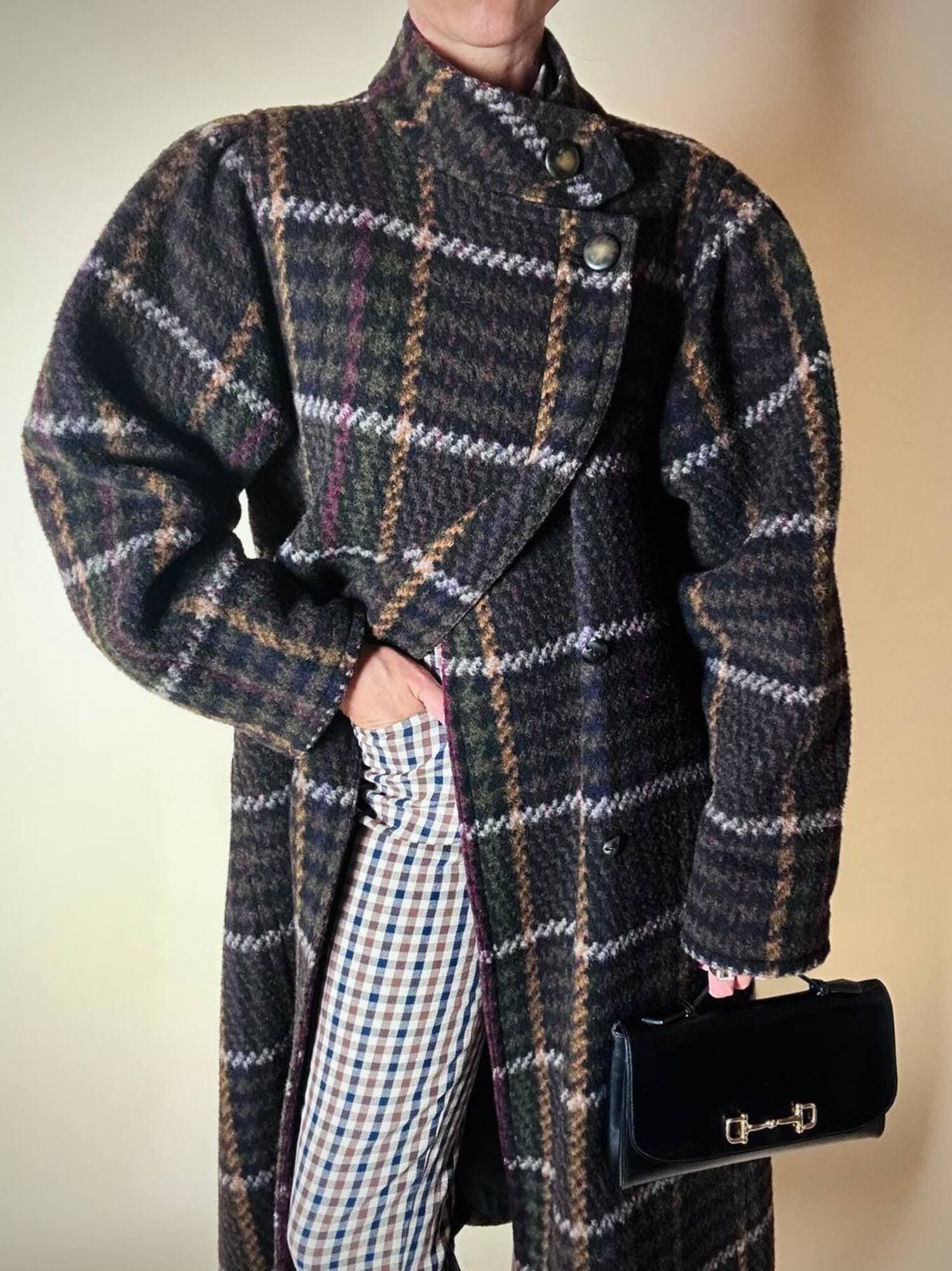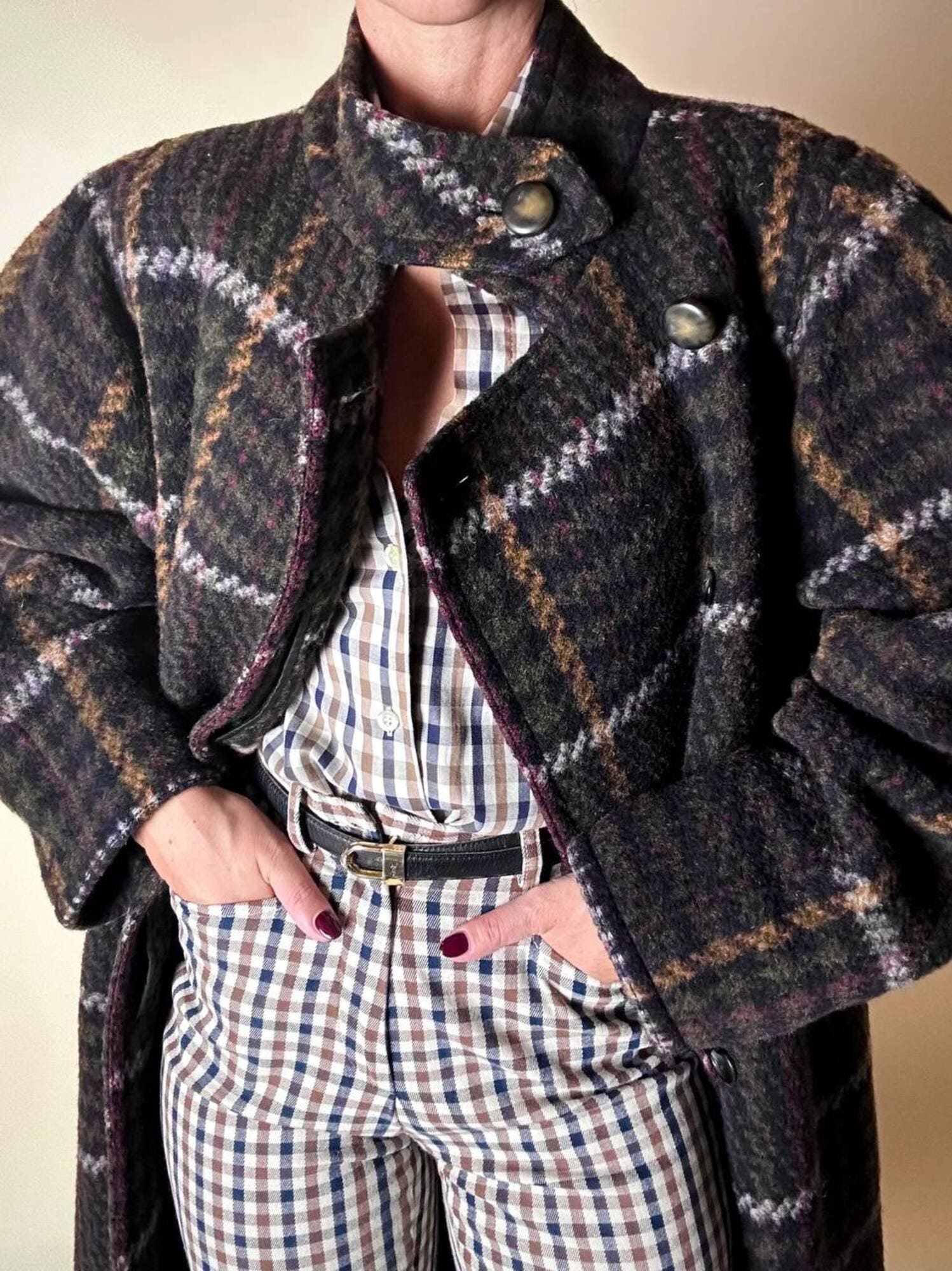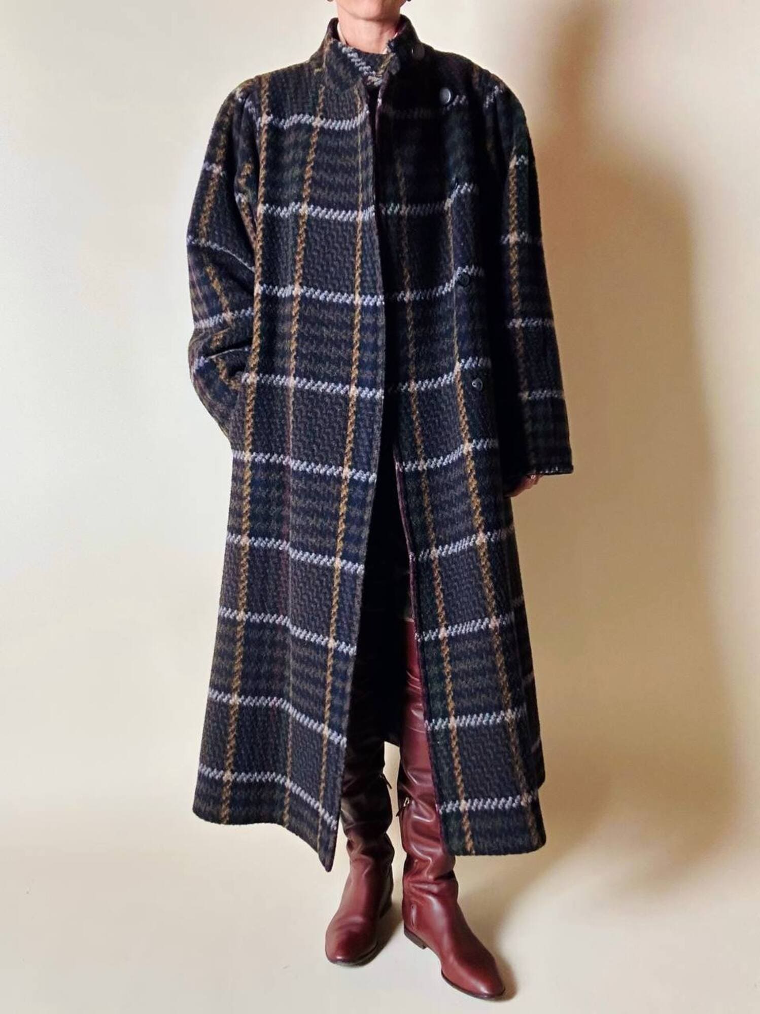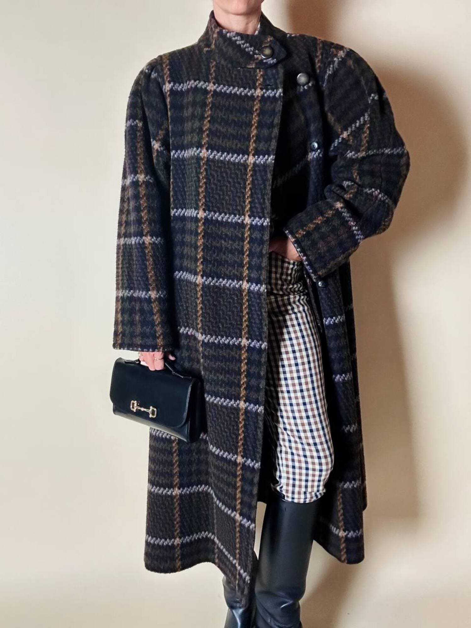 Questo cappotto lungo in pura lana vergine firmato Fashion By Classic celebra la tradizione del tartan con un’estetica contemporanea e ricercata. Il modello lungo e svasato valorizza la silhouette con fluidità, mentre la costruzione doppiopetto si distingue grazie all’abbottonatura asimmetrica, dettaglio sofisticato che aggiunge dinamismo e personalità al design. I primi due bottoni, grandi e a vista, sono realizzati in resina effetto corno, scelti per dare carattere e un accento materico. Il resto dell’abbottonatura rimane a scomparsa, garantendo una linea pulita ed essenziale. Le tasche laterali a filo aggiungono funzionalità mantenendo la linea rigorosa. Completamente foderato in nero, assicura massimo comfort, struttura impeccabile e una vestibilità perfetta. Un cappotto caldo, sofisticato e dall’anima iconica, ideale per chi ama un’estetica classica e intramontabile.