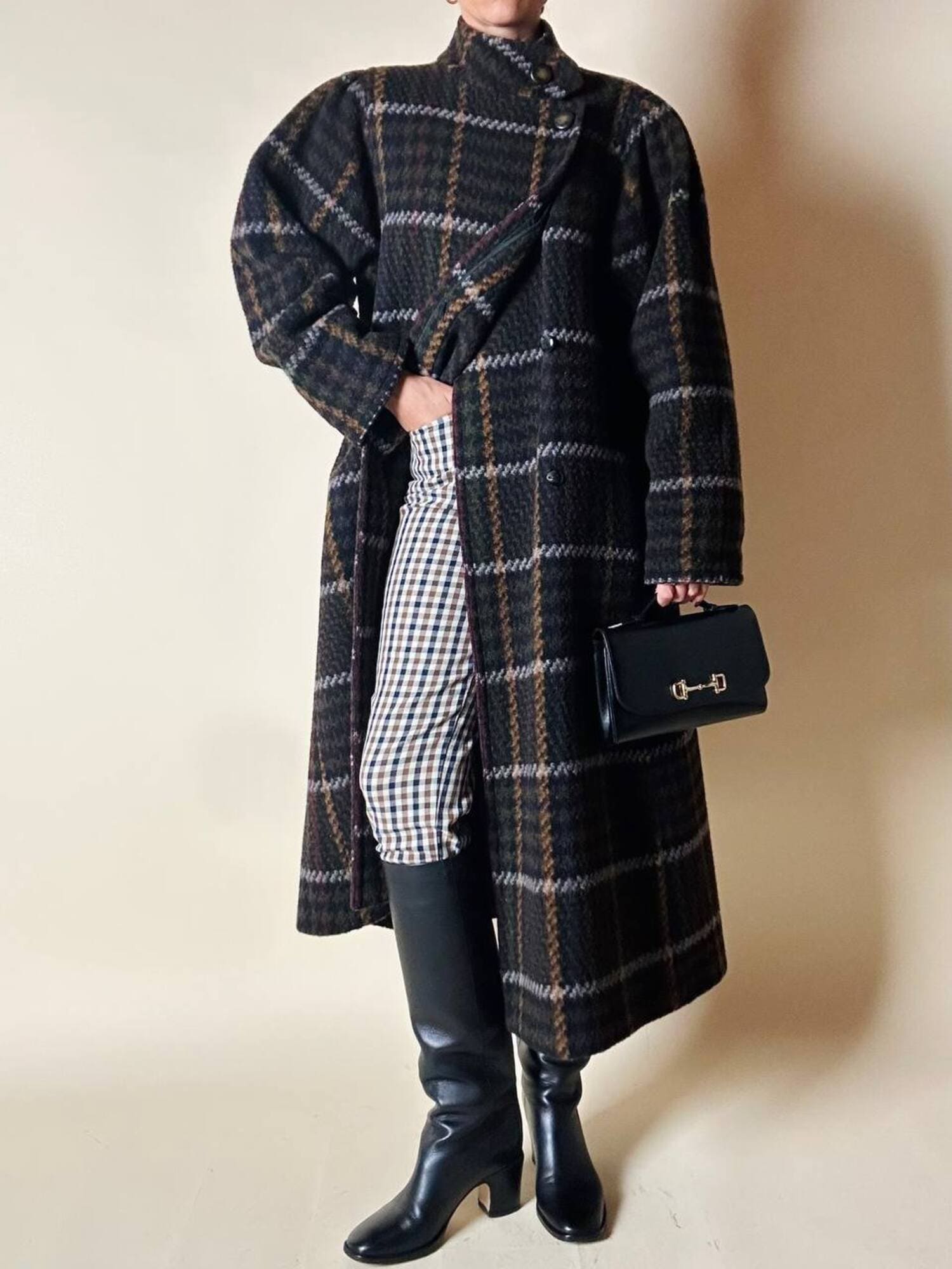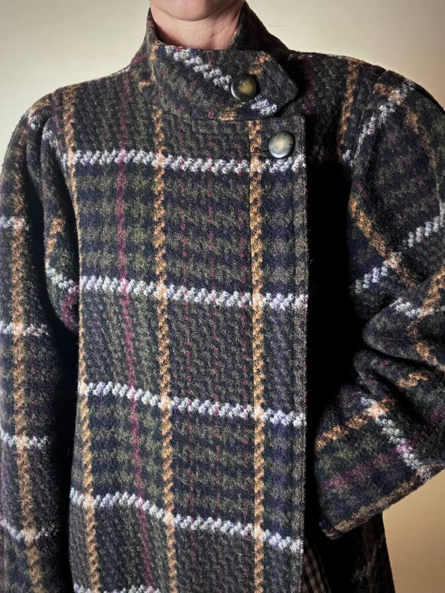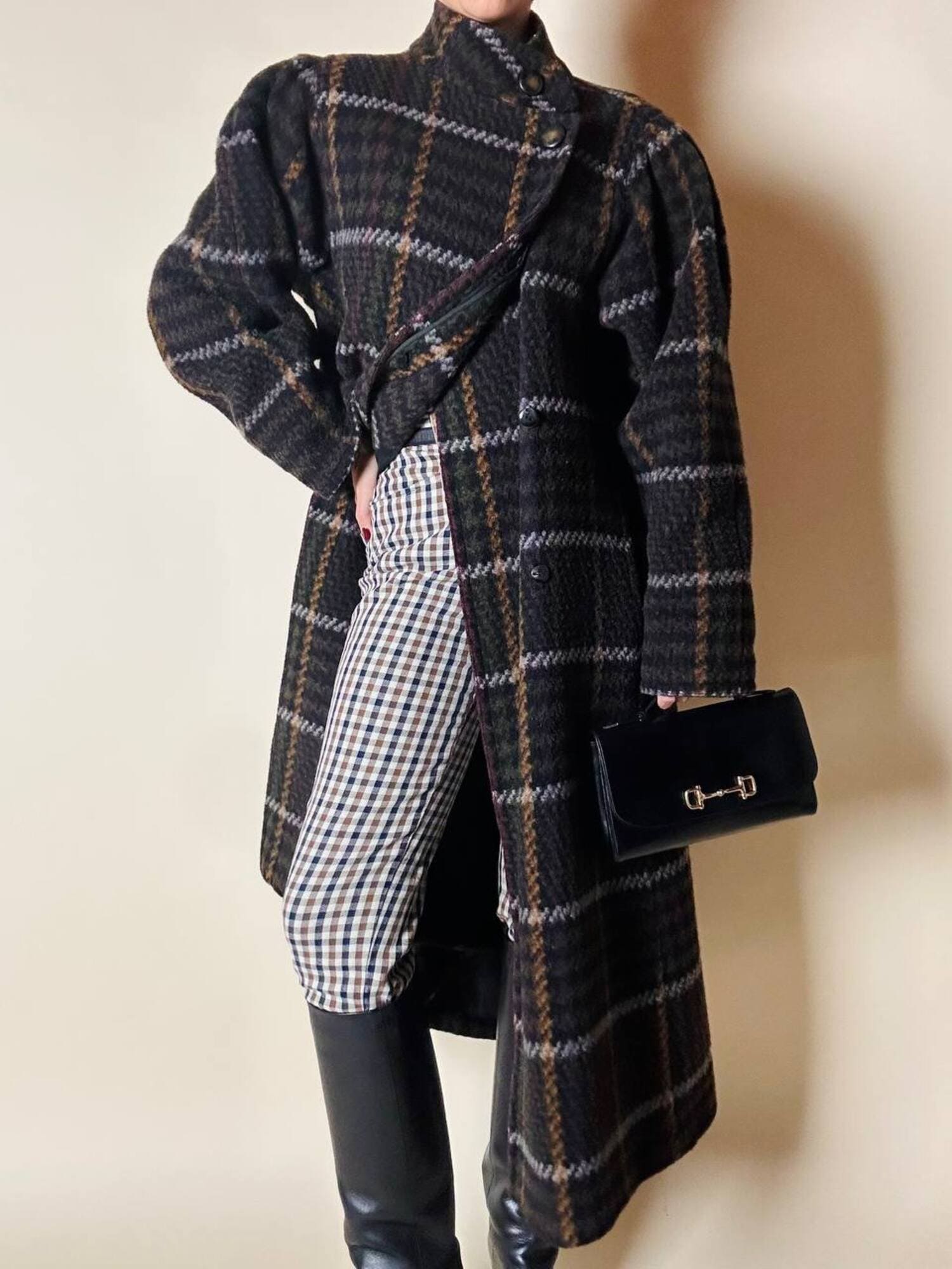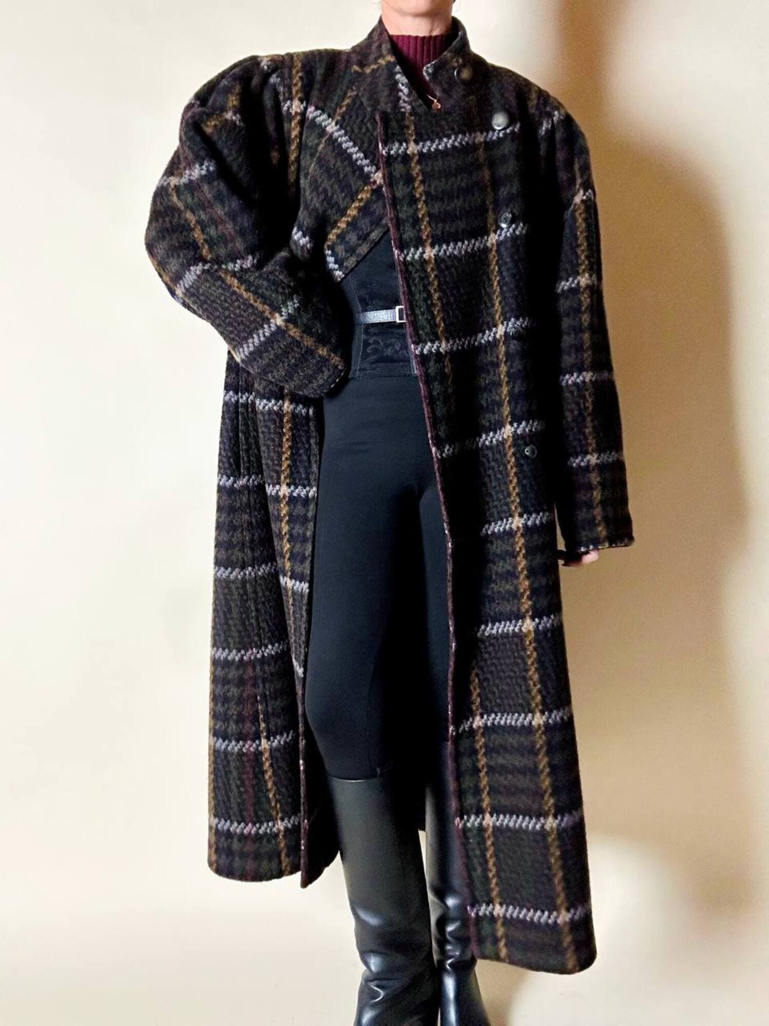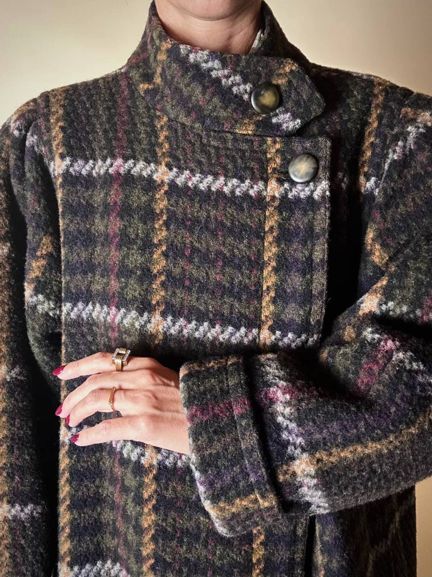 Questo cappotto lungo in pura lana vergine firmato Fashion By Classic celebra la tradizione del tartan con un’estetica contemporanea e ricercata. Il modello lungo e svasato valorizza la silhouette con fluidità, mentre la costruzione doppiopetto si distingue grazie all’abbottonatura asimmetrica, dettaglio sofisticato che aggiunge dinamismo e personalità al design. I primi due bottoni, grandi e a vista, sono realizzati in resina effetto corno, scelti per dare carattere e un accento materico. Il resto dell’abbottonatura rimane a scomparsa, garantendo una linea pulita ed essenziale. Le tasche laterali a filo aggiungono funzionalità mantenendo la linea rigorosa. Completamente foderato in nero, assicura massimo comfort, struttura impeccabile e una vestibilità perfetta. Un cappotto caldo, sofisticato e dall’anima iconica, ideale per chi ama un’estetica classica e intramontabile.