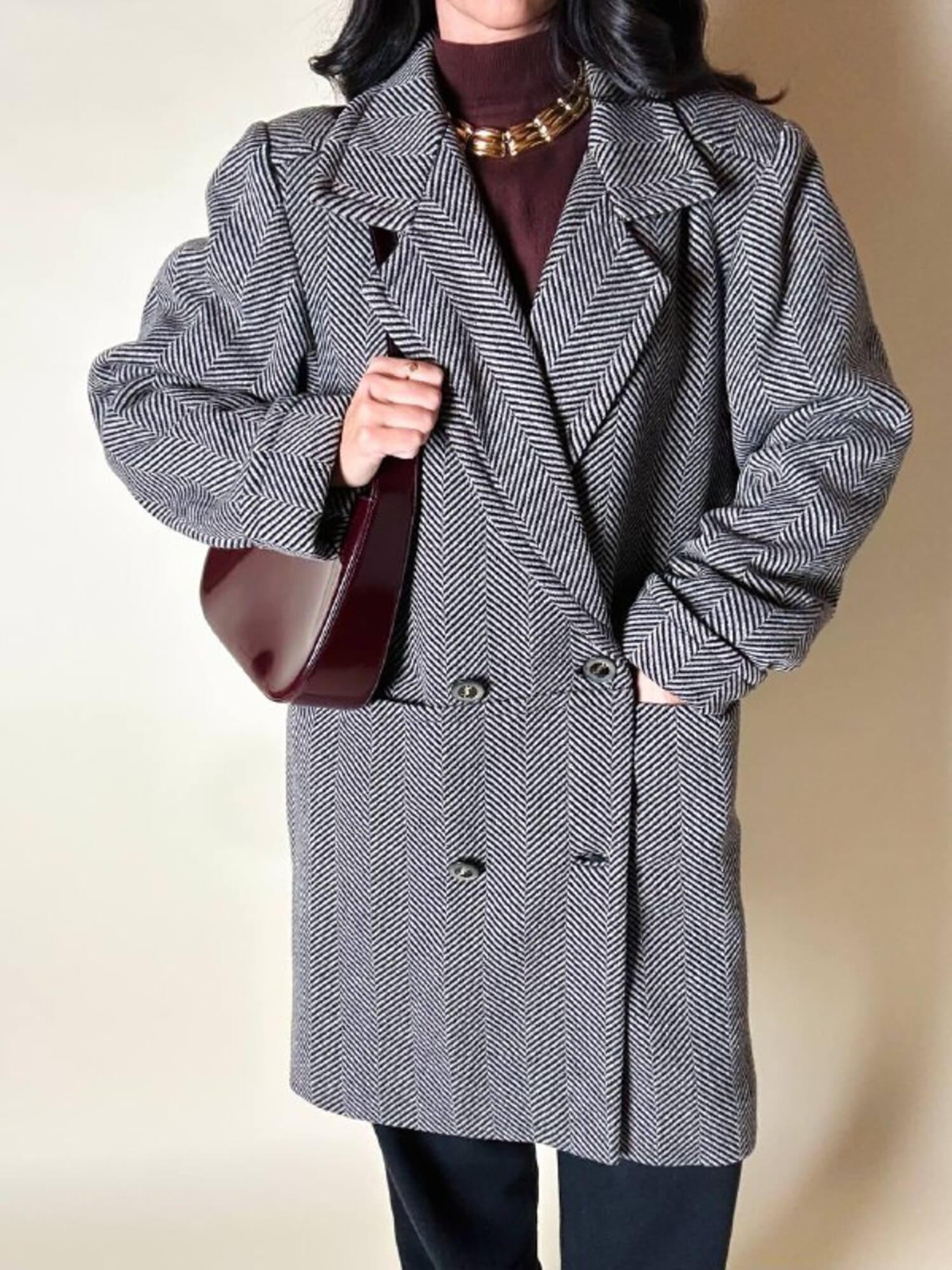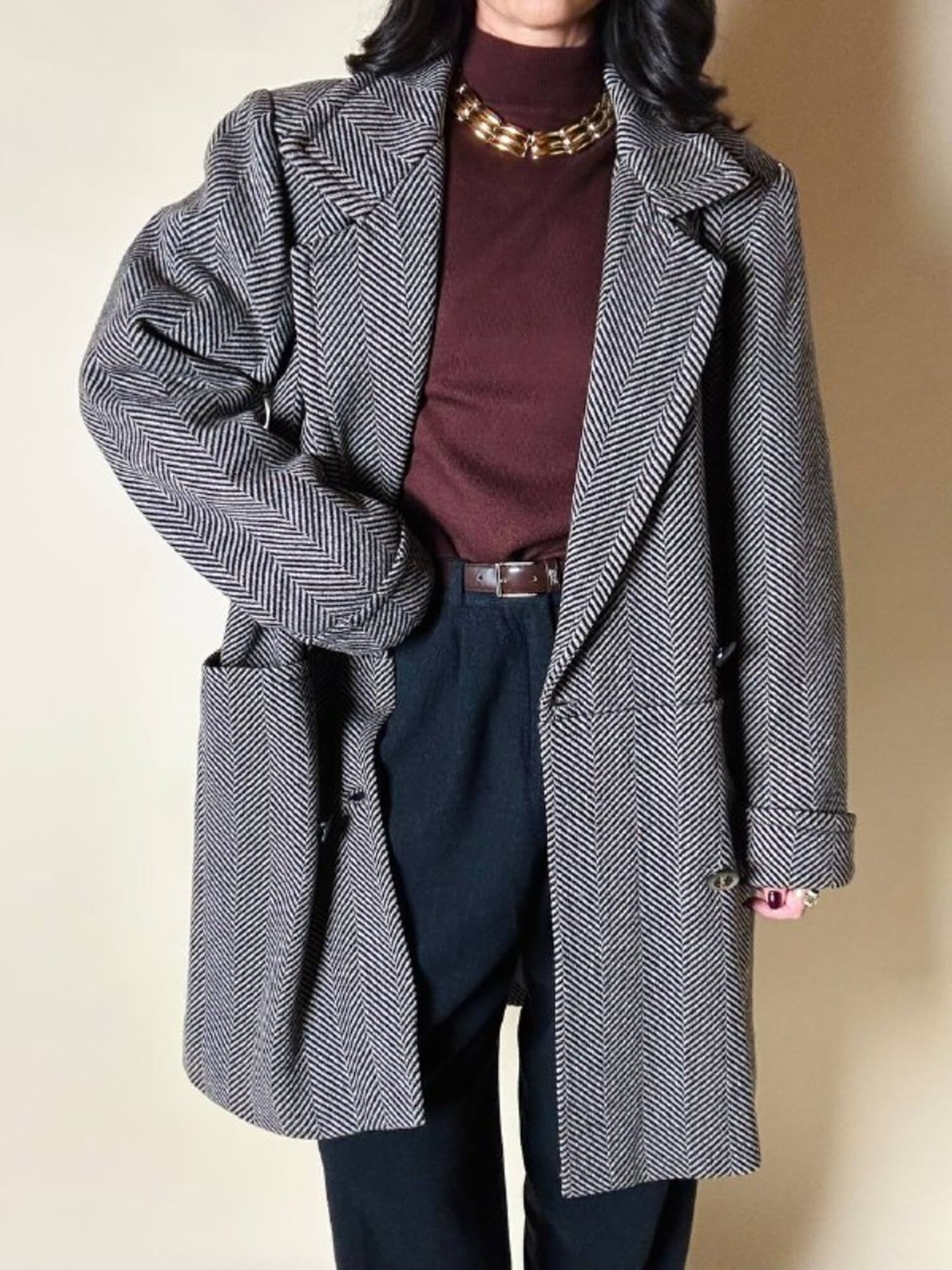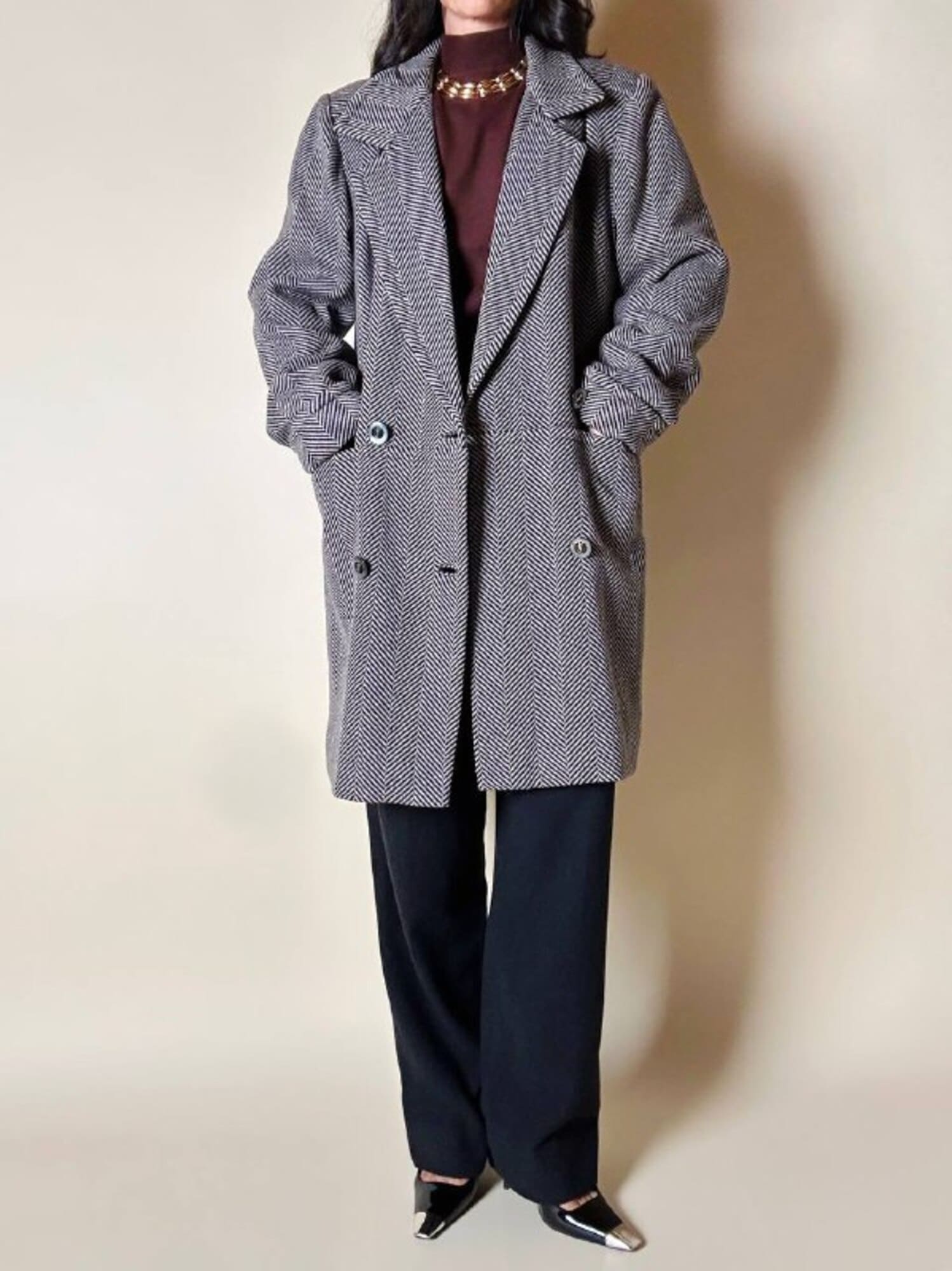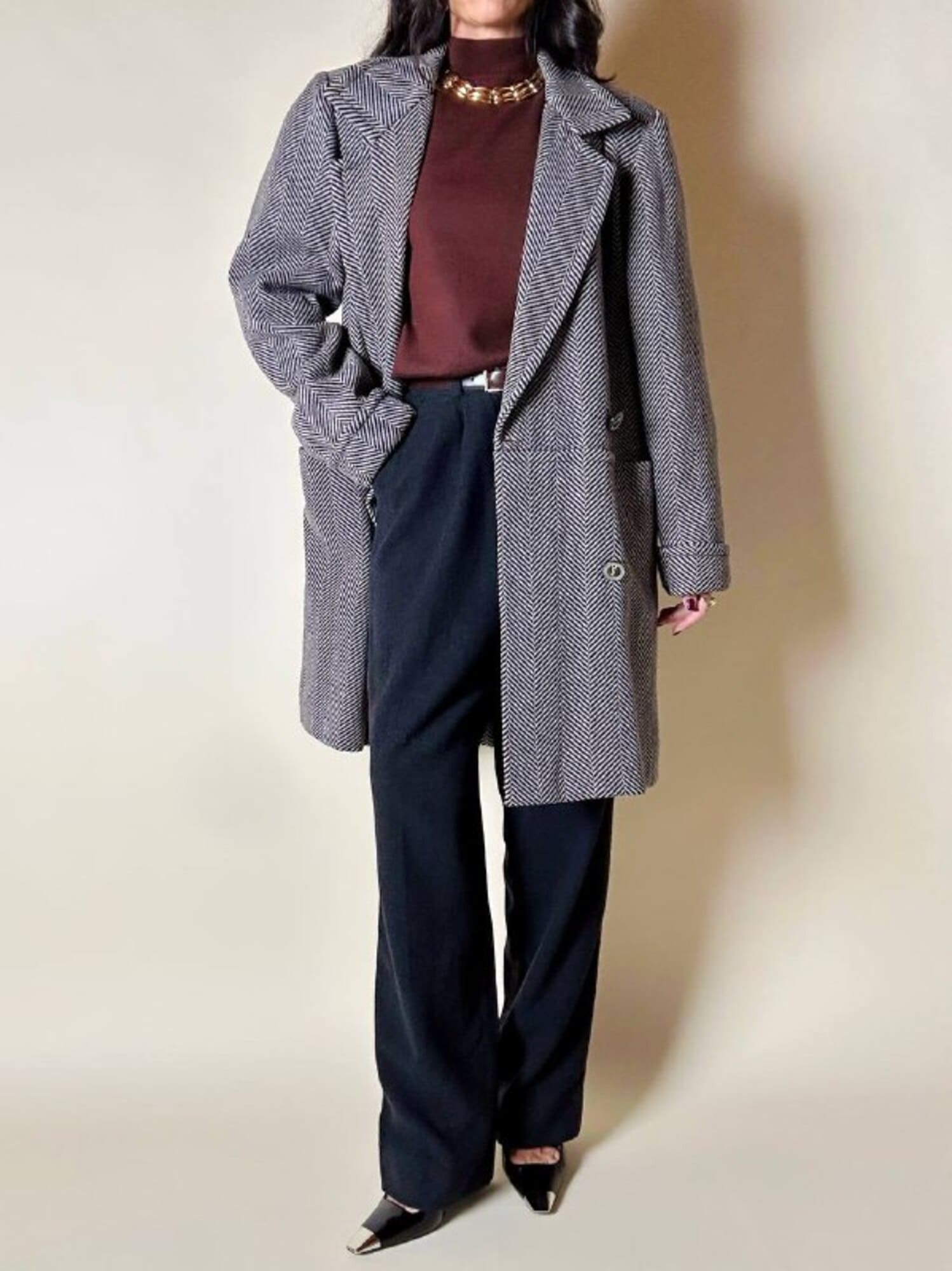 Un classico intramontabile nel guardaroba invernale, questo cappotto unisce eleganza sartoriale e dettagli iconici. Realizzato in lana con distintiva trama a spina di pesce, bianco tortora e nero. Il modello doppiopetto presenta ampi revers a lancia e grandi bottoni con logo YSL in oro che definiscono l’allacciatura frontale con un tocco di lusso discreto. La vestibilità oversize ma strutturata con spalle definite valorizza la silhouette, mentre la lunghezza fino al ginocchio aggiunge versatilità e praticità. Il cappotto, è tagliato orizzontalmente sul davanti, all’altezza del punto vita, con ampie tasche che coincidono col taglio e polsi risvoltati sulle maniche. In prossimità del collo è dotato di un elegante stringa in pelle color cuoio con terminali in metallo argento che consente di appenderlo facilmente. Completano il design uno spacco posteriore e la fodera matelassé grigio scuro, che assicura calore e comfort, rendendo questo cappotto un investimento essenziale di stile per l’inverno.