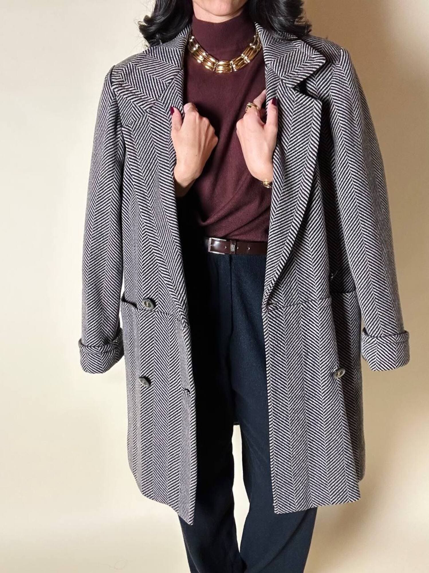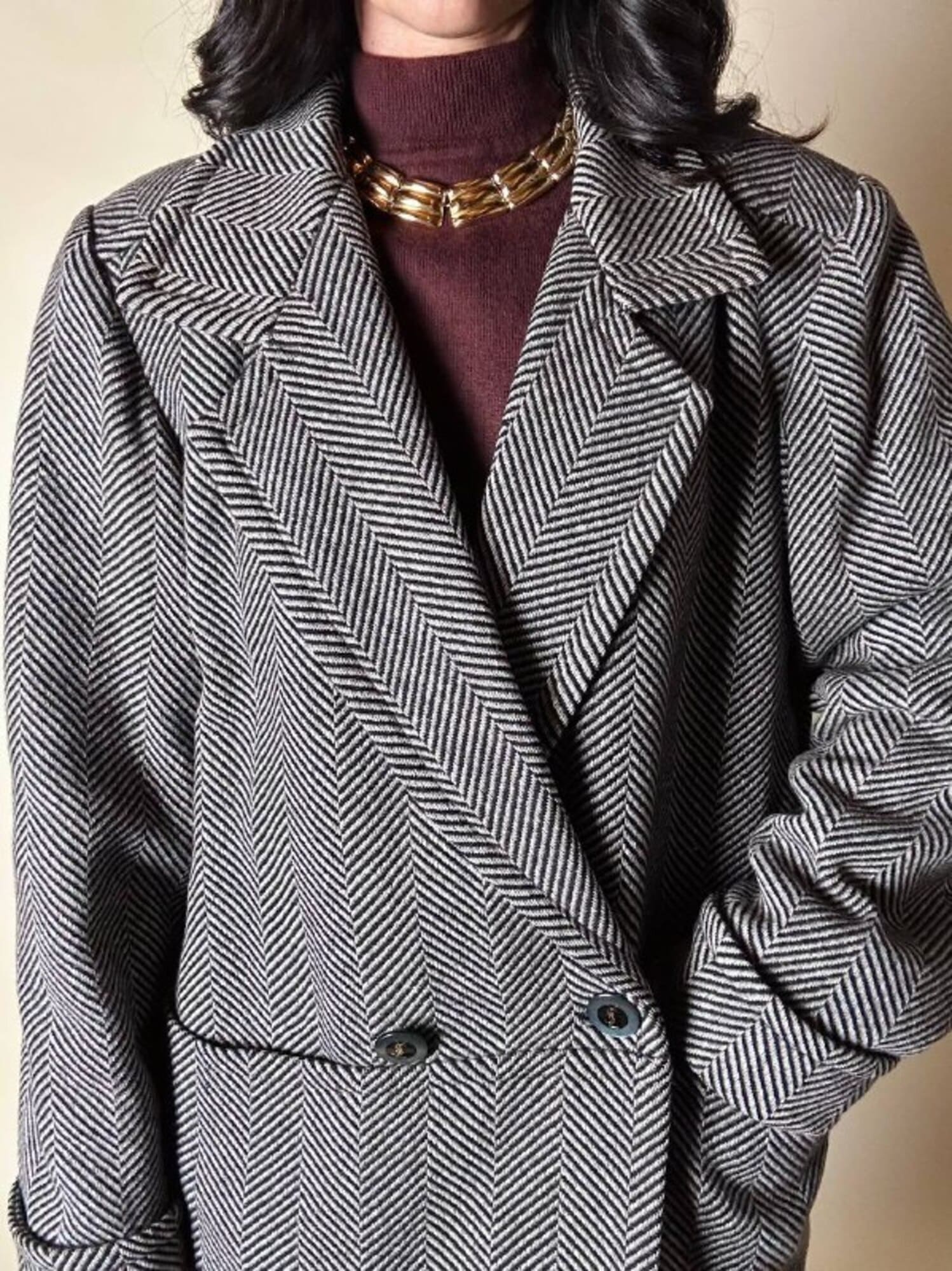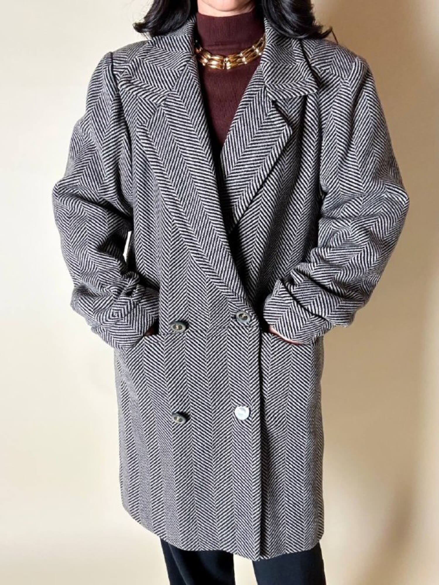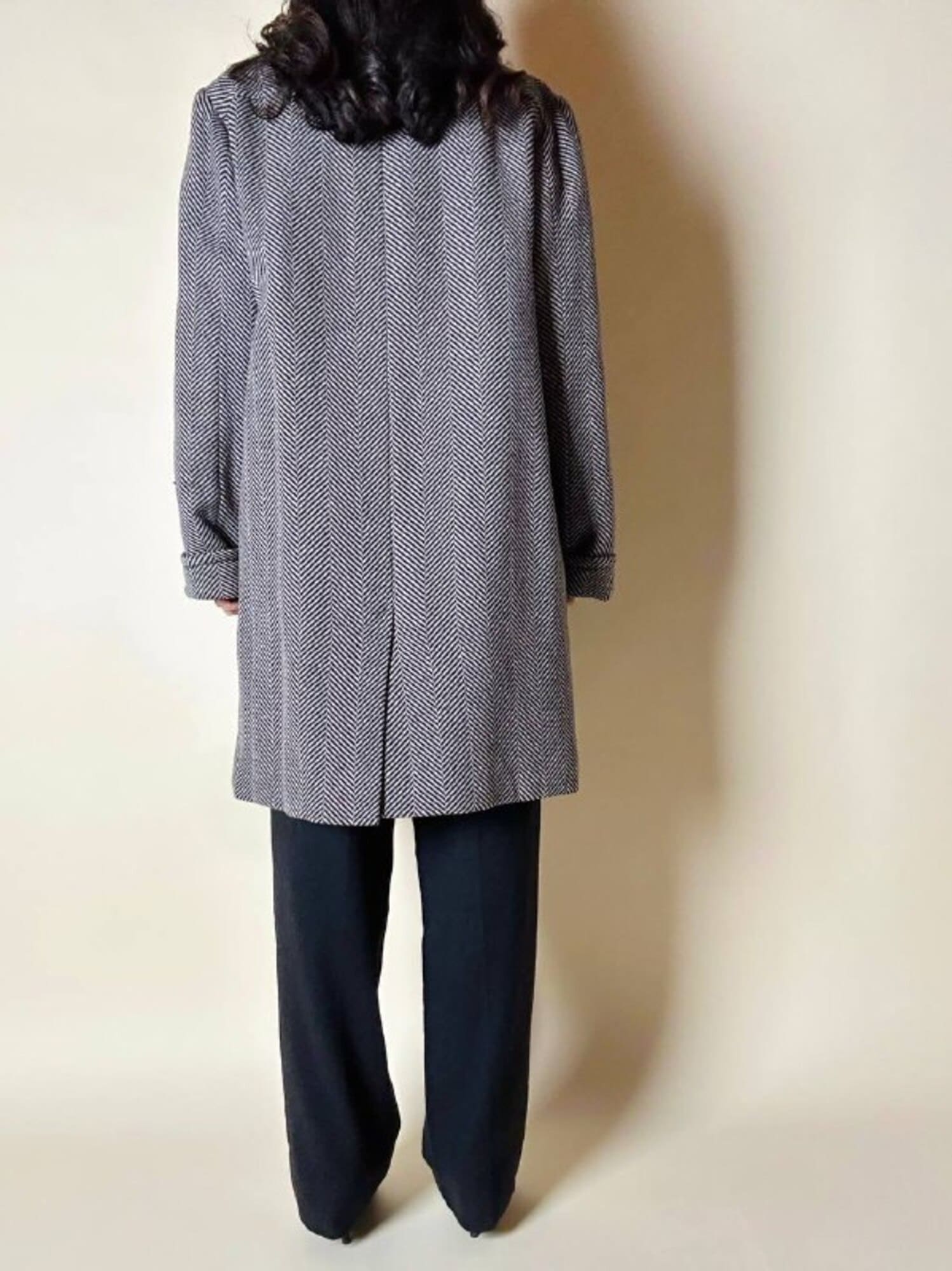 Un classico intramontabile nel guardaroba invernale, questo cappotto unisce eleganza sartoriale e dettagli iconici. Realizzato in lana con distintiva trama a spina di pesce, bianco tortora e nero. Il modello doppiopetto presenta ampi revers a lancia e grandi bottoni con logo YSL in oro che definiscono l’allacciatura frontale con un tocco di lusso discreto. La vestibilità oversize ma strutturata con spalle definite valorizza la silhouette, mentre la lunghezza fino al ginocchio aggiunge versatilità e praticità. Il cappotto, è tagliato orizzontalmente sul davanti, all’altezza del punto vita, con ampie tasche che coincidono col taglio e polsi risvoltati sulle maniche. In prossimità del collo è dotato di un elegante stringa in pelle color cuoio con terminali in metallo argento che consente di appenderlo facilmente. Completano il design uno spacco posteriore e la fodera matelassé grigio scuro, che assicura calore e comfort, rendendo questo cappotto un investimento essenziale di stile per l’inverno.