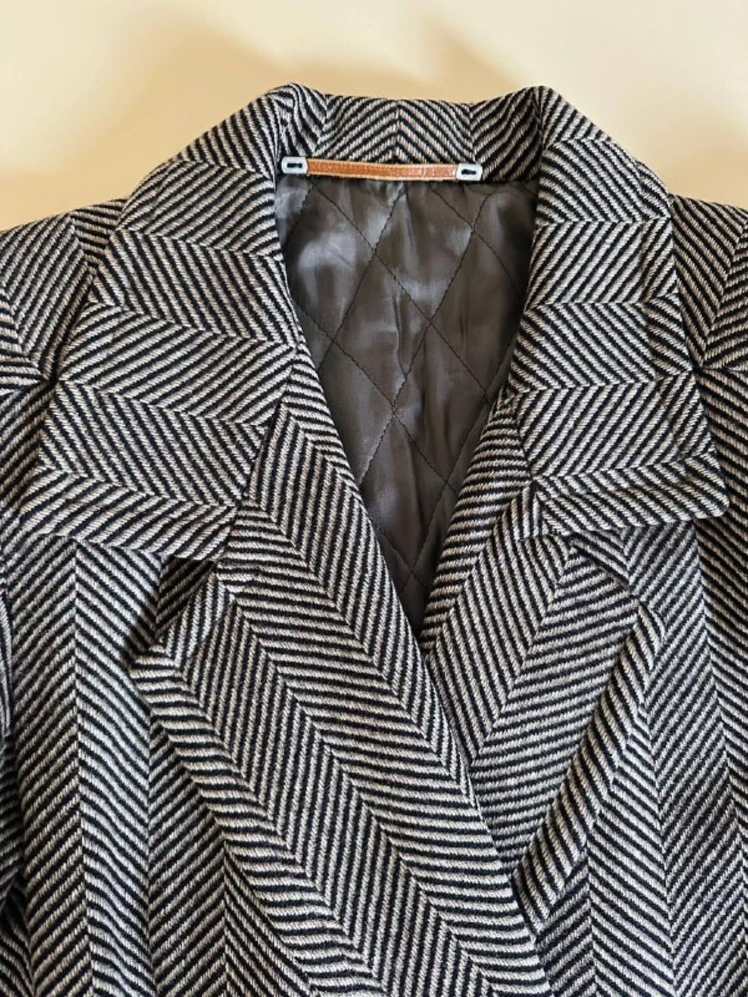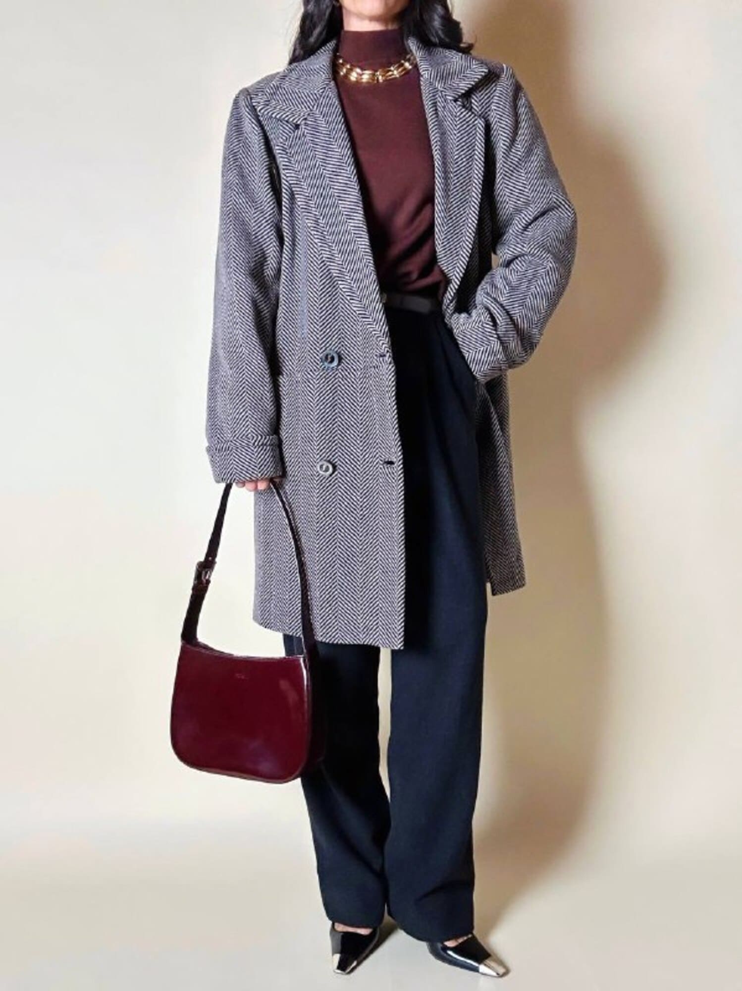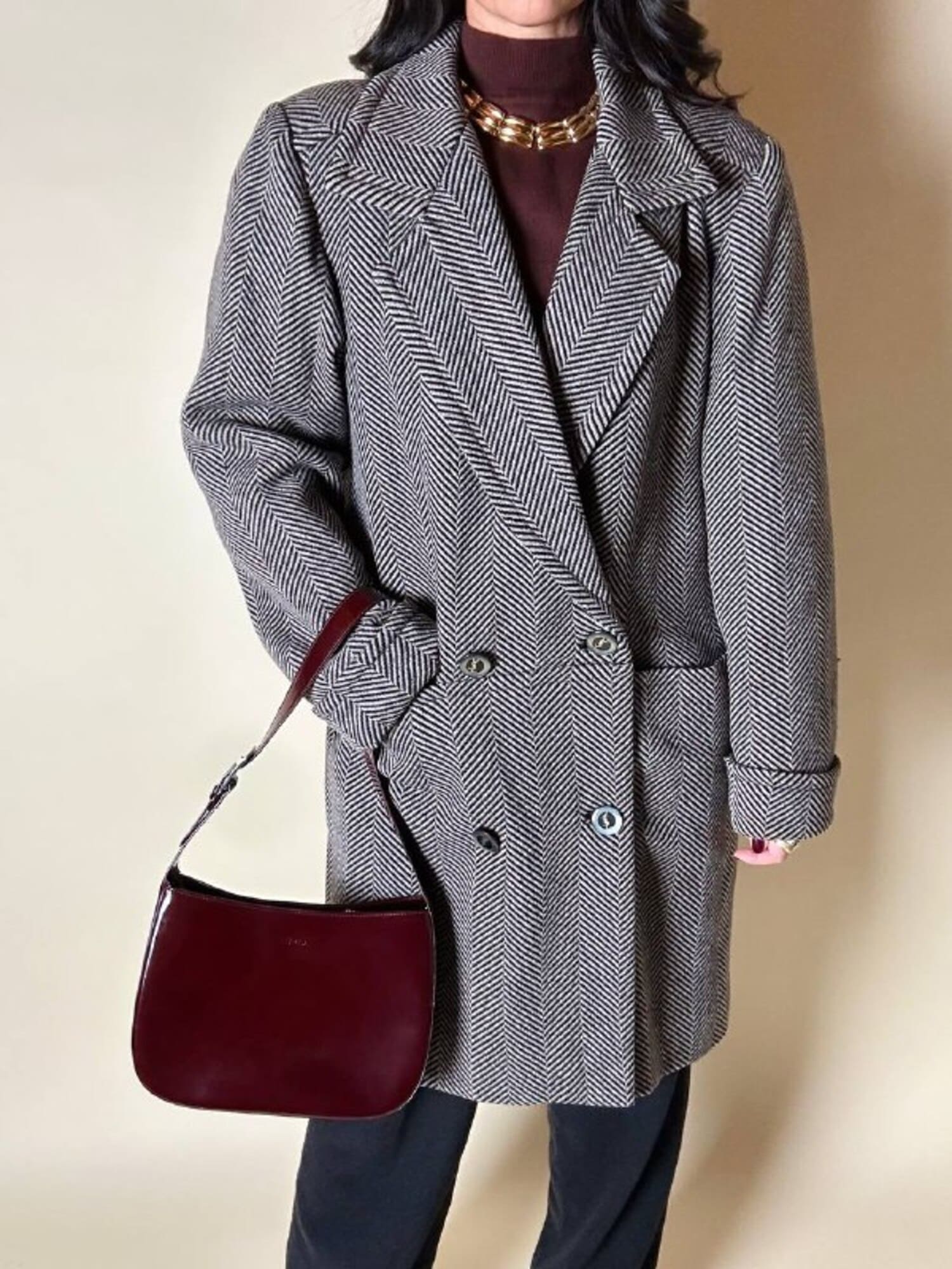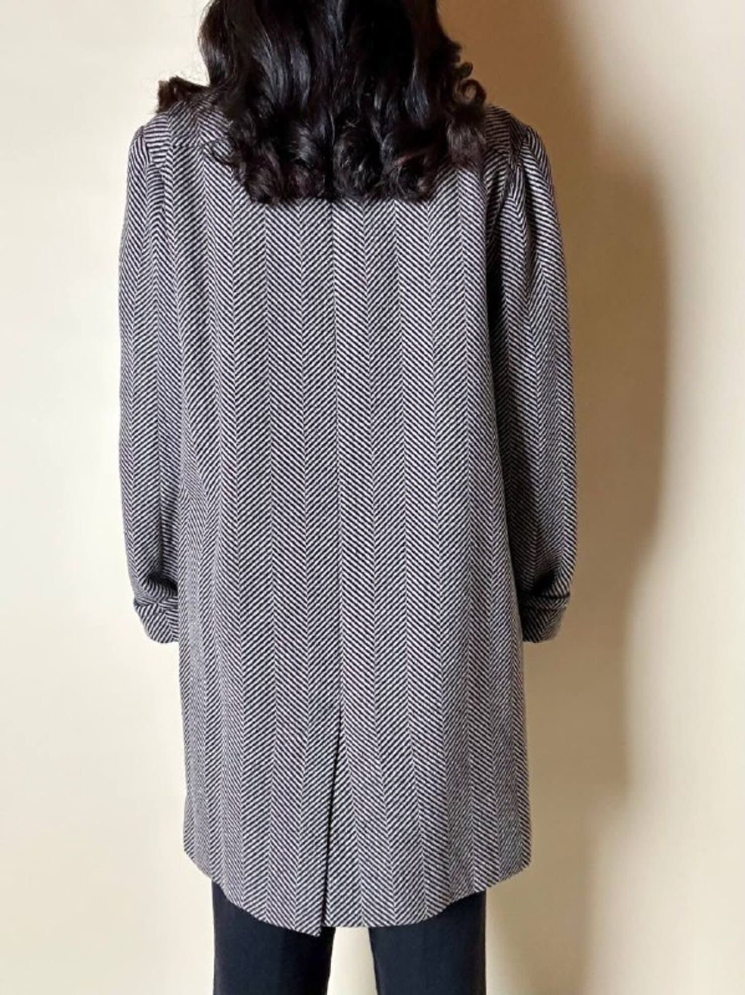 Un classico intramontabile nel guardaroba invernale, questo cappotto unisce eleganza sartoriale e dettagli iconici. Realizzato in lana con distintiva trama a spina di pesce, bianco tortora e nero. Il modello doppiopetto presenta ampi revers a lancia e grandi bottoni con logo YSL in oro che definiscono l’allacciatura frontale con un tocco di lusso discreto. La vestibilità oversize ma strutturata con spalle definite valorizza la silhouette, mentre la lunghezza fino al ginocchio aggiunge versatilità e praticità. Il cappotto, è tagliato orizzontalmente sul davanti, all’altezza del punto vita, con ampie tasche che coincidono col taglio e polsi risvoltati sulle maniche. In prossimità del collo è dotato di un elegante stringa in pelle color cuoio con terminali in metallo argento che consente di appenderlo facilmente. Completano il design uno spacco posteriore e la fodera matelassé grigio scuro, che assicura calore e comfort, rendendo questo cappotto un investimento essenziale di stile per l’inverno.