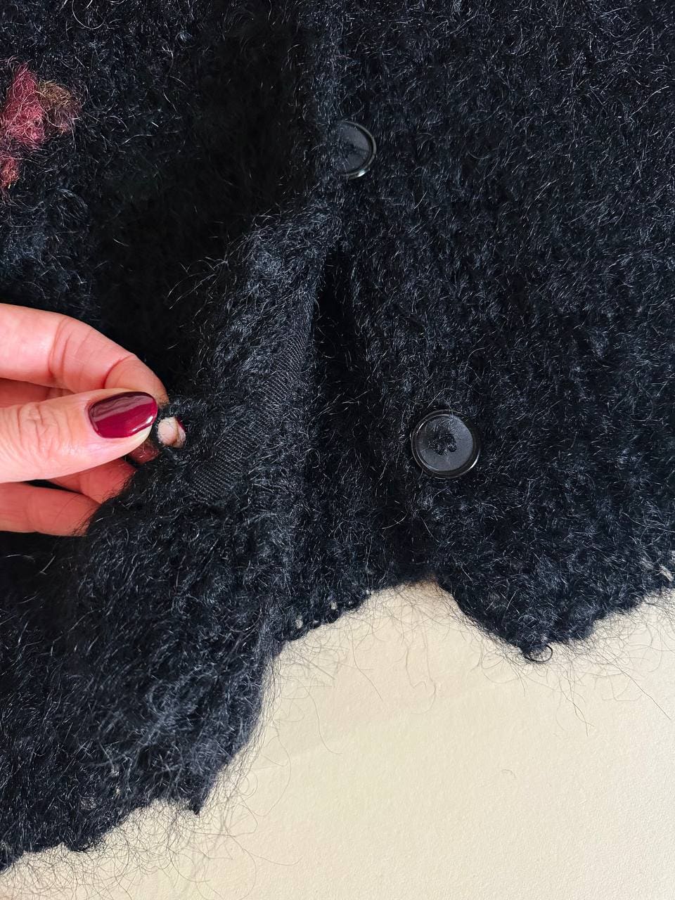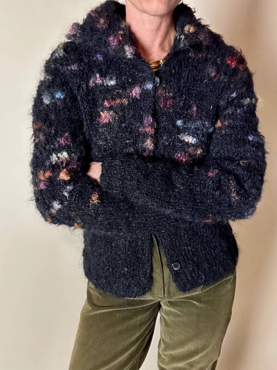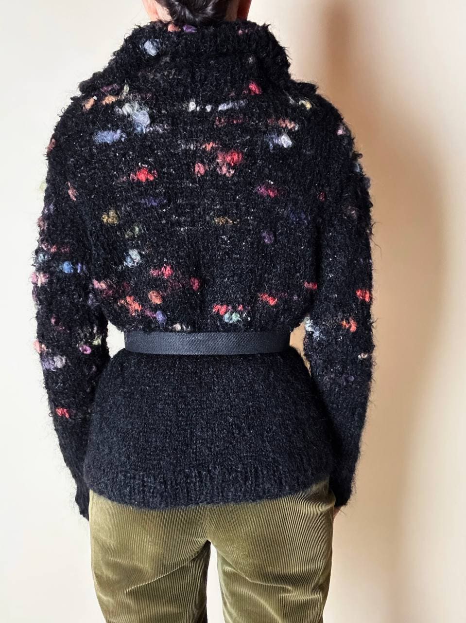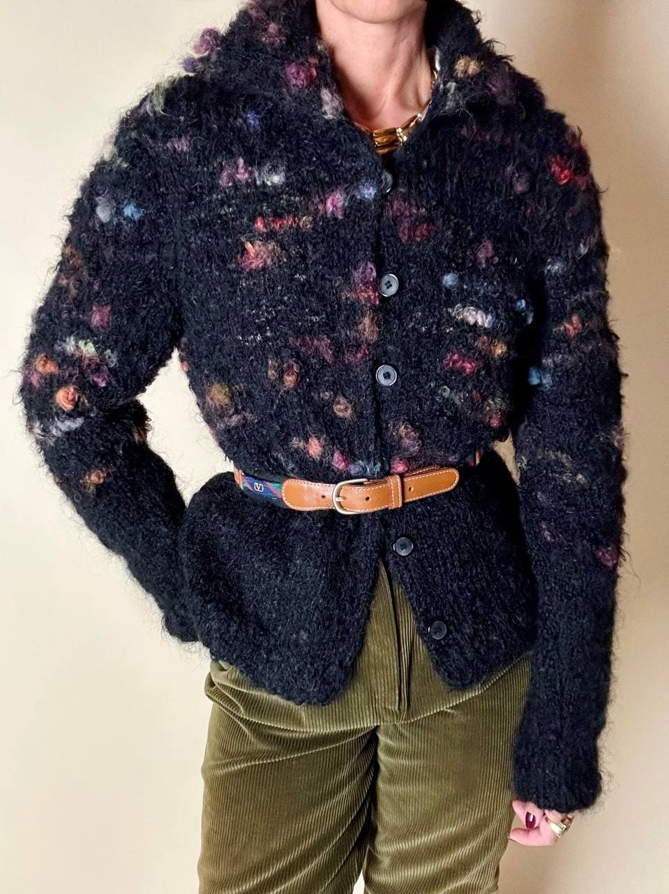 Questo cardigan fatto a mano in soffice lana bouclé nera avvolge la silhouette con una texture ricca e materica, valorizzata da raffinati dettagli multicolor che ne animano la superficie con tocchi vivaci. L’alto e ampio collo aggiunge un elemento scultoreo e avvolgente, ideale per creare giochi di volume e proteggere con eleganza nelle giornate più fredde. La chiusura frontale è definita da bottoni neri e asole esterne, un dettaglio sartoriale che accentua il carattere handmade del modello. All’interno, una rifinitura in gros grain nero conferisce una finitura impeccabile. Un cardigan dal fascino autentico, pensato per chi cerca capi che raccontano una storia di manualità, creatività e stile senza tempo.