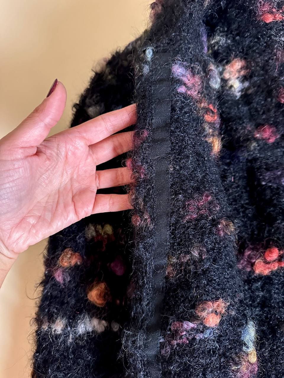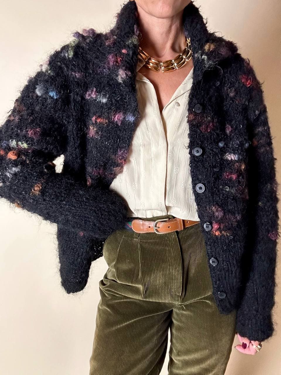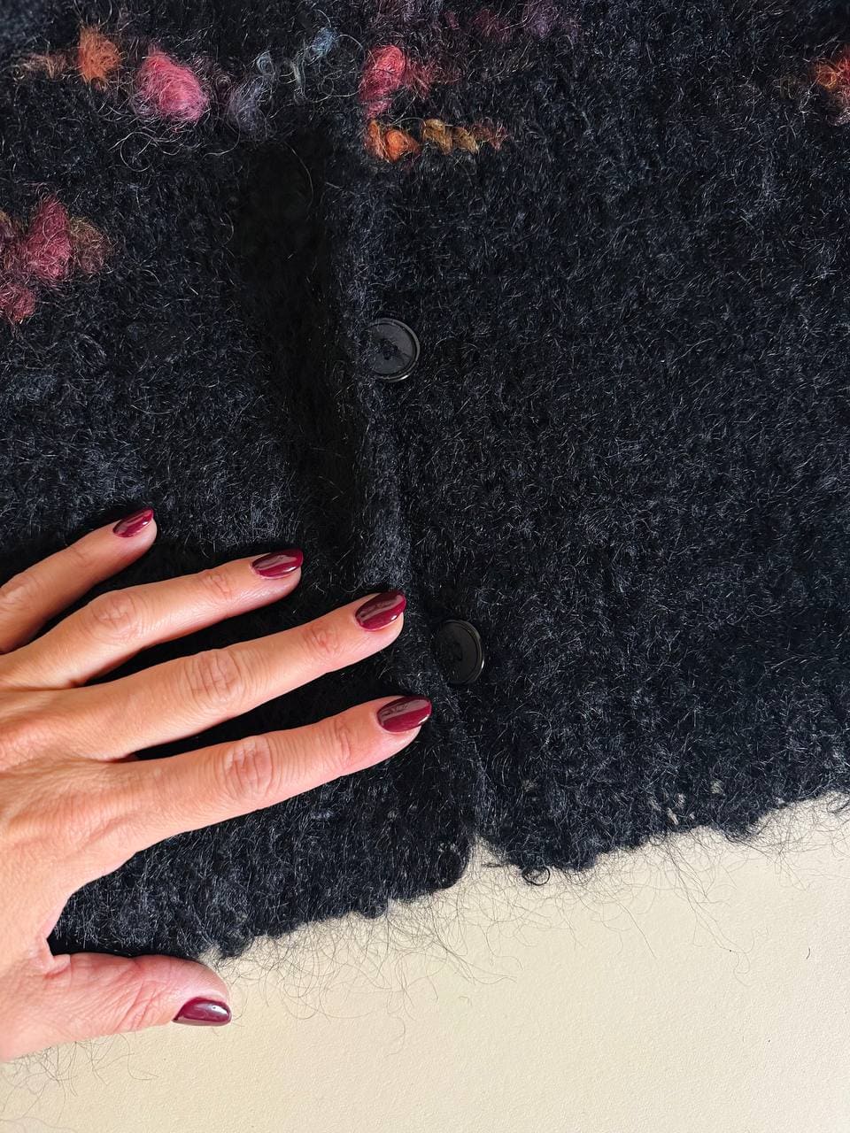 Questo cardigan fatto a mano in soffice lana bouclé nera avvolge la silhouette con una texture ricca e materica, valorizzata da raffinati dettagli multicolor che ne animano la superficie con tocchi vivaci. L’alto e ampio collo aggiunge un elemento scultoreo e avvolgente, ideale per creare giochi di volume e proteggere con eleganza nelle giornate più fredde. La chiusura frontale è definita da bottoni neri e asole esterne, un dettaglio sartoriale che accentua il carattere handmade del modello. All’interno, una rifinitura in gros grain nero conferisce una finitura impeccabile. Un cardigan dal fascino autentico, pensato per chi cerca capi che raccontano una storia di manualità, creatività e stile senza tempo.