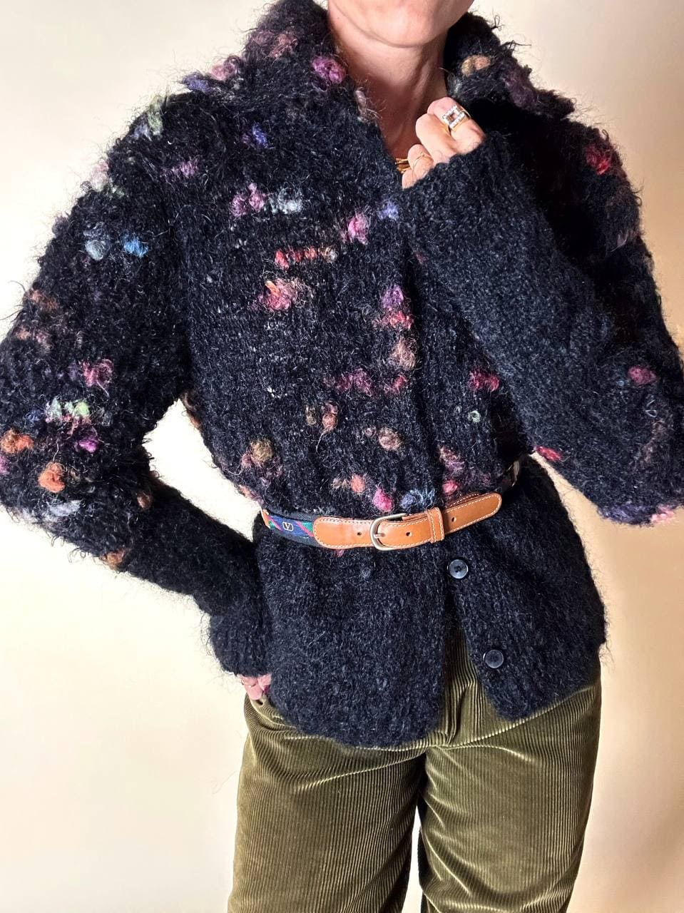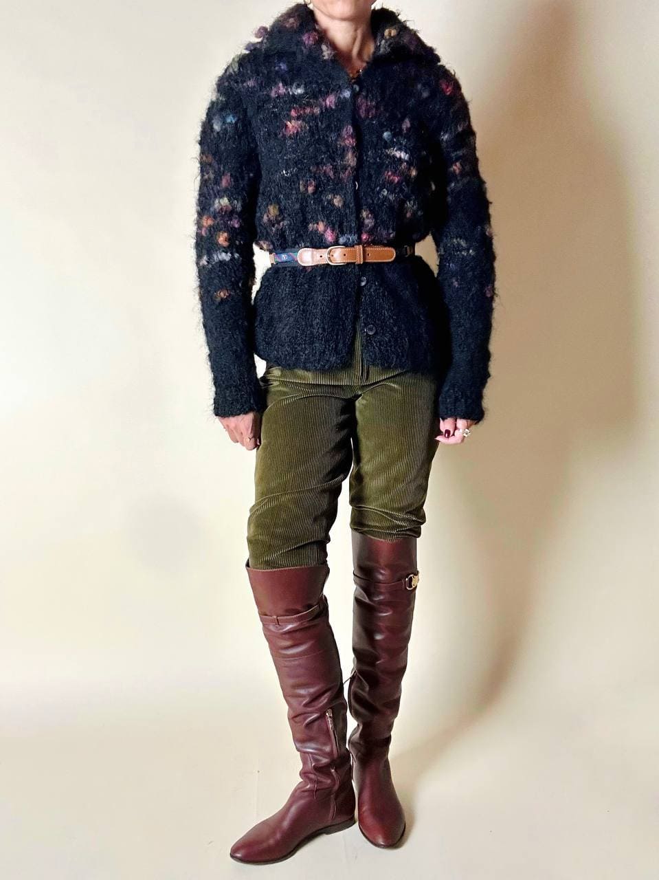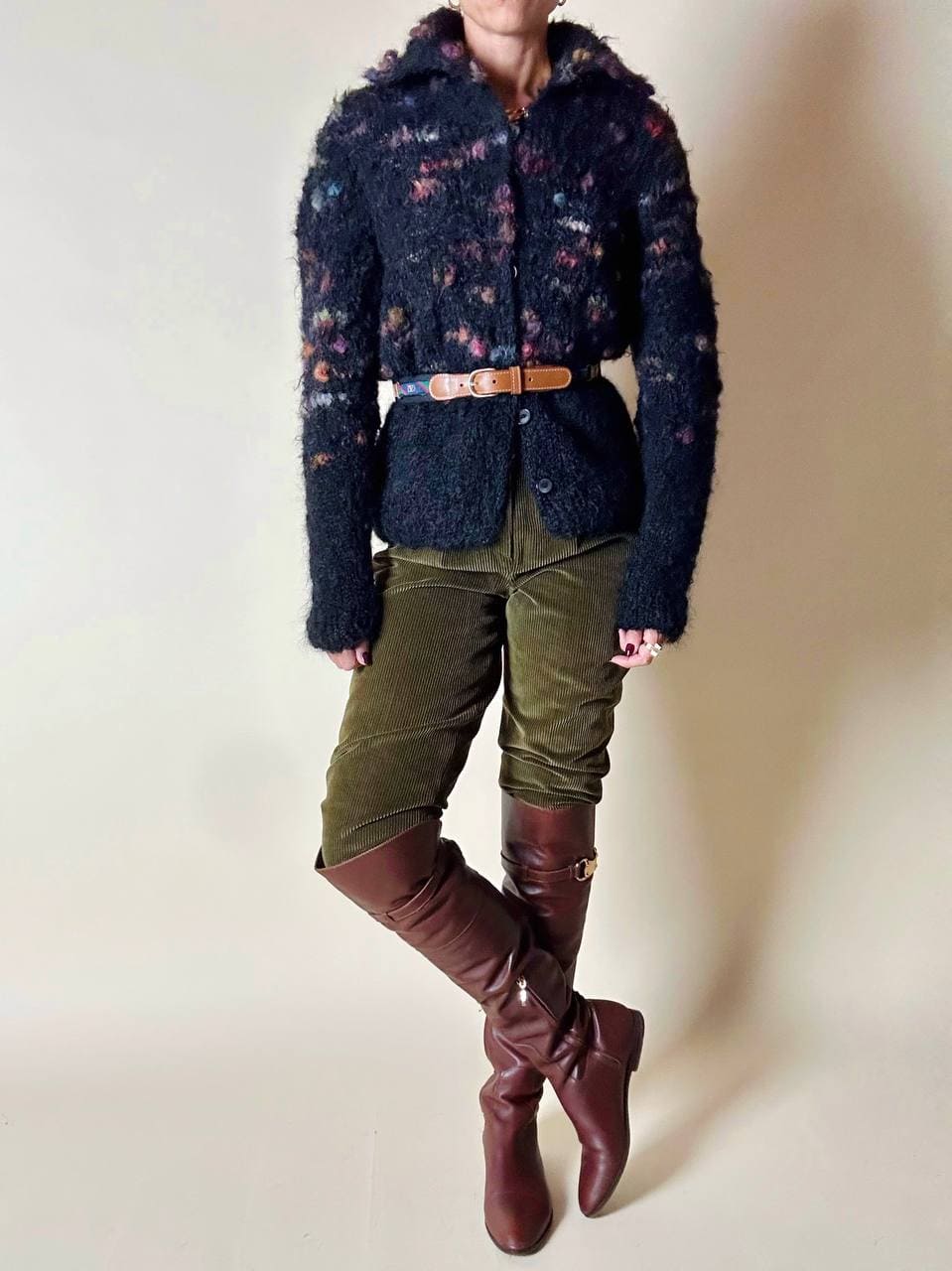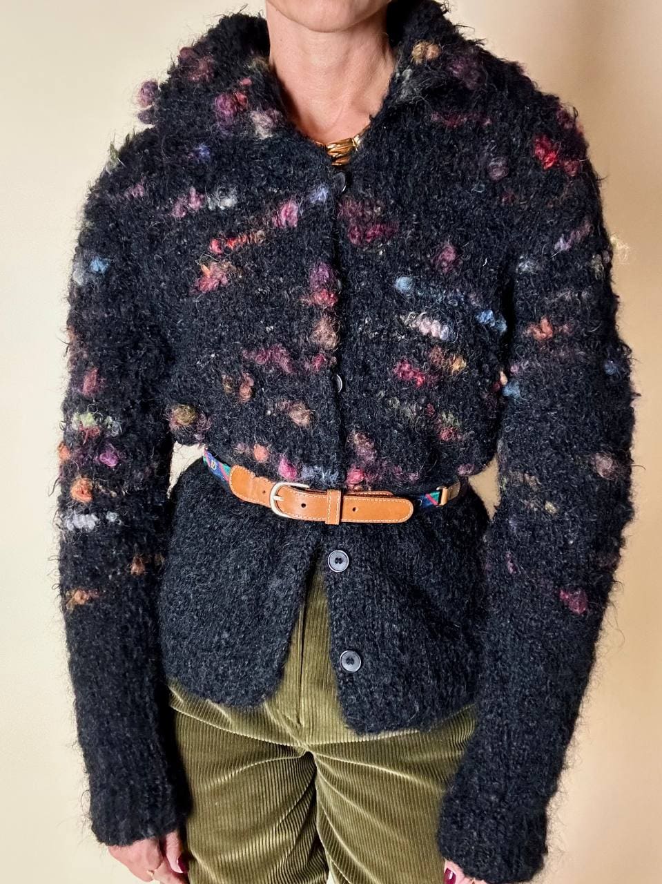 Questo cardigan fatto a mano in soffice lana bouclé nera avvolge la silhouette con una texture ricca e materica, valorizzata da raffinati dettagli multicolor che ne animano la superficie con tocchi vivaci. L’alto e ampio collo aggiunge un elemento scultoreo e avvolgente, ideale per creare giochi di volume e proteggere con eleganza nelle giornate più fredde. La chiusura frontale è definita da bottoni neri e asole esterne, un dettaglio sartoriale che accentua il carattere handmade del modello. All’interno, una rifinitura in gros grain nero conferisce una finitura impeccabile. Un cardigan dal fascino autentico, pensato per chi cerca capi che raccontano una storia di manualità, creatività e stile senza tempo.