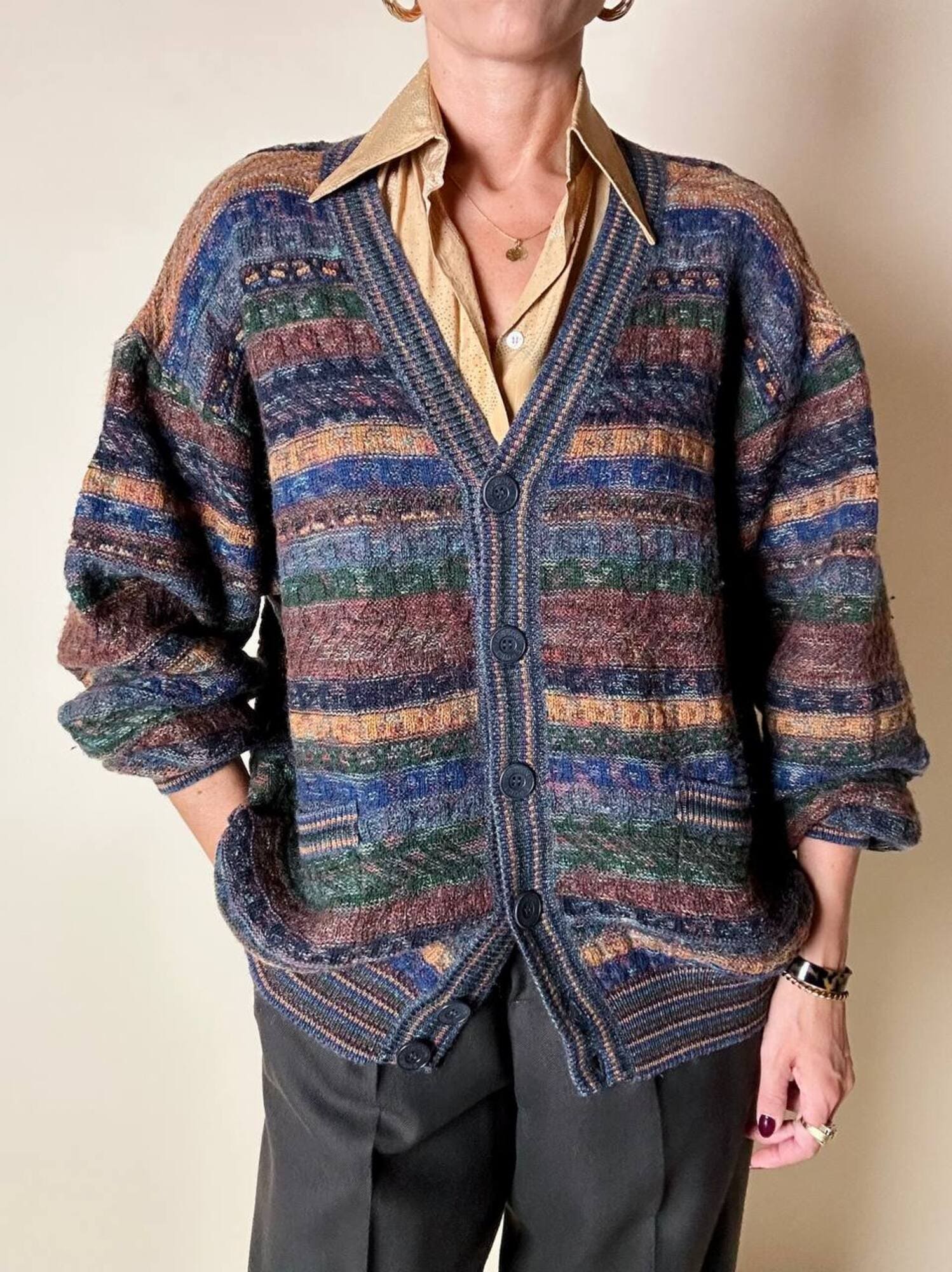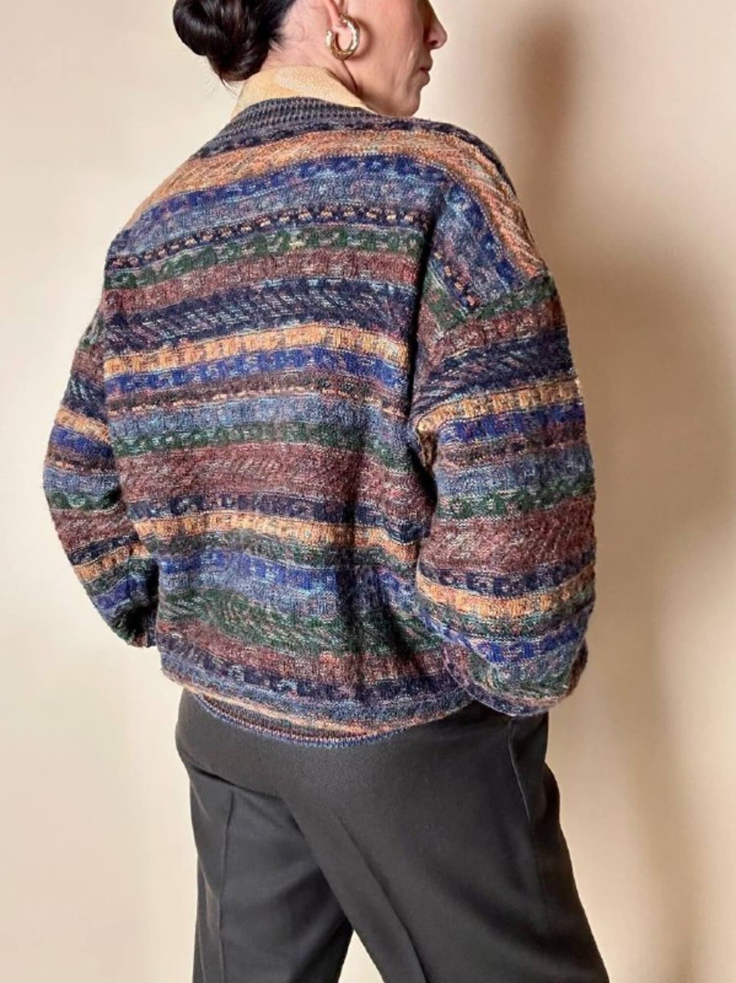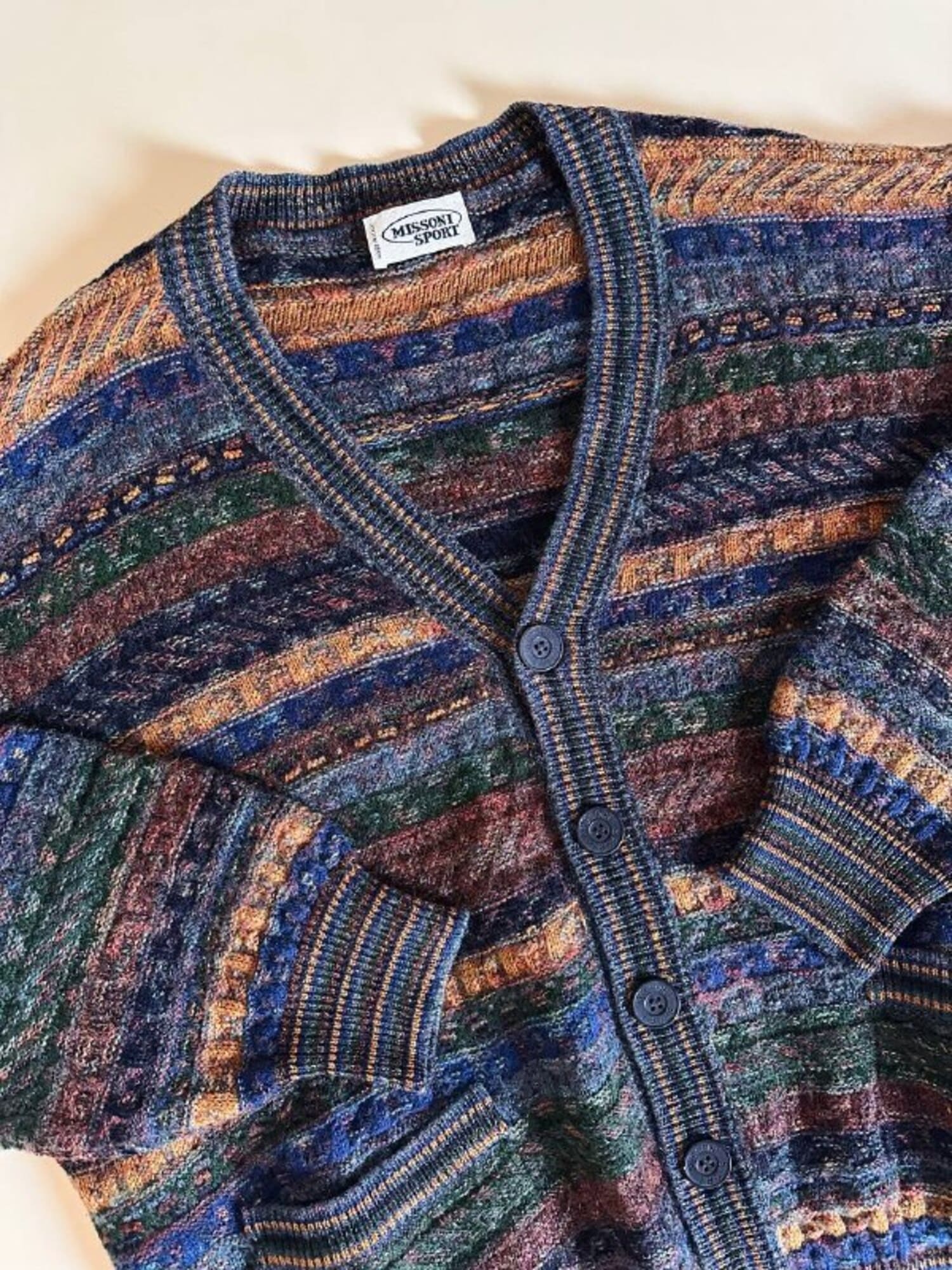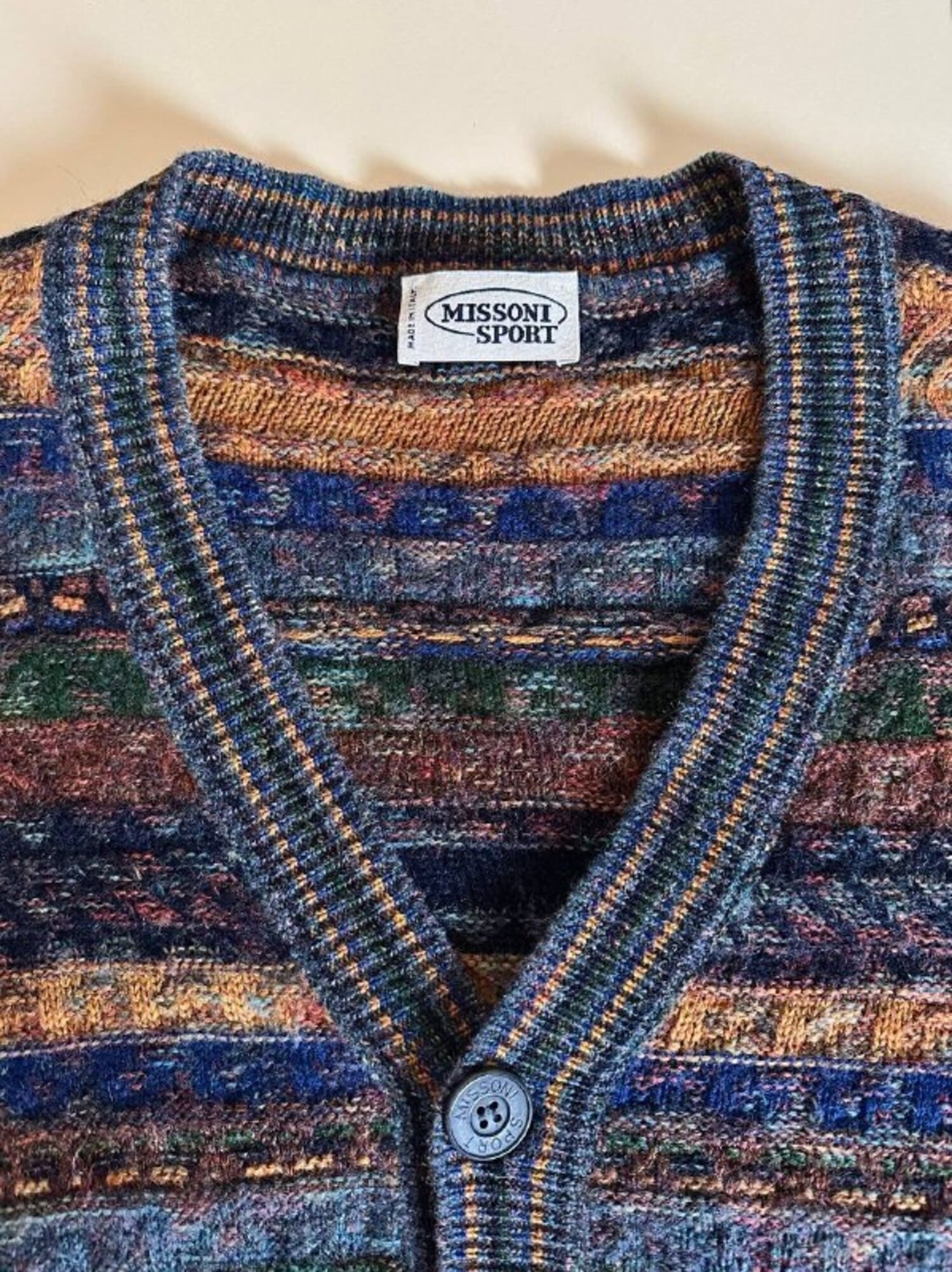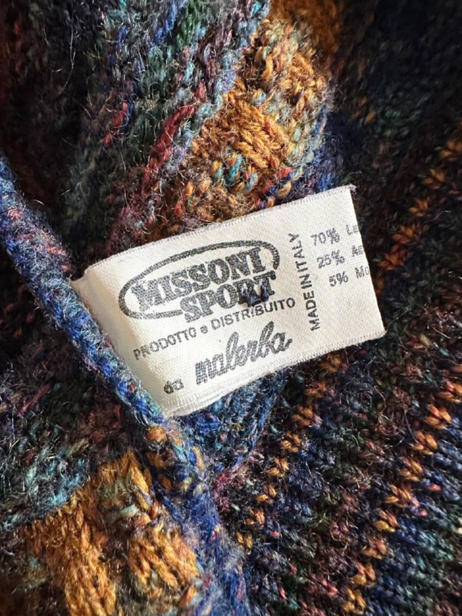 Cardigan vintage Missoni Sport in lana operata a righe orizzontali, un pezzo autentico del design italiano che unisce artigianalità raffinata e fascino senza tempo. La palette – un intreccio profondo di blu, verde bosco, marrone e beige – crea un ritmo cromatico ricco e sofisticato, tipico del linguaggio estetico della maison. La vestibilità morbida e il modello classico valorizzano la silhouette con naturale eleganza, mentre i profili a coste sottili e i bottoni blu con firma incisa aggiungono una nota di pregio e riconoscibilità. Perfetto per chi cerca un capo heritage capace di comunicare stile, autenticità e cultura del knitwear italiano, questo cardigan rappresenta una scelta ideale per arricchire il proprio guardaroba con un capo iconico. Dotato di bottone di scorta cucito nell’etichetta di composizione interna.
