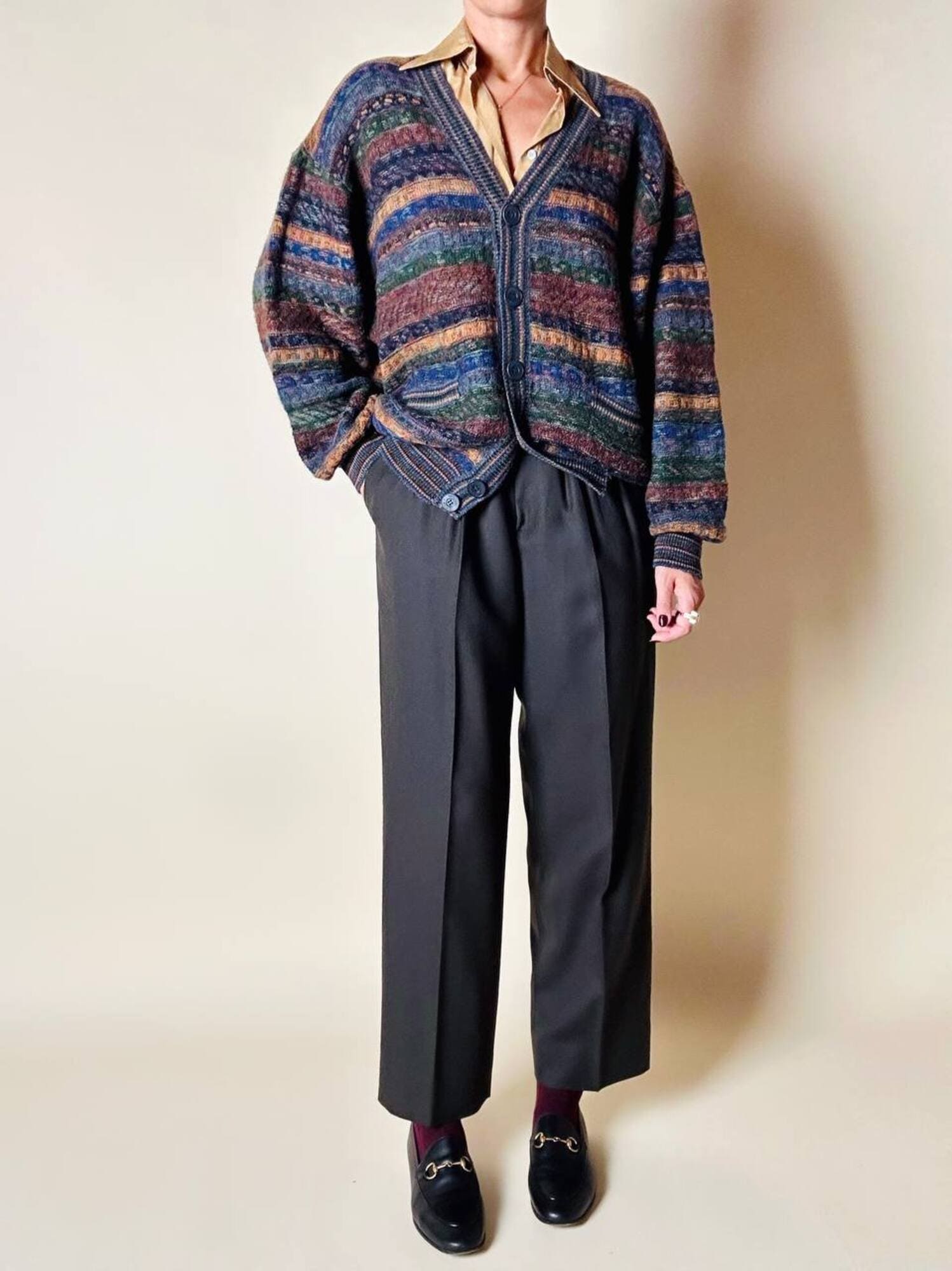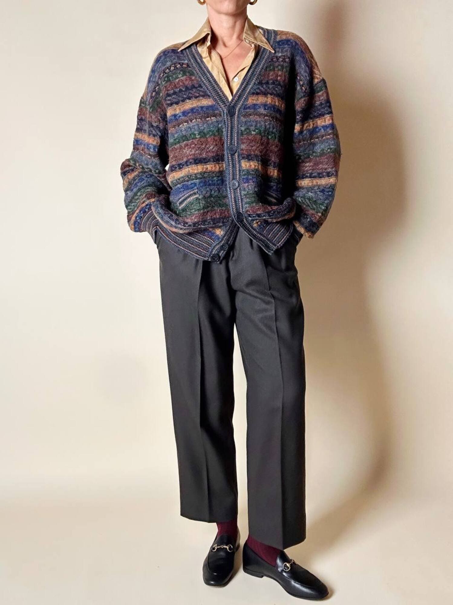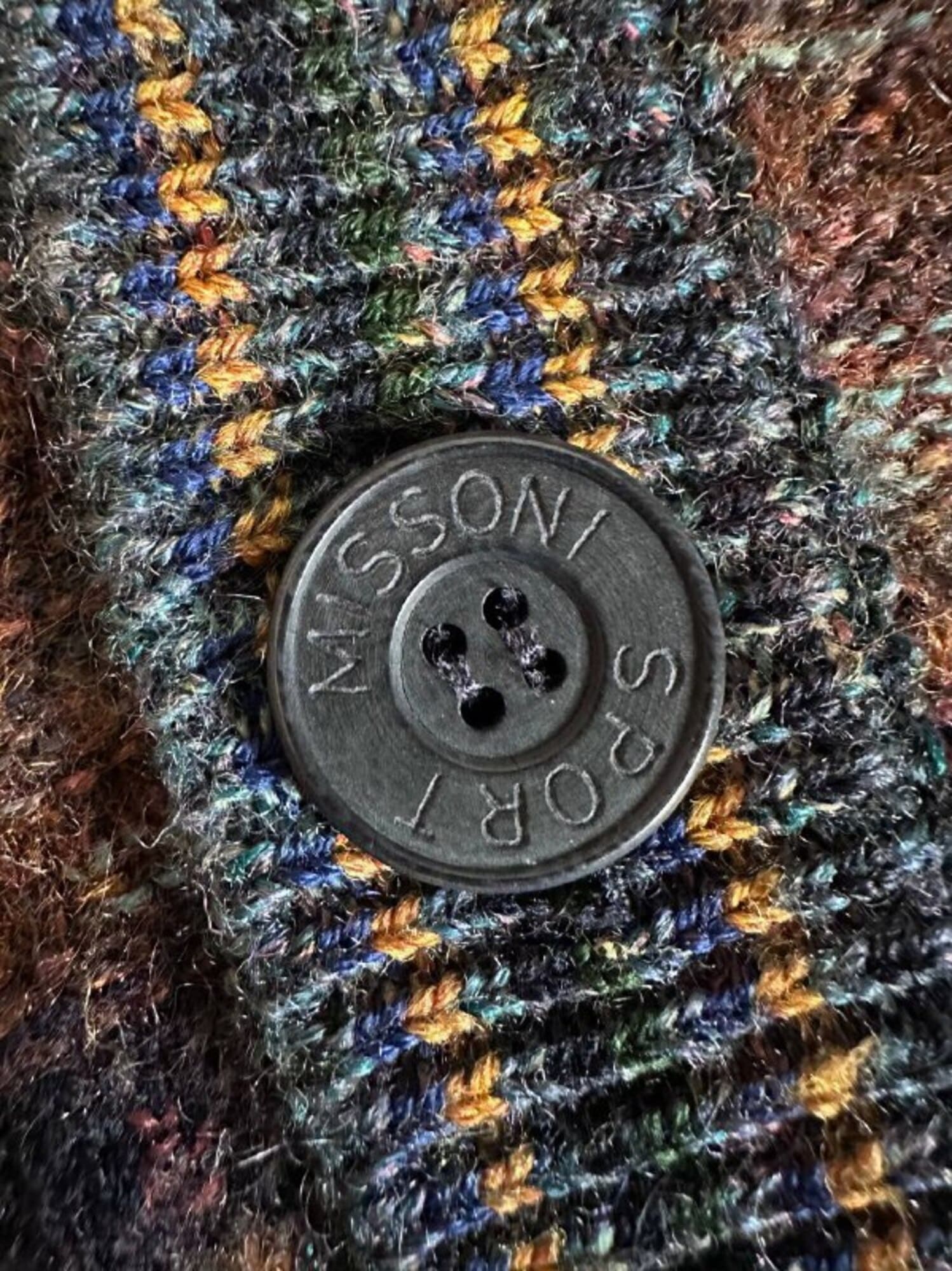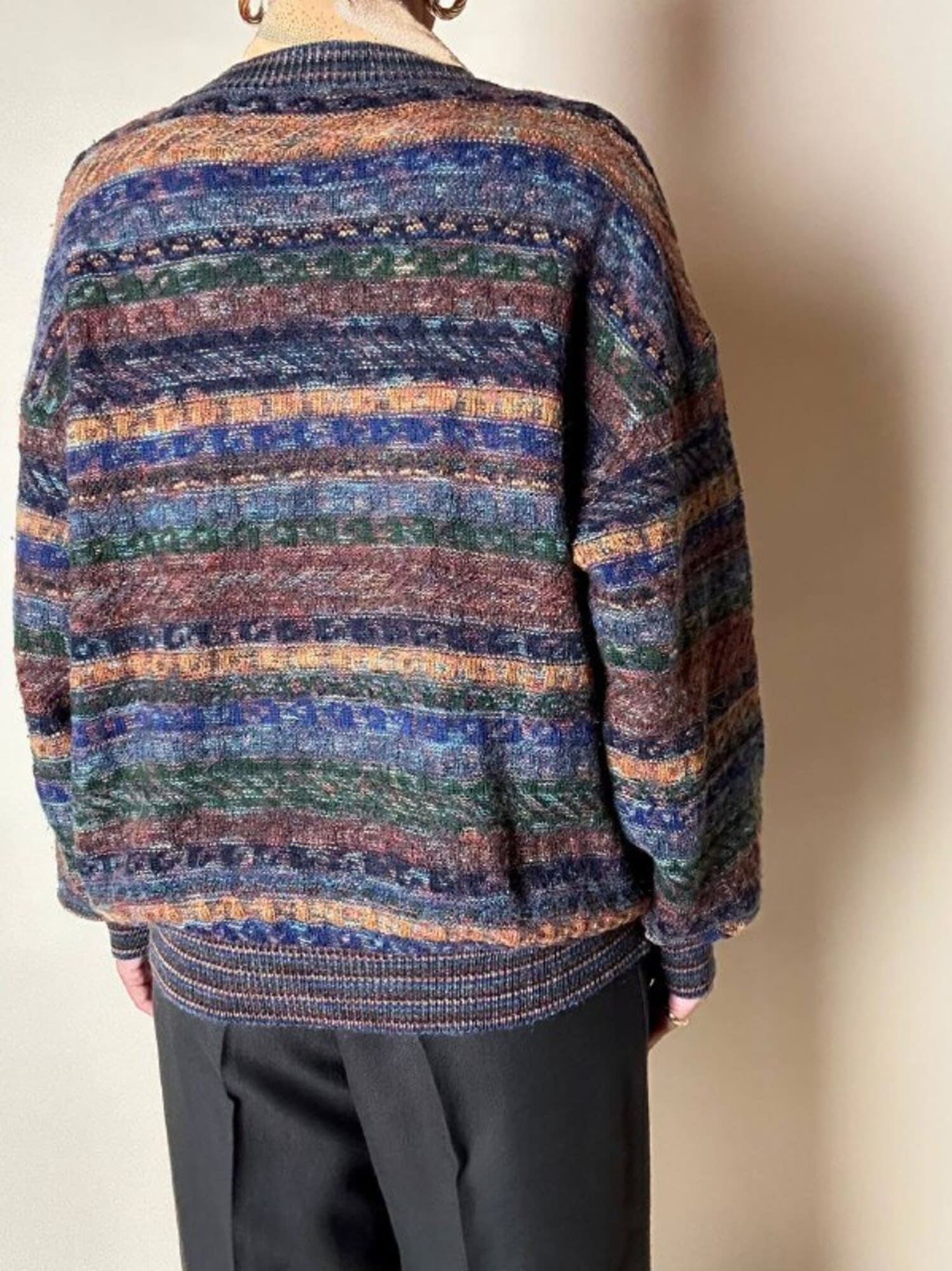 Cardigan vintage Missoni Sport in lana operata a righe orizzontali, un pezzo autentico del design italiano che unisce artigianalità raffinata e fascino senza tempo. La palette – un intreccio profondo di blu, verde bosco, marrone e beige – crea un ritmo cromatico ricco e sofisticato, tipico del linguaggio estetico della maison. La vestibilità morbida e il modello classico valorizzano la silhouette con naturale eleganza, mentre i profili a coste sottili e i bottoni blu con firma incisa aggiungono una nota di pregio e riconoscibilità. Perfetto per chi cerca un capo heritage capace di comunicare stile, autenticità e cultura del knitwear italiano, questo cardigan rappresenta una scelta ideale per arricchire il proprio guardaroba con un capo iconico. Dotato di bottone di scorta cucito nell’etichetta di composizione interna.