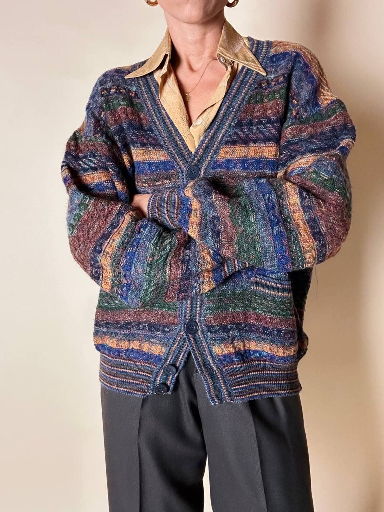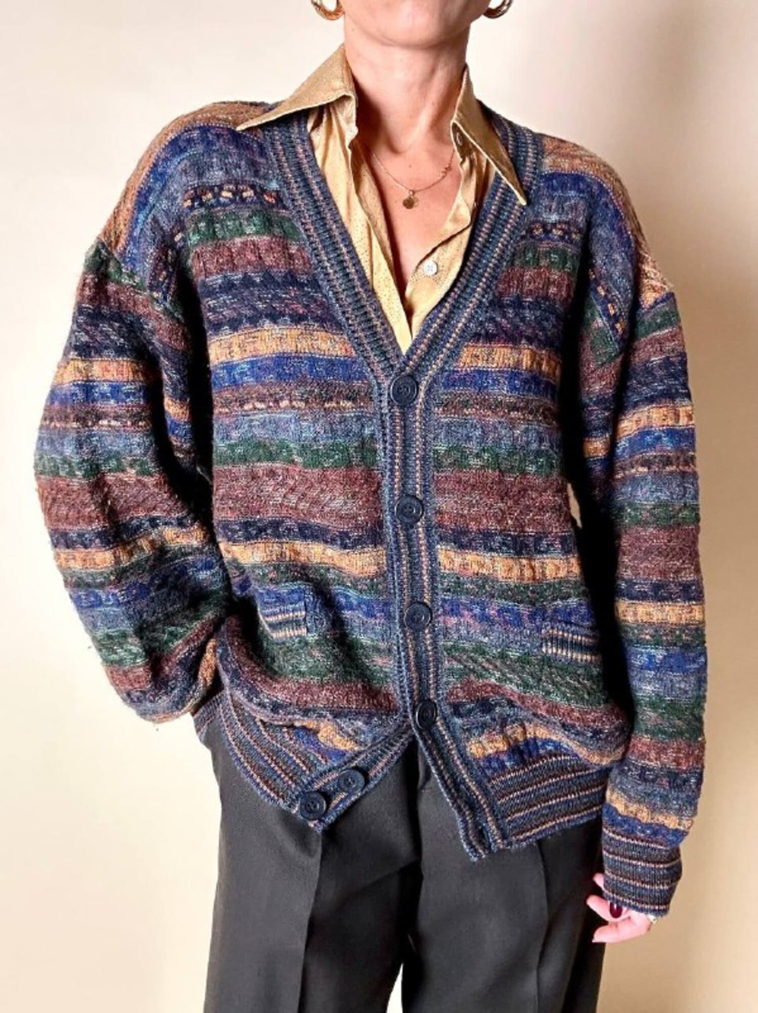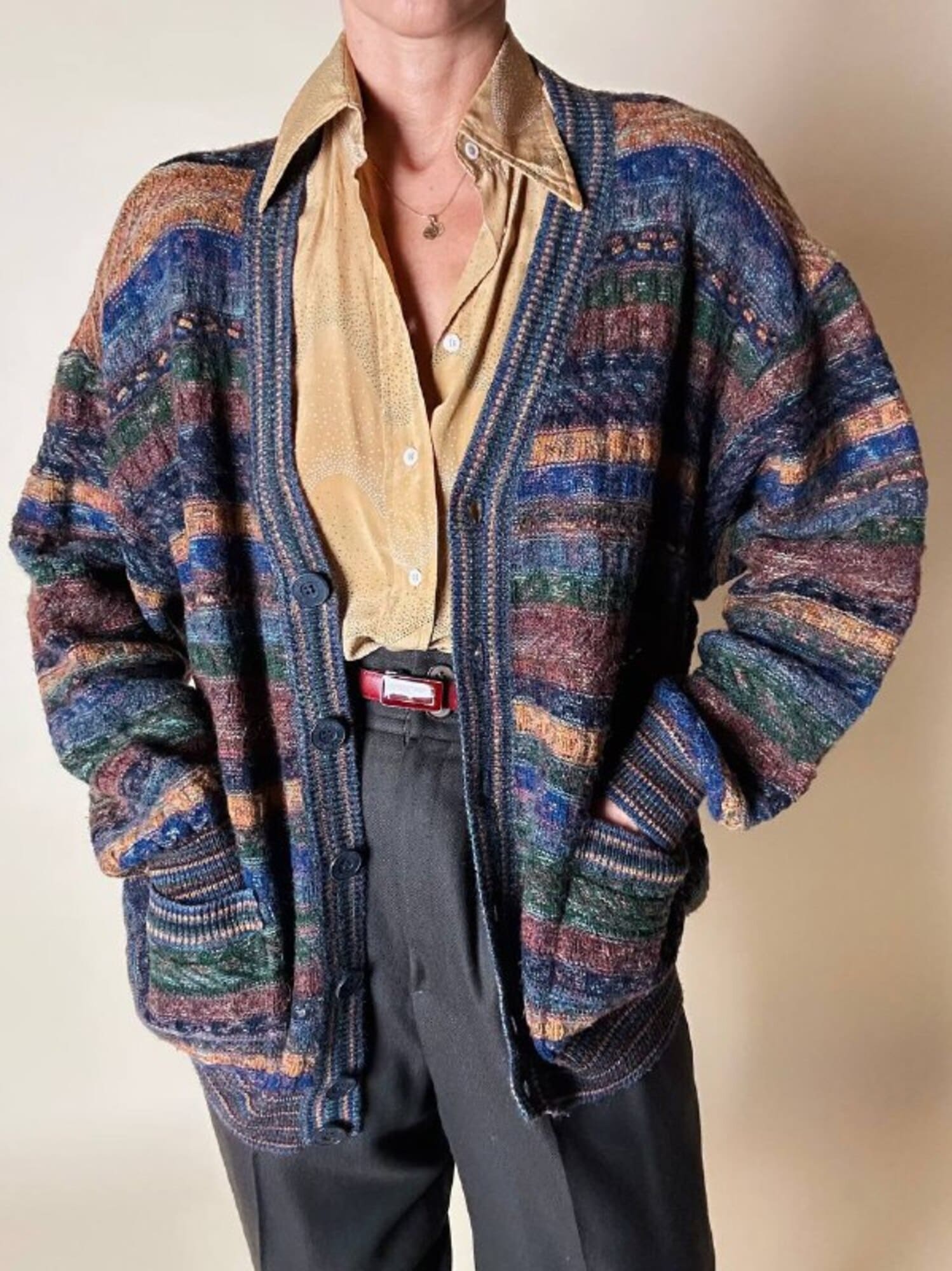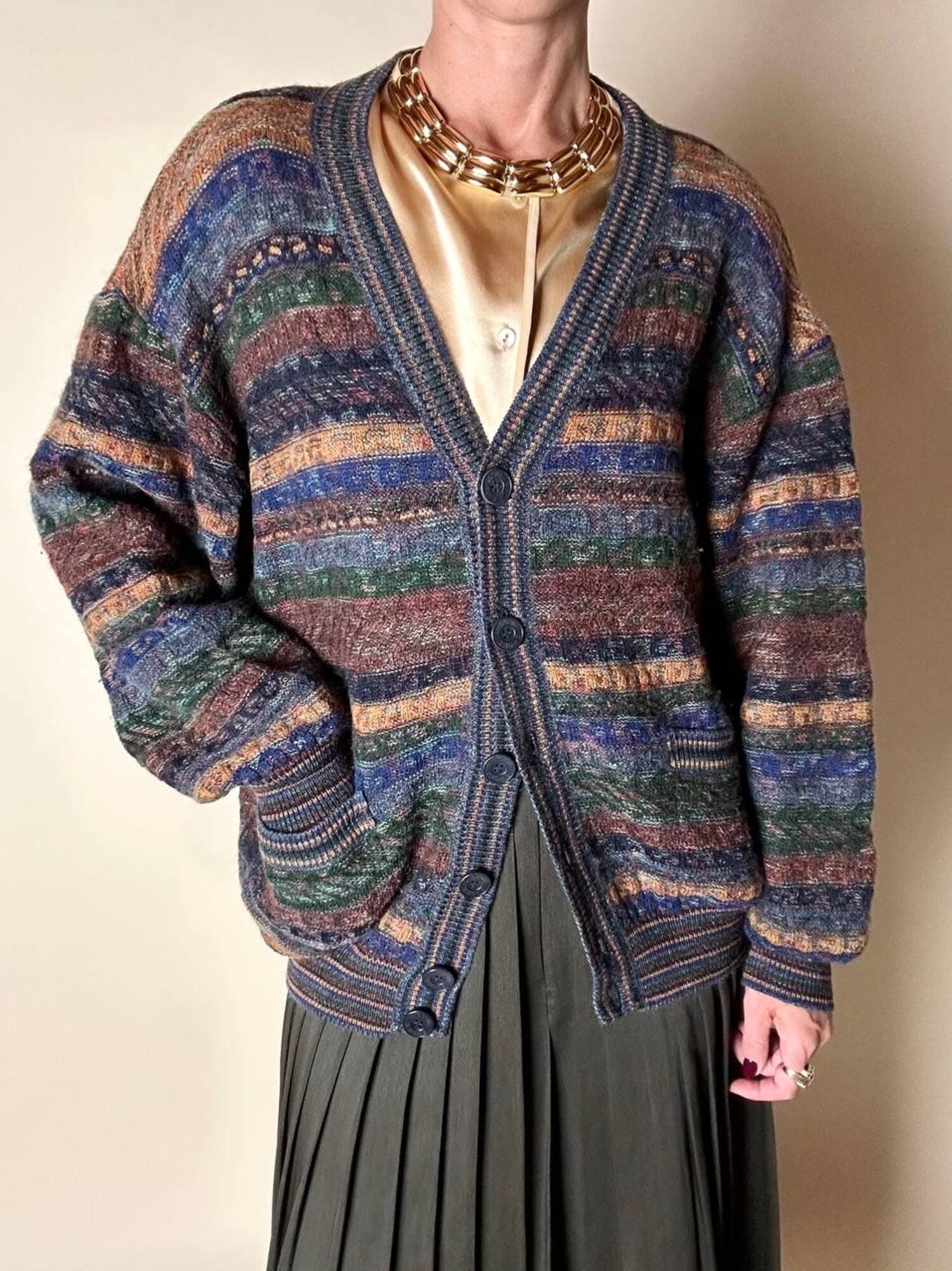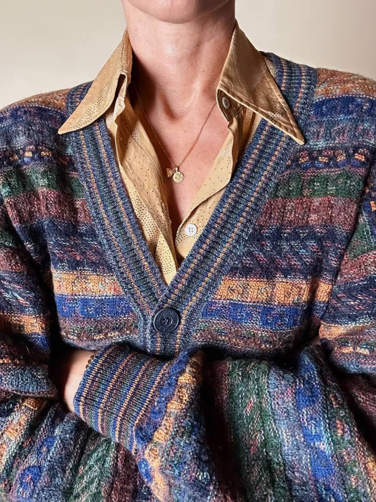 Cardigan vintage Missoni Sport in lana operata a righe orizzontali, un pezzo autentico del design italiano che unisce artigianalità raffinata e fascino senza tempo. La palette – un intreccio profondo di blu, verde bosco, marrone e beige – crea un ritmo cromatico ricco e sofisticato, tipico del linguaggio estetico della maison. La vestibilità morbida e il modello classico valorizzano la silhouette con naturale eleganza, mentre i profili a coste sottili e i bottoni blu con firma incisa aggiungono una nota di pregio e riconoscibilità. Perfetto per chi cerca un capo heritage capace di comunicare stile, autenticità e cultura del knitwear italiano, questo cardigan rappresenta una scelta ideale per arricchire il proprio guardaroba con un capo iconico. Dotato di bottone di scorta cucito nell’etichetta di composizione interna.
