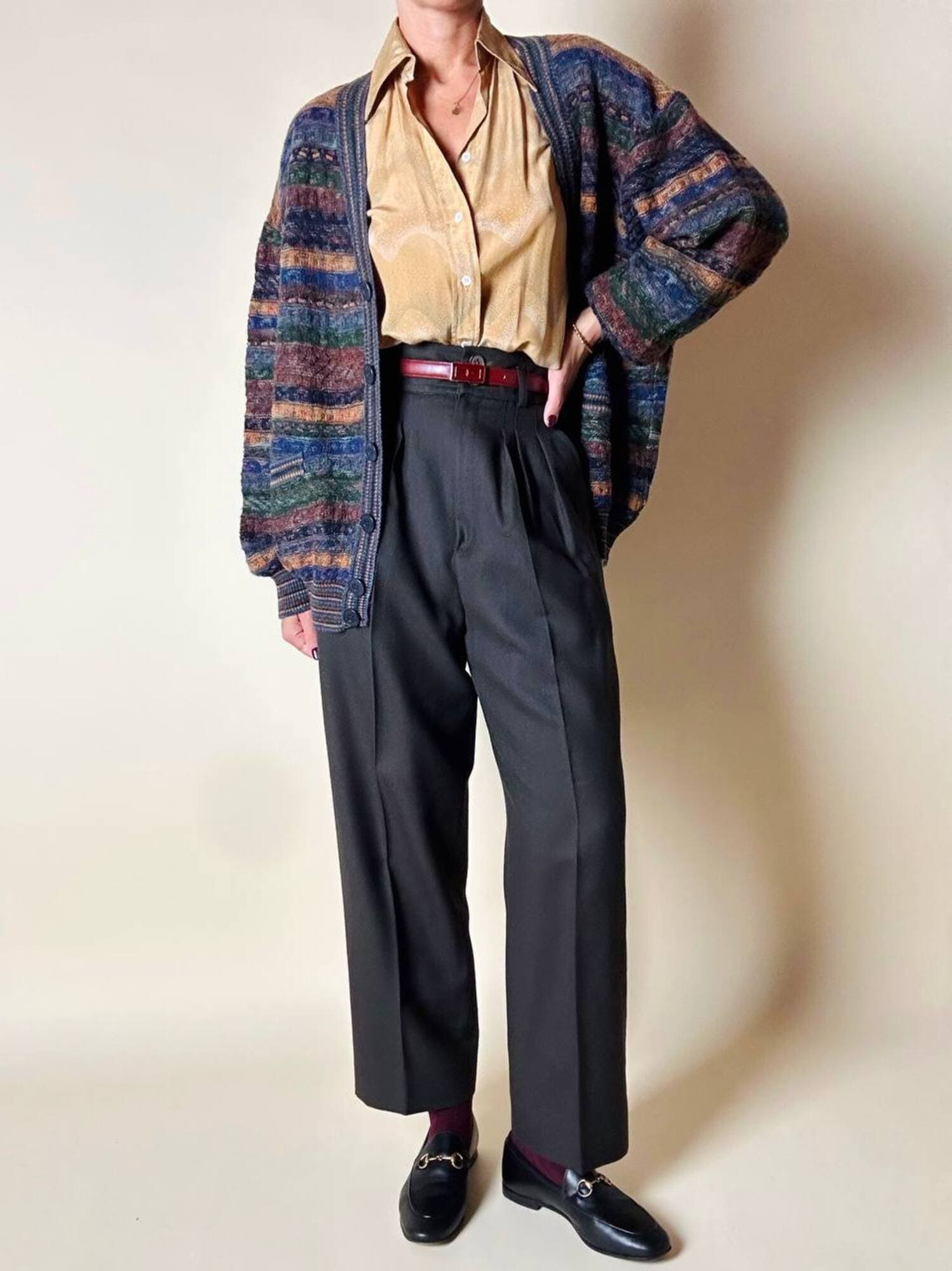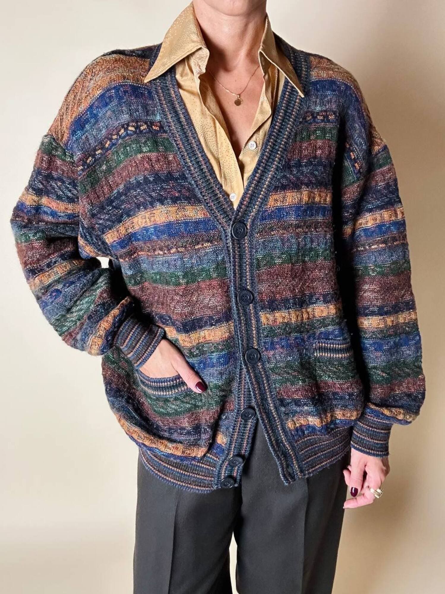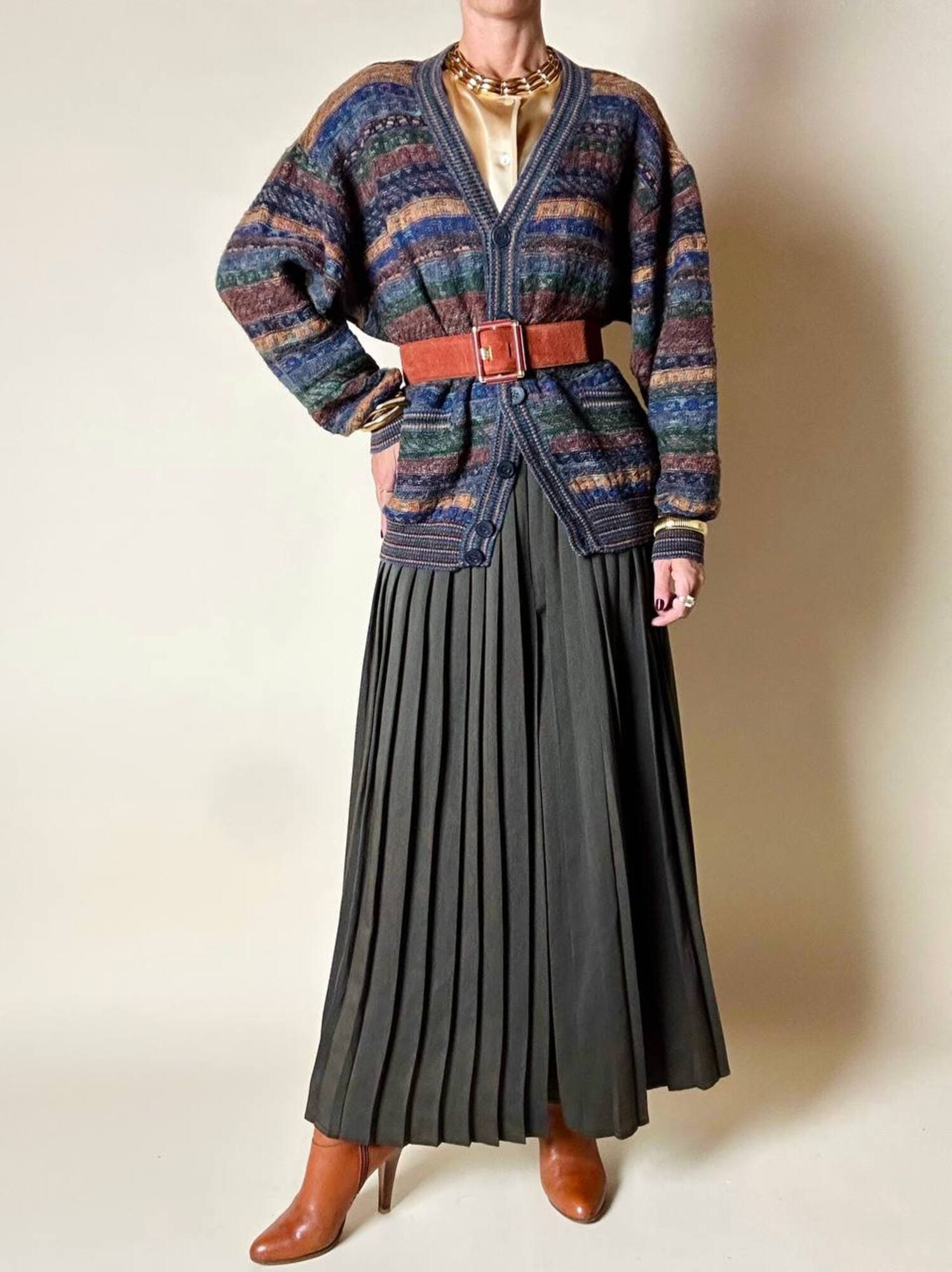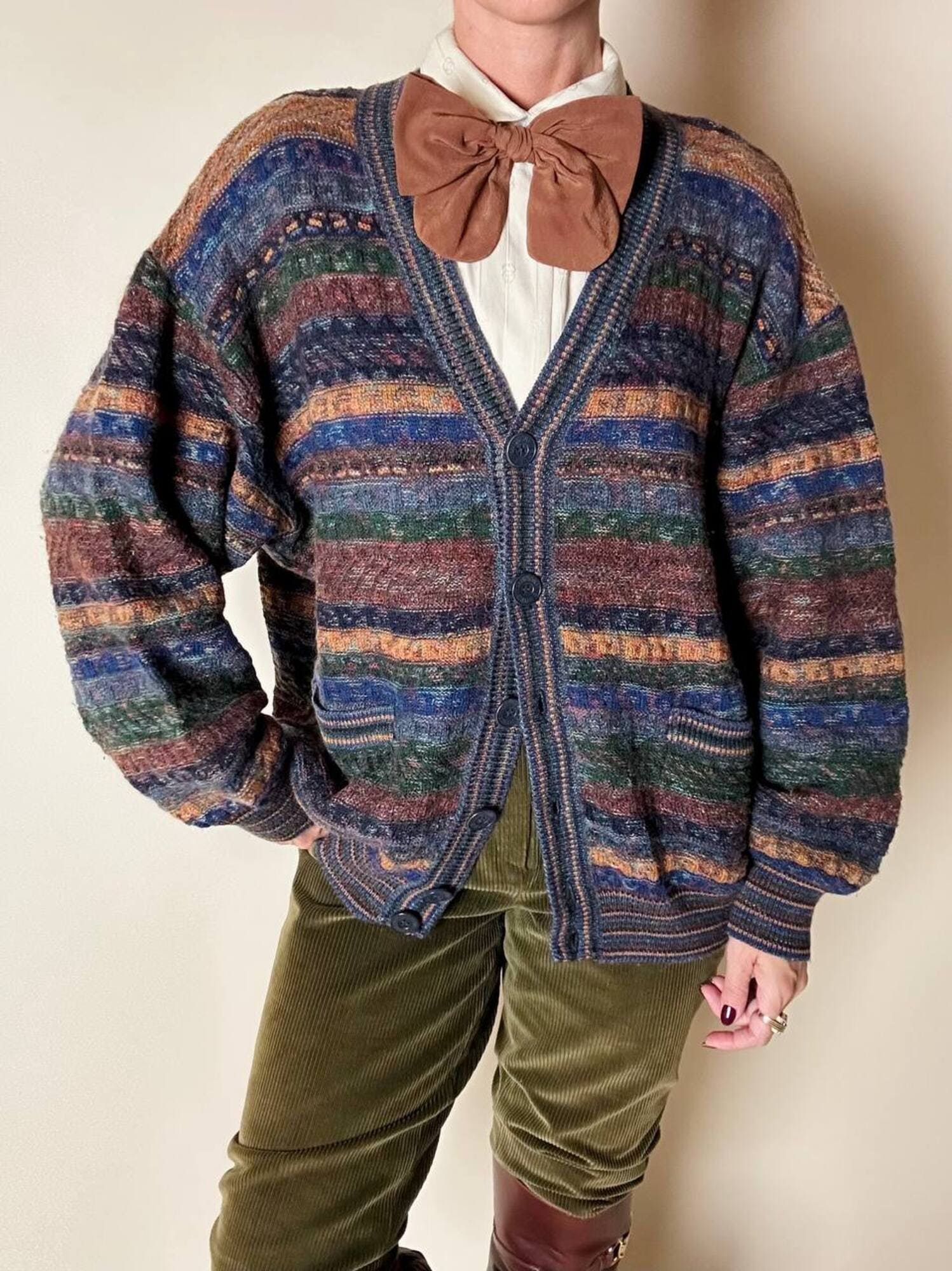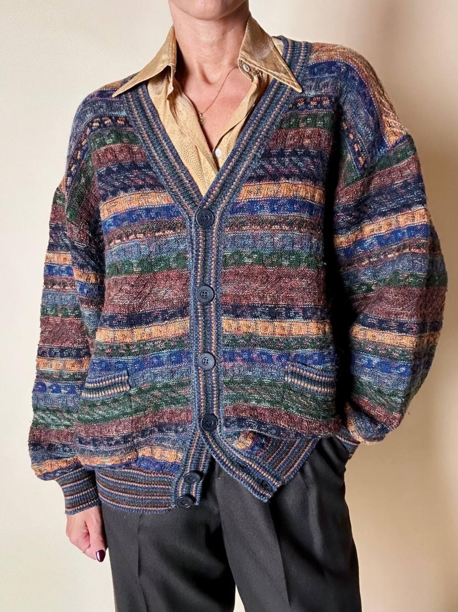 Cardigan vintage Missoni Sport in lana operata a righe orizzontali, un pezzo autentico del design italiano che unisce artigianalità raffinata e fascino senza tempo. La palette – un intreccio profondo di blu, verde bosco, marrone e beige – crea un ritmo cromatico ricco e sofisticato, tipico del linguaggio estetico della maison. La vestibilità morbida e il modello classico valorizzano la silhouette con naturale eleganza, mentre i profili a coste sottili e i bottoni blu con firma incisa aggiungono una nota di pregio e riconoscibilità. Perfetto per chi cerca un capo heritage capace di comunicare stile, autenticità e cultura del knitwear italiano, questo cardigan rappresenta una scelta ideale per arricchire il proprio guardaroba con un capo iconico. Dotato di bottone di scorta cucito nell’etichetta di composizione interna.