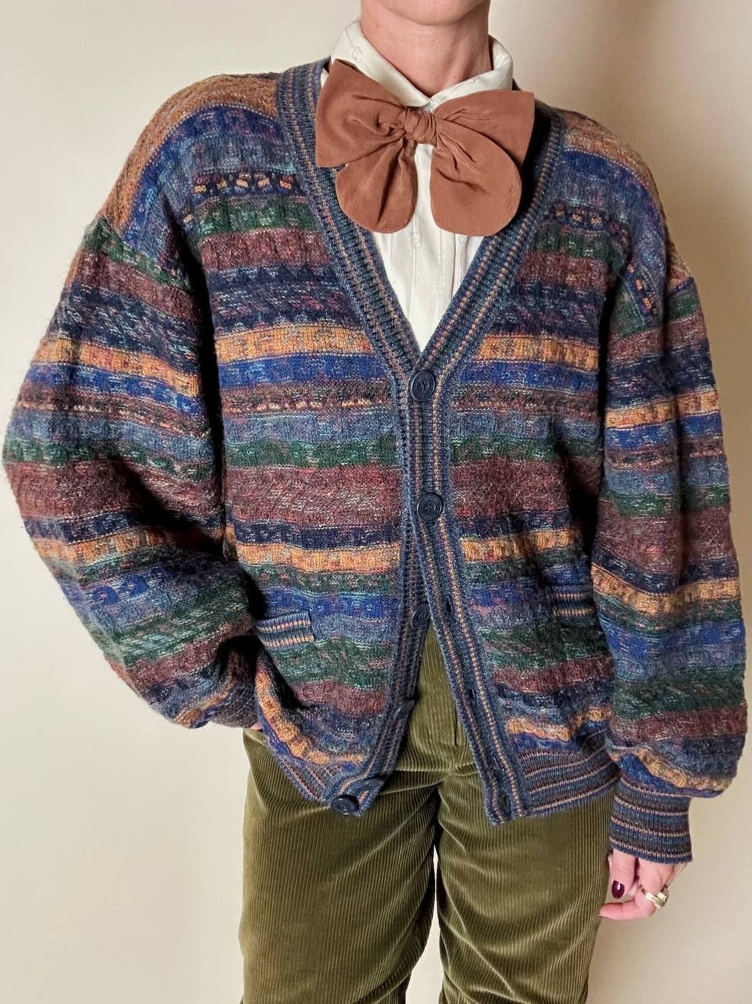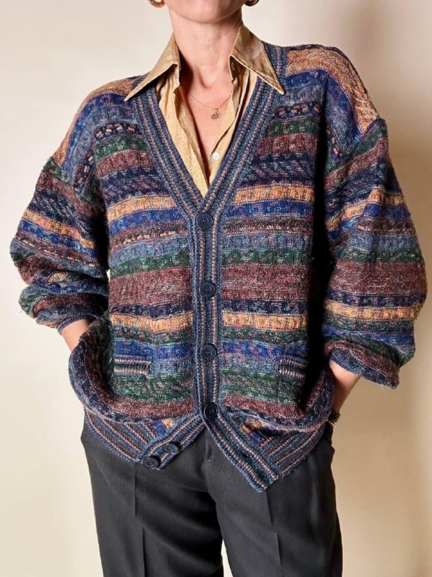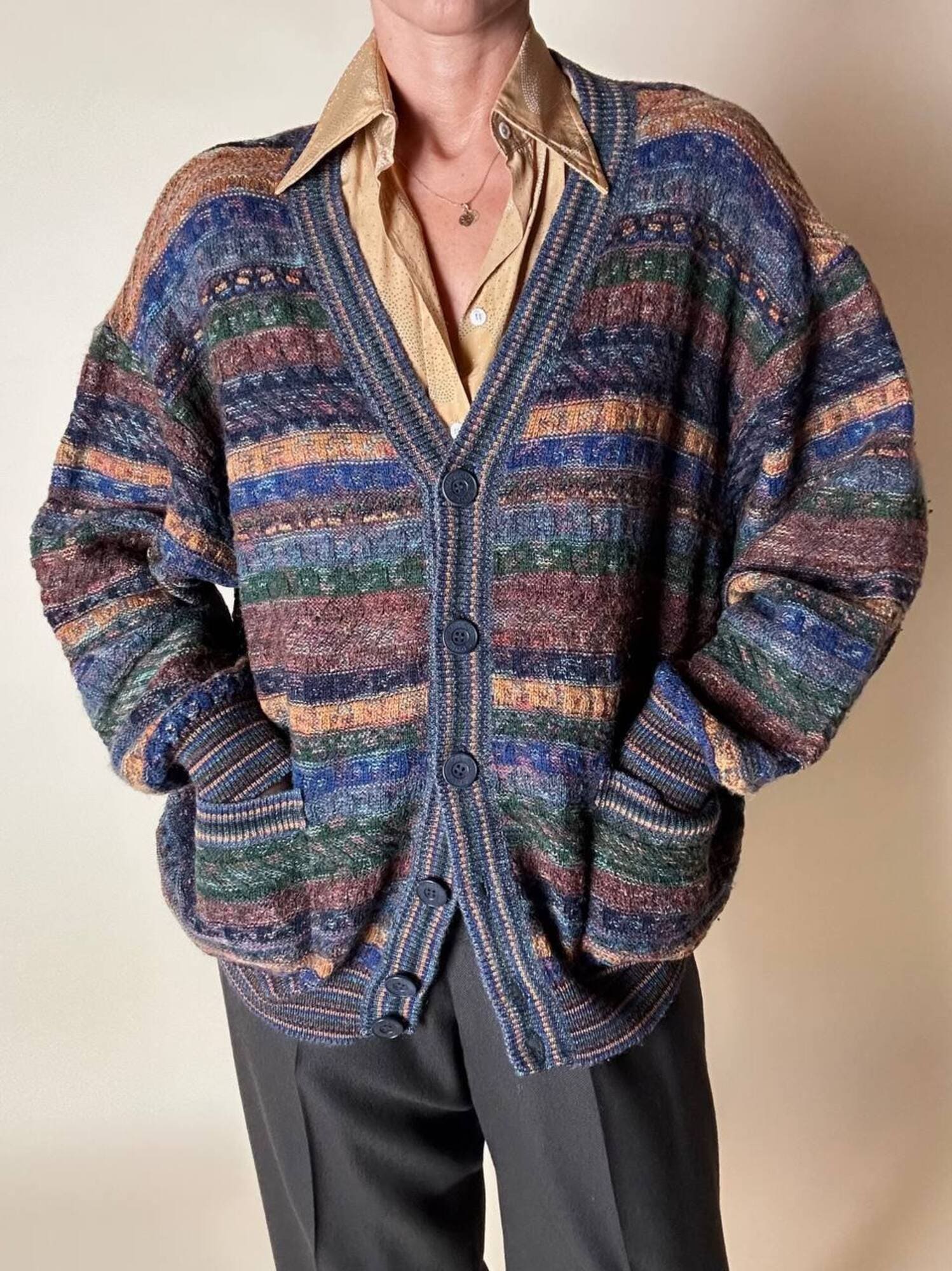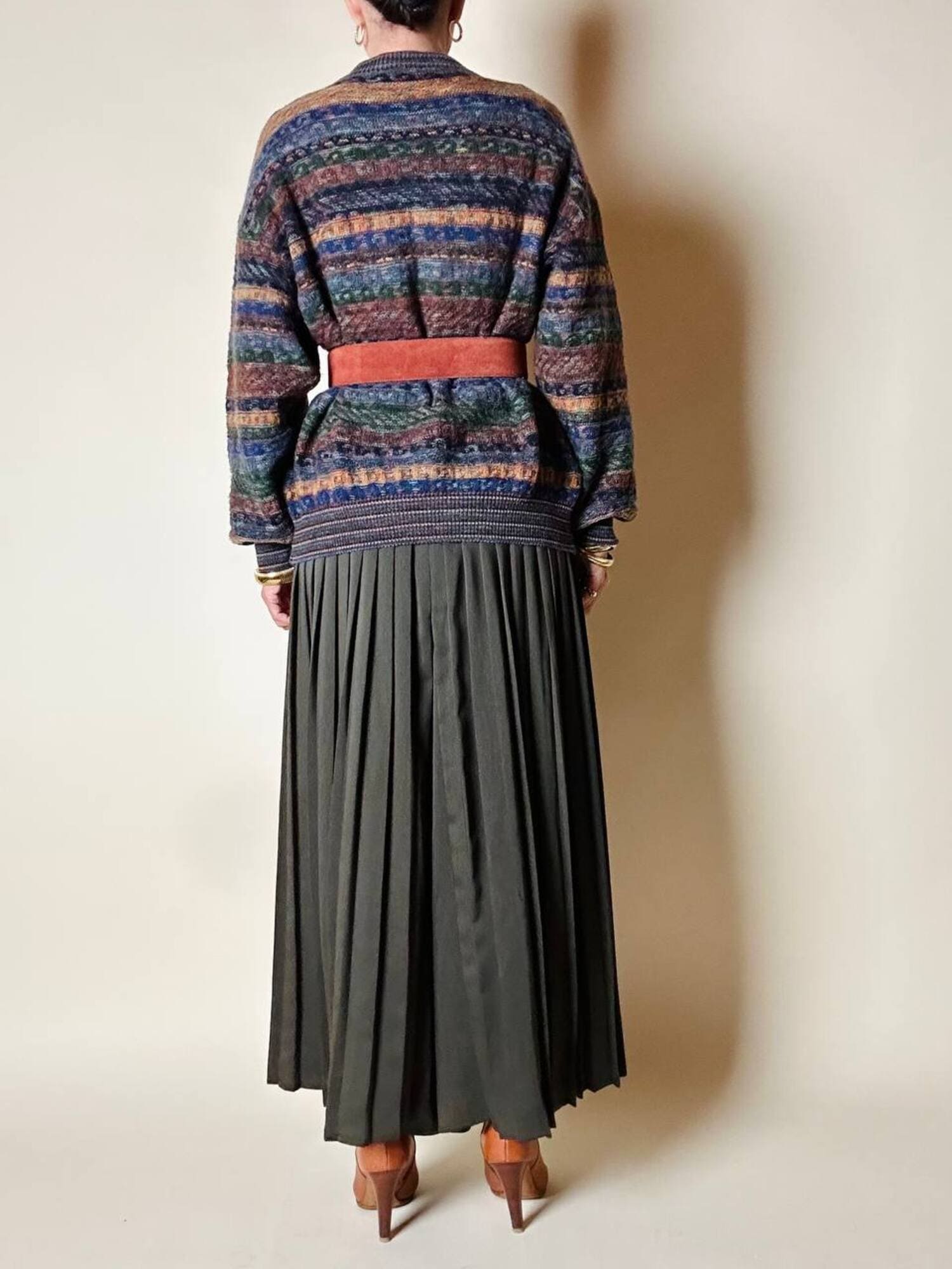 Cardigan vintage Missoni Sport in lana operata a righe orizzontali, un pezzo autentico del design italiano che unisce artigianalità raffinata e fascino senza tempo. La palette – un intreccio profondo di blu, verde bosco, marrone e beige – crea un ritmo cromatico ricco e sofisticato, tipico del linguaggio estetico della maison. La vestibilità morbida e il modello classico valorizzano la silhouette con naturale eleganza, mentre i profili a coste sottili e i bottoni blu con firma incisa aggiungono una nota di pregio e riconoscibilità. Perfetto per chi cerca un capo heritage capace di comunicare stile, autenticità e cultura del knitwear italiano, questo cardigan rappresenta una scelta ideale per arricchire il proprio guardaroba con un capo iconico. Dotato di bottone di scorta cucito nell’etichetta di composizione interna.