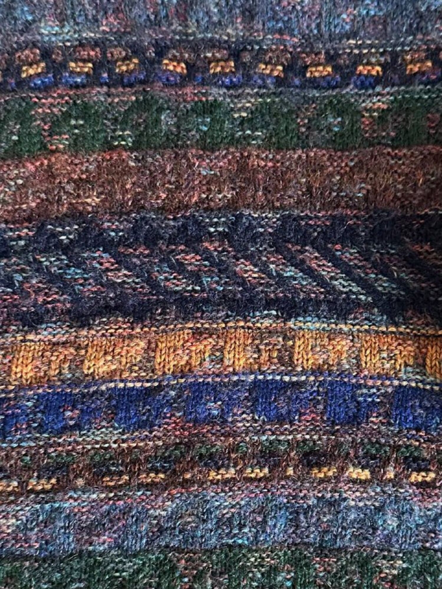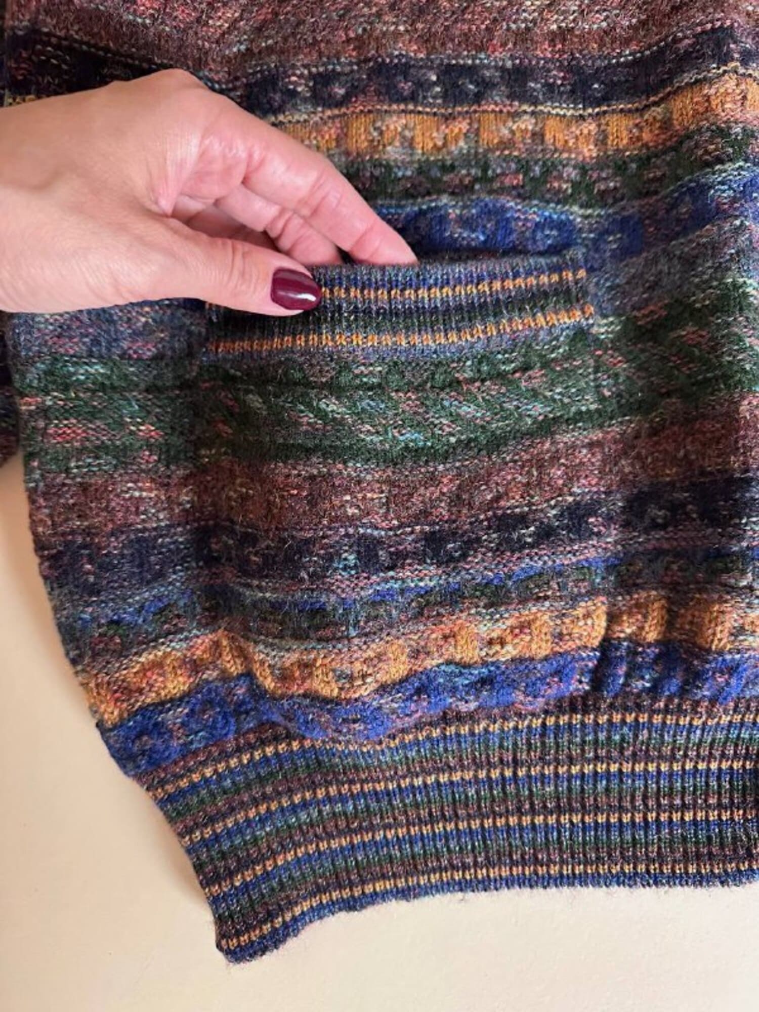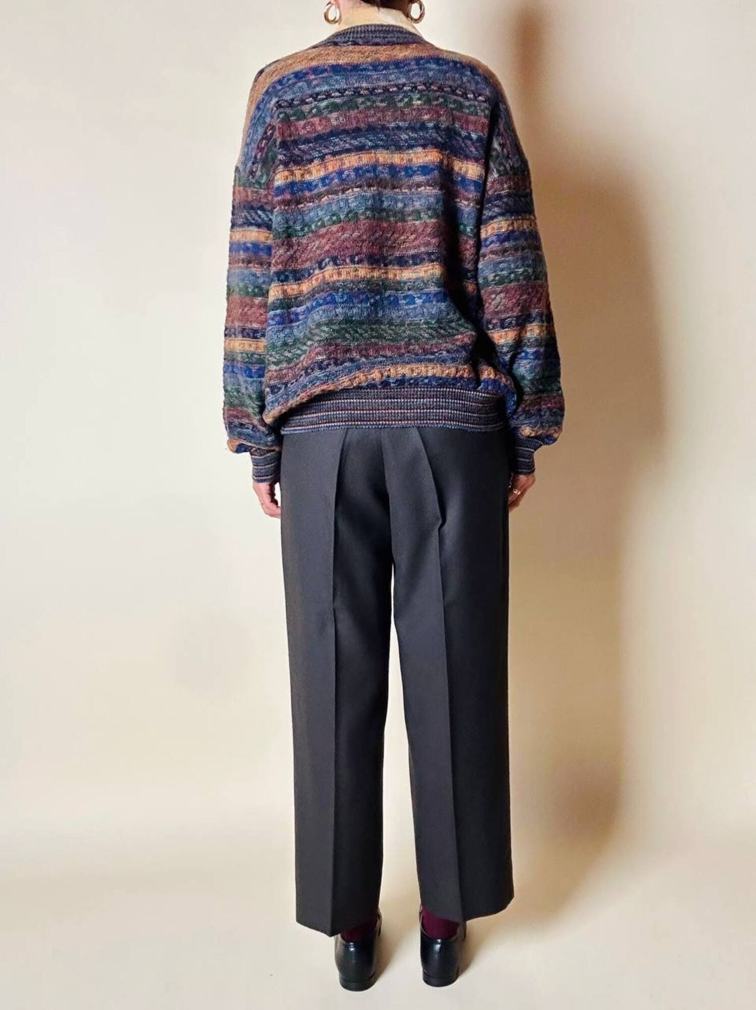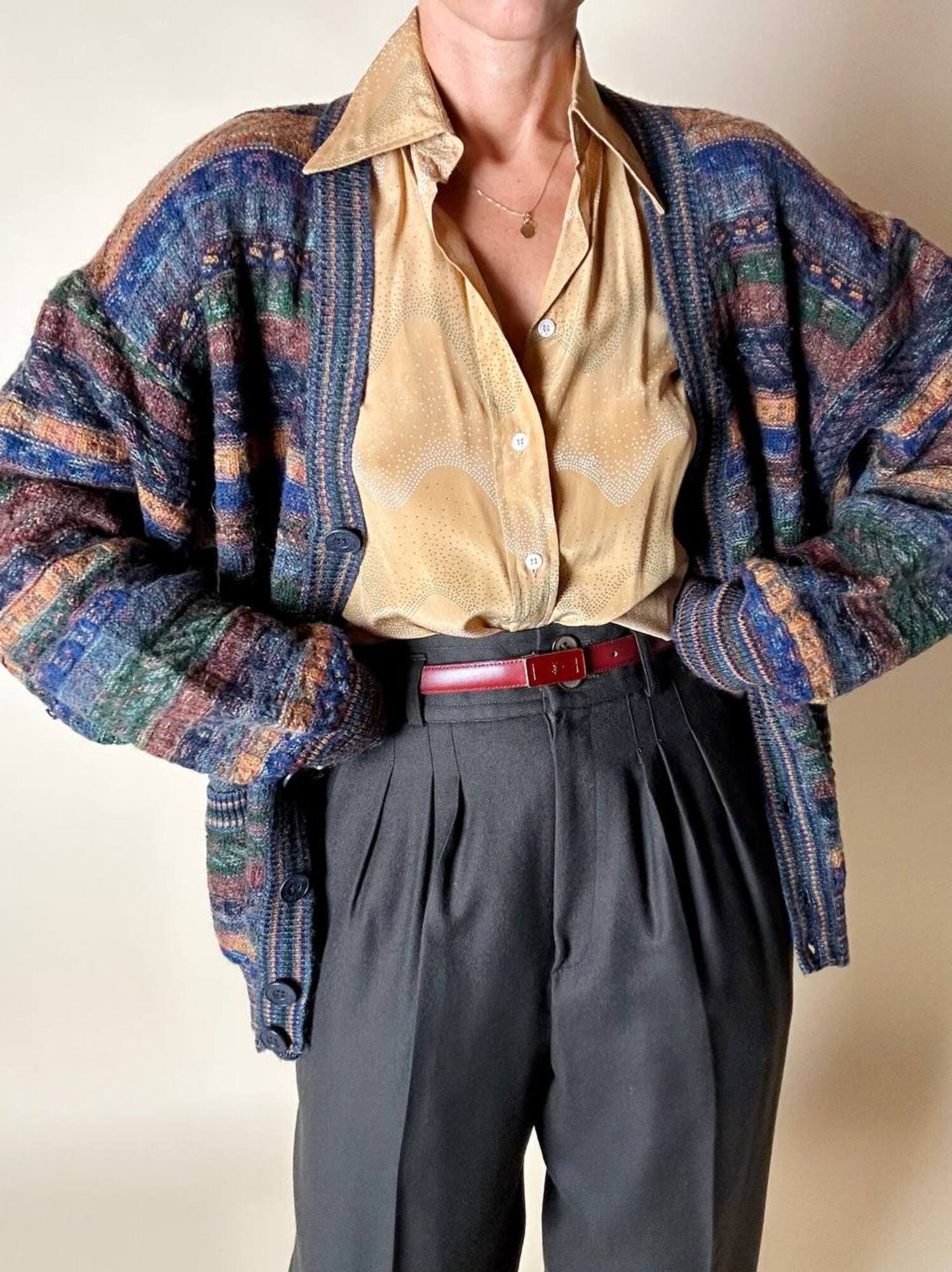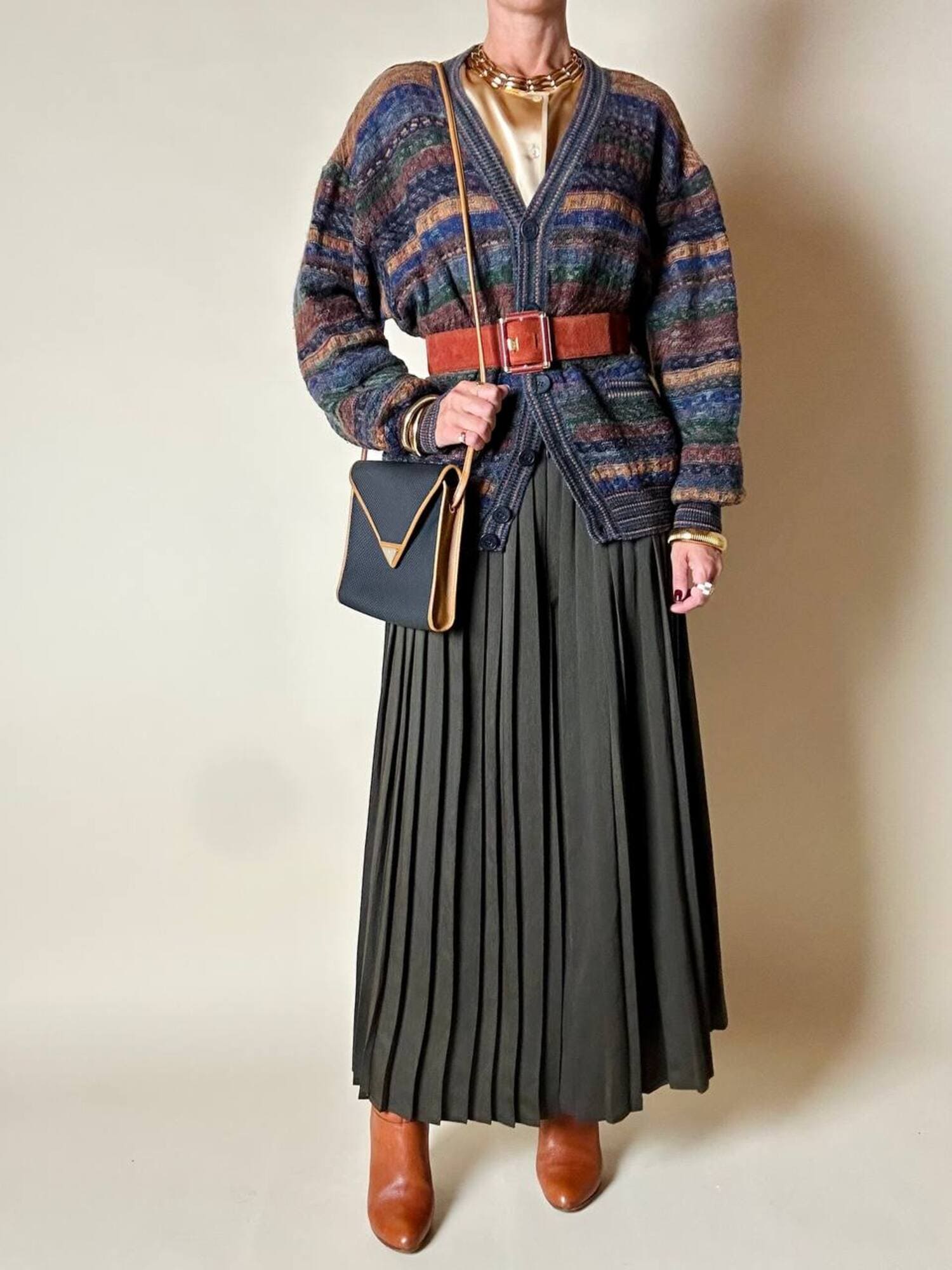 Cardigan vintage Missoni Sport in lana operata a righe orizzontali, un pezzo autentico del design italiano che unisce artigianalità raffinata e fascino senza tempo. La palette – un intreccio profondo di blu, verde bosco, marrone e beige – crea un ritmo cromatico ricco e sofisticato, tipico del linguaggio estetico della maison. La vestibilità morbida e il modello classico valorizzano la silhouette con naturale eleganza, mentre i profili a coste sottili e i bottoni blu con firma incisa aggiungono una nota di pregio e riconoscibilità. Perfetto per chi cerca un capo heritage capace di comunicare stile, autenticità e cultura del knitwear italiano, questo cardigan rappresenta una scelta ideale per arricchire il proprio guardaroba con un capo iconico. Dotato di bottone di scorta cucito nell’etichetta di composizione interna.