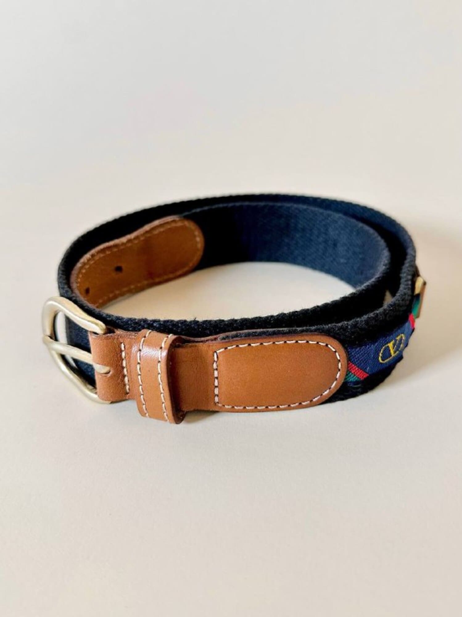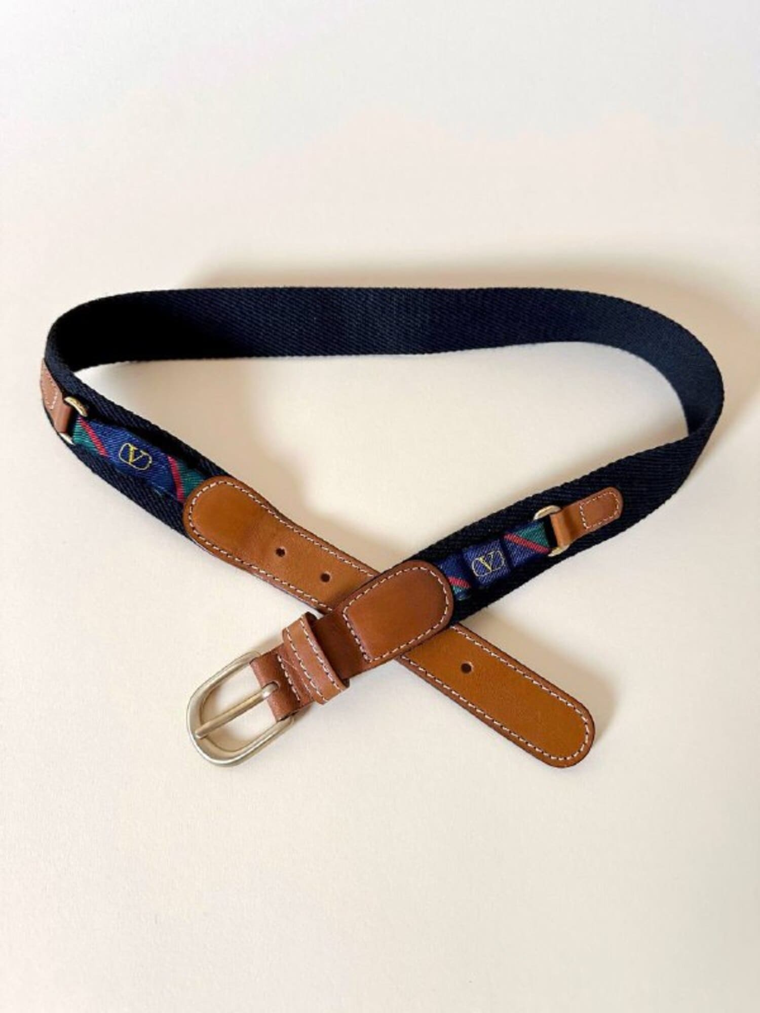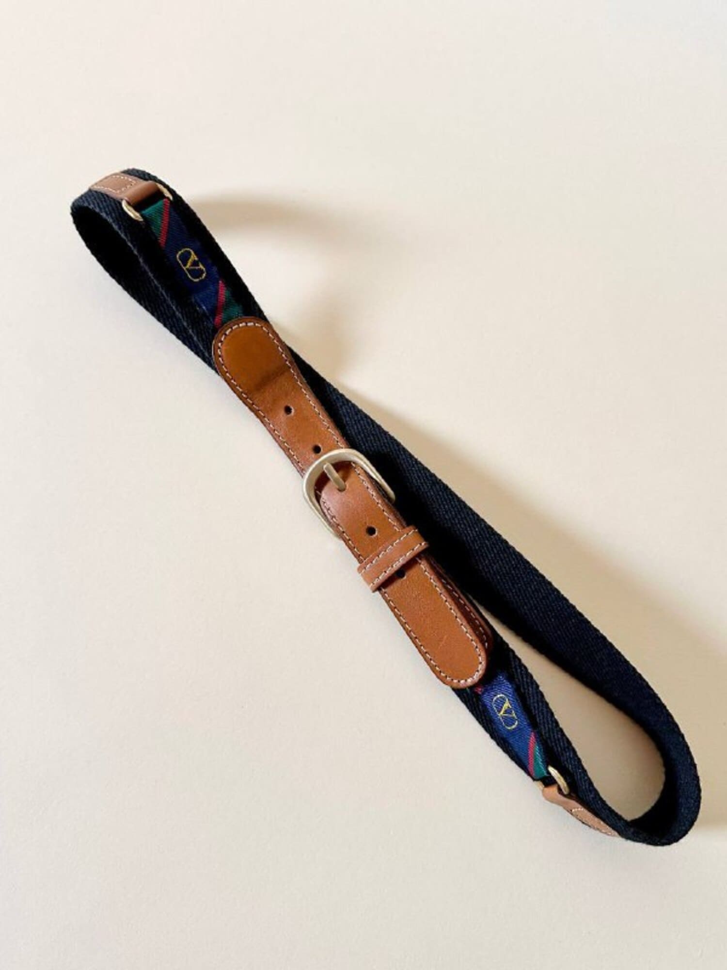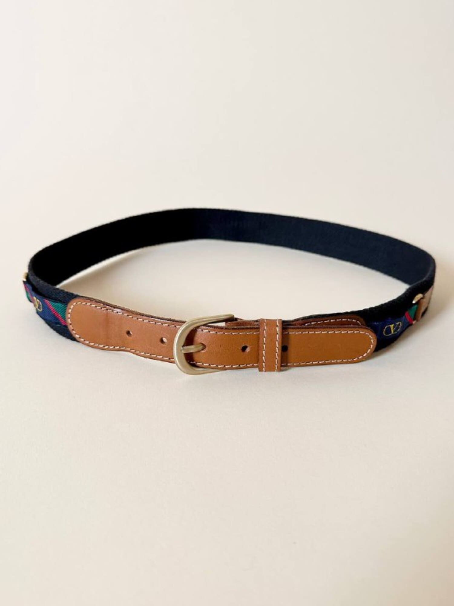 Cintura vintage Valentino Garavani realizzata in pelle color cuoio e tessuto nero, un accessorio iconico che unisce eleganza italiana e dettagli distintivi d’archivio. La fibbia ad ardiglione in metallo oro satinato aggiunge un tocco raffinato e senza tempo, perfettamente in armonia con le finiture in pelle a taglio vivo e cuciture a contrasto. Il design è impreziosito da inserti laterali decorati con la storica “V” di Valentino su fasce fantasia regimental a strisce rosse, verdi e blu, un dettaglio emblematico dello stile heritage della maison. Un pezzo d’archivio dal fascino intramontabile, perfetto per aggiungere un tocco di lusso discreto a qualsiasi look.
