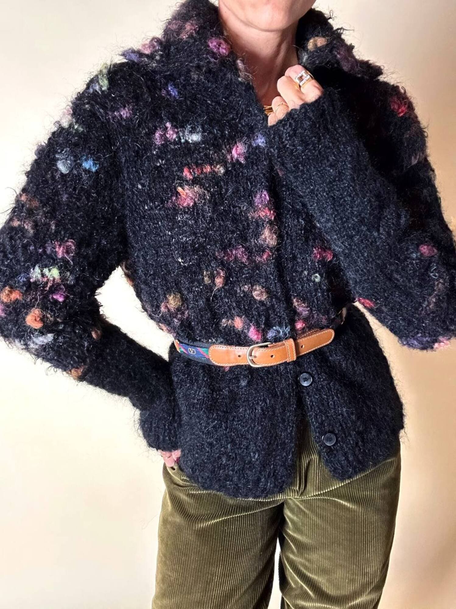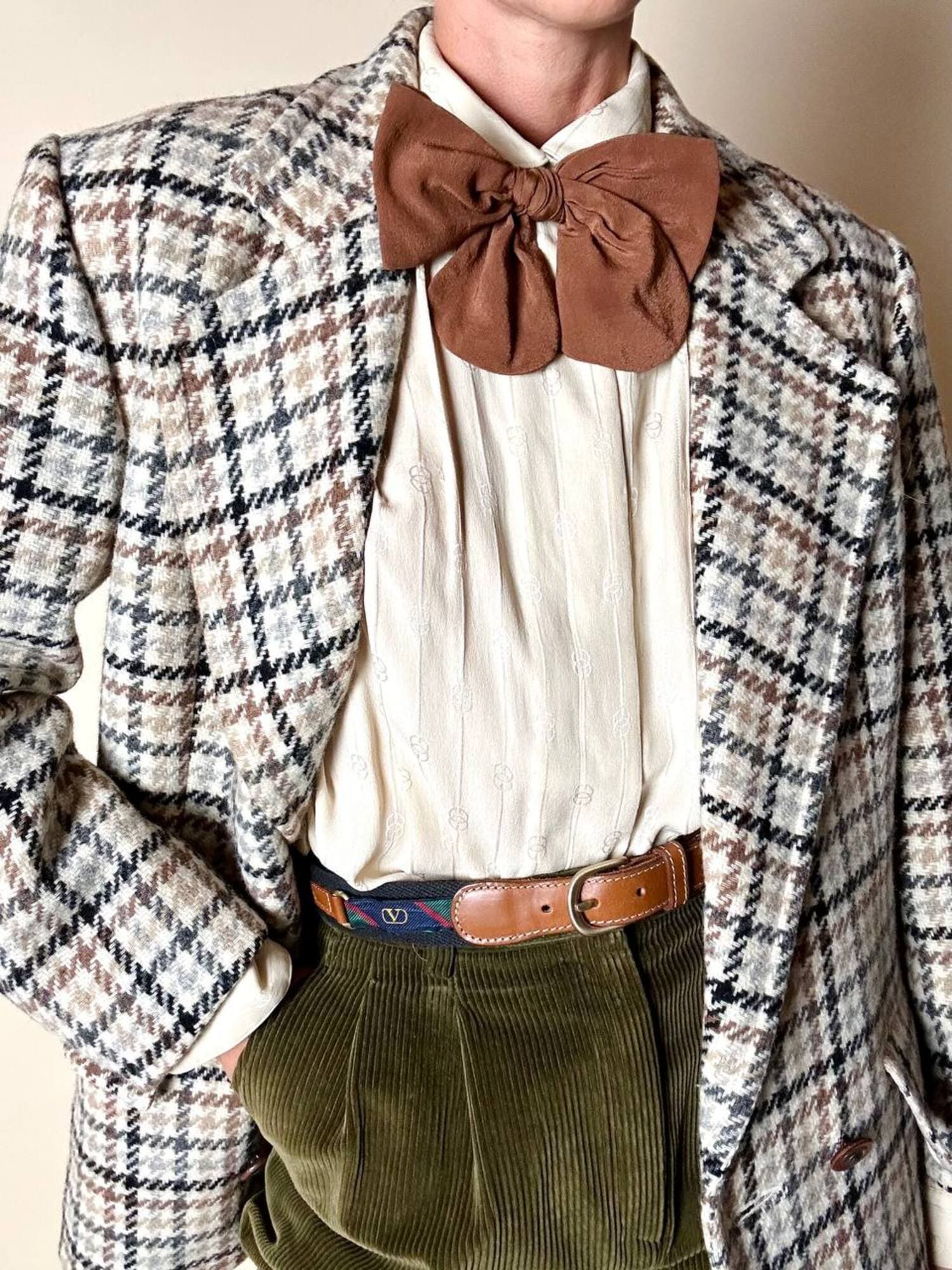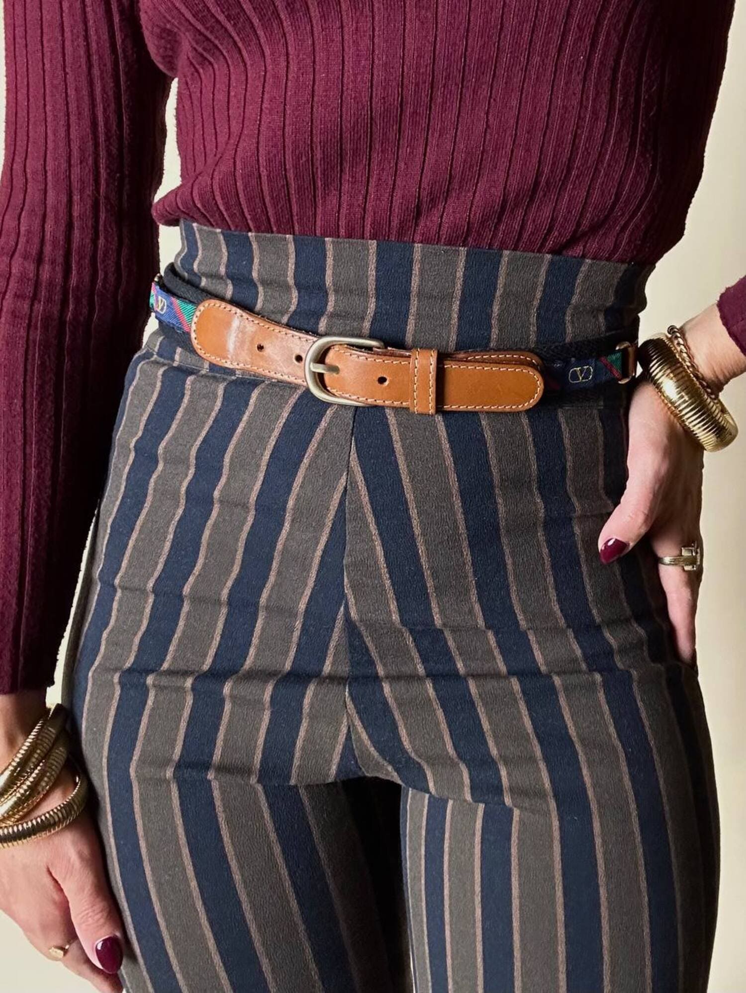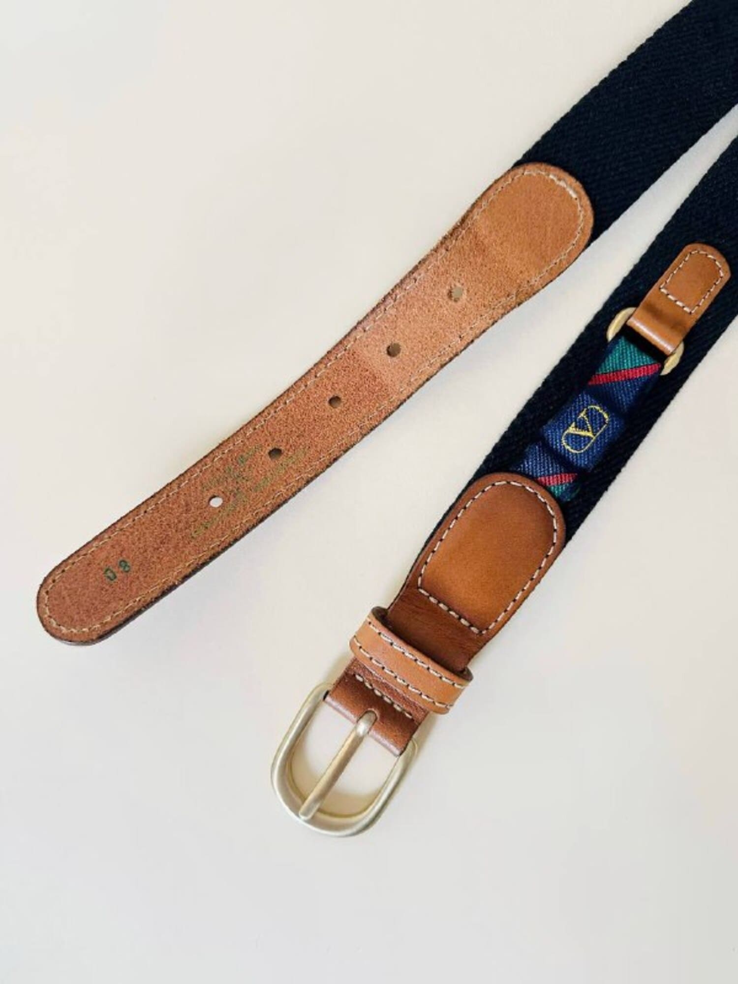 Cintura vintage Valentino Garavani realizzata in pelle color cuoio e tessuto nero, un accessorio iconico che unisce eleganza italiana e dettagli distintivi d’archivio. La fibbia ad ardiglione in metallo oro satinato aggiunge un tocco raffinato e senza tempo, perfettamente in armonia con le finiture in pelle a taglio vivo e cuciture a contrasto. Il design è impreziosito da inserti laterali decorati con la storica “V” di Valentino su fasce fantasia regimental a strisce rosse, verdi e blu, un dettaglio emblematico dello stile heritage della maison. Un pezzo d’archivio dal fascino intramontabile, perfetto per aggiungere un tocco di lusso discreto a qualsiasi look.
