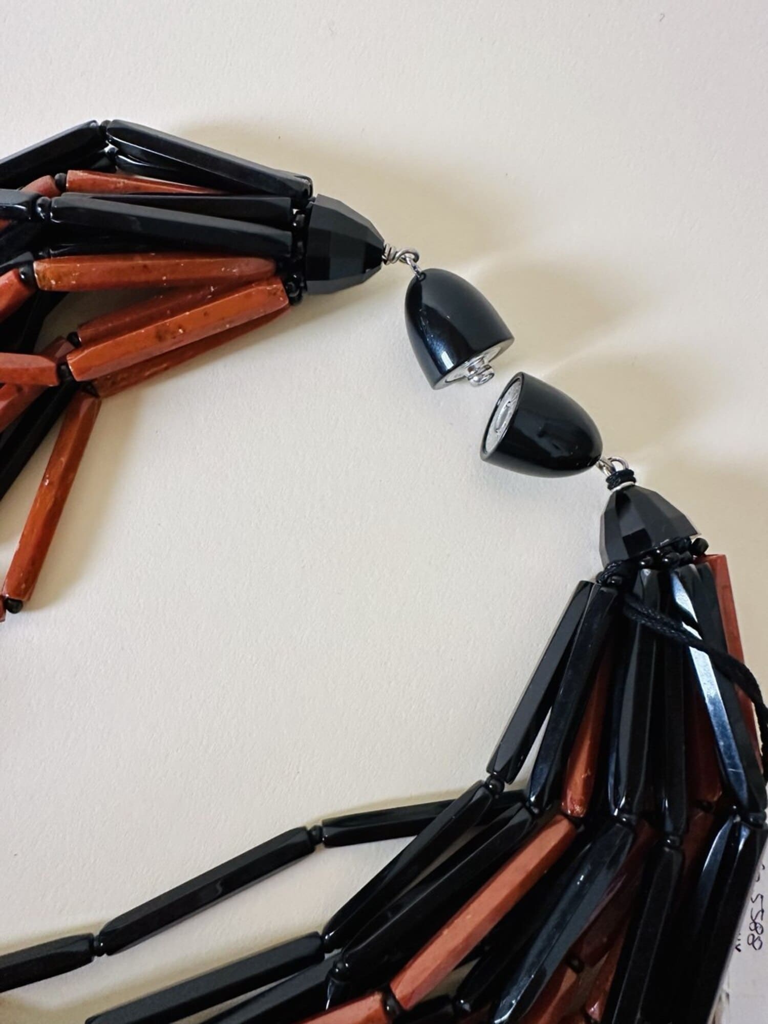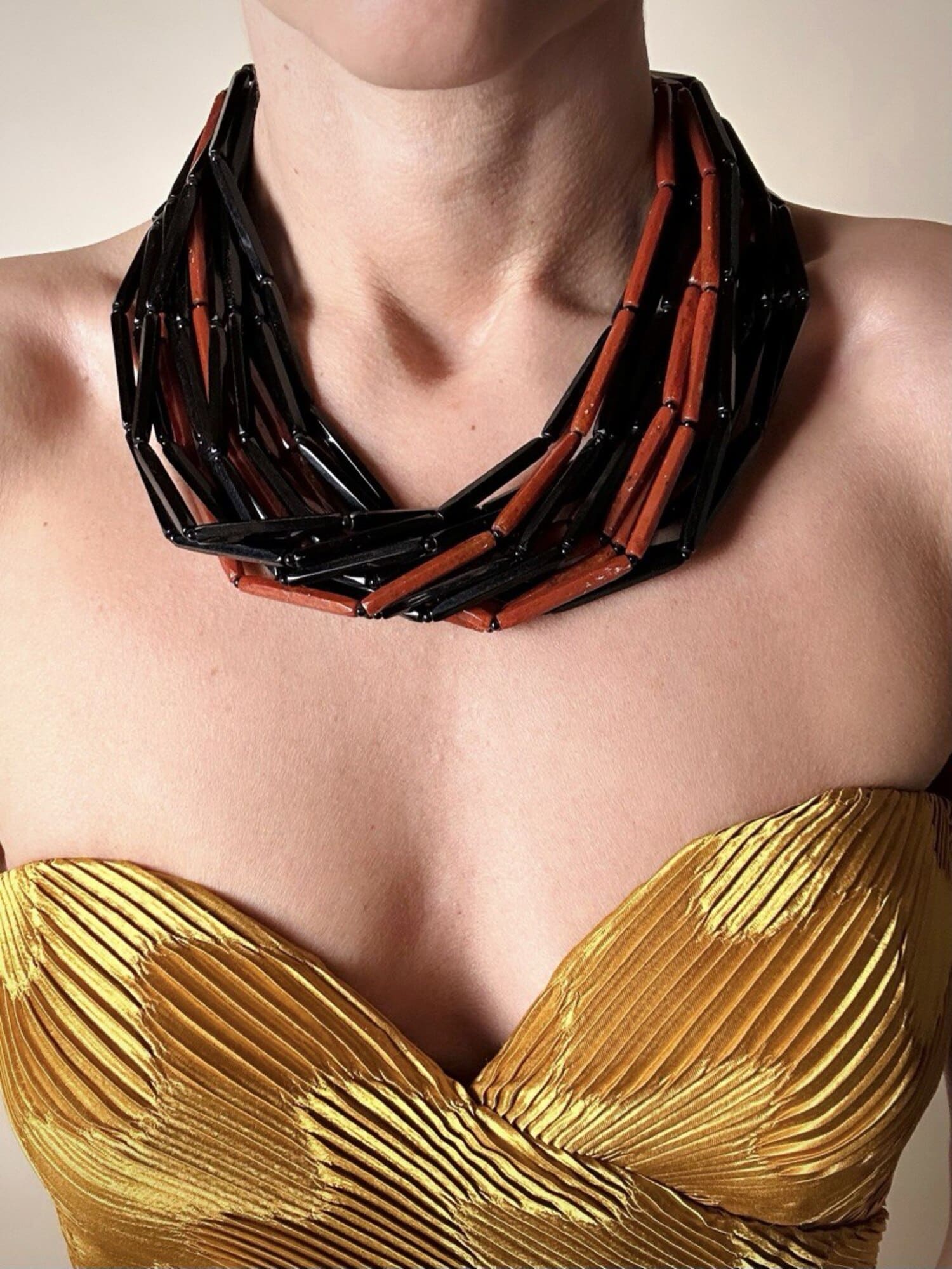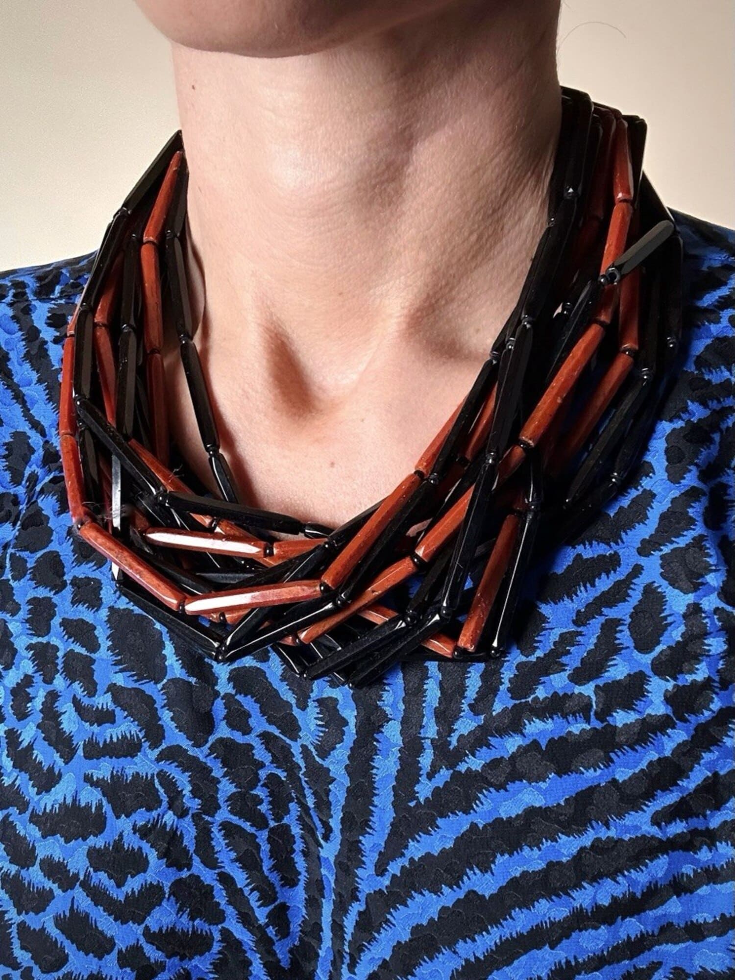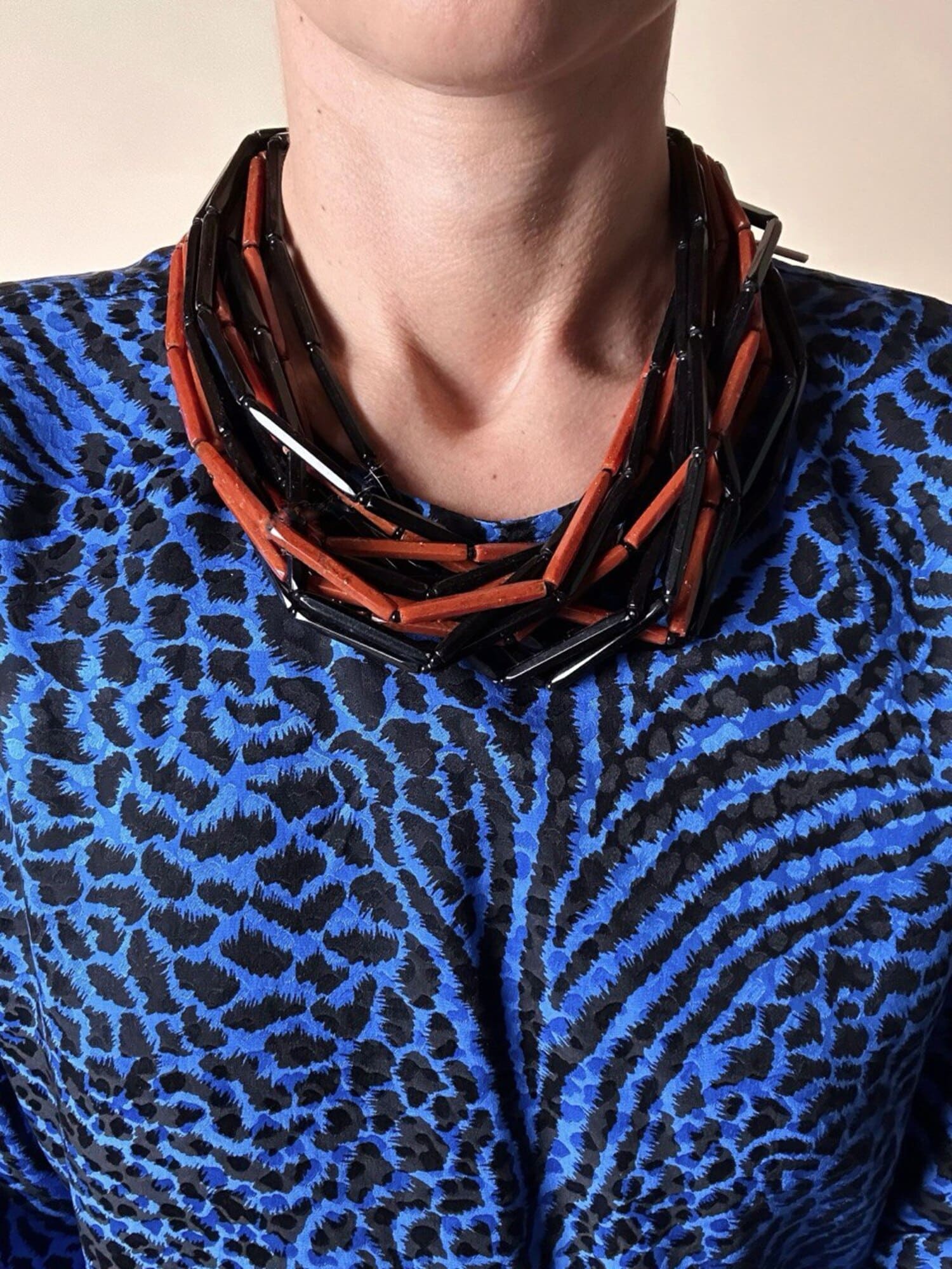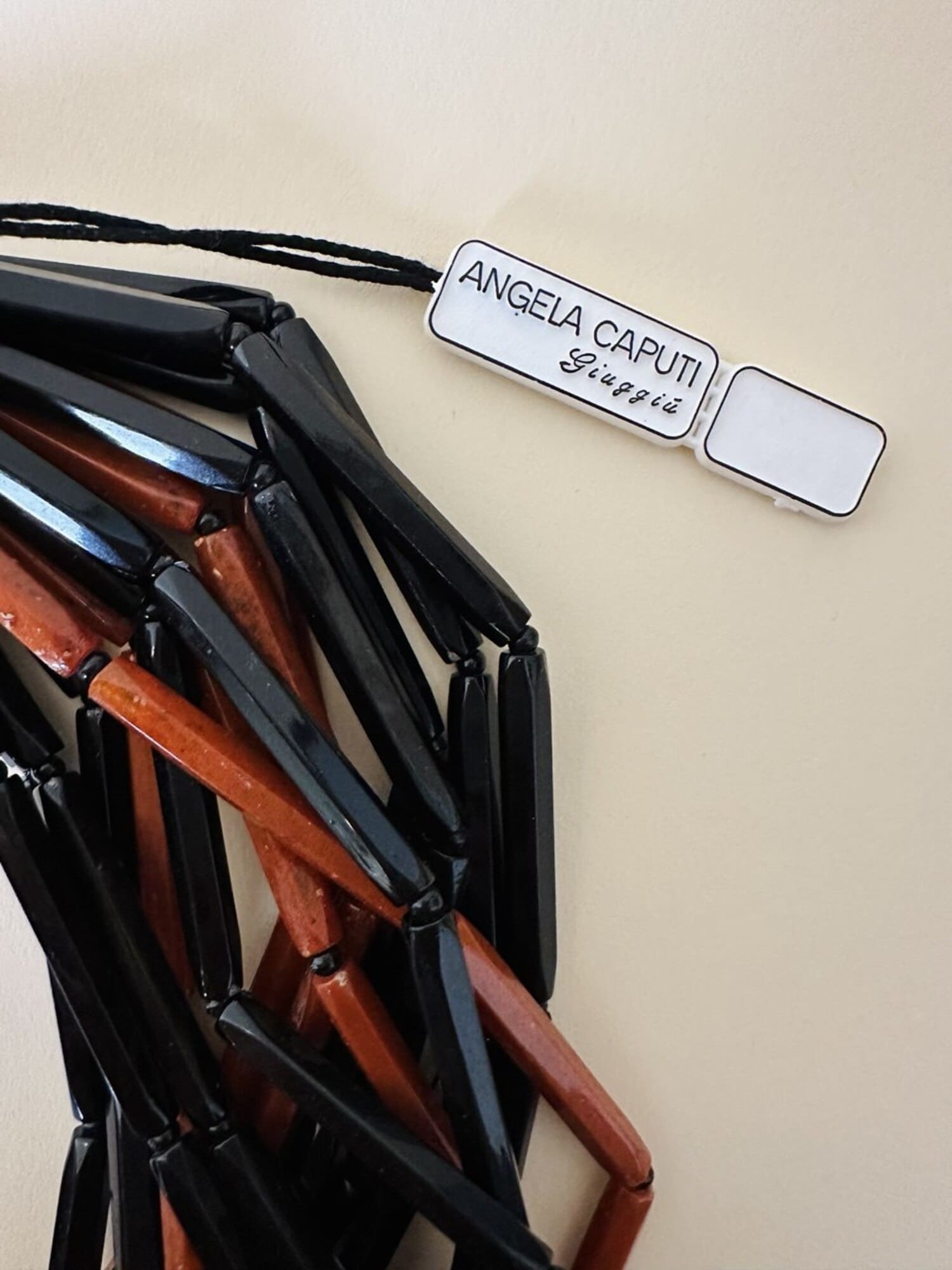 Questa scultorea e scenografica collana firmata Angela Caputi Giuggiù rappresenta appieno il linguaggio creativo di una delle maison di bijoux più riconoscibili del panorama italiano. Un pezzo di design che unisce arte, moda e sperimentazione materica. La collana è realizzata in lucite ed è composta da un intreccio multifilo di perline tubolari sfaccettate nei toni del nero e del corallo / rosso bruciato, una palette cromatica intensa e sofisticata che crea profondità e movimento. Il gioco di volumi e riflessi rende il gioiello estremamente scenografico. La chiusura a uovo con bottone a pressione centrale a scomparsa è un dettaglio iconico della maison, e completa il design con un tocco distintivo e funzionale. Ogni elemento è pensato per garantire equilibrio tra estetica e comfort. Fondata a Firenze nel 1975, l’azienda Angela Caputi Giuggiù è celebre per i suoi bijoux artigianali, ispirati al cinema, al teatro e all’arte, apprezzati per il carattere unico e riconoscibile, lontano dalle mode passeggere. Una collana vintage di grande personalità, perfetta per valorizzare look essenziali o per completare outfit sofisticati.