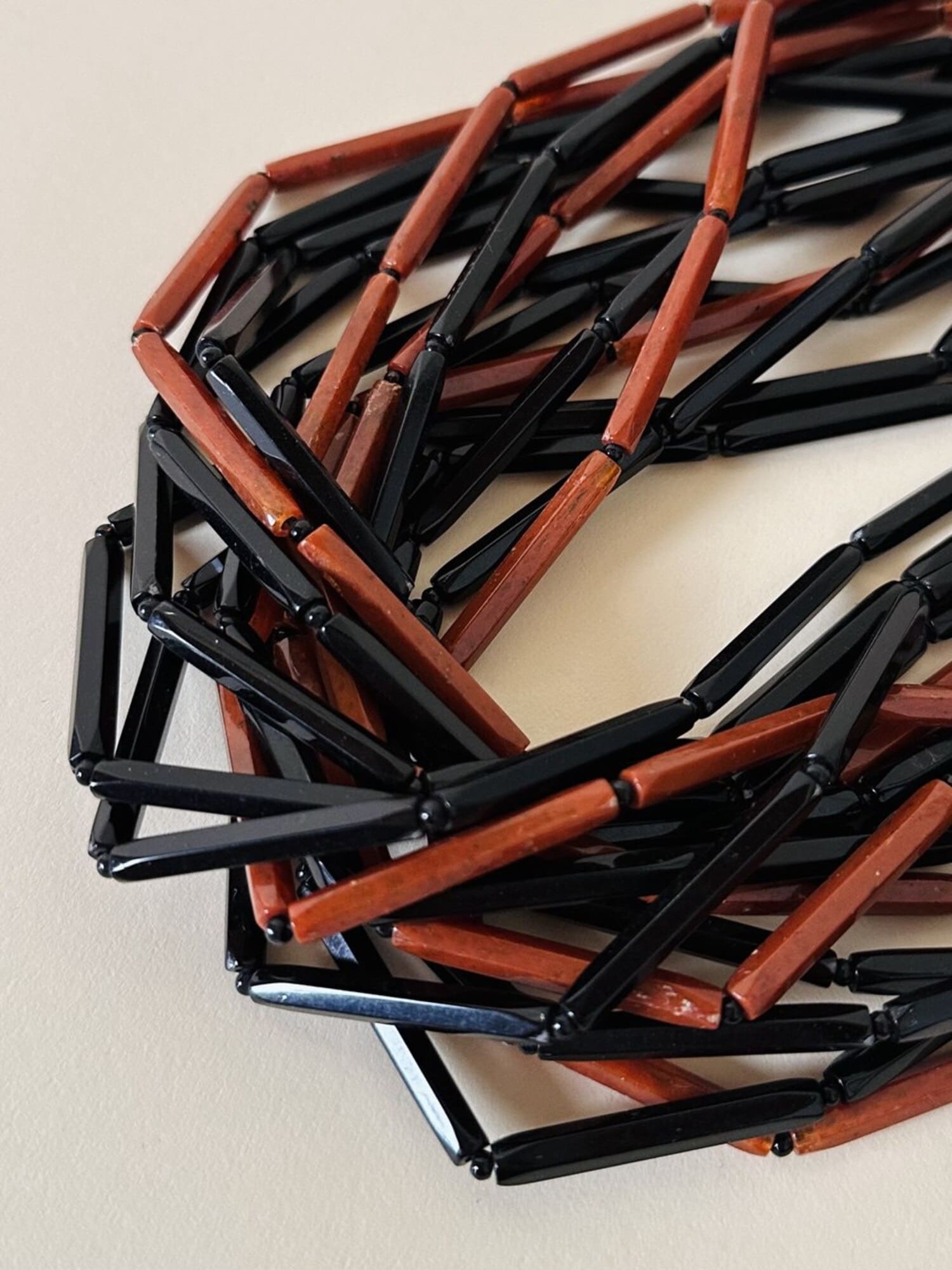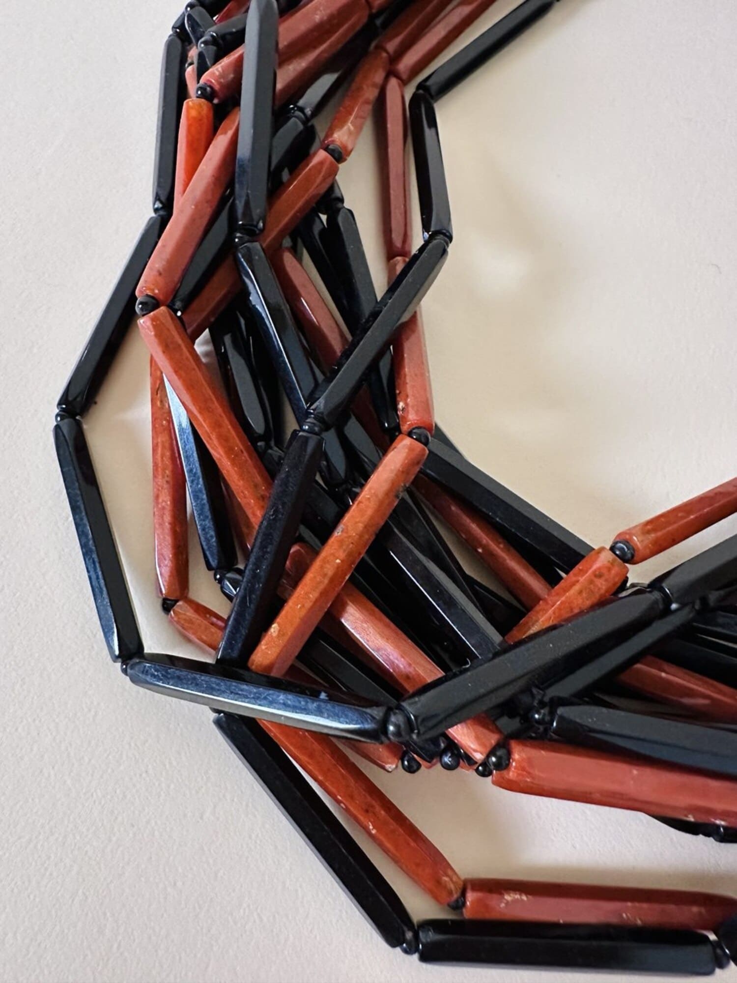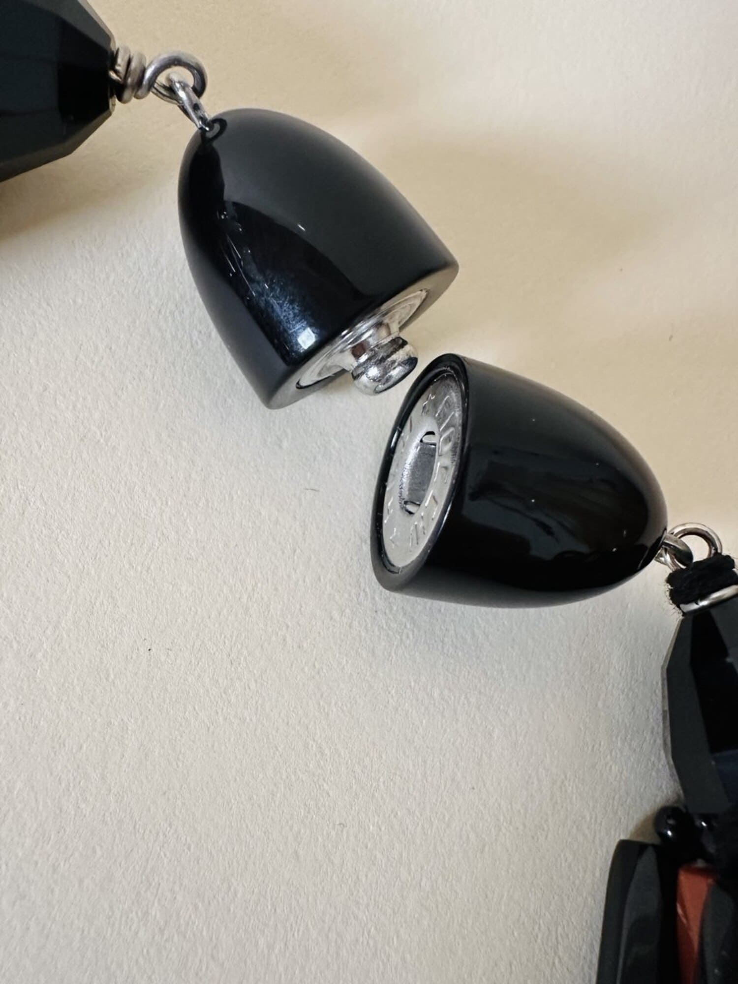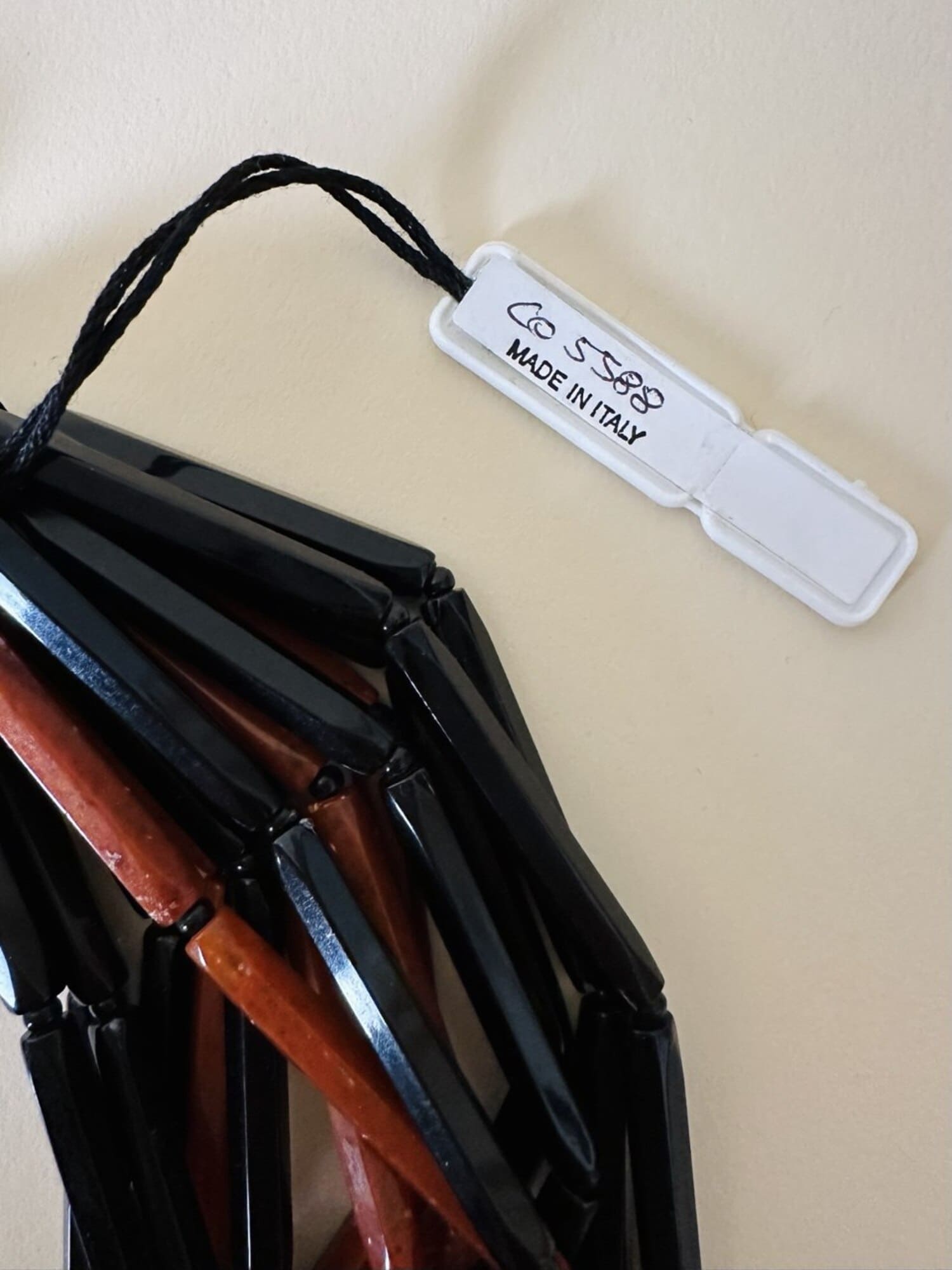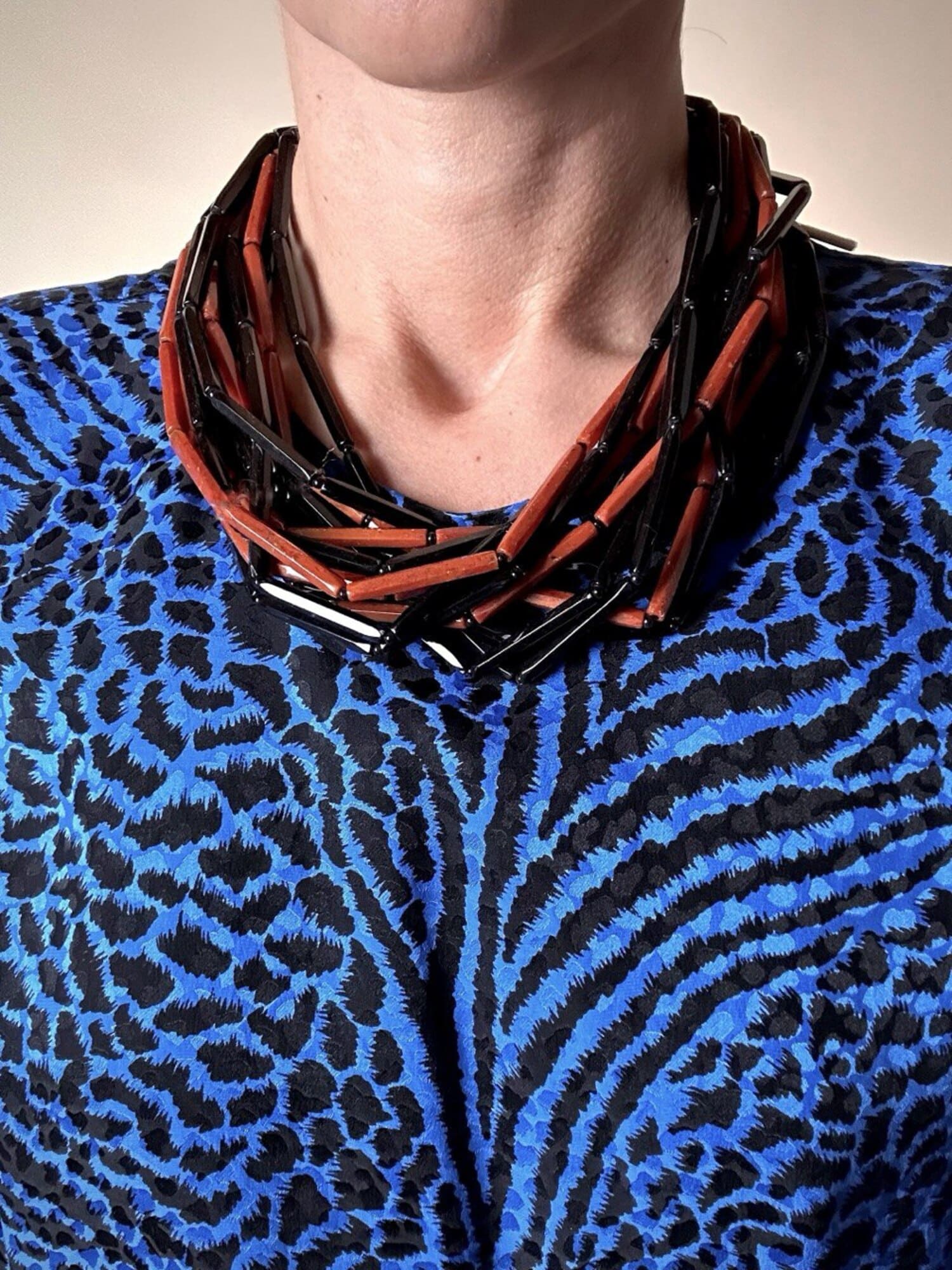 Questa scultorea e scenografica collana firmata Angela Caputi Giuggiù rappresenta appieno il linguaggio creativo di una delle maison di bijoux più riconoscibili del panorama italiano. Un pezzo di design che unisce arte, moda e sperimentazione materica. La collana è realizzata in lucite ed è composta da un intreccio multifilo di perline tubolari sfaccettate nei toni del nero e del corallo / rosso bruciato, una palette cromatica intensa e sofisticata che crea profondità e movimento. Il gioco di volumi e riflessi rende il gioiello estremamente scenografico. La chiusura a uovo con bottone a pressione centrale a scomparsa è un dettaglio iconico della maison, e completa il design con un tocco distintivo e funzionale. Ogni elemento è pensato per garantire equilibrio tra estetica e comfort. Fondata a Firenze nel 1975, l’azienda Angela Caputi Giuggiù è celebre per i suoi bijoux artigianali, ispirati al cinema, al teatro e all’arte, apprezzati per il carattere unico e riconoscibile, lontano dalle mode passeggere. Una collana vintage di grande personalità, perfetta per valorizzare look essenziali o per completare outfit sofisticati.