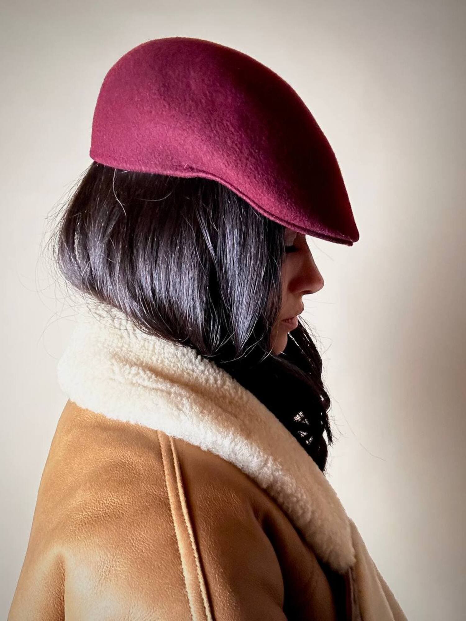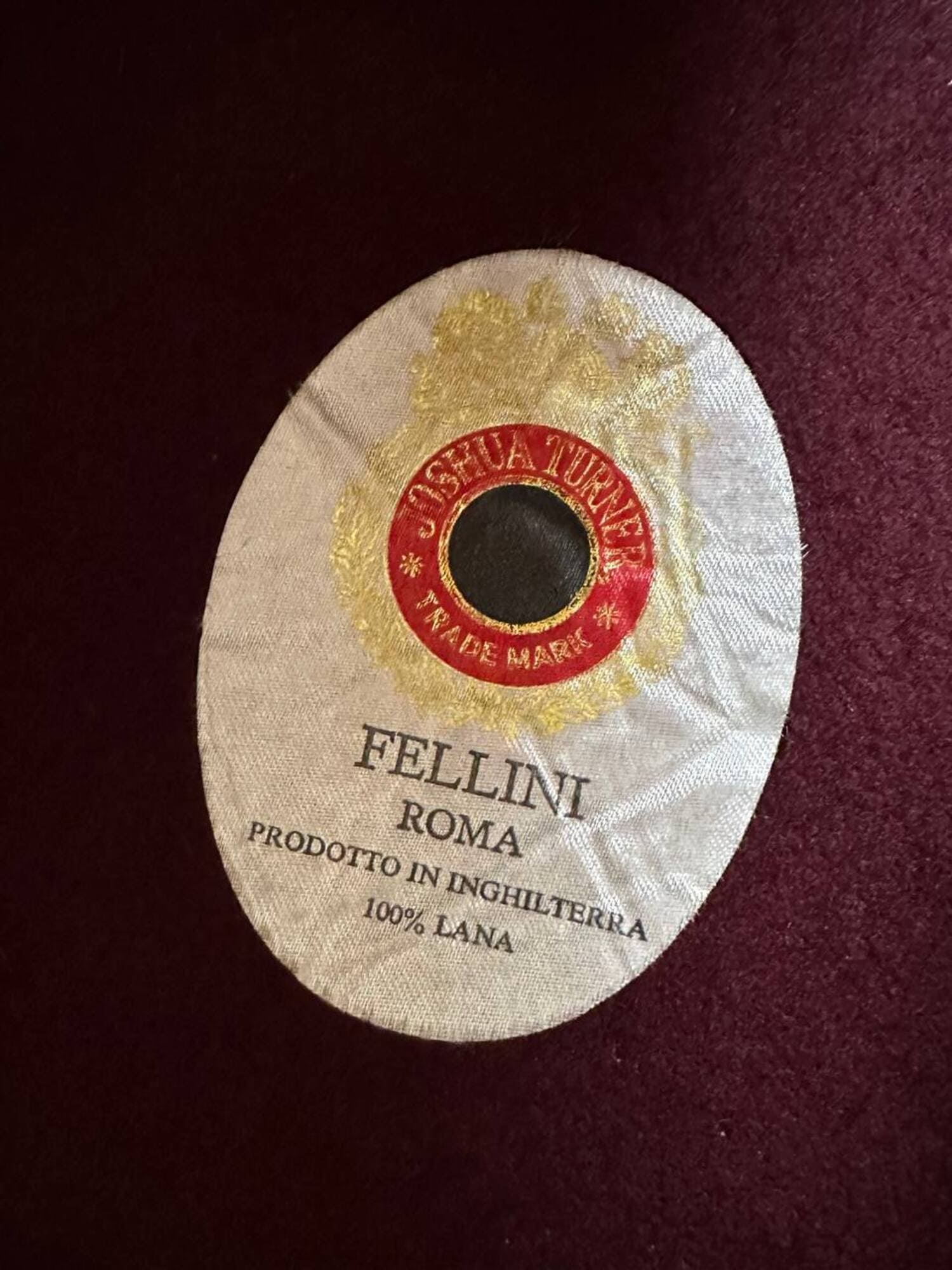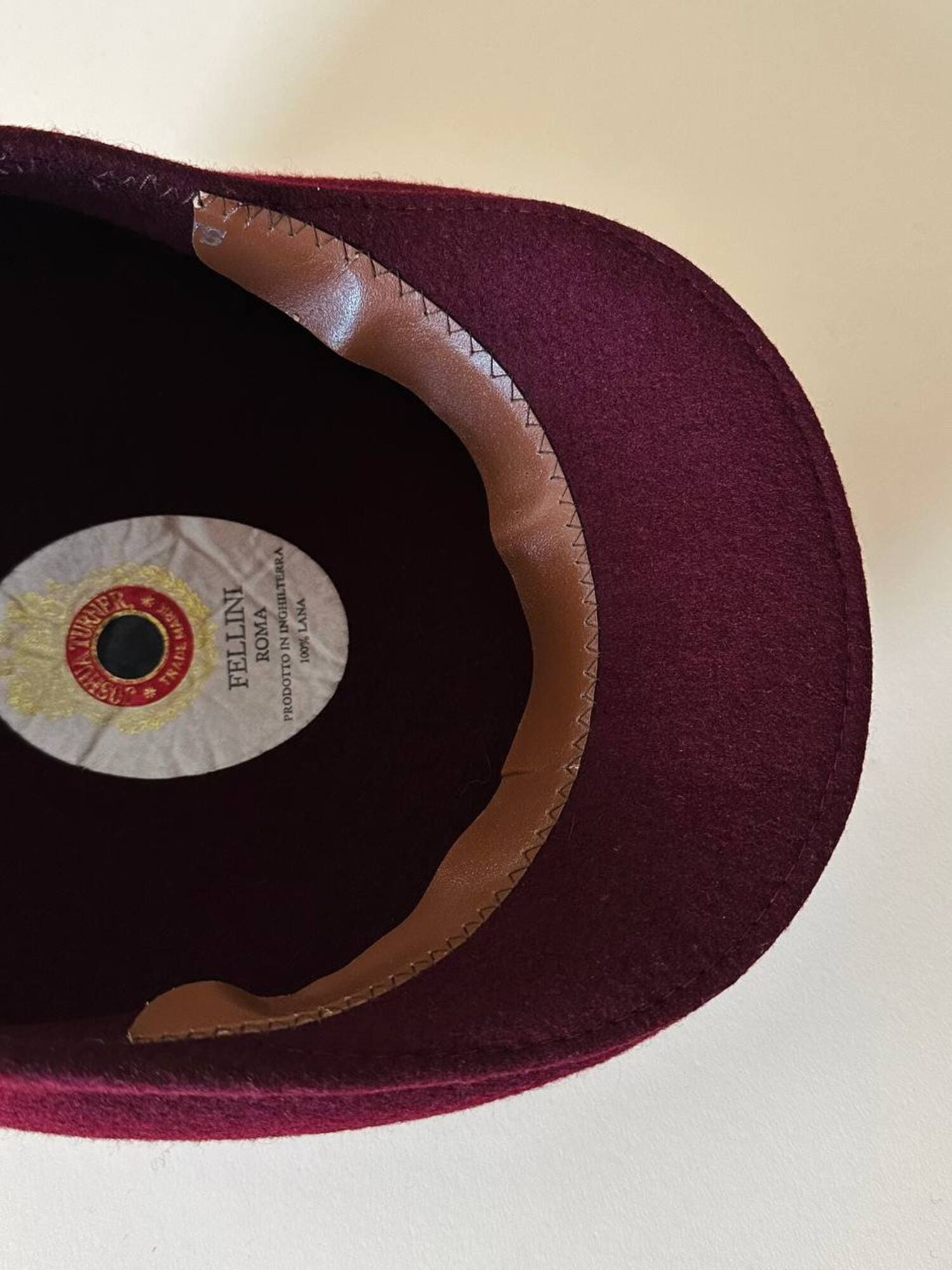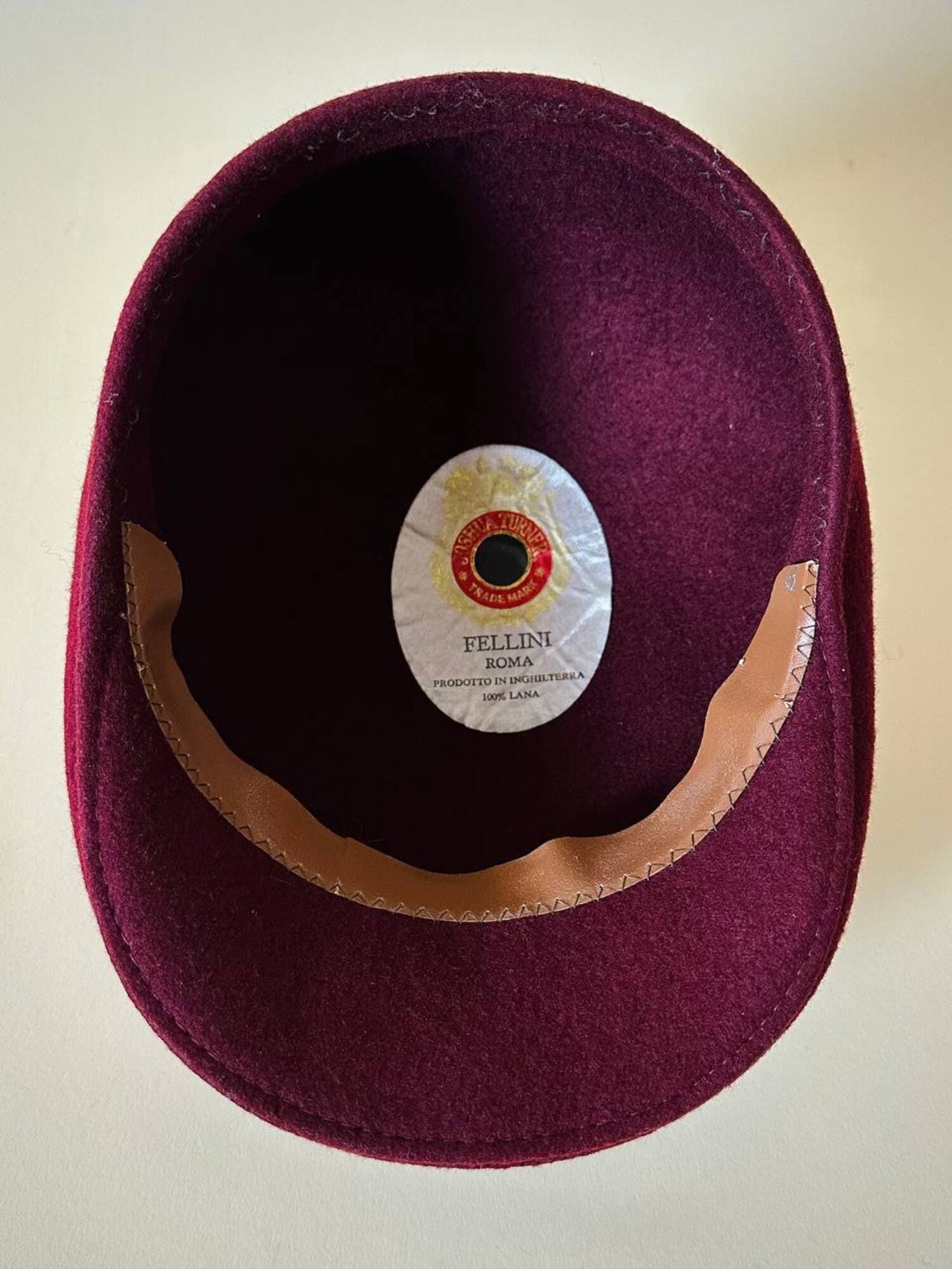 Coppola in feltro di lana bordeaux con rifinitura in pelle cuoio, firmata Fellini Roma, Made in Inghilterra. Un accessorio classico e senza tempo, questa coppola è realizzata in feltro di lana color bordeaux e rifinita internamente con un giro in pelle cuoio, per maggiore comfort. Il design tradizionale conferisce un tocco di eleganza retrò, perfetto per completare look casual o sofisticati con stile. Leggera, resistente e versatile, è un capo ideale per chi cerca un dettaglio di carattere che unisca tradizione e qualità.