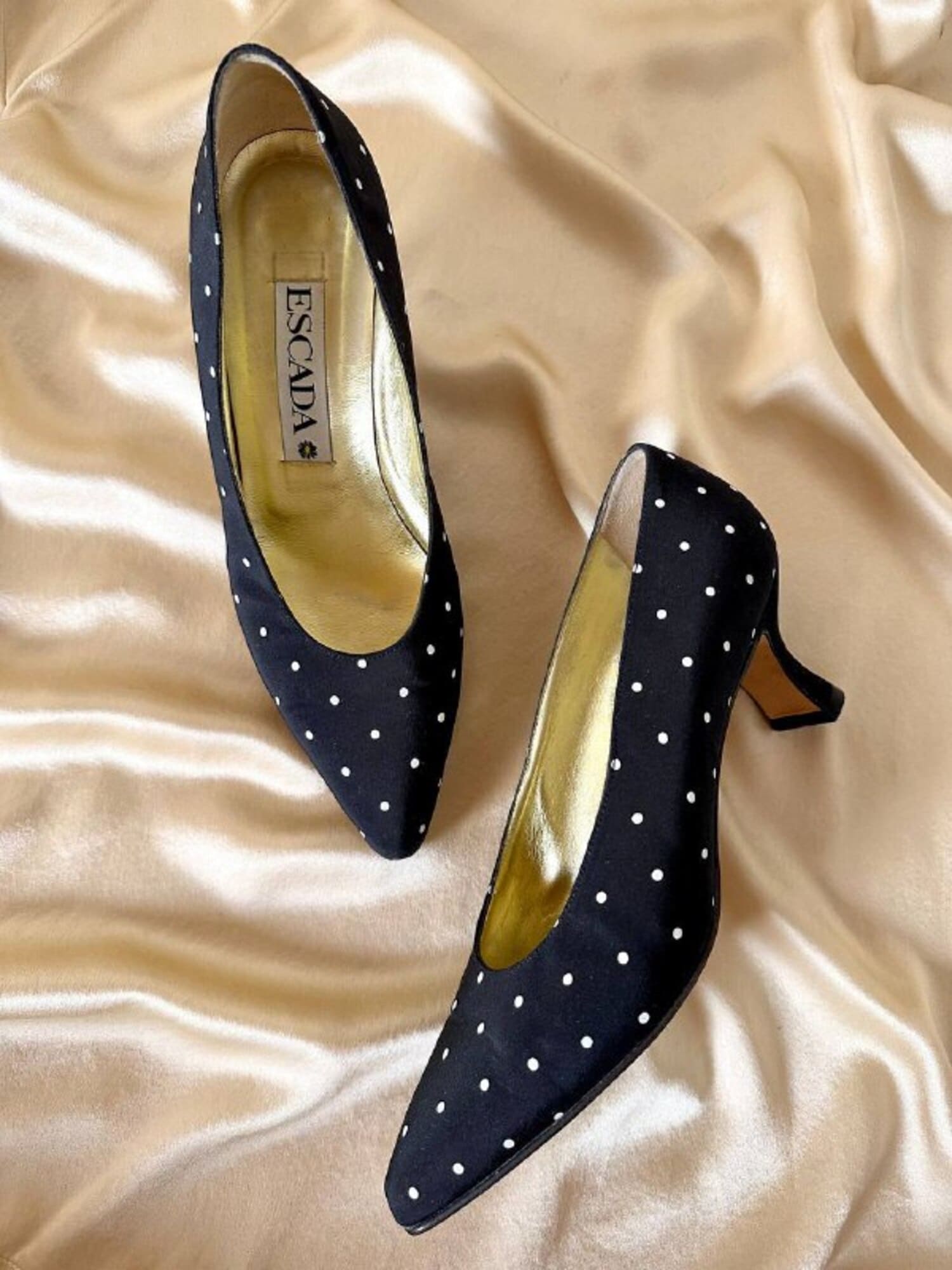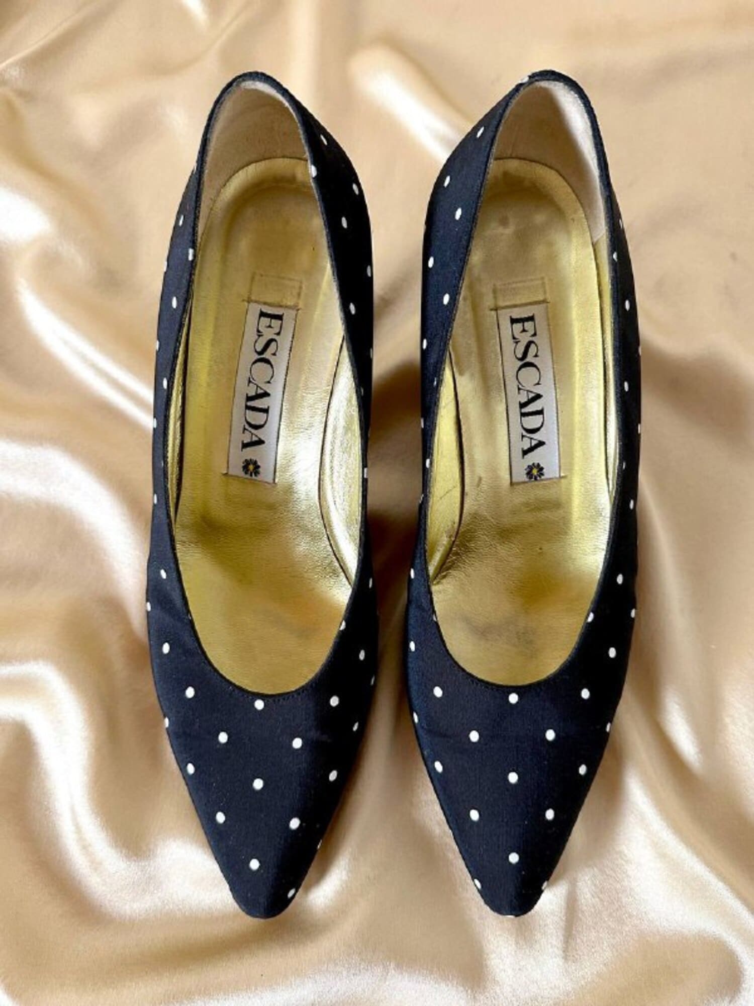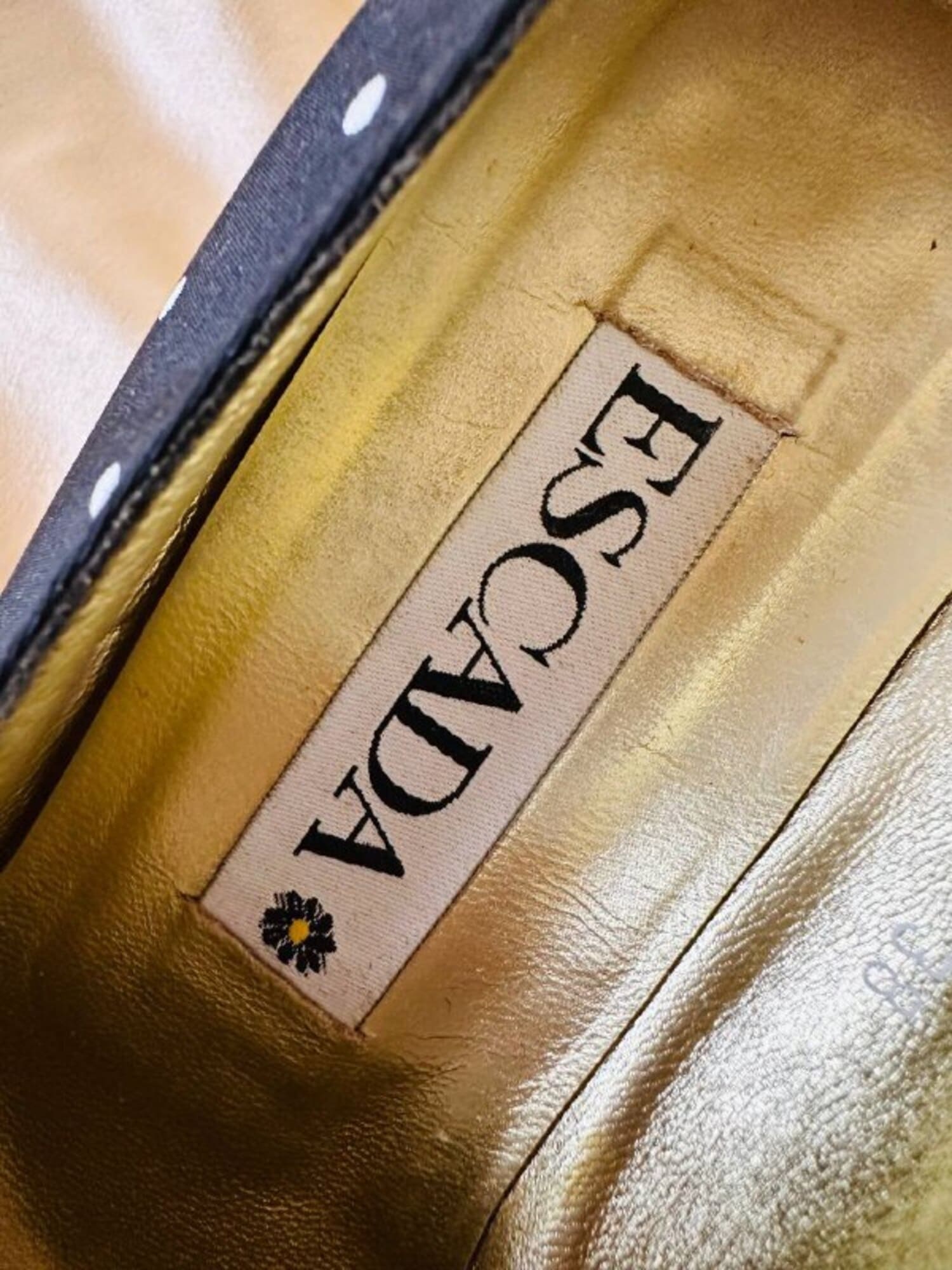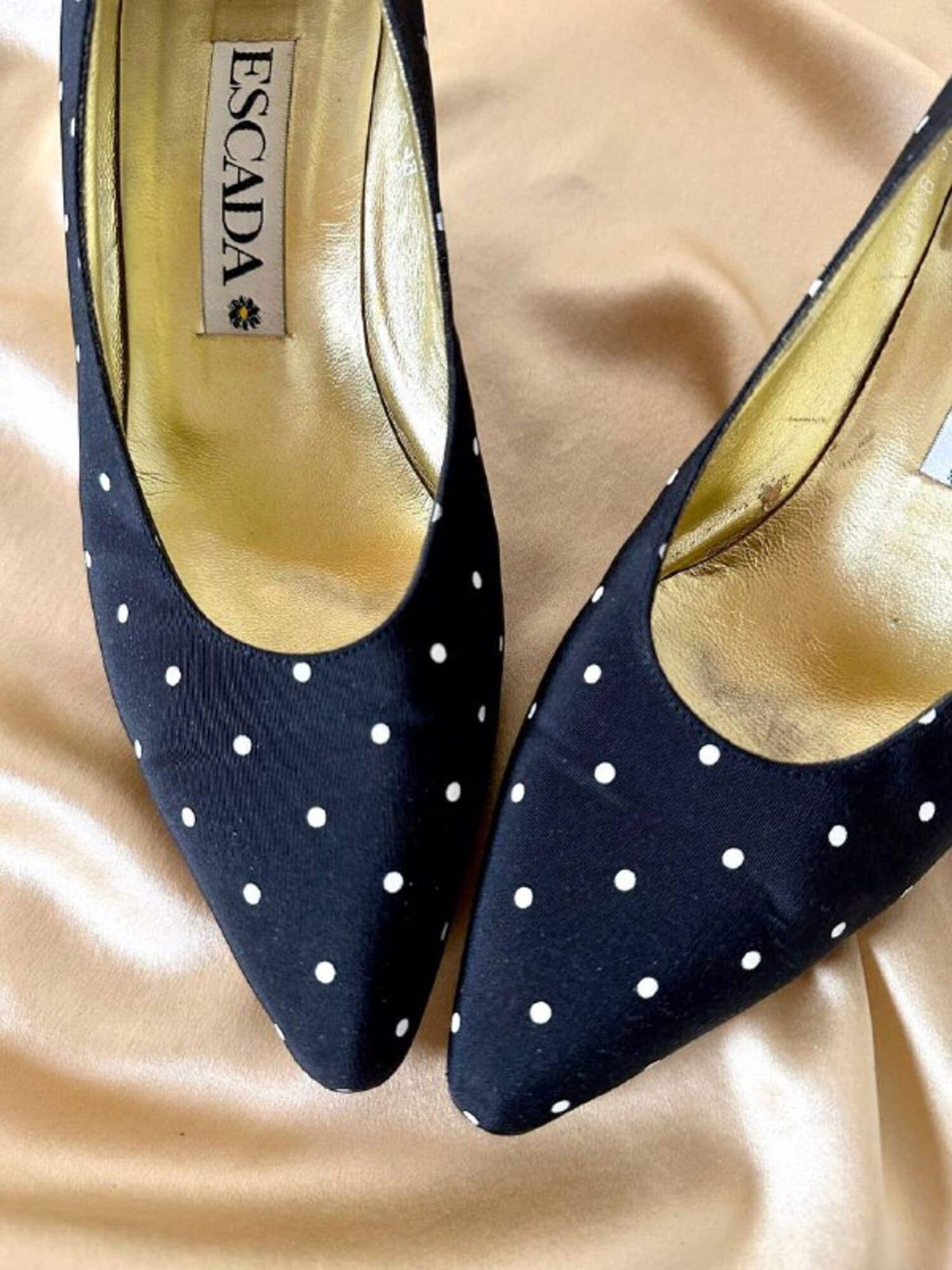 Décolleté firmate “Escada”, realizzate in raffinato gros grain nero a pois bianchi. Presentano una silhouette slanciata con punta affusolata e un tacco a rocchetto rivestito in gros grain nero tinta unita che aggiunge un tocco sofisticato e garantisce stabilità e comfort. La fodera interna in pelle laminata aggiunge un dettaglio lussuoso e ricercato. Perfette per completare look da sera o dare un accento elegante al daywear.