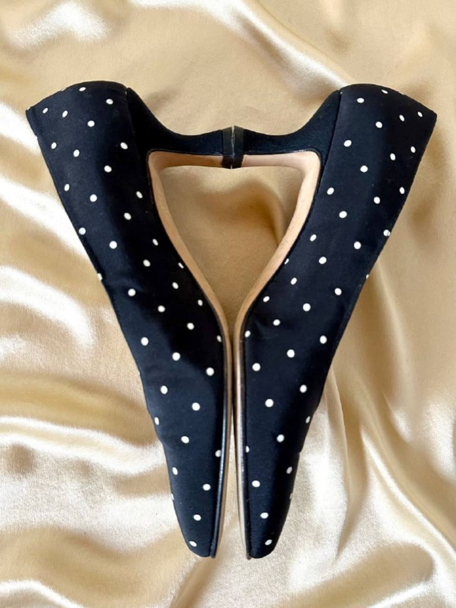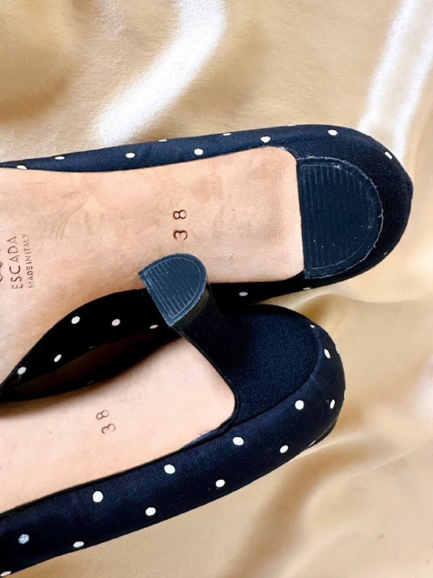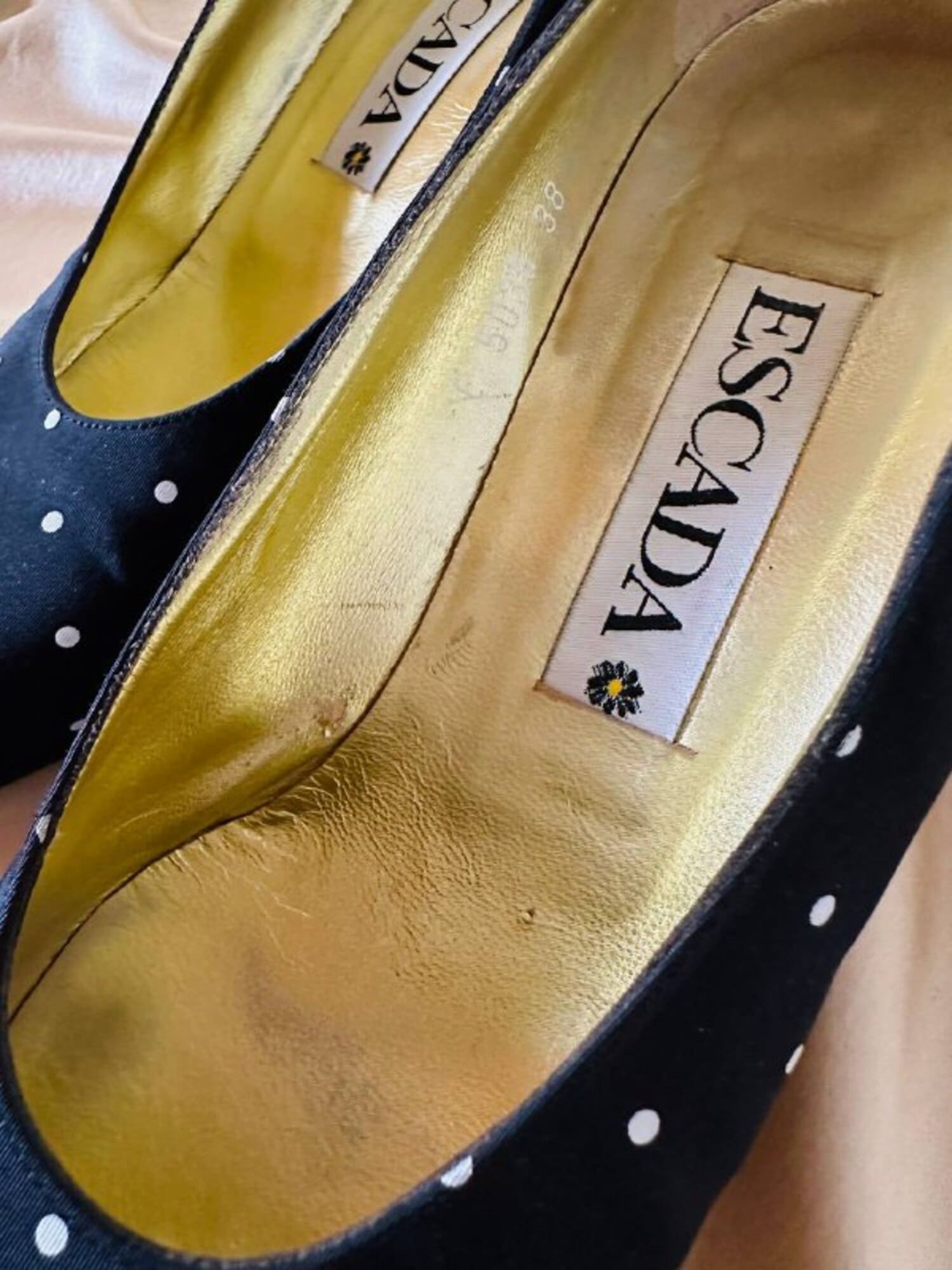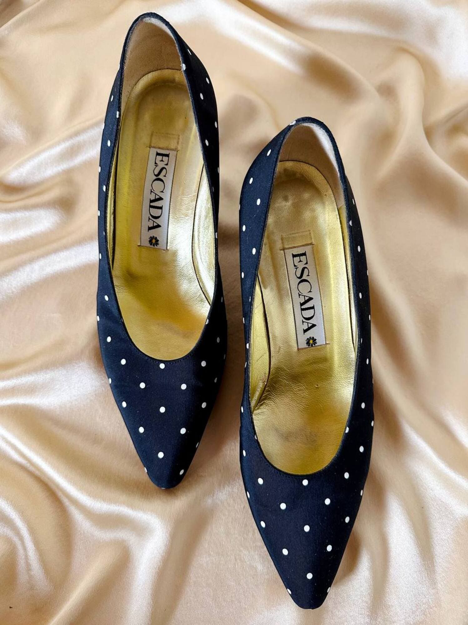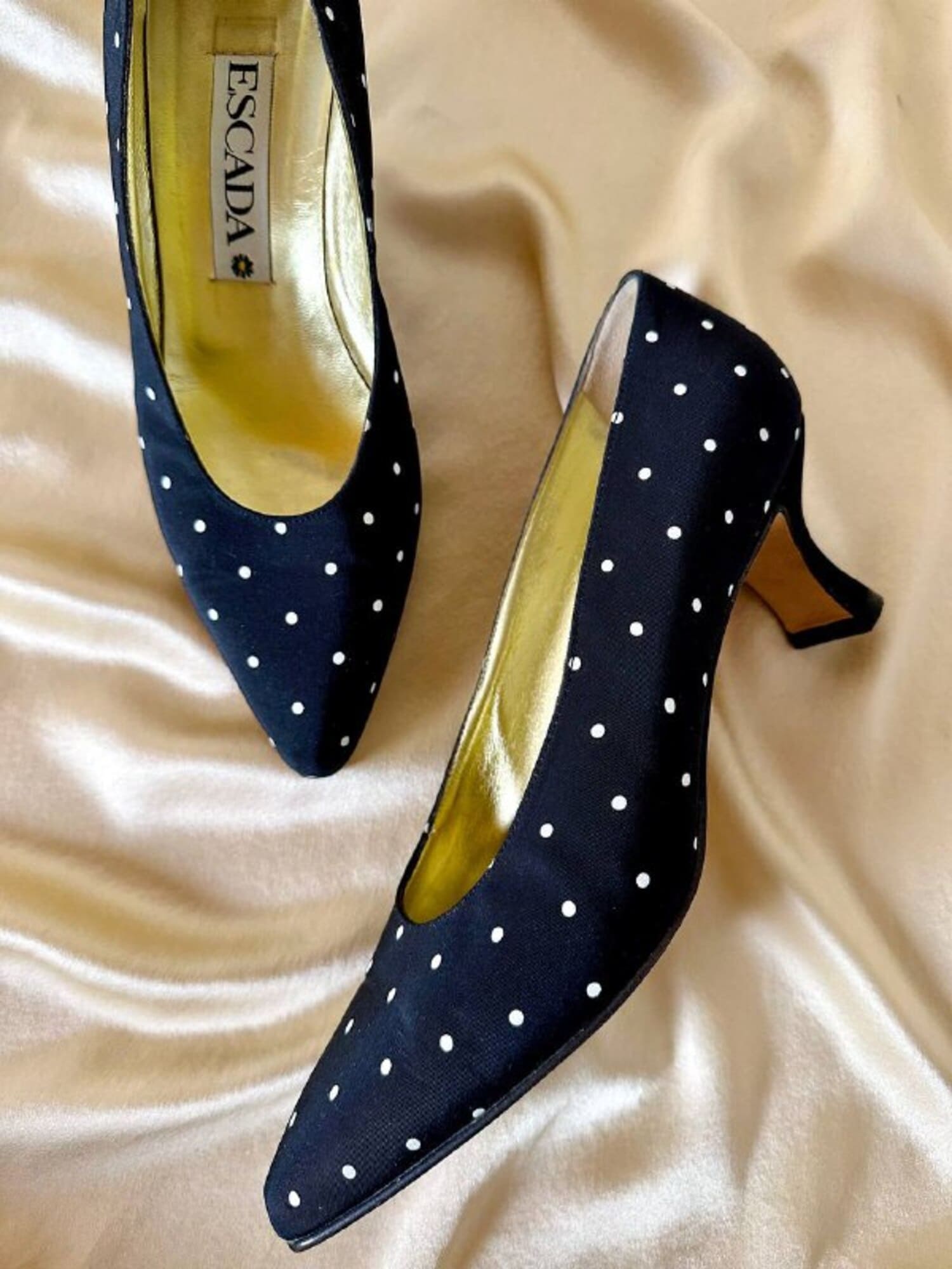 Décolleté firmate “Escada”, realizzate in raffinato gros grain nero a pois bianchi. Presentano una silhouette slanciata con punta affusolata e un tacco a rocchetto rivestito in gros grain nero tinta unita che aggiunge un tocco sofisticato e garantisce stabilità e comfort. La fodera interna in pelle laminata aggiunge un dettaglio lussuoso e ricercato. Perfette per completare look da sera o dare un accento elegante al daywear.