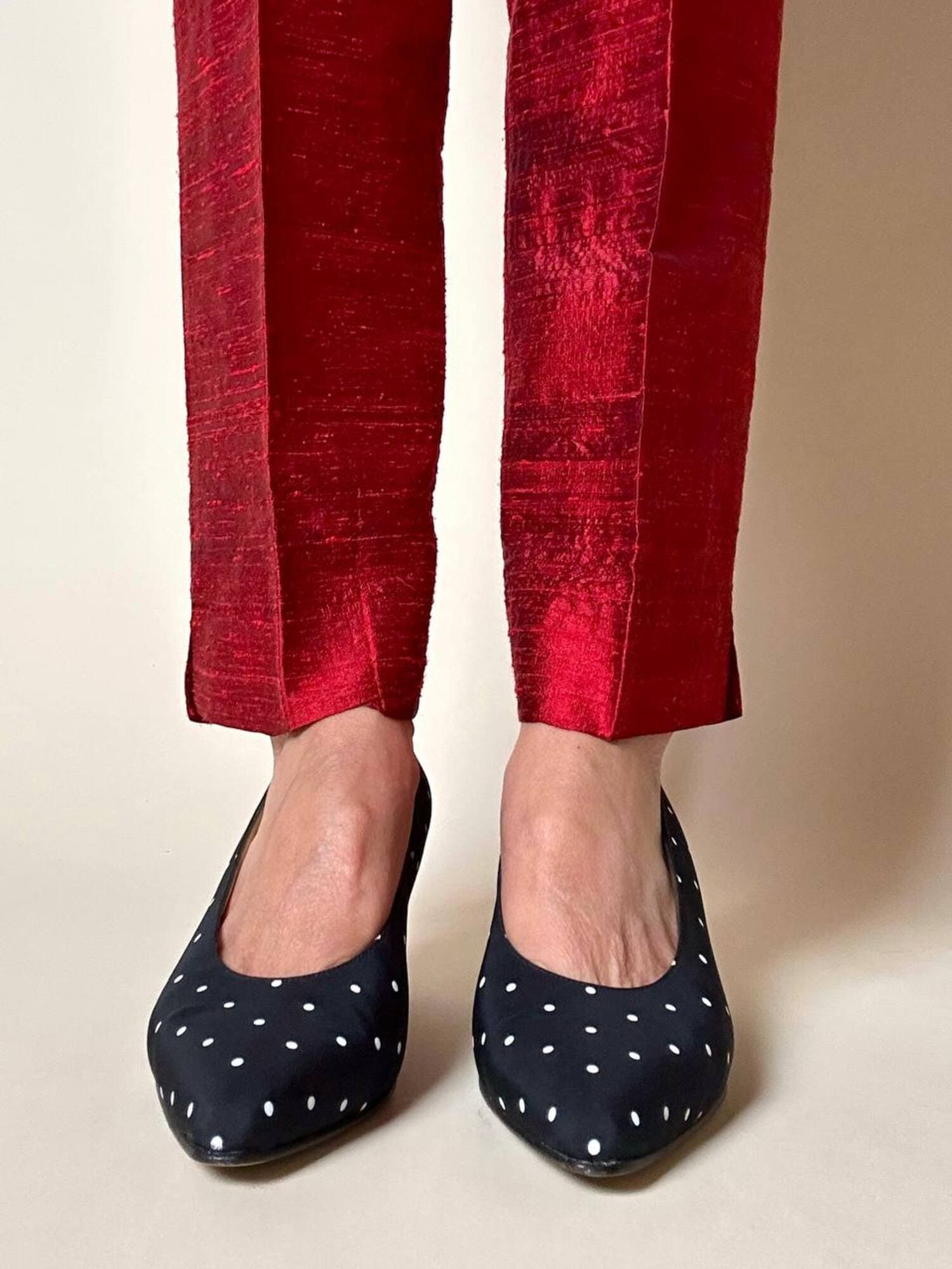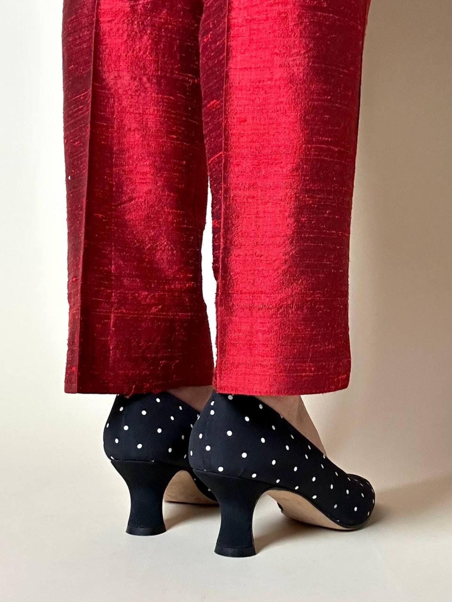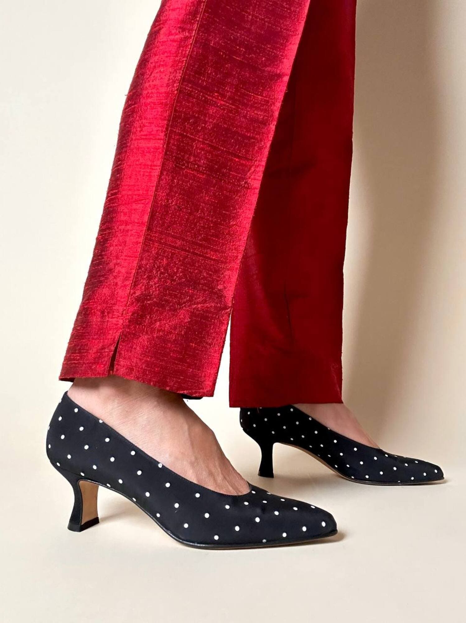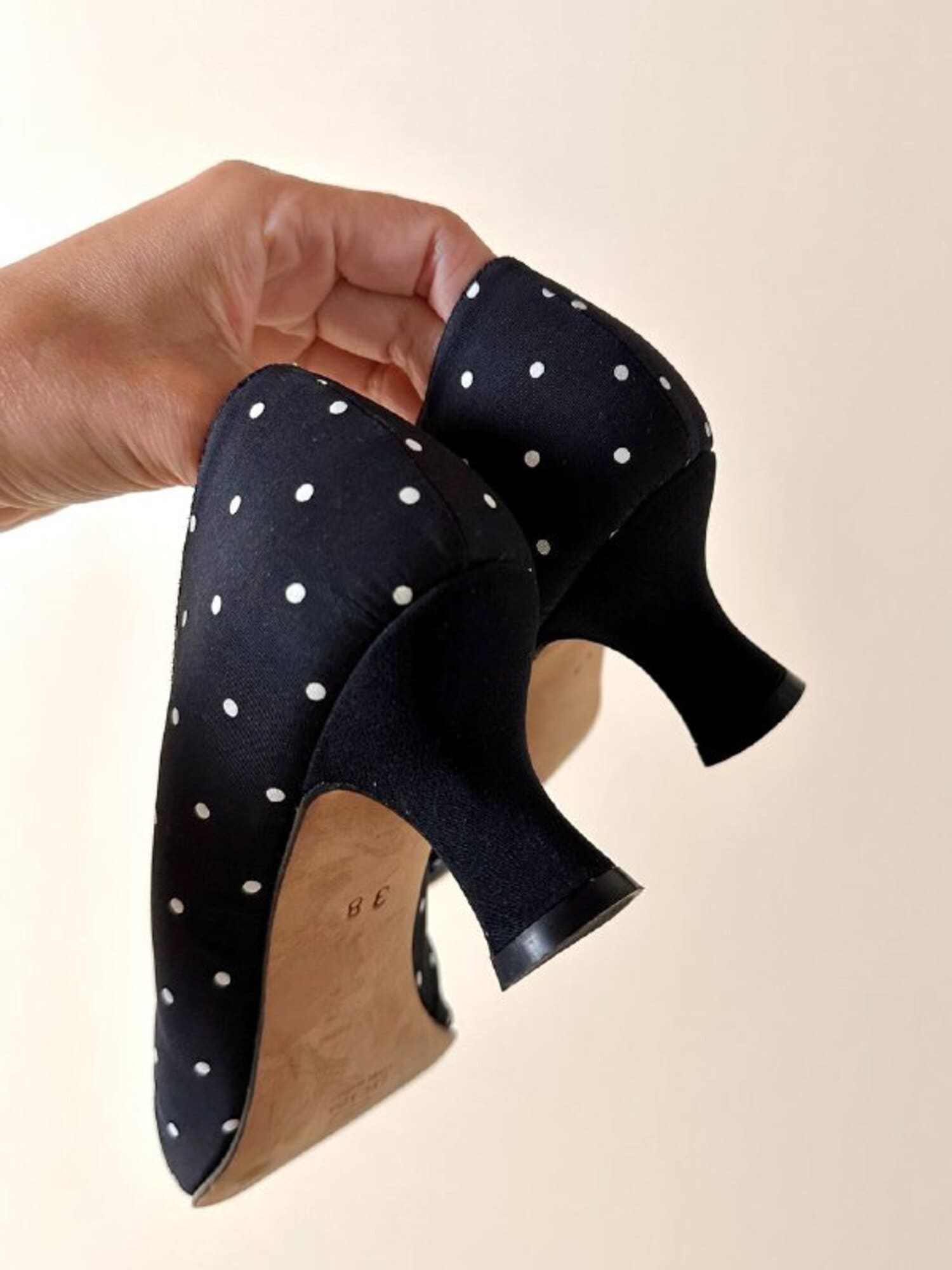 Décolleté firmate “Escada”, realizzate in raffinato gros grain nero a pois bianchi. Presentano una silhouette slanciata con punta affusolata e un tacco a rocchetto rivestito in gros grain nero tinta unita che aggiunge un tocco sofisticato e garantisce stabilità e comfort. La fodera interna in pelle laminata aggiunge un dettaglio lussuoso e ricercato. Perfette per completare look da sera o dare un accento elegante al daywear.