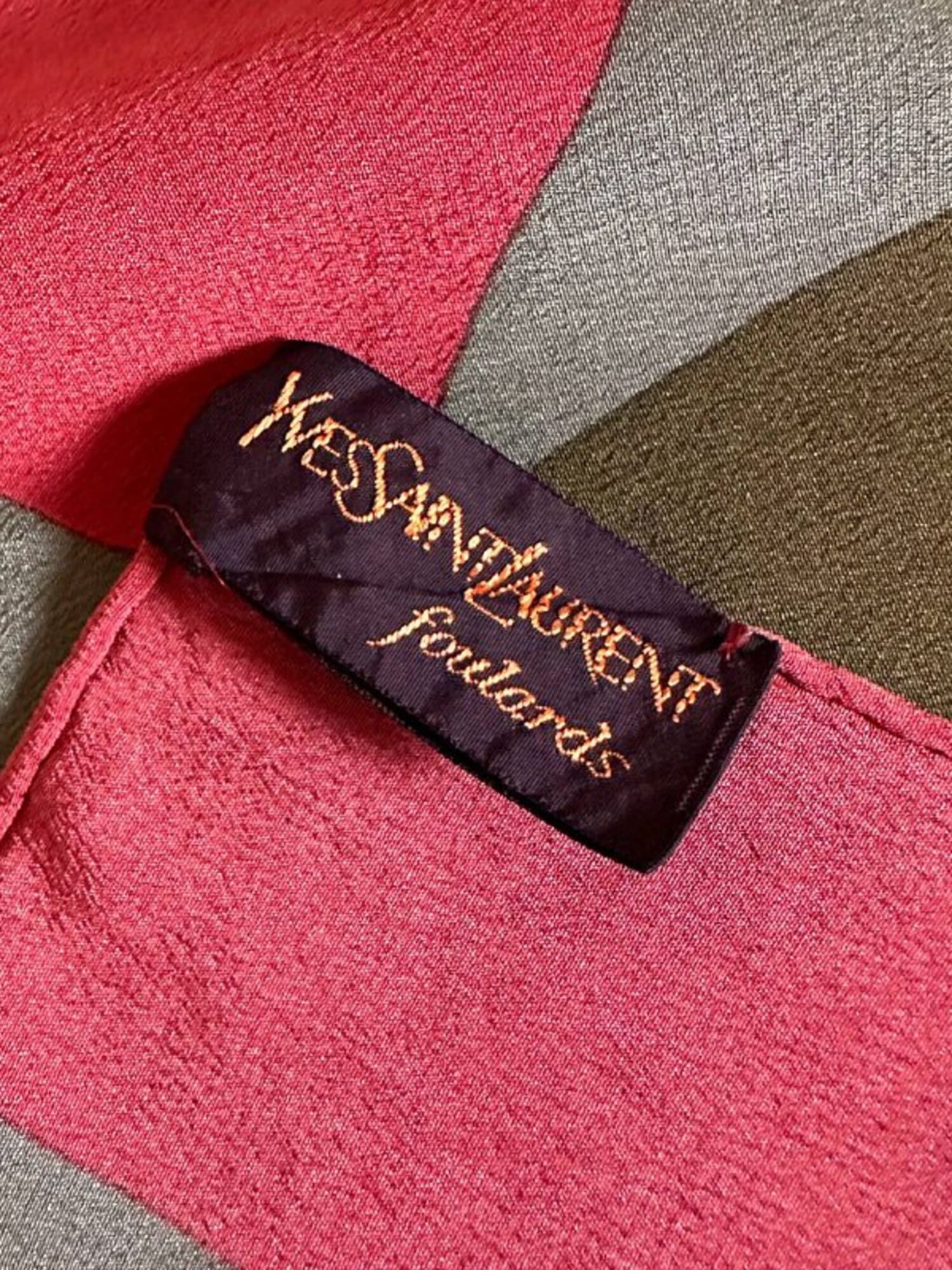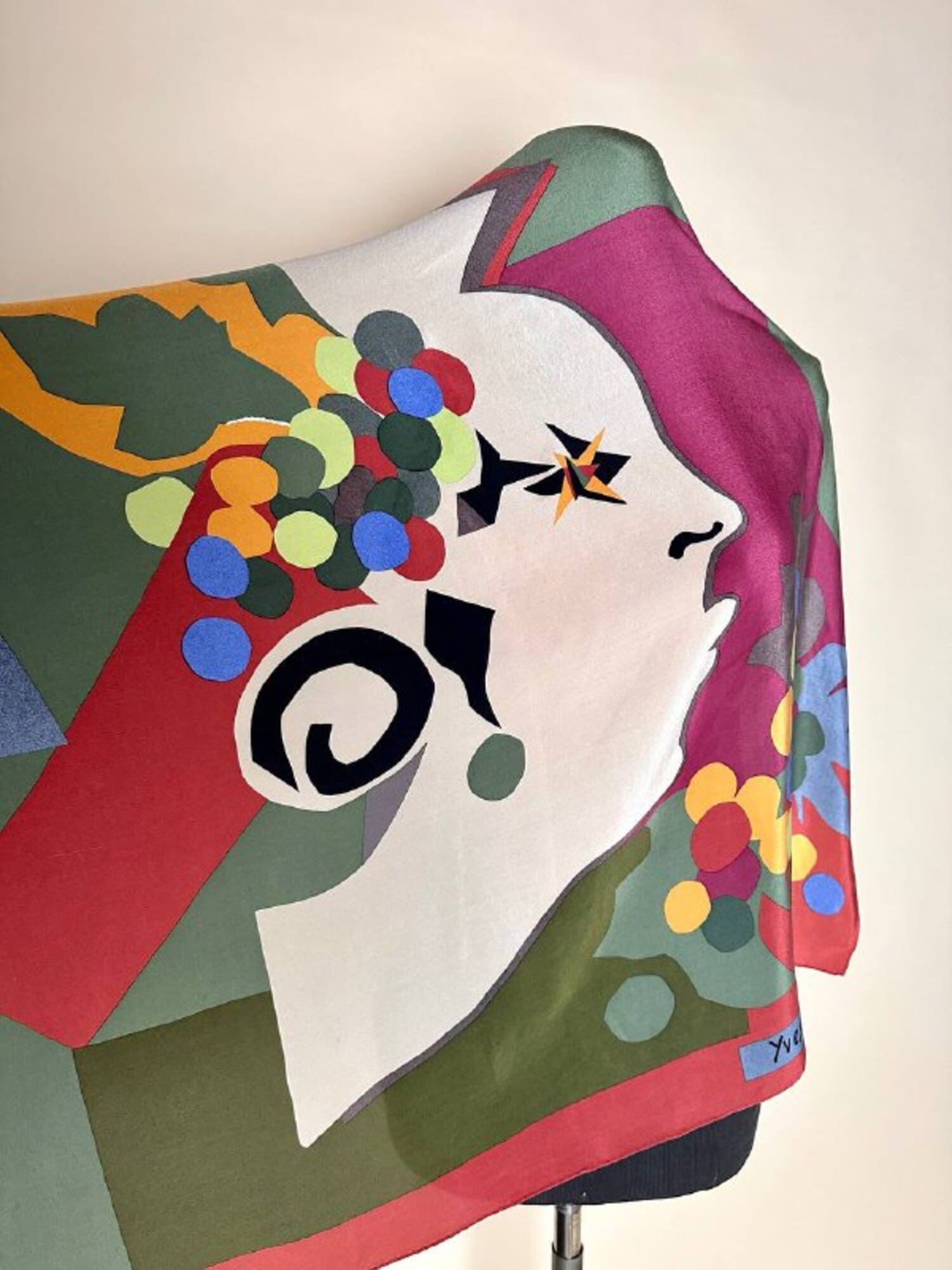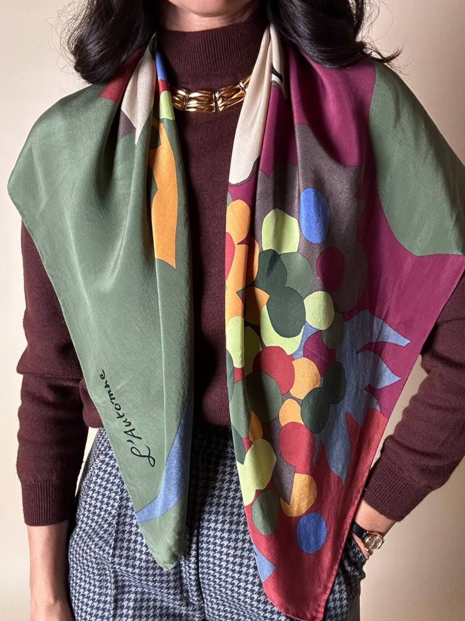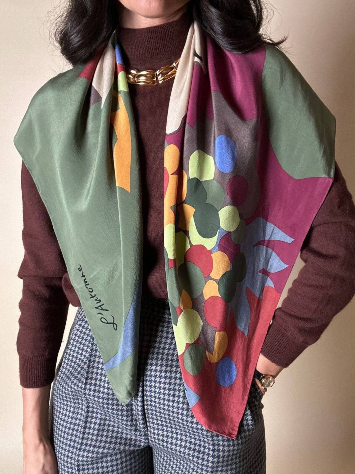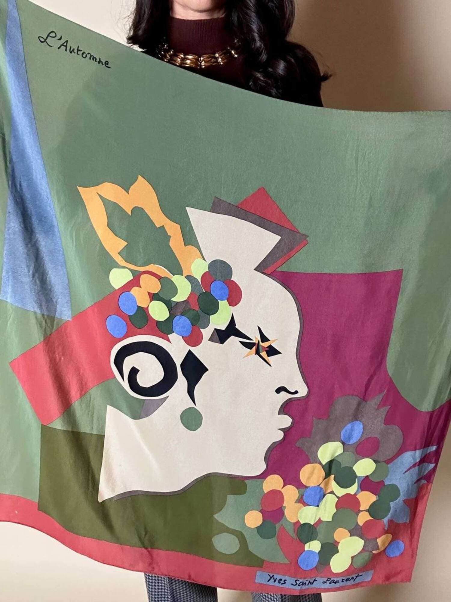 Un pezzo da collezione unico, questo foulard vintage Yves Saint Laurent intitolato “L’Automne” appartiene alla celebre collezione “Les Quatre Saisons” degli anni ’80. Realizzato in seta pregiata con orli arrotolati a mano, il foulard è un esempio perfetto di artigianalità e stile iconico. Protagonista un disegno geometrico astratto che raffigura un volto stilizzato e grappoli d’uva, declinato in tonalità autunnali di prugna, verde, rosso mattone, marrone, grigio e blu, conferendo colore e caratterea ogni outfit. Firmato “Yves Saint Laurent” nell’angolo inferiore destro, questo foulard è un accessorio elegante e versatile, ideale per gli amanti del vintage e dei pezzi da collezione.