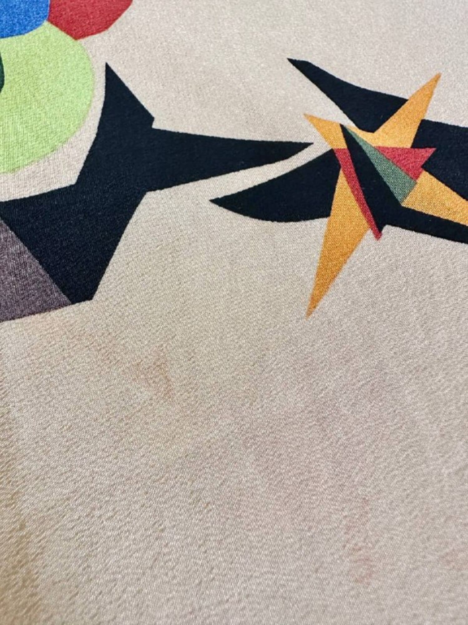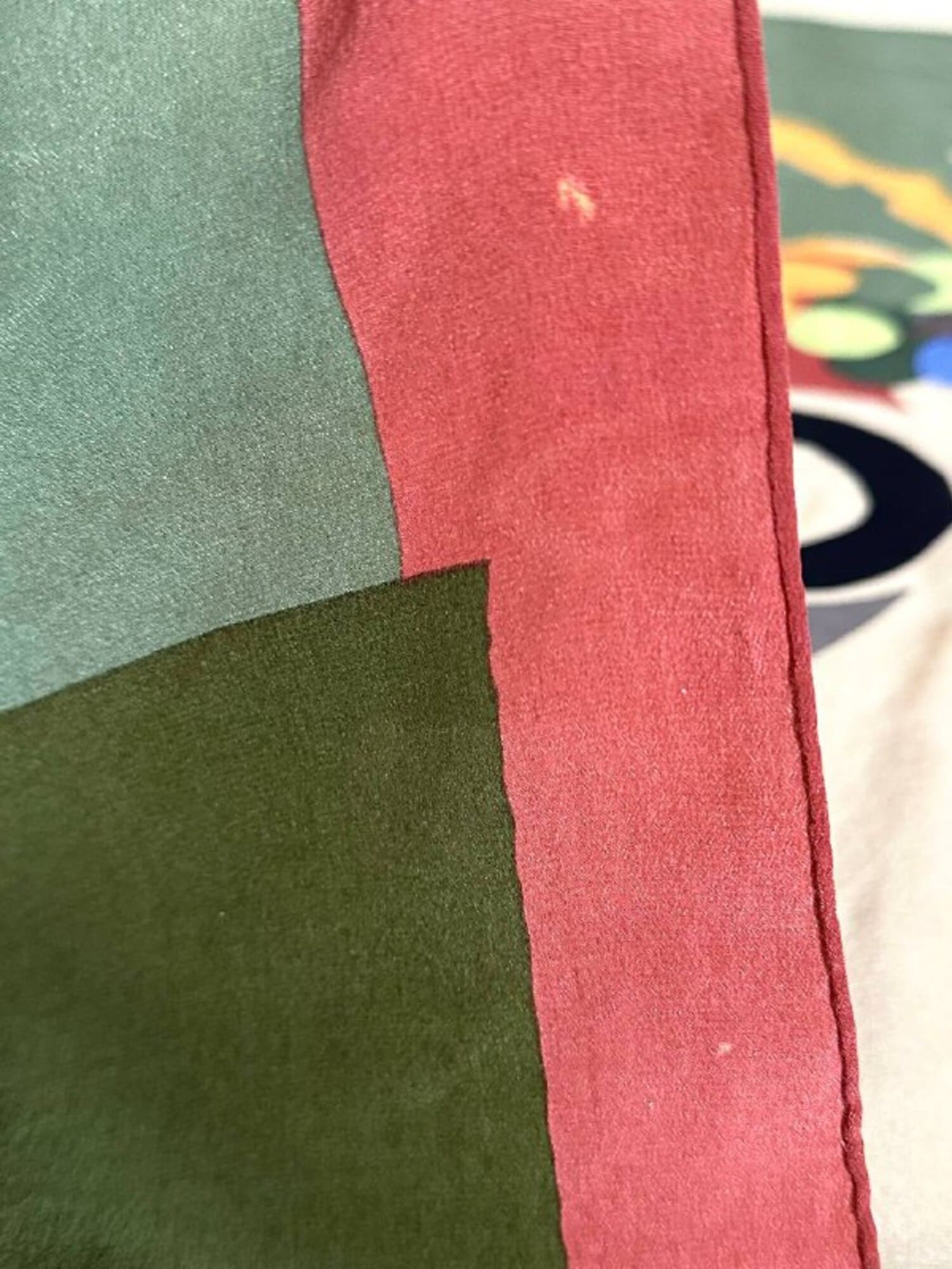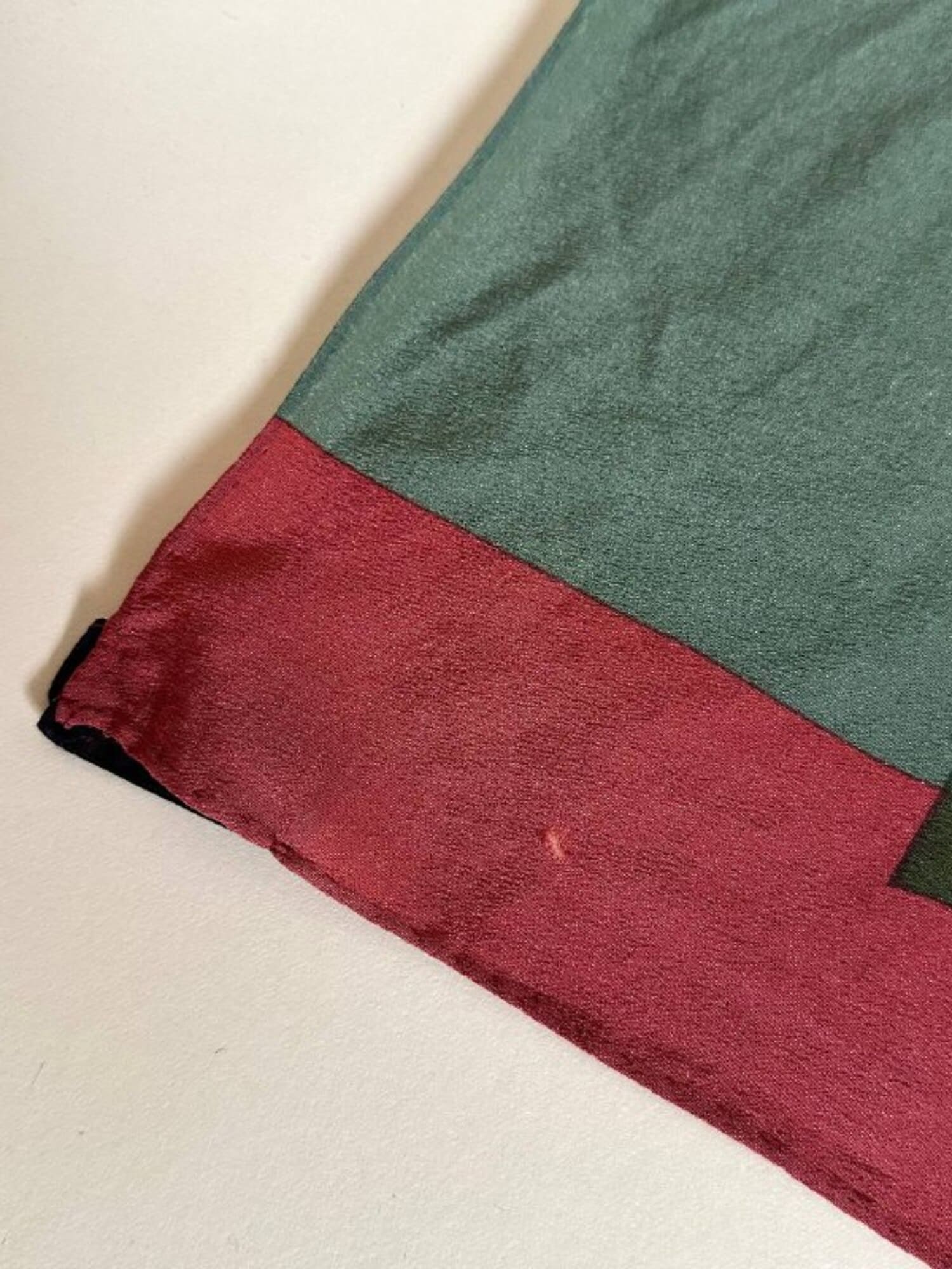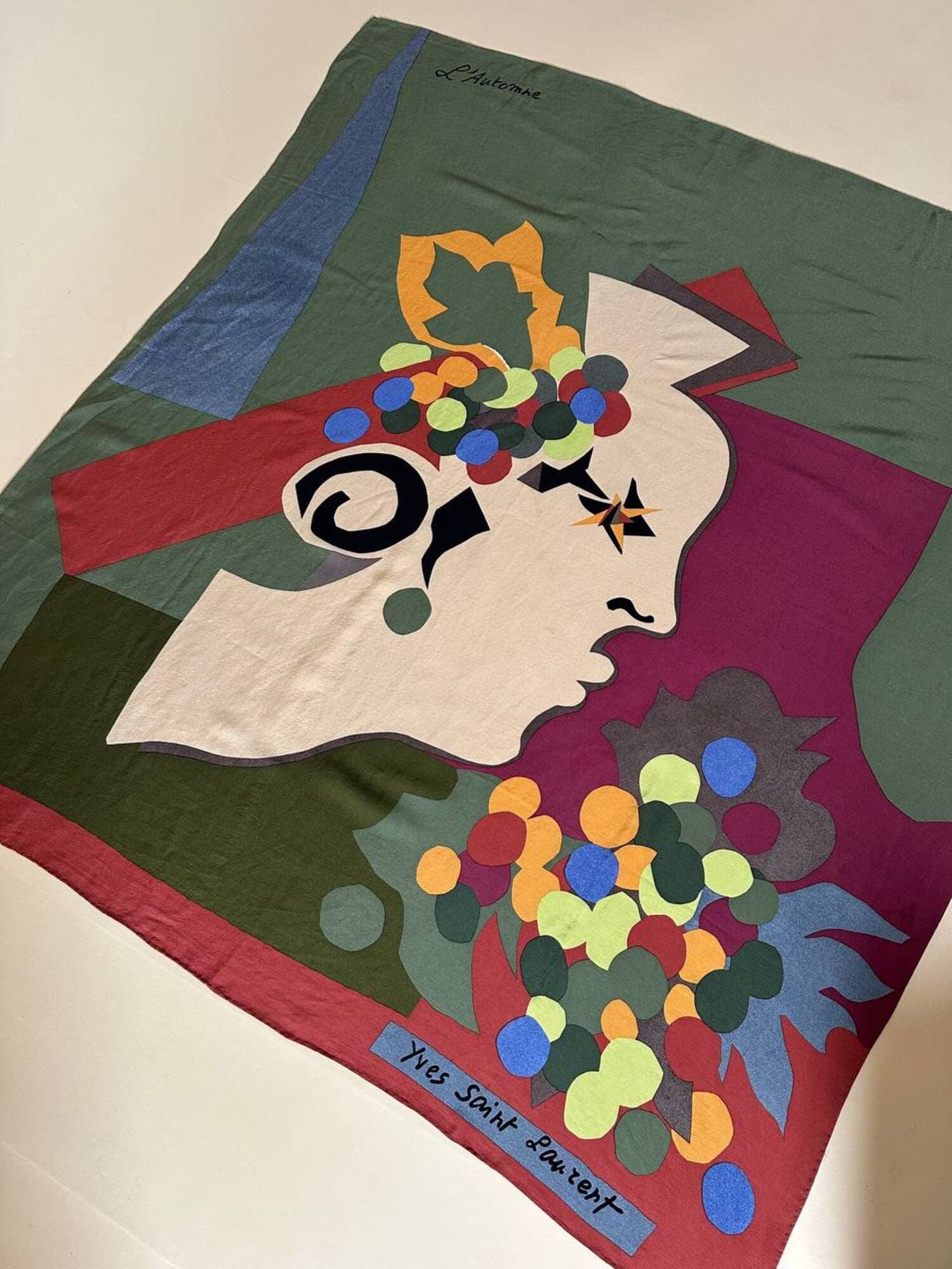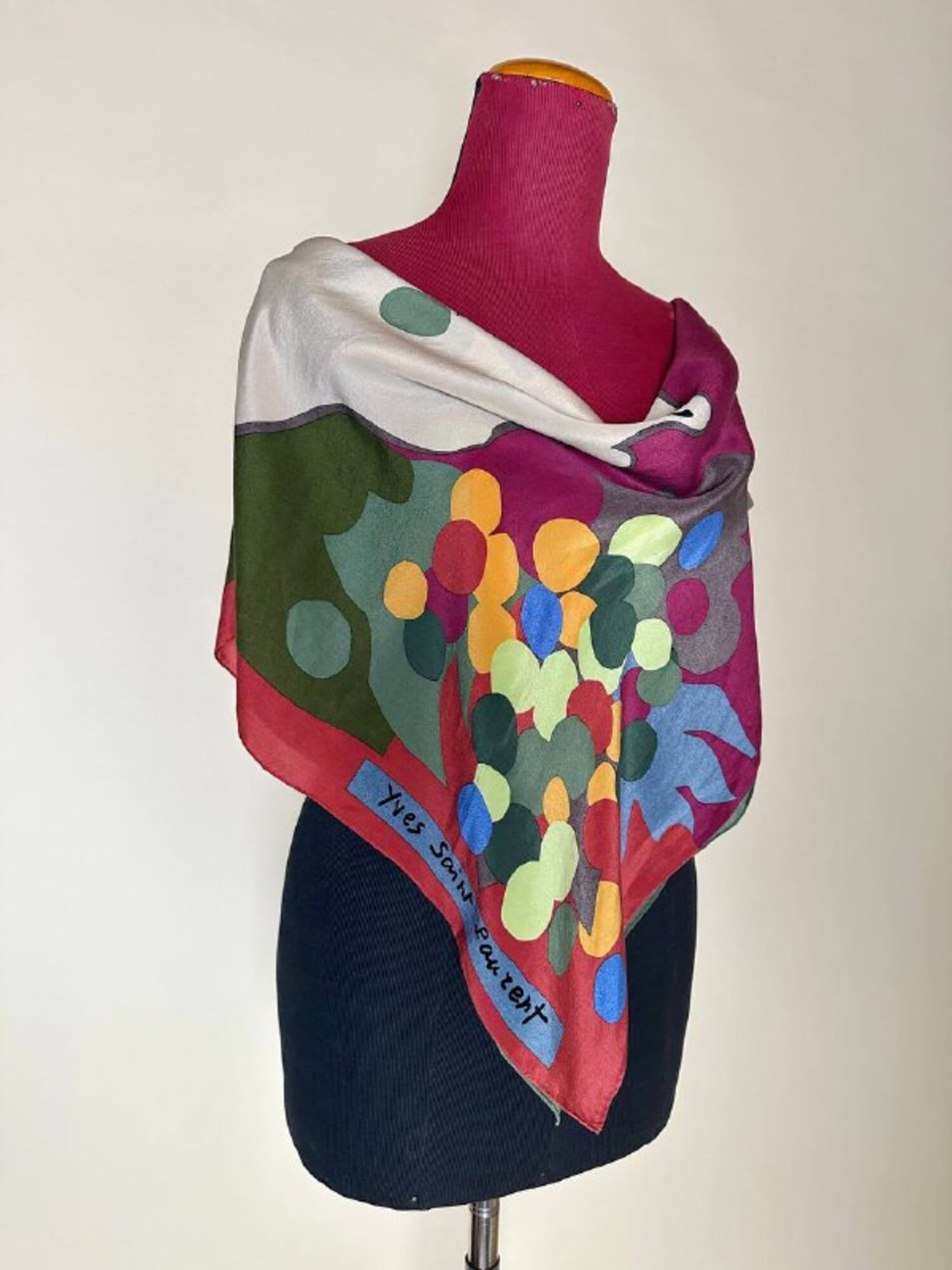 Un pezzo da collezione unico, questo foulard vintage Yves Saint Laurent intitolato “L’Automne” appartiene alla celebre collezione “Les Quatre Saisons” degli anni ’80. Realizzato in seta pregiata con orli arrotolati a mano, il foulard è un esempio perfetto di artigianalità e stile iconico. Protagonista un disegno geometrico astratto che raffigura un volto stilizzato e grappoli d’uva, declinato in tonalità autunnali di prugna, verde, rosso mattone, marrone, grigio e blu, conferendo colore e caratterea ogni outfit. Firmato “Yves Saint Laurent” nell’angolo inferiore destro, questo foulard è un accessorio elegante e versatile, ideale per gli amanti del vintage e dei pezzi da collezione.