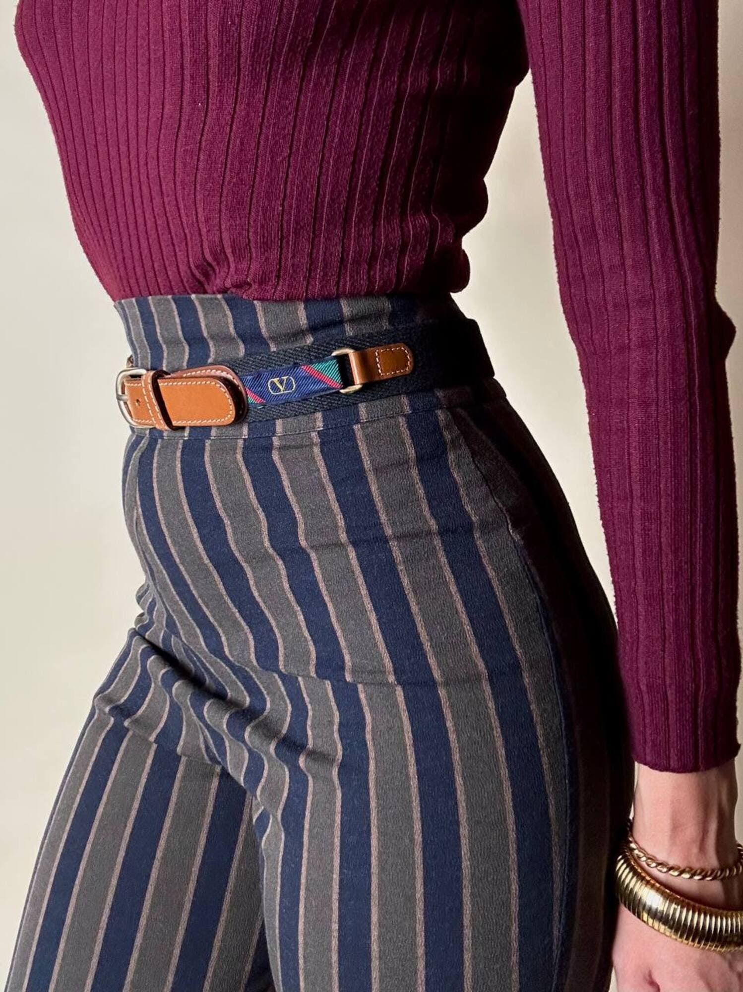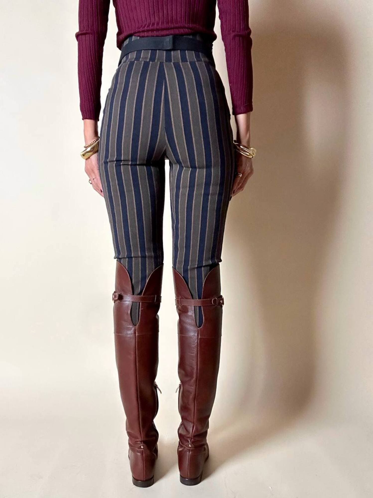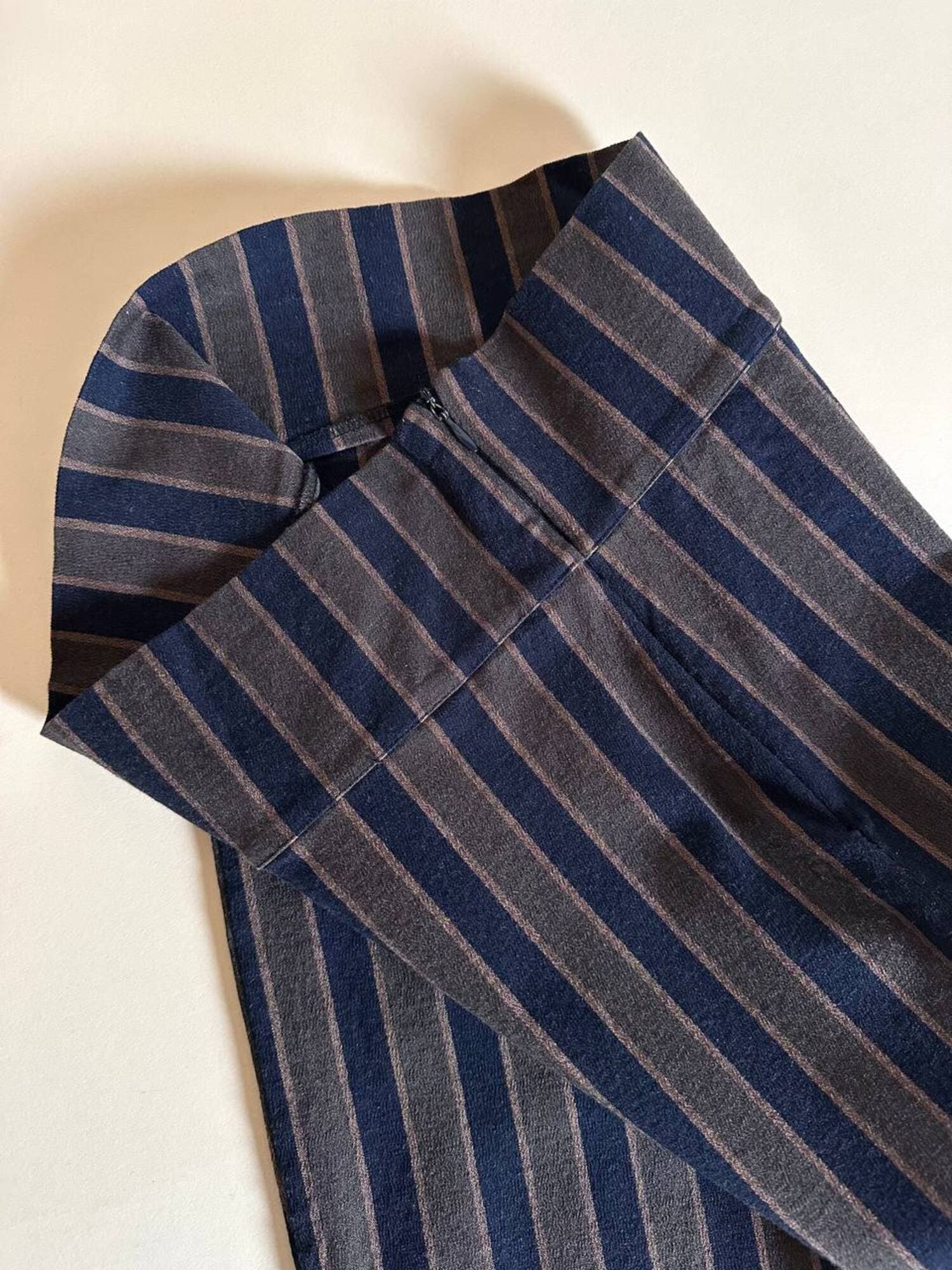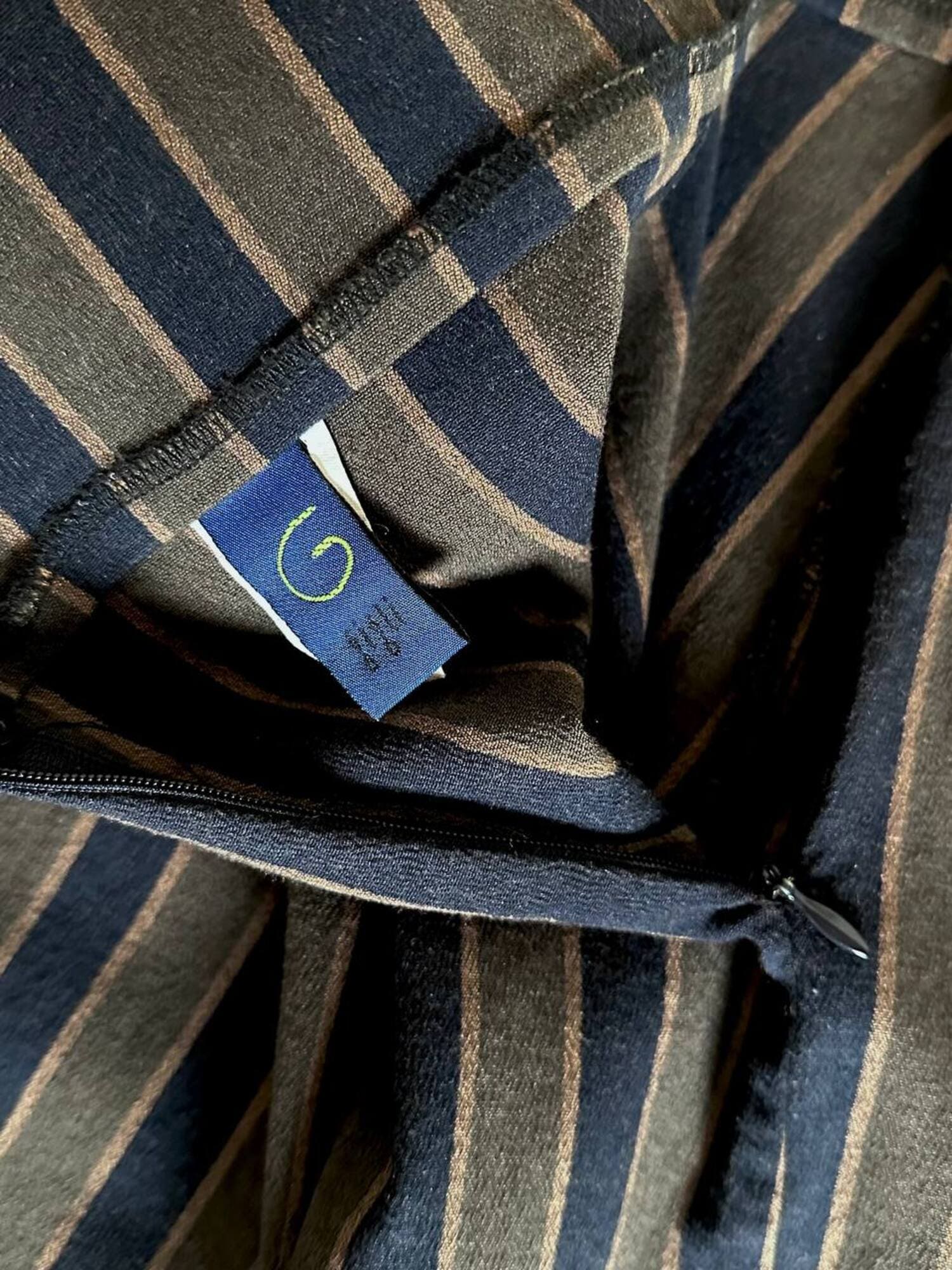 Fuseaux Romeo Gigli a vita alta caratterizzato da una particolare fantasia a righe verticali nei toni del blu notte, verde militare e marrone chiaro, una palette ricercata che slancia la silhouette e valorizza la linea del capo. Il tessuto, compatto ed elasticizzato, offre una vestibilità confortevole e aderente, rendendo il pantalone ideale per accompagnare i movimenti con naturalezza. La zip laterale a scomparsa mantiene il design pulito e minimale, esaltando l’eleganza della vita alta. Un modello iconico che unisce estetica e funzionalità, perfetto per look moderni, sartoriali o per aggiungere un tocco di ricercatezza ad outfit quotidiani.
