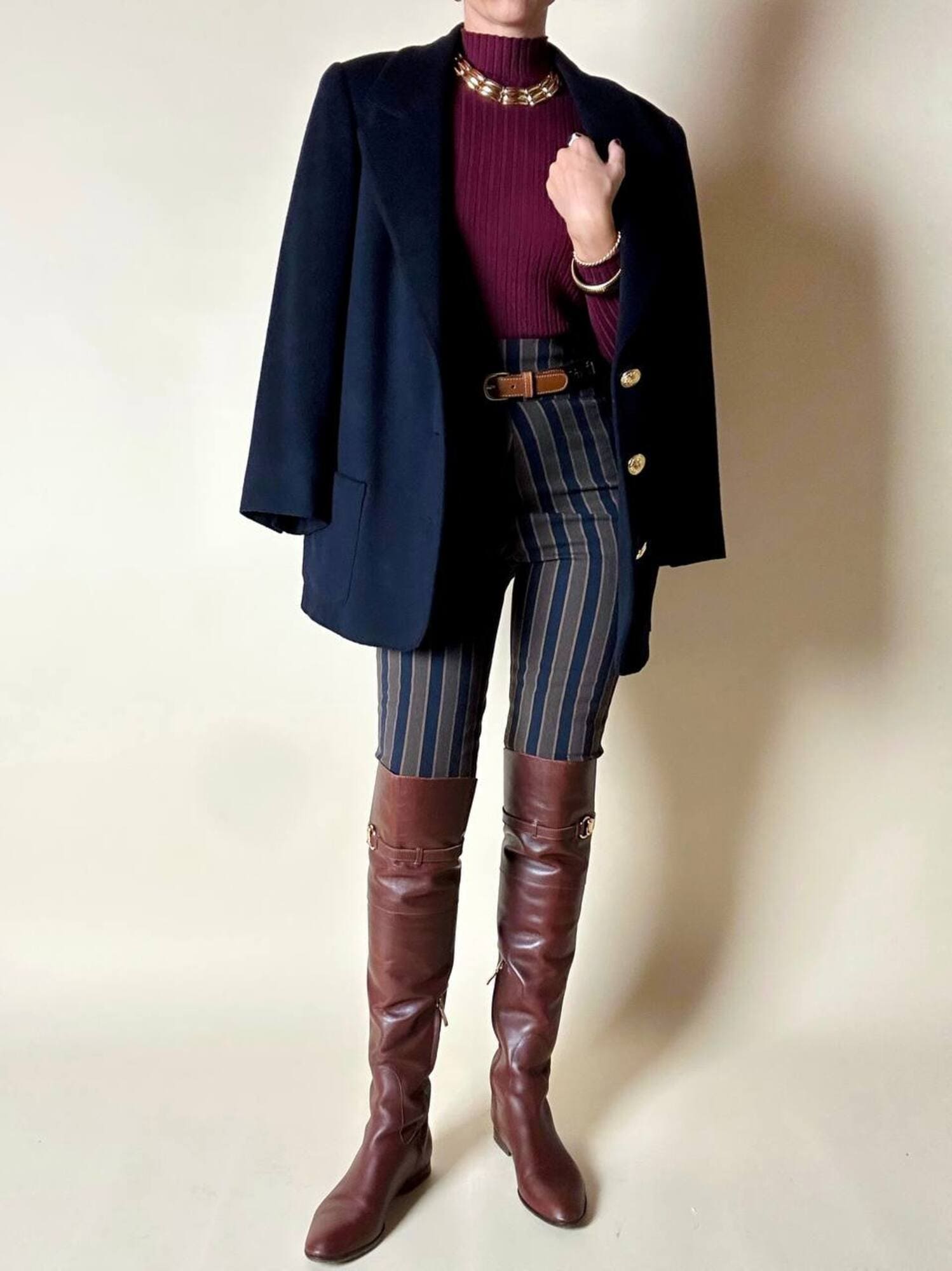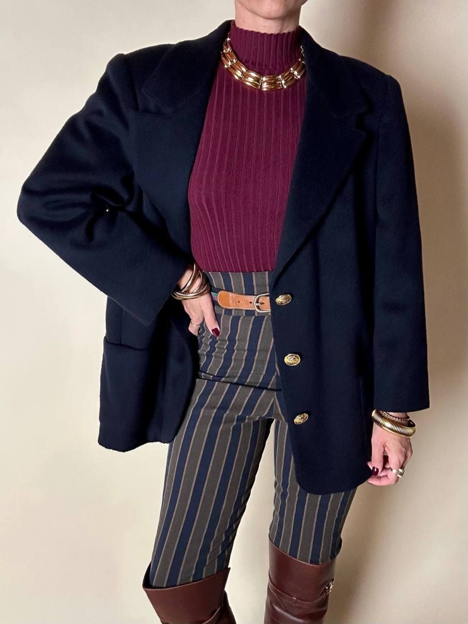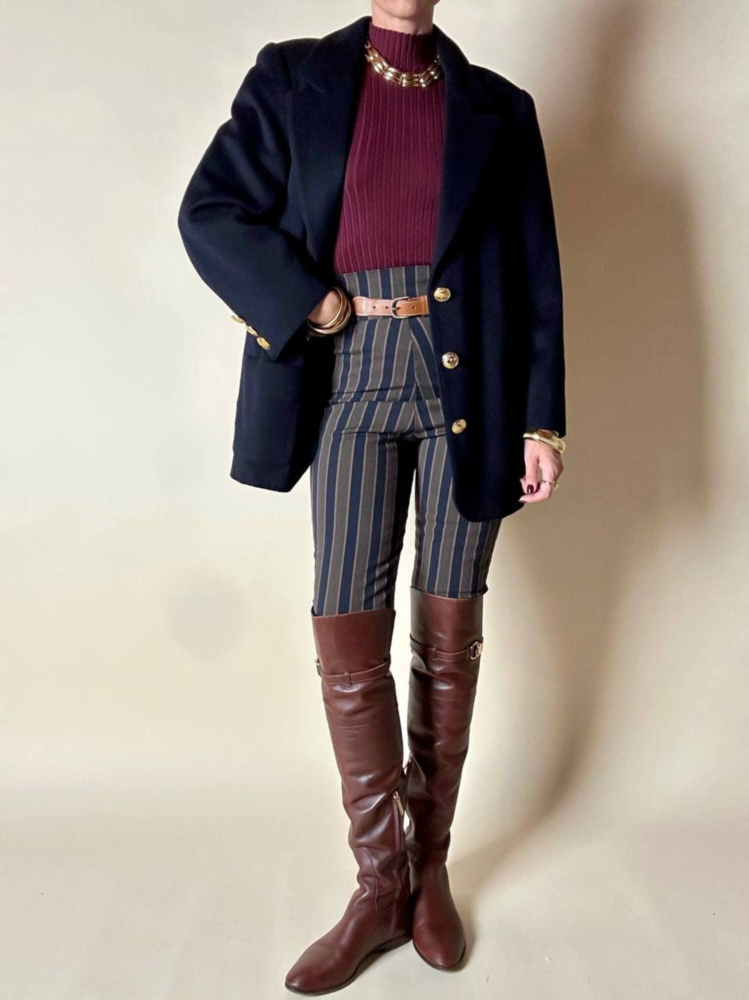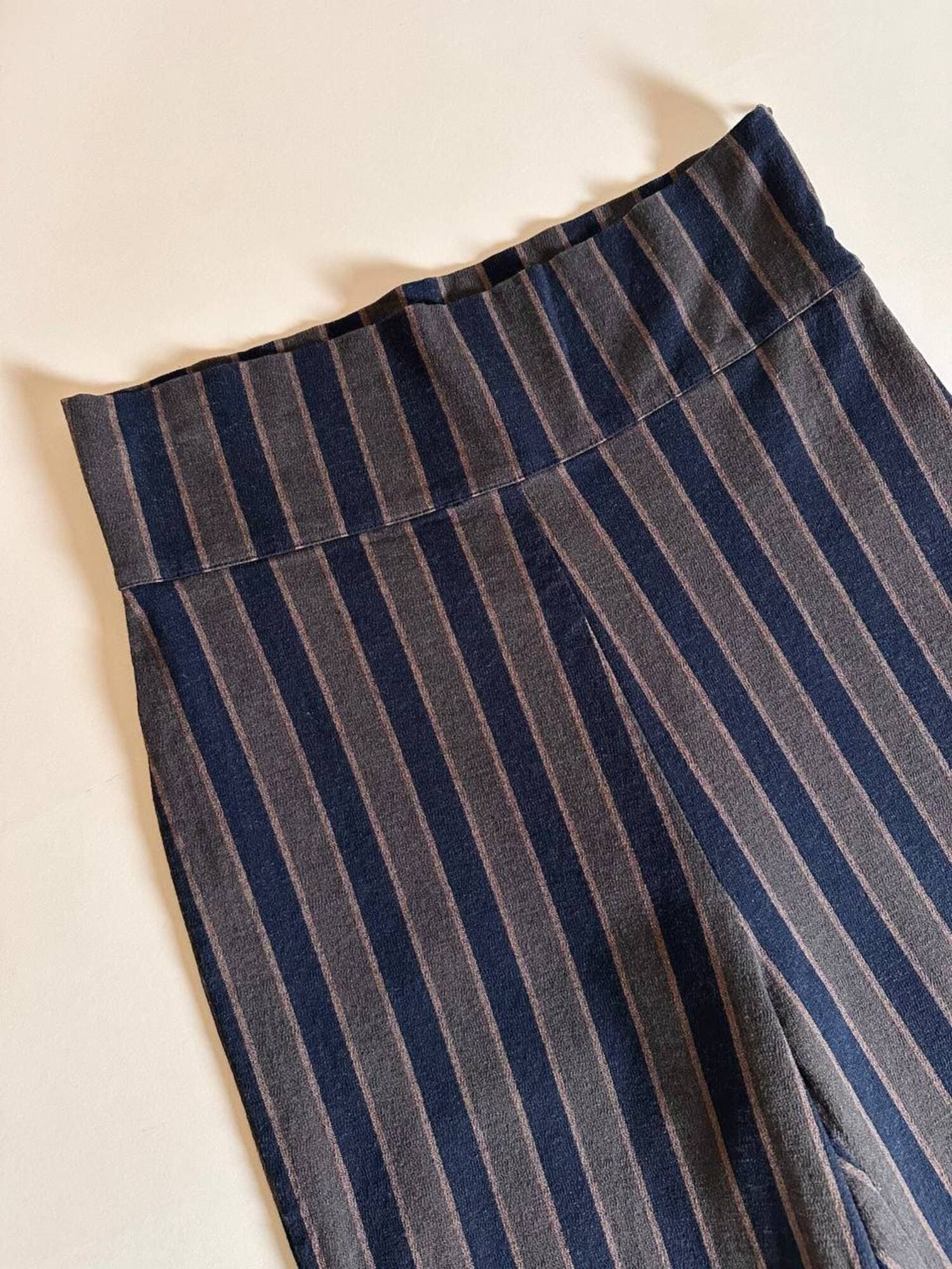Fuseaux Romeo Gigli a vita alta caratterizzato da una particolare fantasia a righe verticali nei toni del blu notte, verde militare e marrone chiaro, una palette ricercata che slancia la silhouette e valorizza la linea del capo. Il tessuto, compatto ed elasticizzato, offre una vestibilità confortevole e aderente, rendendo il pantalone ideale per accompagnare i movimenti con naturalezza. La zip laterale a scomparsa mantiene il design pulito e minimale, esaltando l’eleganza della vita alta. Un modello iconico che unisce estetica e funzionalità, perfetto per look moderni, sartoriali o per aggiungere un tocco di ricercatezza ad outfit quotidiani.