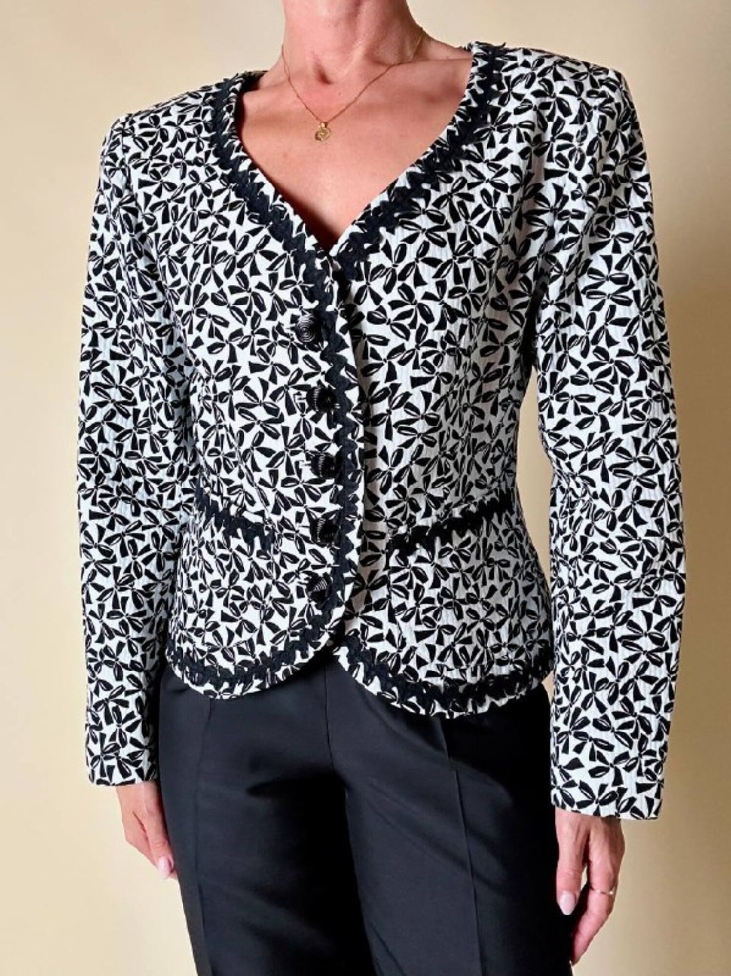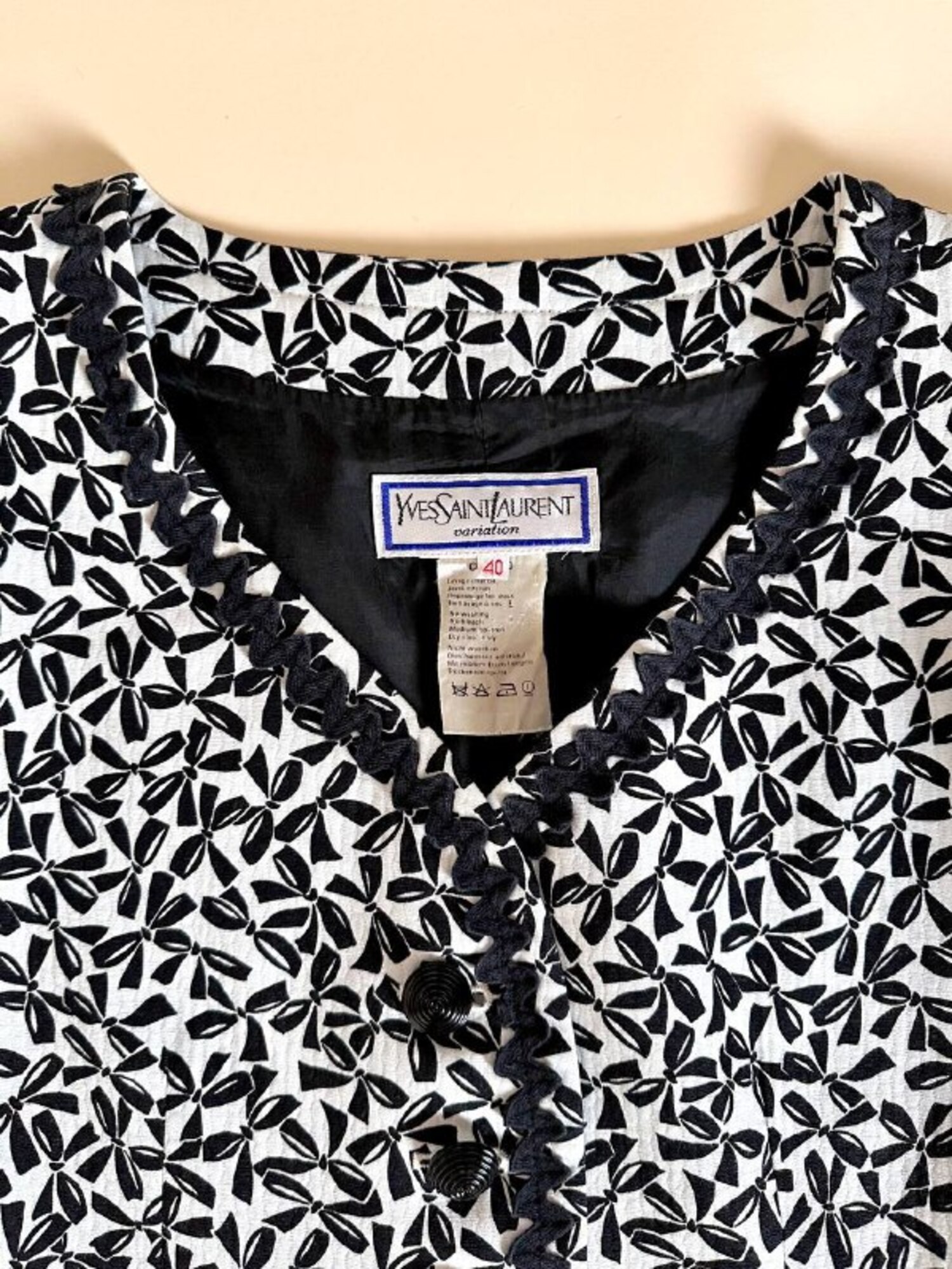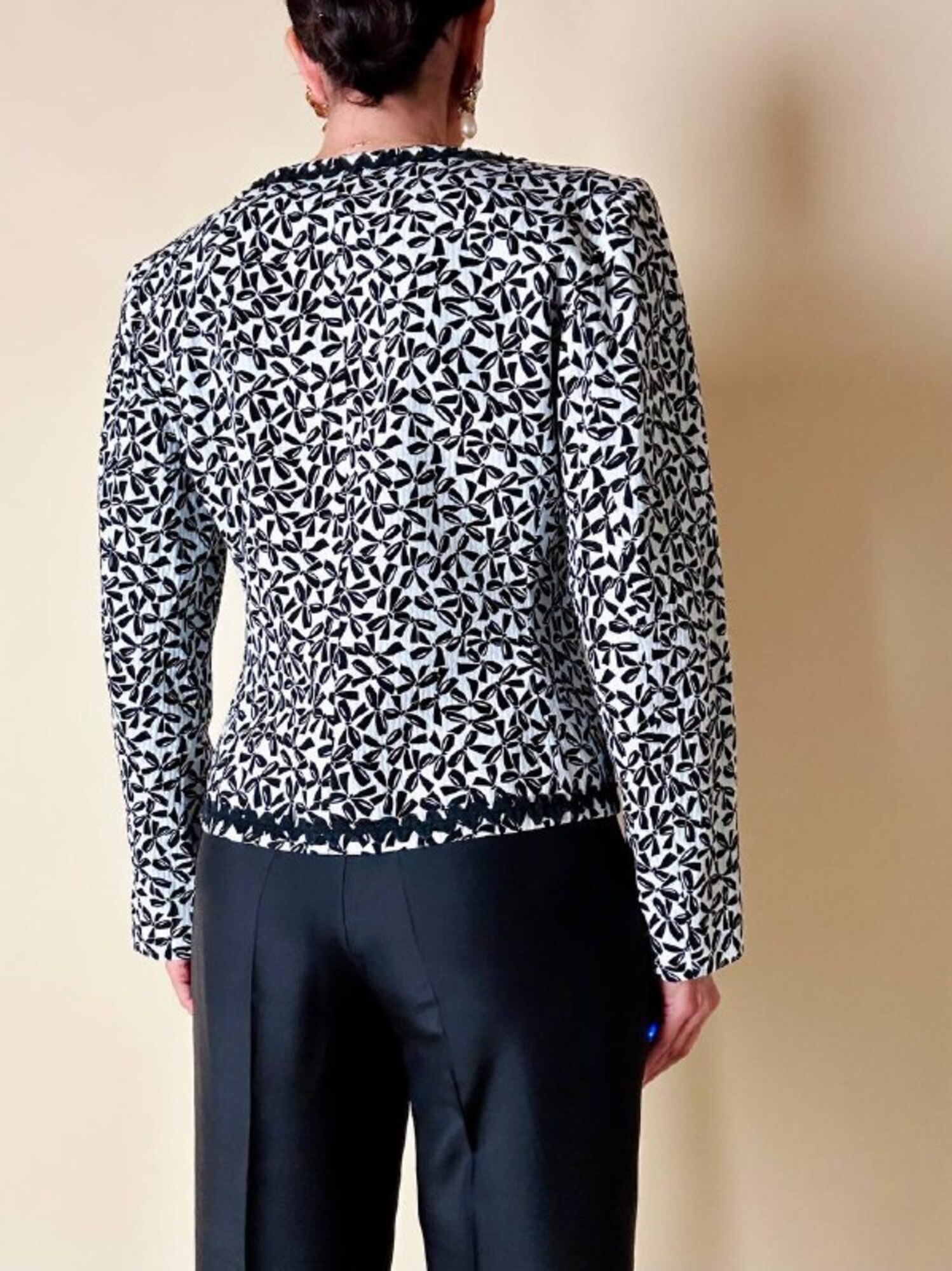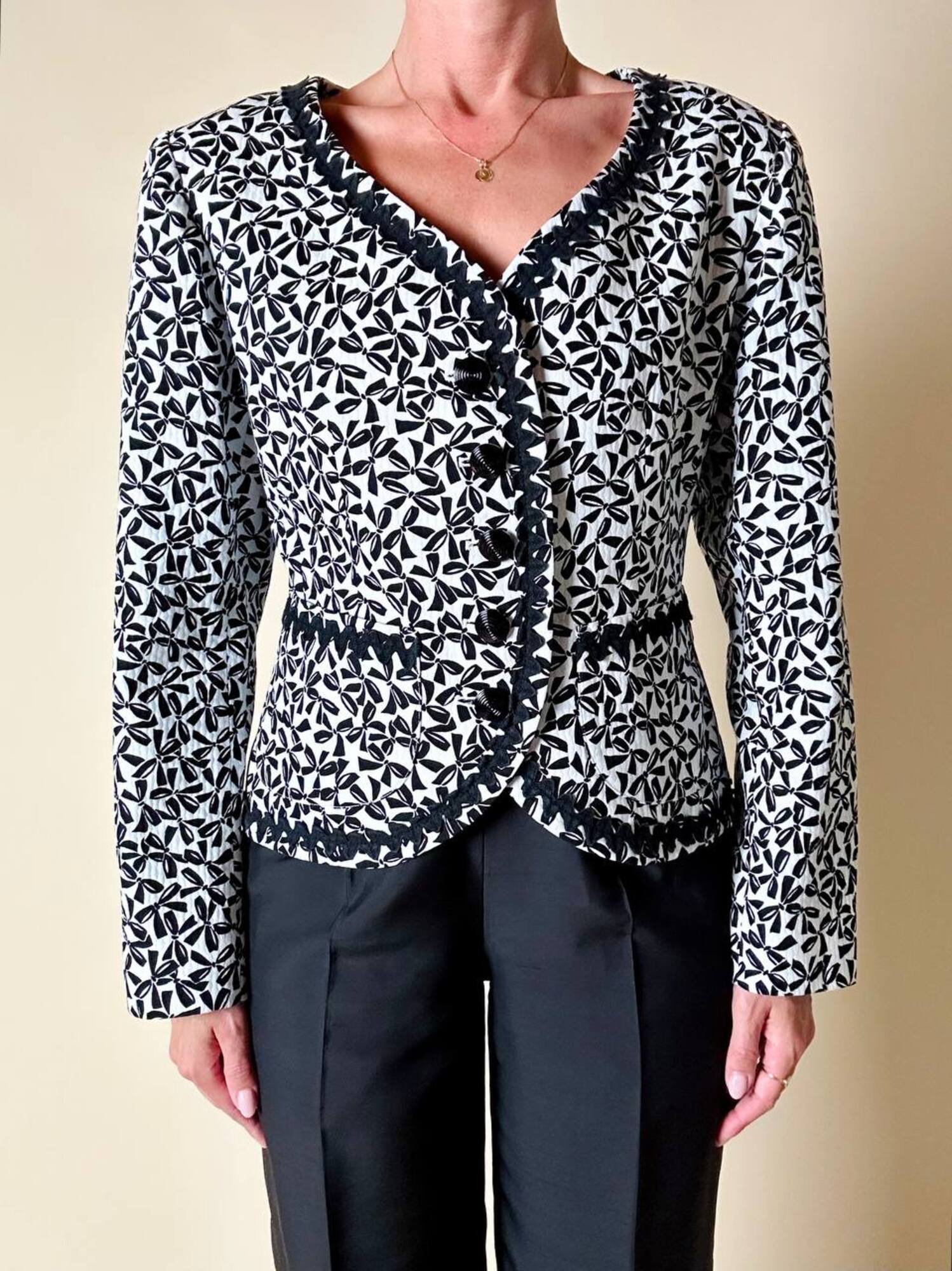 Questa giacca vintage firmata “Yves Saint Laurent”, della linea Variation, incanta per il suo fascino bon ton e l’attenzione sartoriale ai dettagli. Realizzata in cotone piquet bianco, è impreziosita da una deliziosa fantasia a piccoli fiocchi neri, che aggiunge un tocco di grazia e femminilità. Il modello corto, monopetto, con graziose taschine e un raffinato scollo a V senza rever, valorizza la figura con leggerezza e sobrietà. A delinearne i contorni, una passamaneria ondulata nera corre lungo il profilo e sul bordo alto delle tasche, donando carattere e raffinatezza. Completano il capo dei preziosi bottoni a cupola, neri lucidi, con motivo scanalato a spirale. Interamente foderata, è la scelta perfetta per chi ama lo charme intramontabile dello stile parigino.